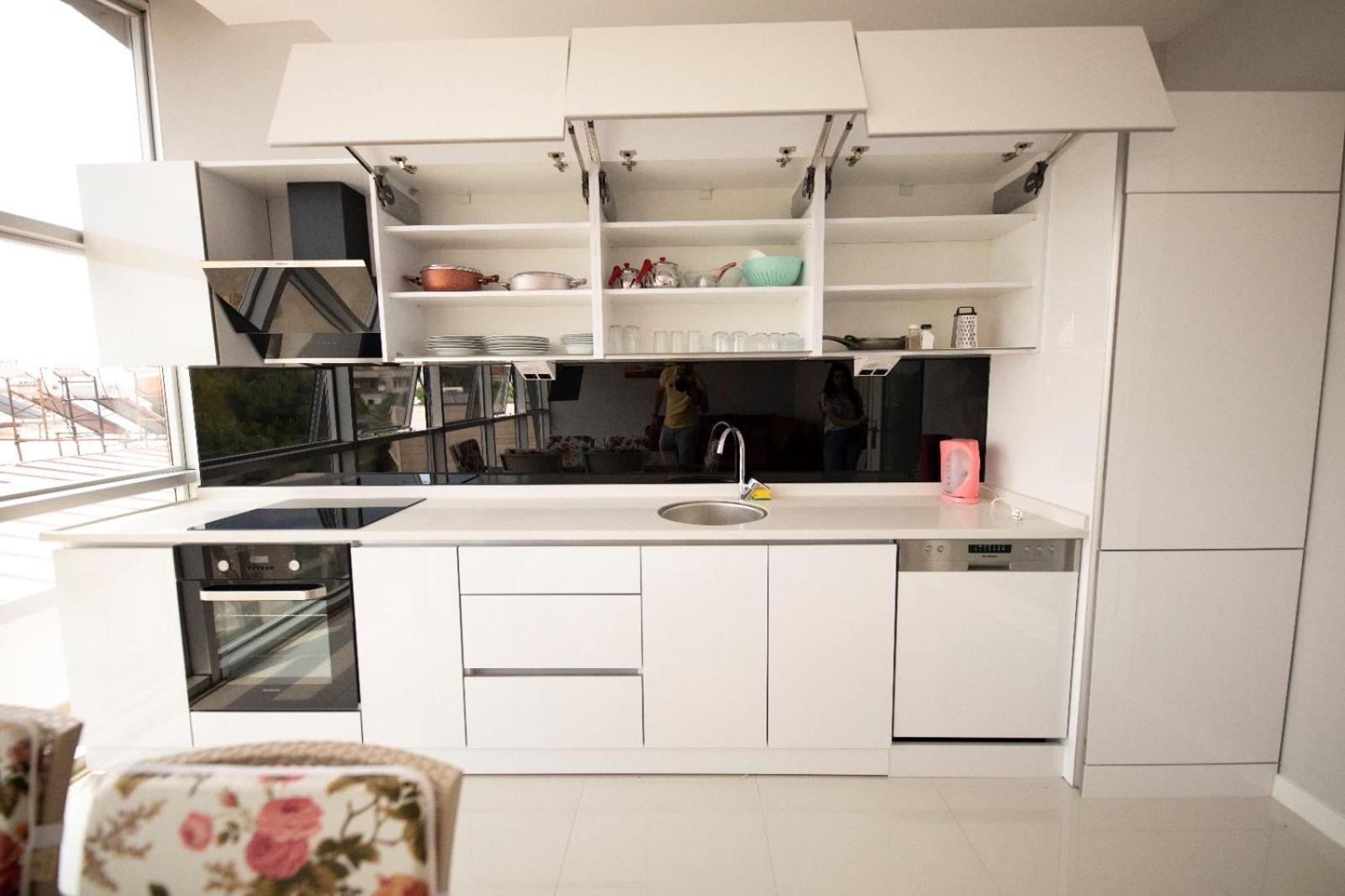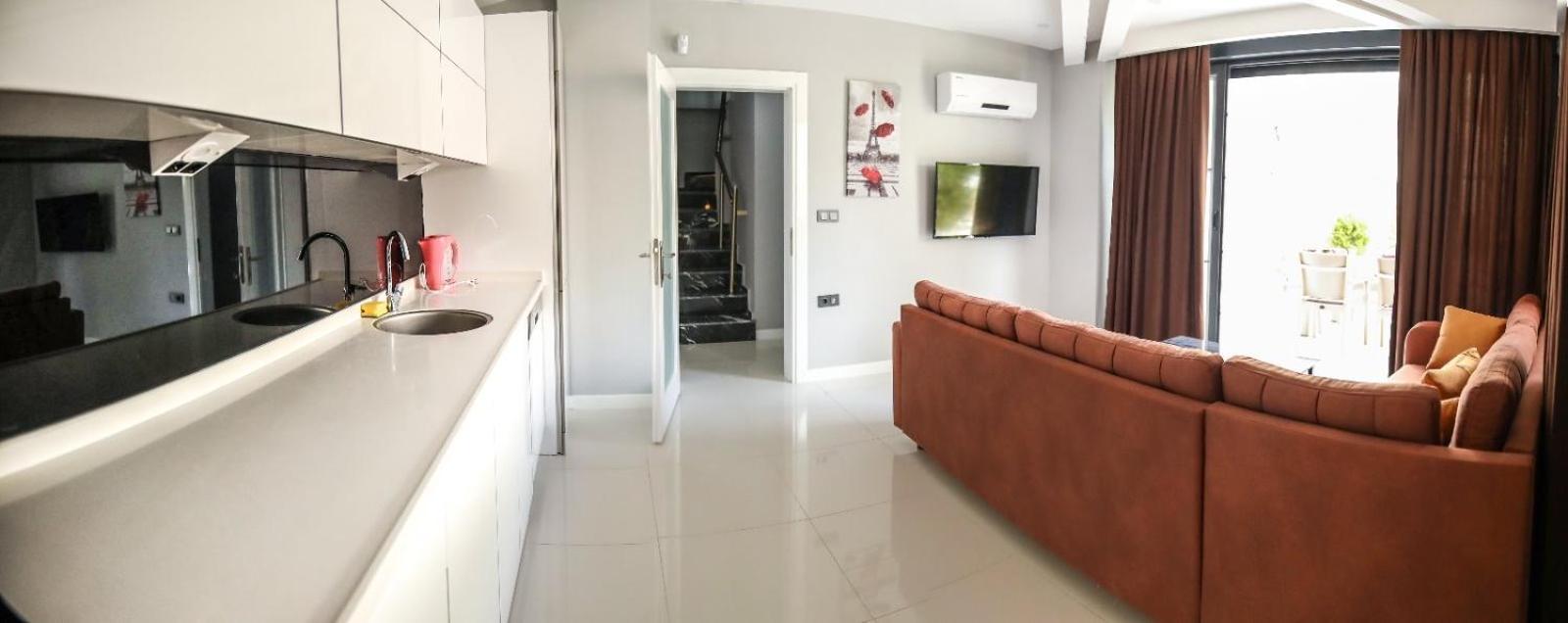 Best location, and very comfortable two-levels apartment, with a large living room and a terrace overlooking the sea. The kitchen is well-equipped with various utensils (although It wouldn't hurt to have a microwave), three bedrooms, two large bathrooms. It's very bright, quiet, and clean apartment. The owner is careful and attentive, always stay in touch and constantly wondering if everything is ok. Altinkum Beach is just steps away.
