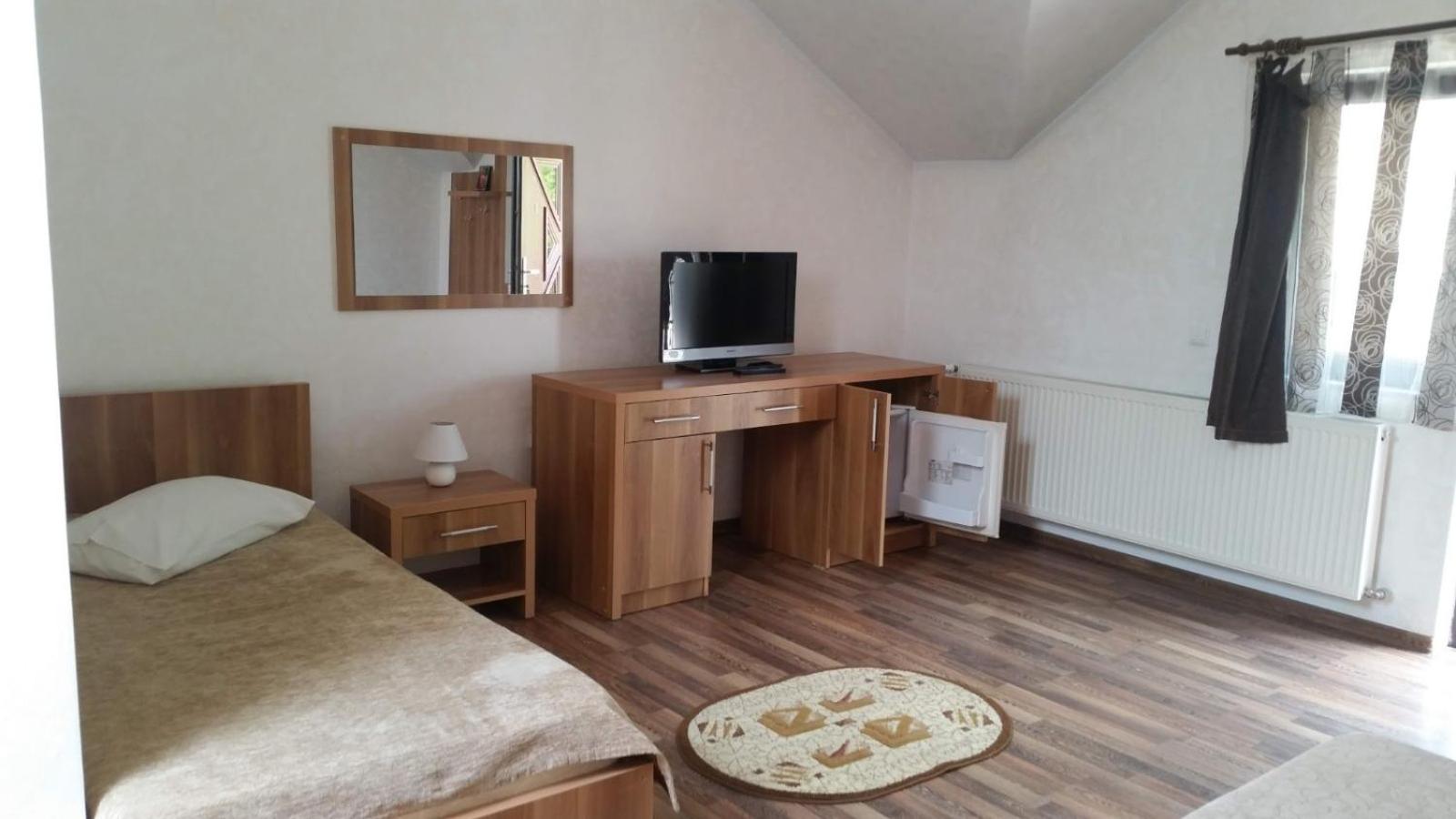 Отель расположен рядом с дорогой и заправкой. Номера расположены на 2 этаже над баром. Перед отелем достаточно места для парковки. Номер на 3 человека очень просторный, белье чистое и свежее. Есть холодильник и чайник, так как отель без завтрака. Окна затянуты сеткой, есть и фумигатор. Персонал очень дружелюбный. Хоть мы не знаем румынского, проблем с заселением не было никаких. Нам очень понравилось.