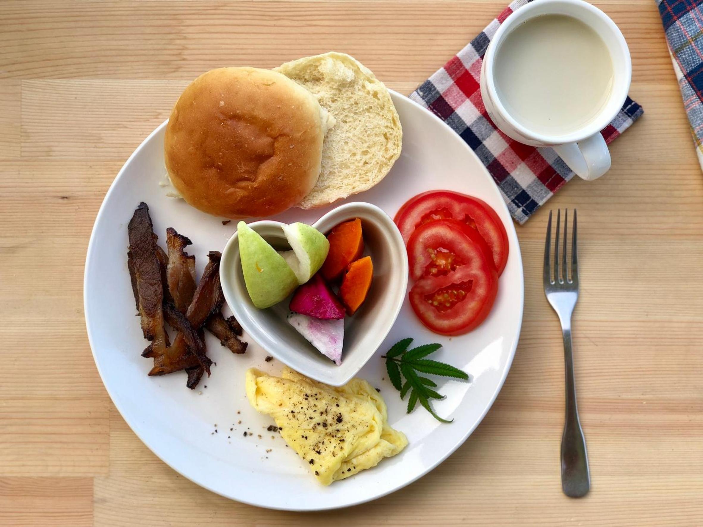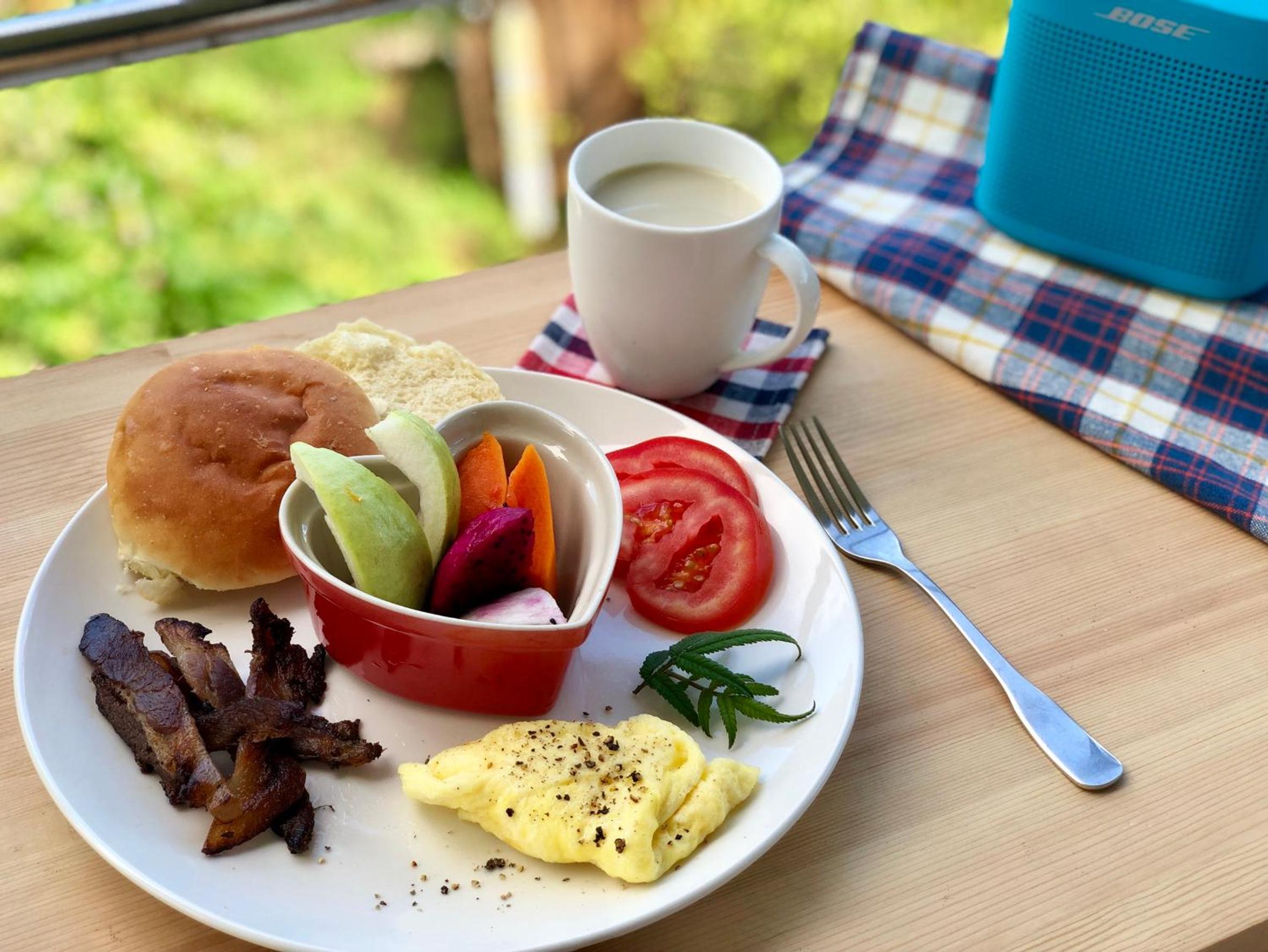 早餐很豐盛,食材來源幾乎都是來自民宿種植及飼養的,調味很清淡、卻能吃到食材天然的原味,就連蓮霧都是農場內種植的!還有喝到飽的牛奶和豆漿,連我們家對牛奶過敏的家人都能照顧到。四人房房間很大,床鋪軟硬適中。二樓露台有小小的兒童遊戲區和搖椅,一樓有庭院可帶孩子看看雞、鴨、魚、花草水果,心情被小動物們的悠然自得感染,也放鬆了起來。