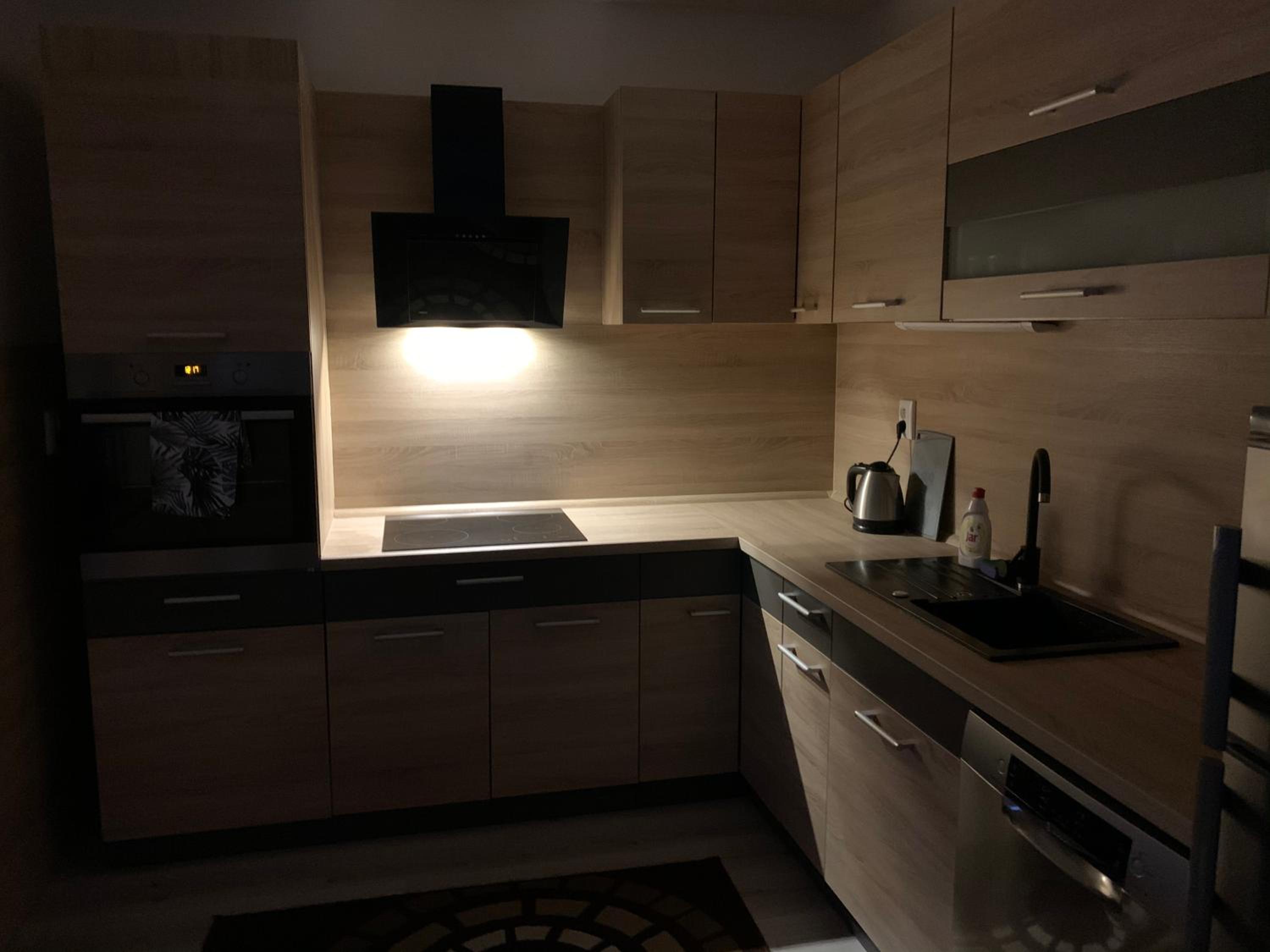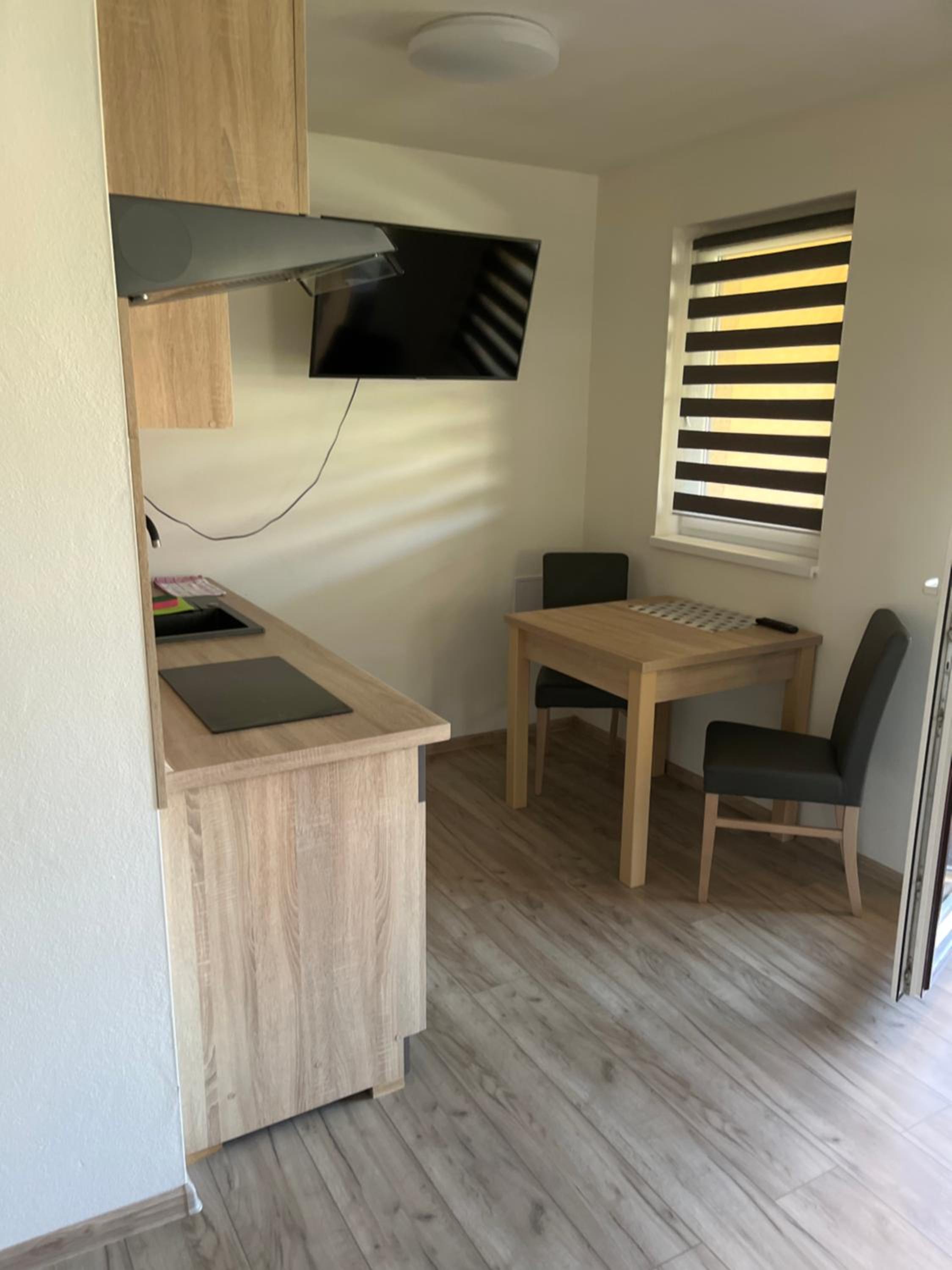 Šikovná kuchynka, prakticky zariadený apartmán s menšou posteľou,
