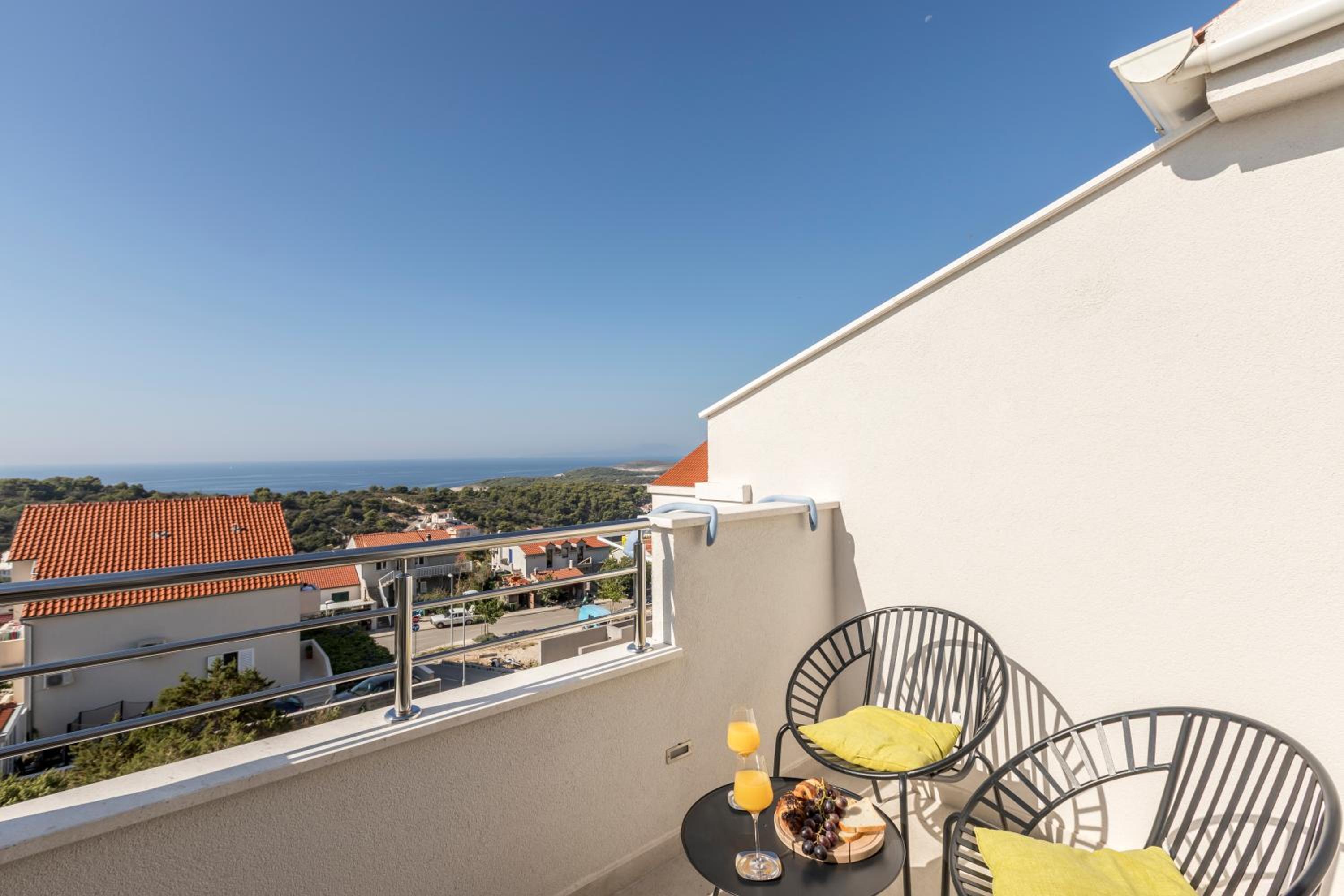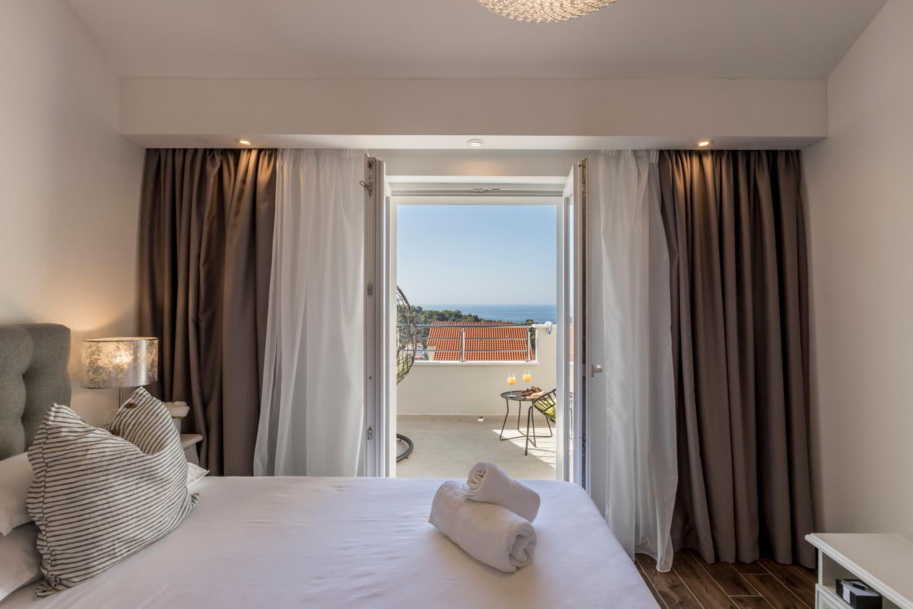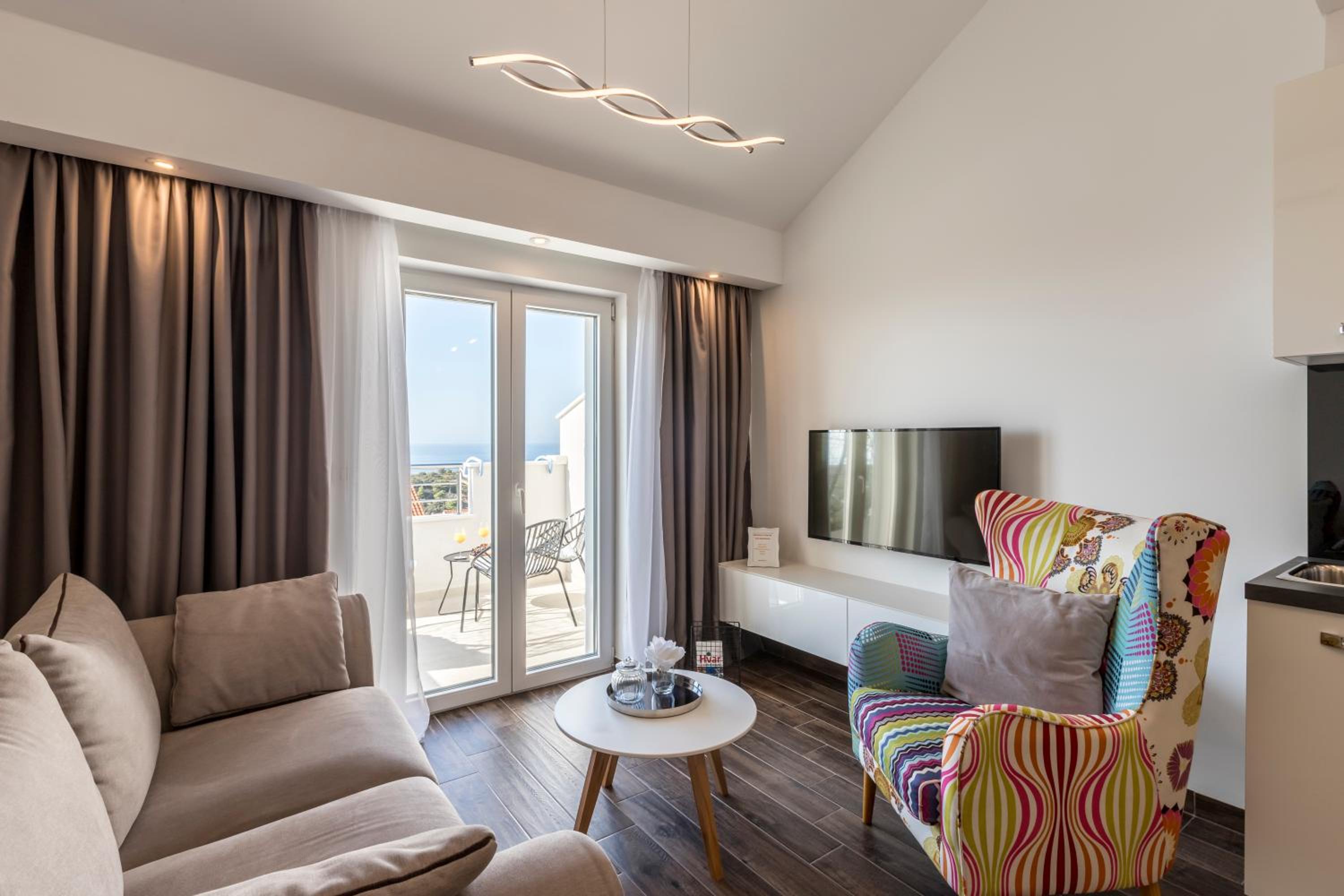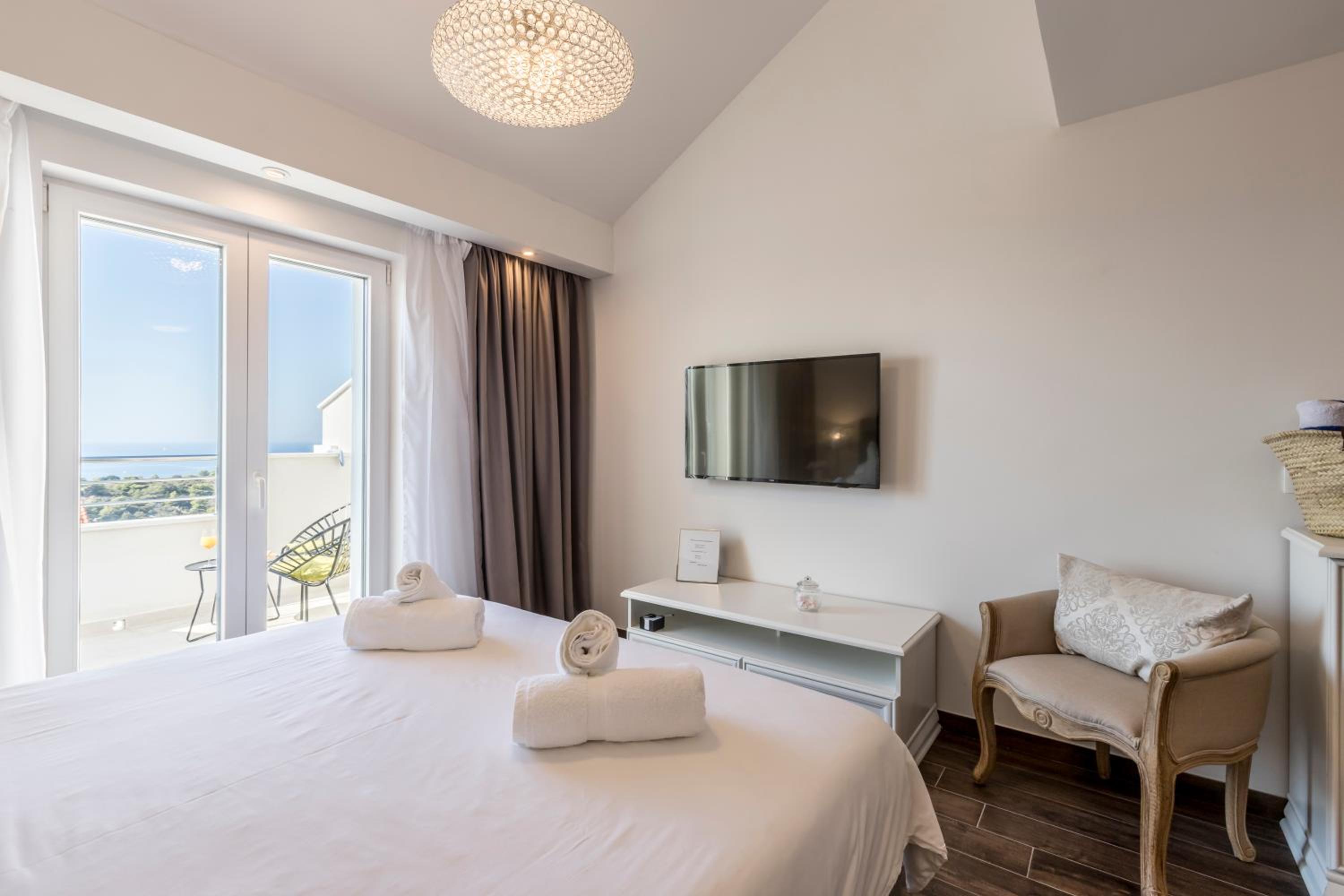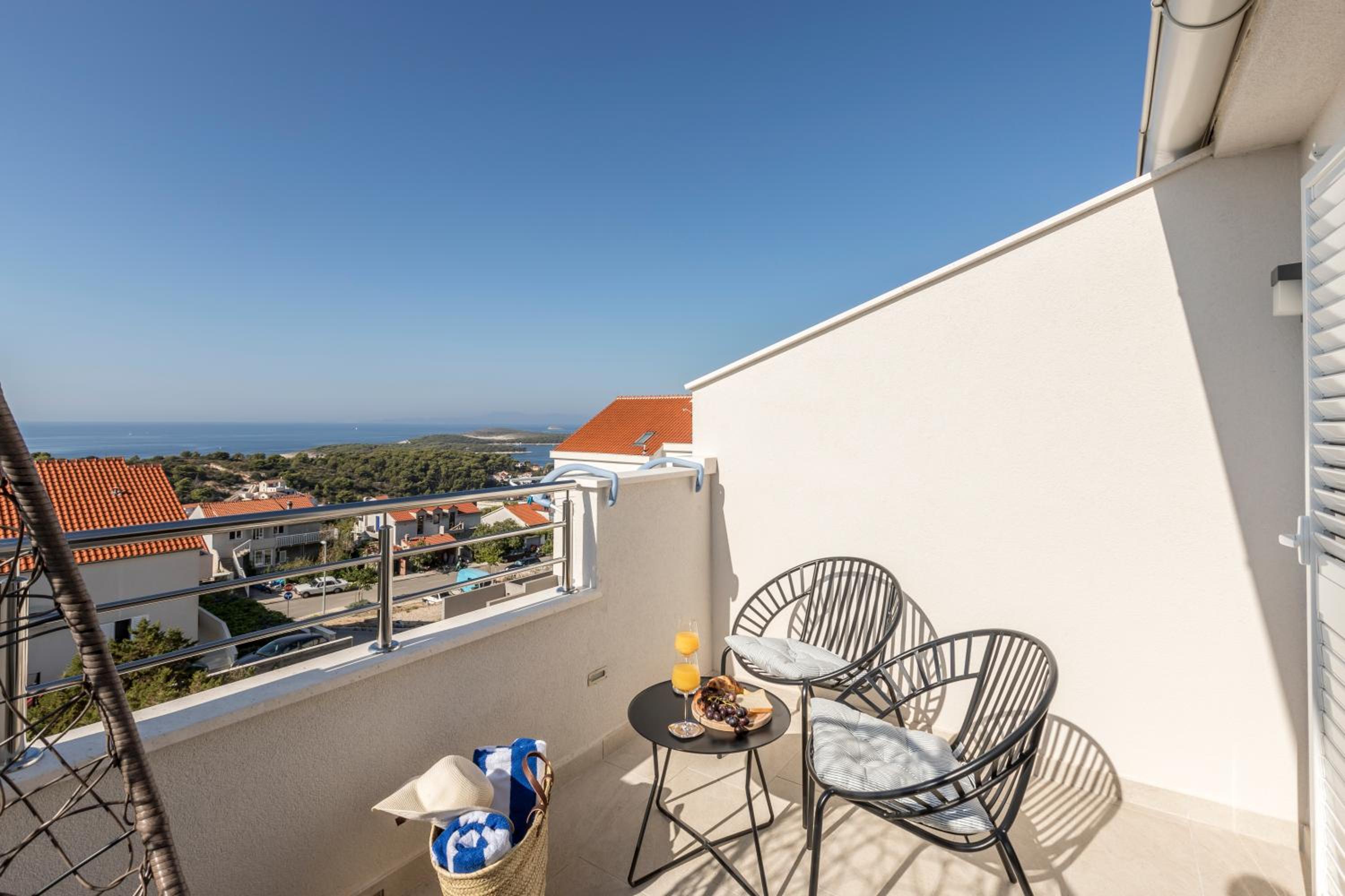 Enjoy stunning sea views from your private balcony at Hvar de luxe apartments 1. Each room is elegantly decorated and features modern amenities, including a flat-screen TV and a mini bar.