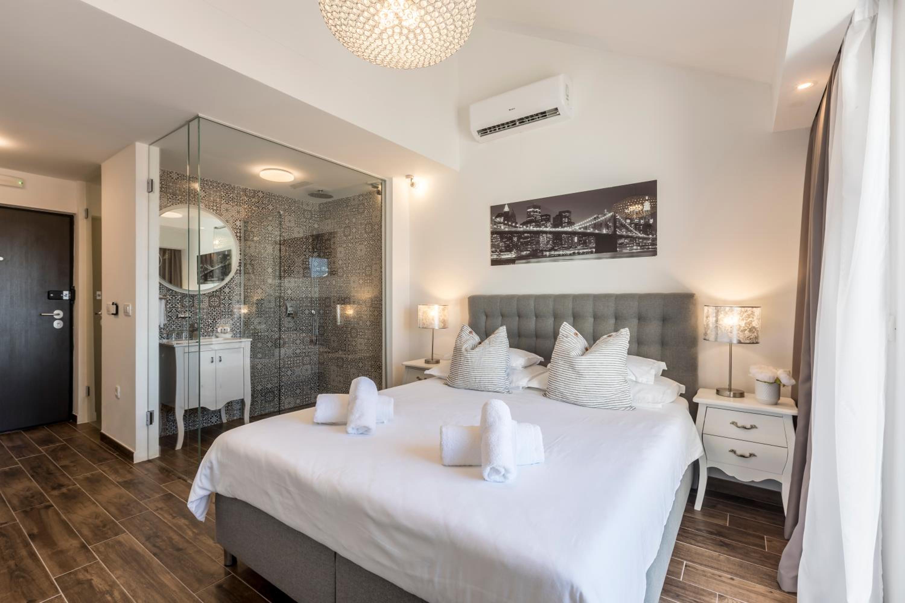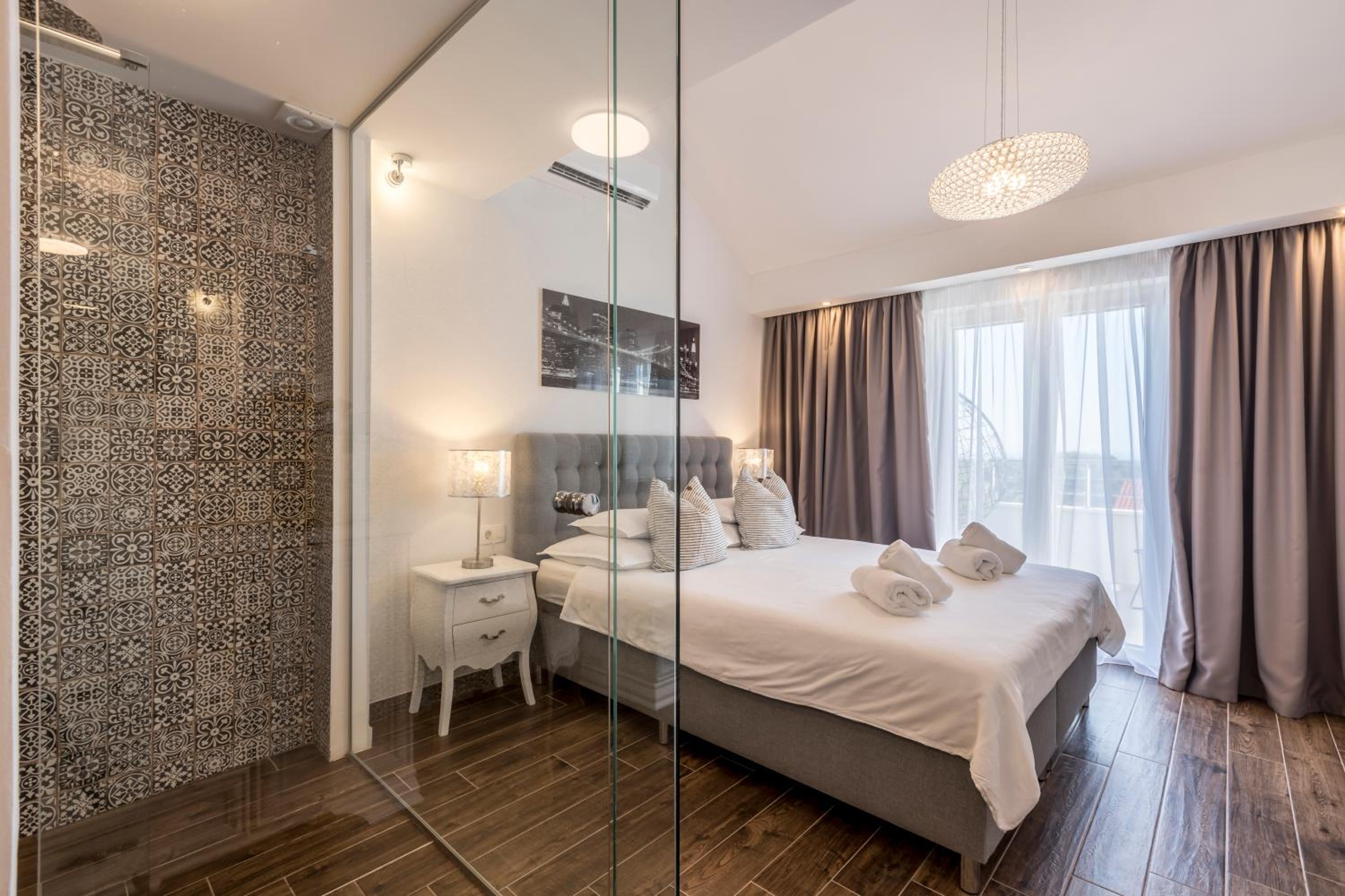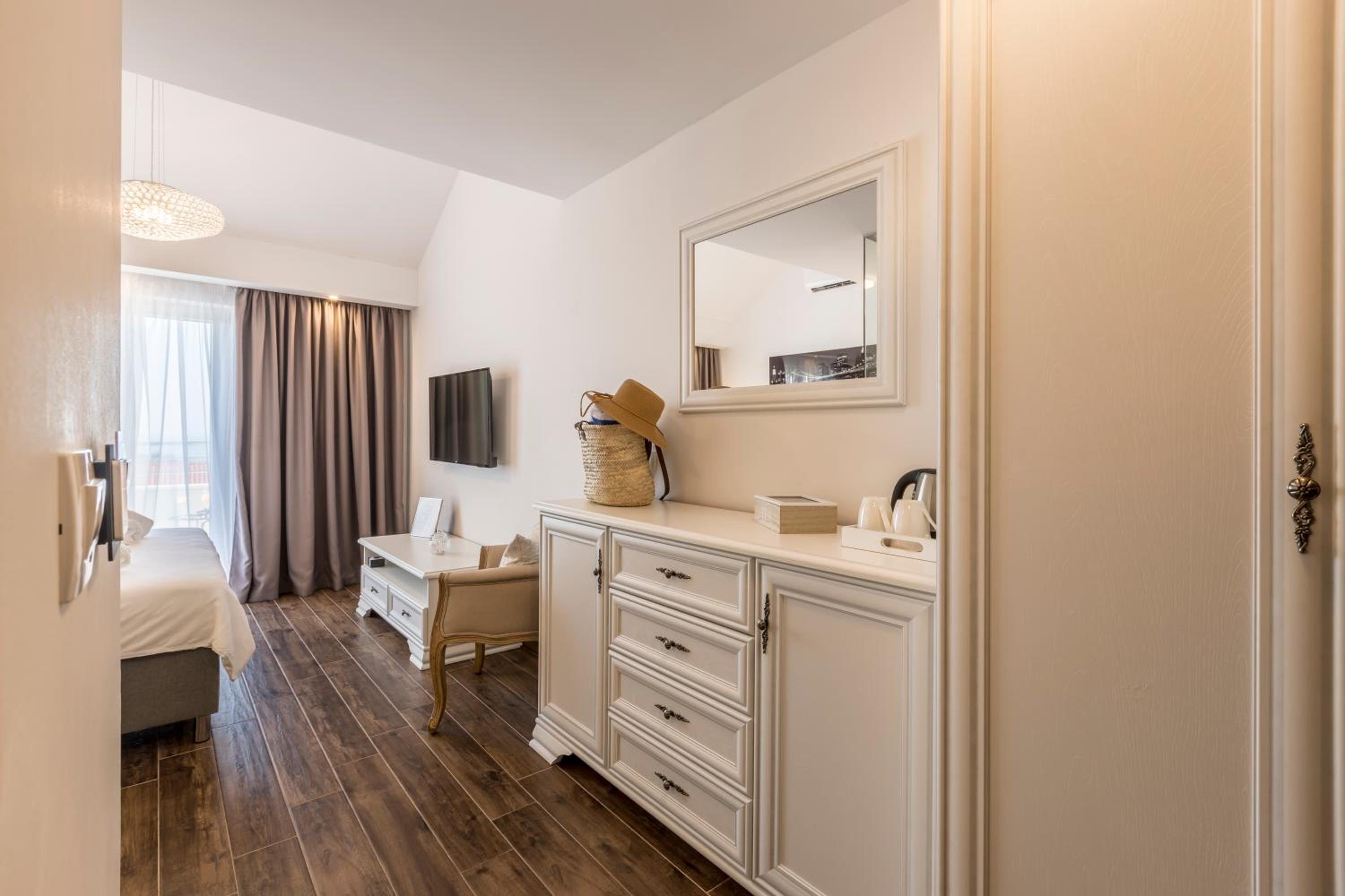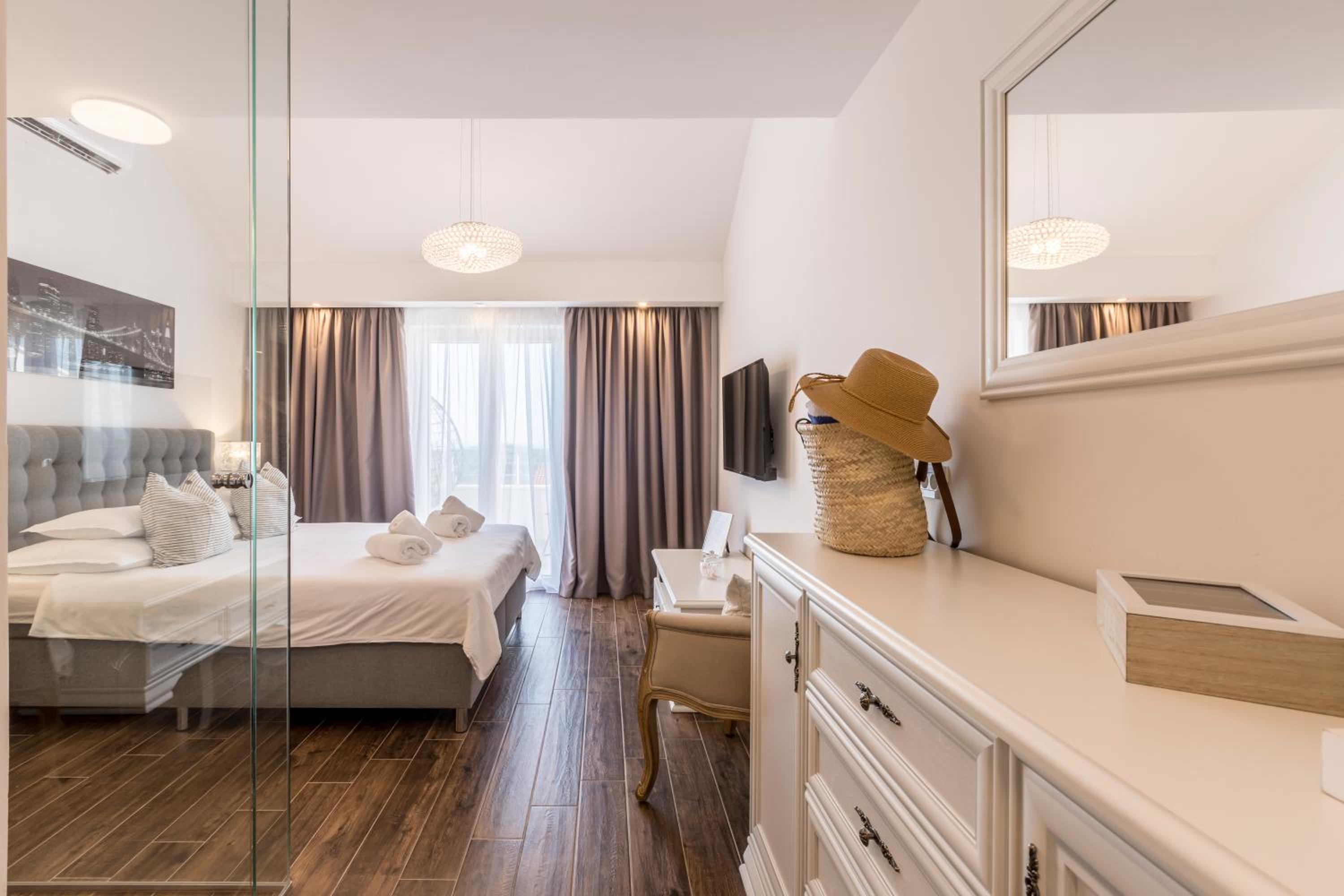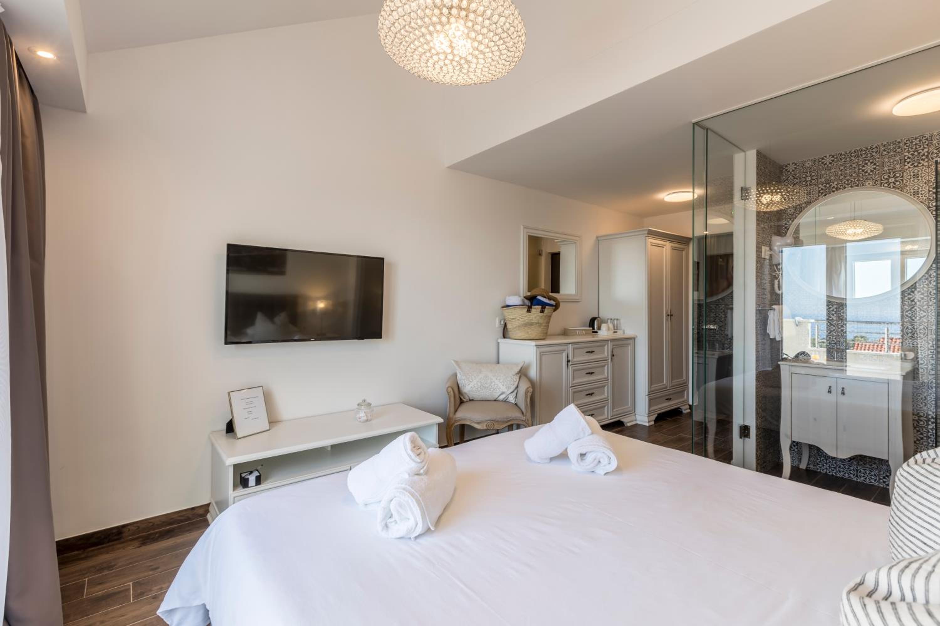 Enjoy stunning sea views from your private balcony at Hvar de luxe apartments 1. Each room is elegantly decorated and features modern amenities, including a flat-screen TV and a mini bar.