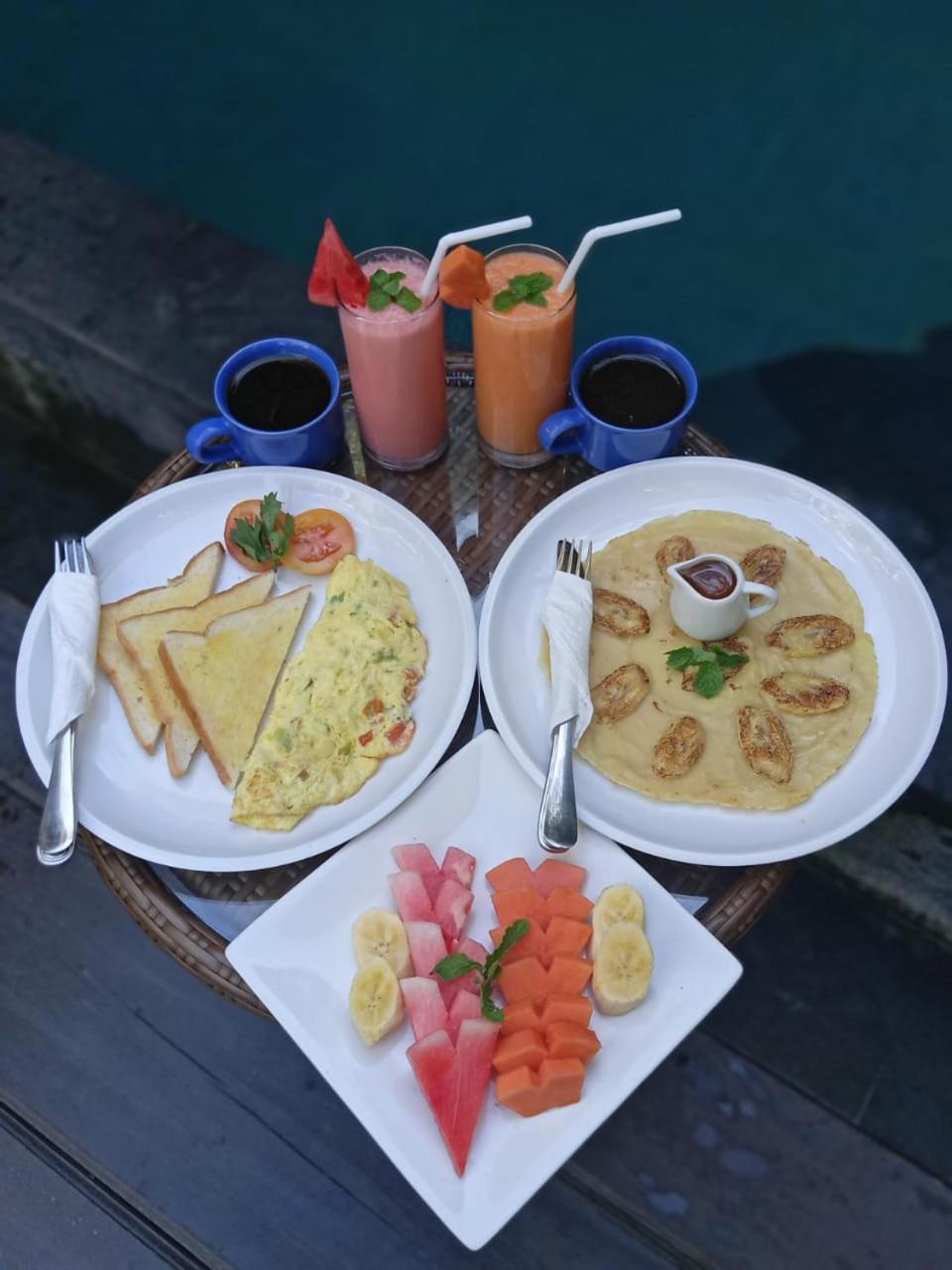 Colazione a scelta tra pancake e toast omalette/scramble, 1 piatto di frutta oppure una spremuta, caffè sel service con bollitore. Positiva la presenza di dispenser acqua per riempire bottiglie risciacquo denti. Piscina piccola ma tonificante dopo una giornata intera in giro con una umidità del 90%. Posizione ottima a 50m dalla strada principale. Noleggio scooter e warung annesso a 20 m