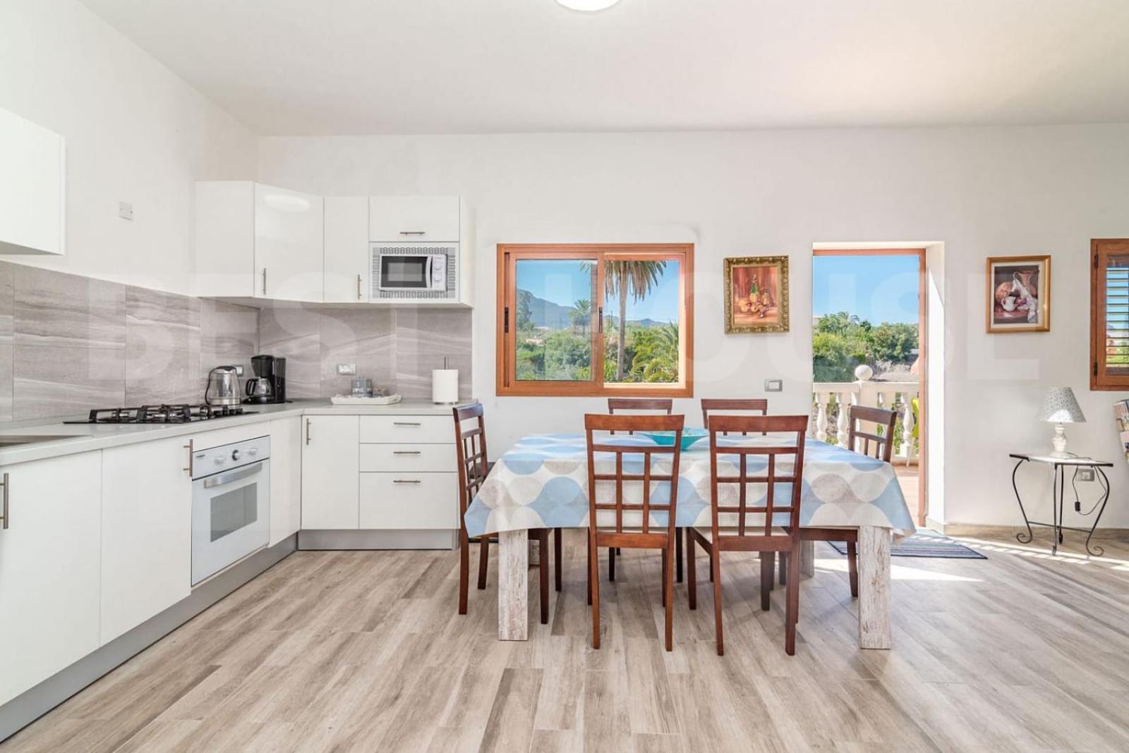 Location. Really lovely. Perfect views and easy access to restaurants and local shop. Away from the hustle and bustle of Maspalomas, but only twenty minutes away, though the road winds a lot round the mountains. Big bedroom with all facilities. Big kitchen with two sitting areas. Very kind and friendly owner. We had a storm and the electricity went off, but she responded quickly and told us what to do. There are three apartments but the kitchen and the terrace are shared. The other people were nice as well. Very enjoyable stay. Will definitely be back.