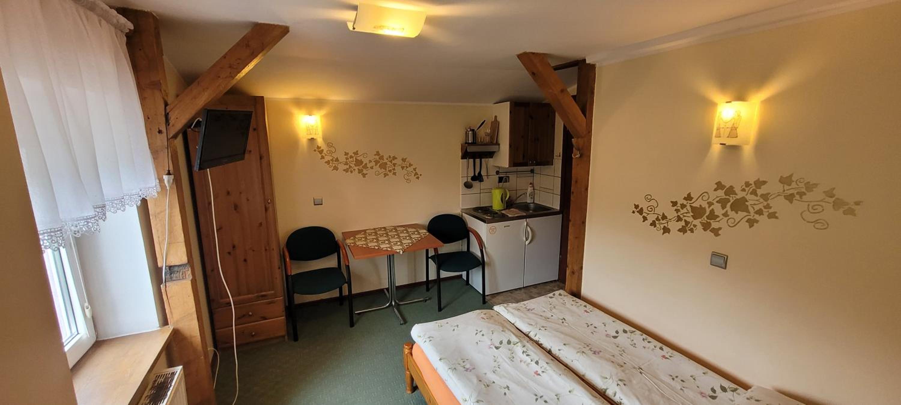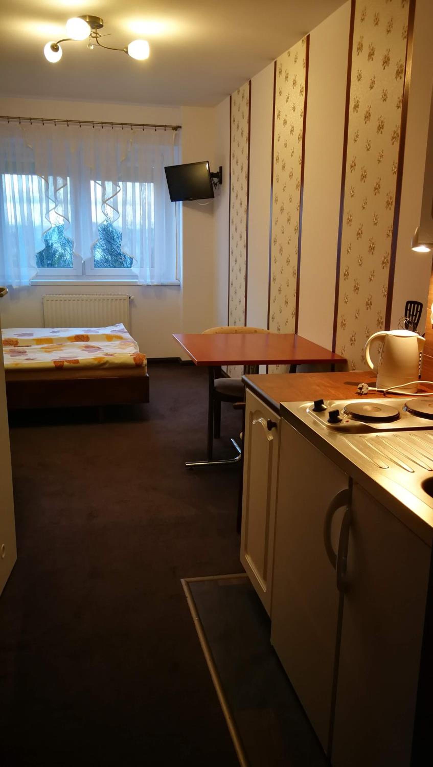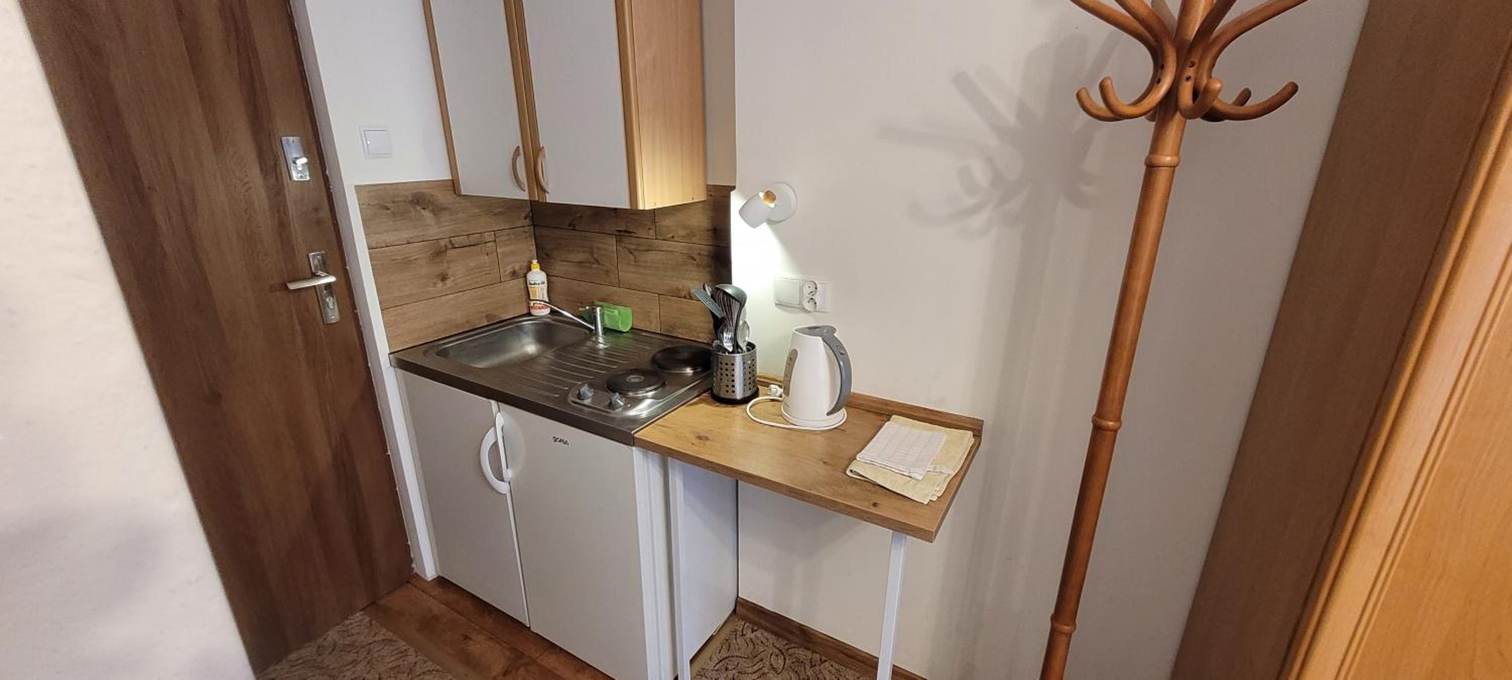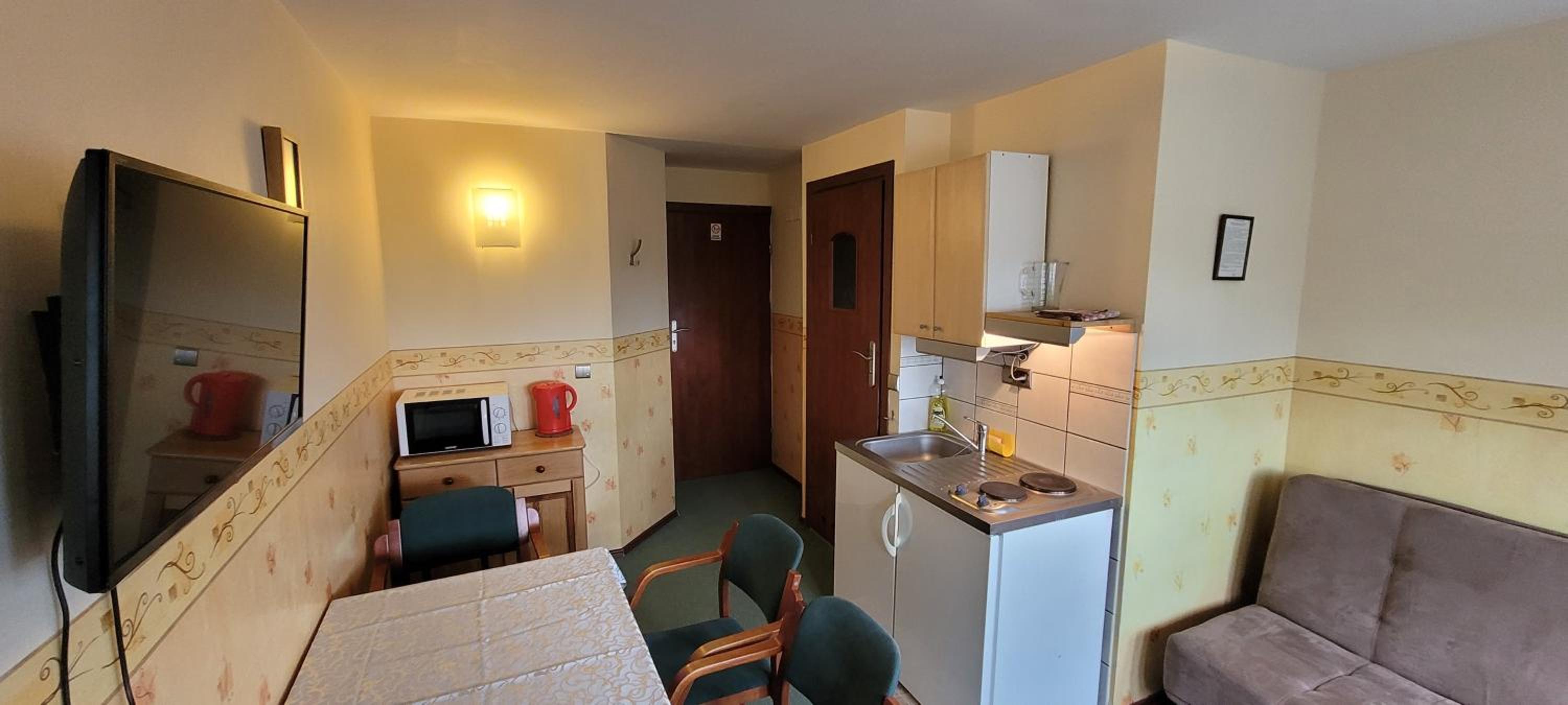 Bardzo ciepło i przytulnie. Kuchenka i lodówka w pokoju. Bardzo czysta łazienka.