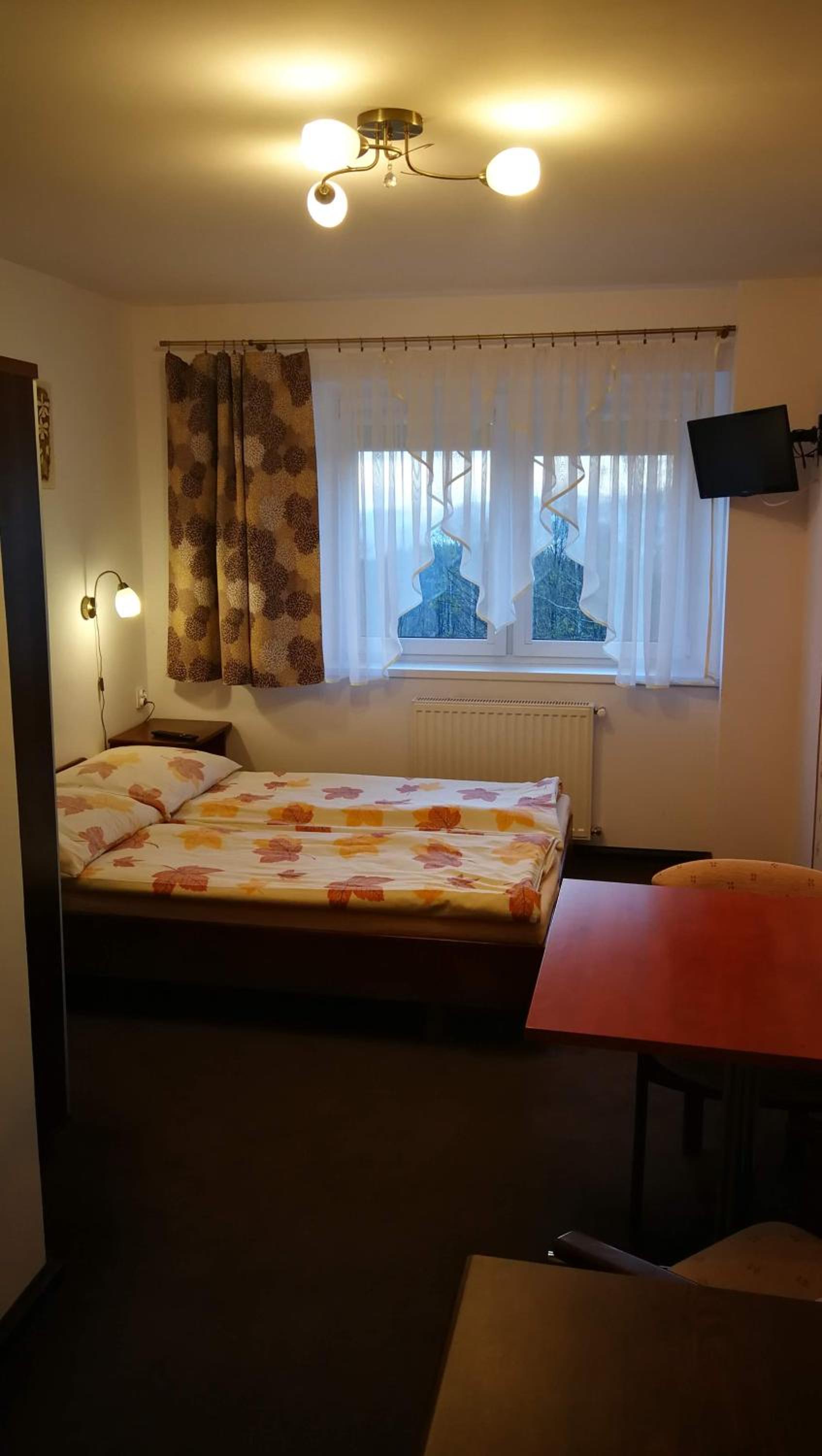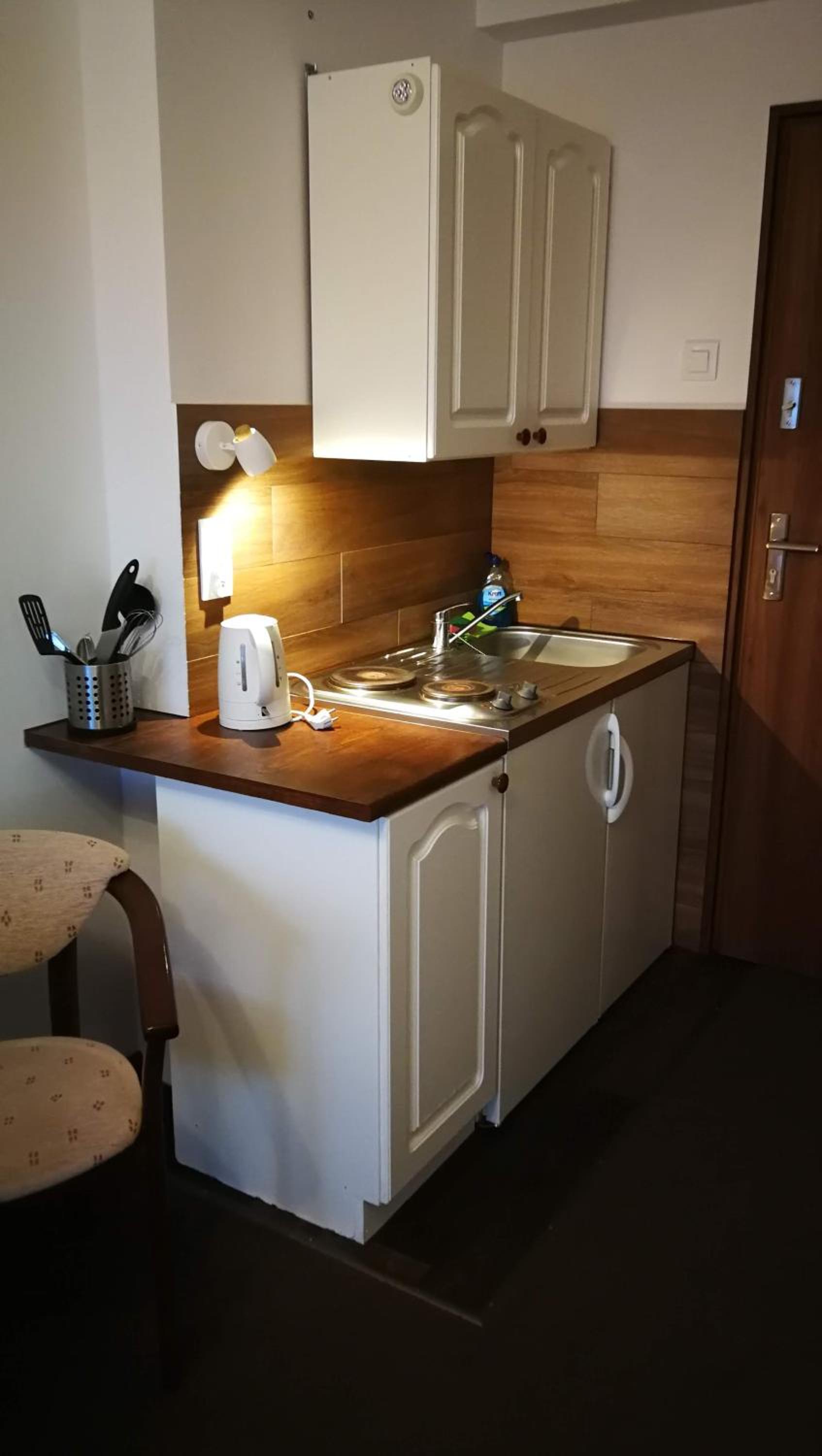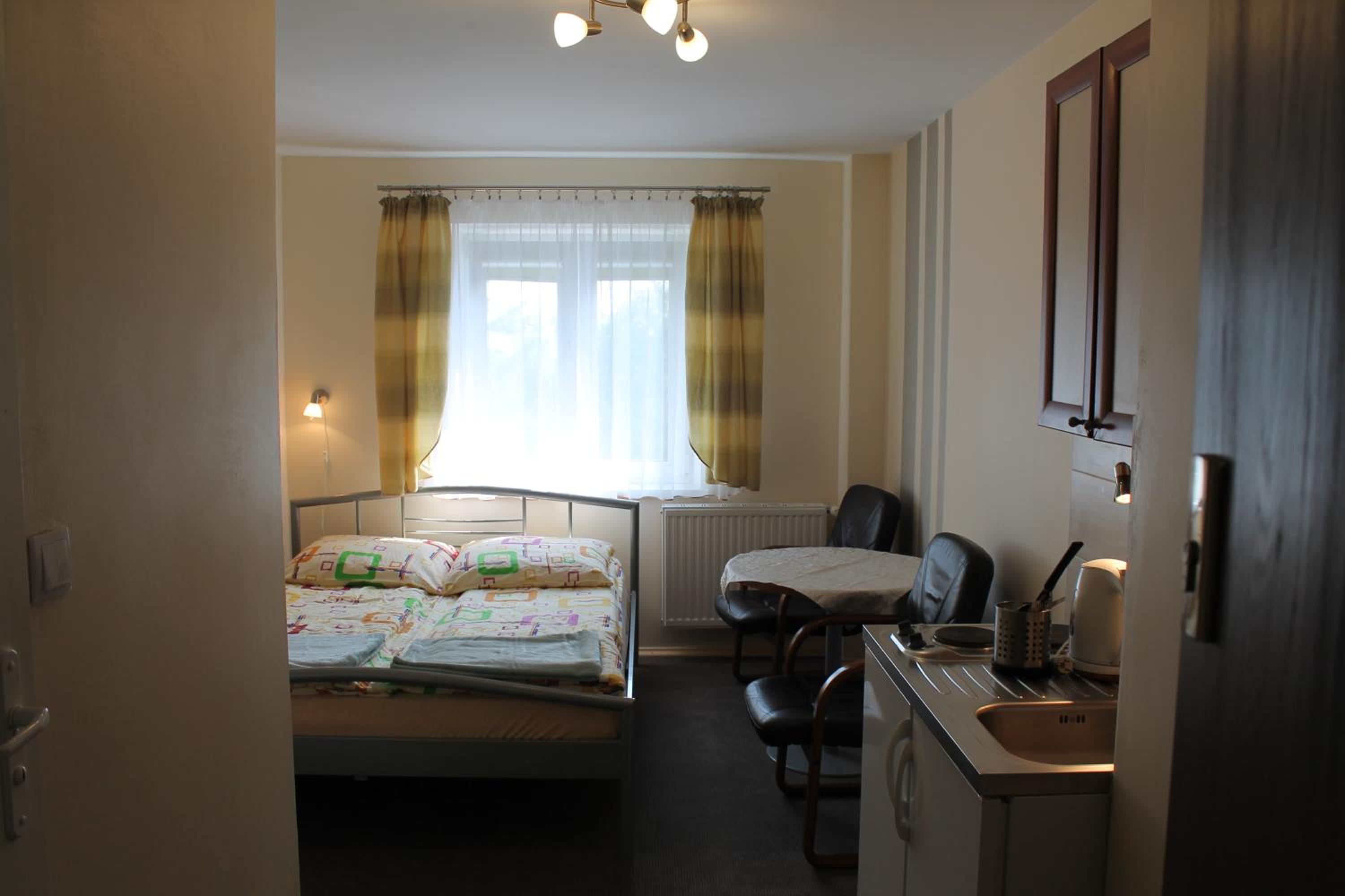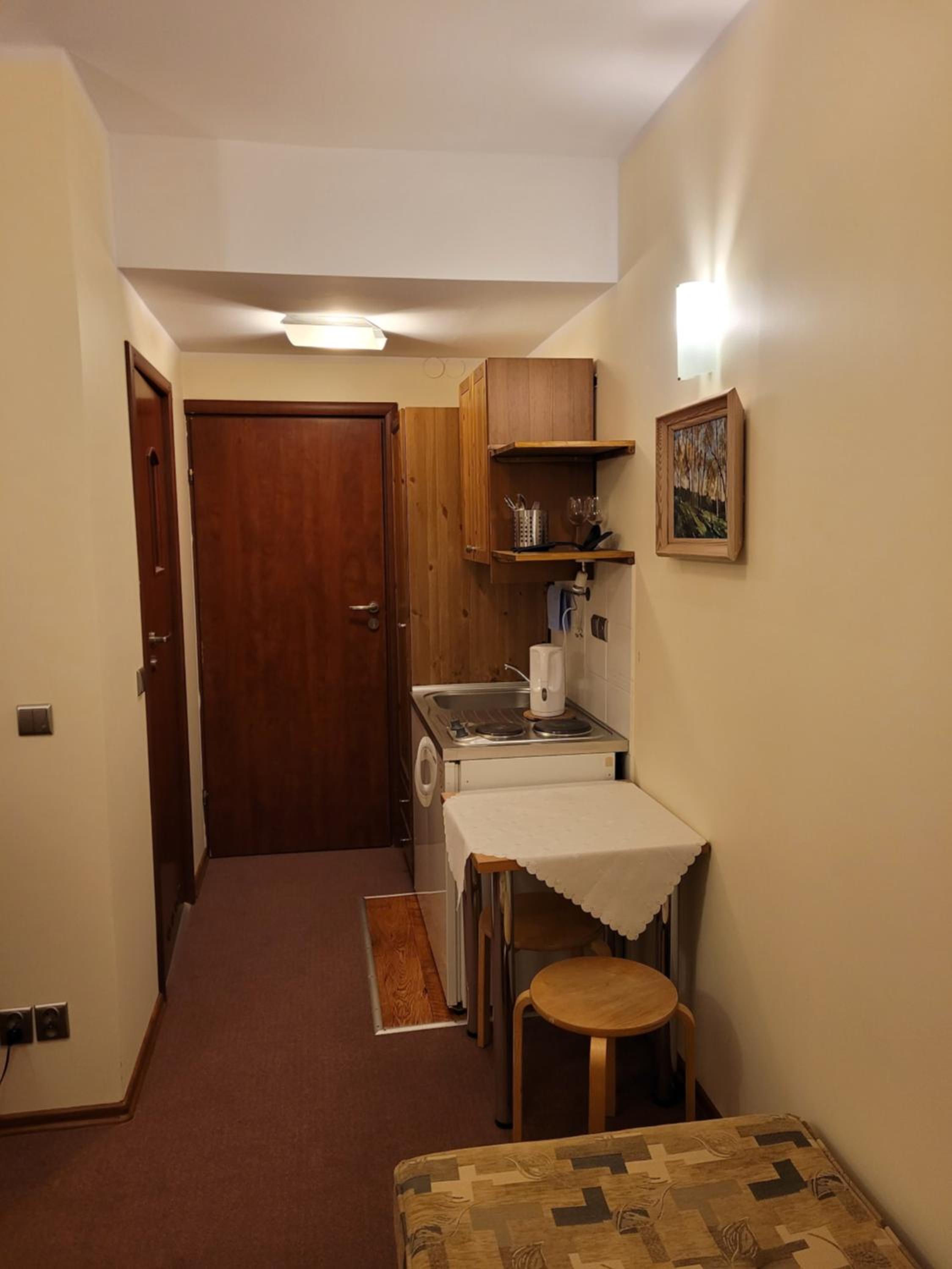 Bardzo ciepło i przytulnie. Kuchenka i lodówka w pokoju. Bardzo czysta łazienka.
