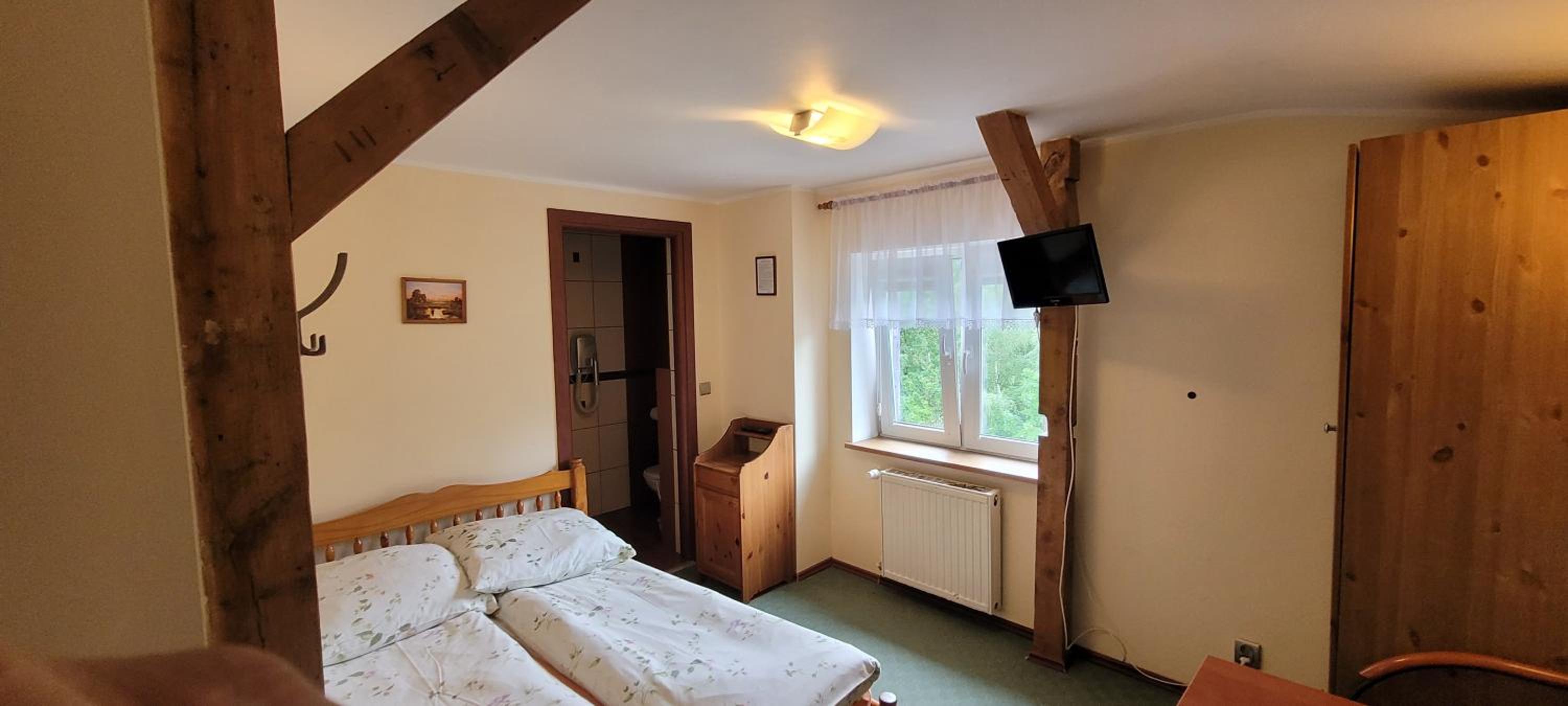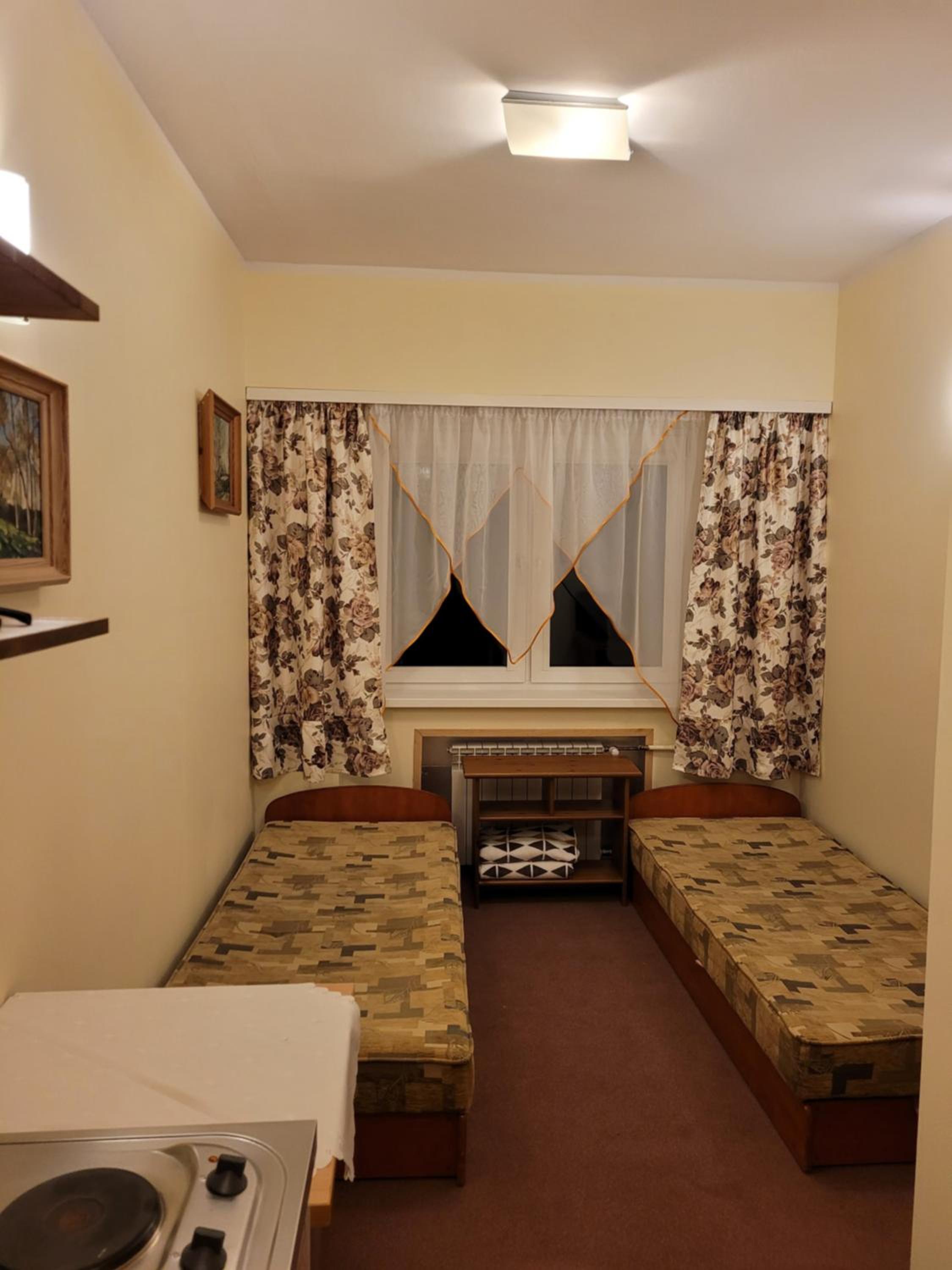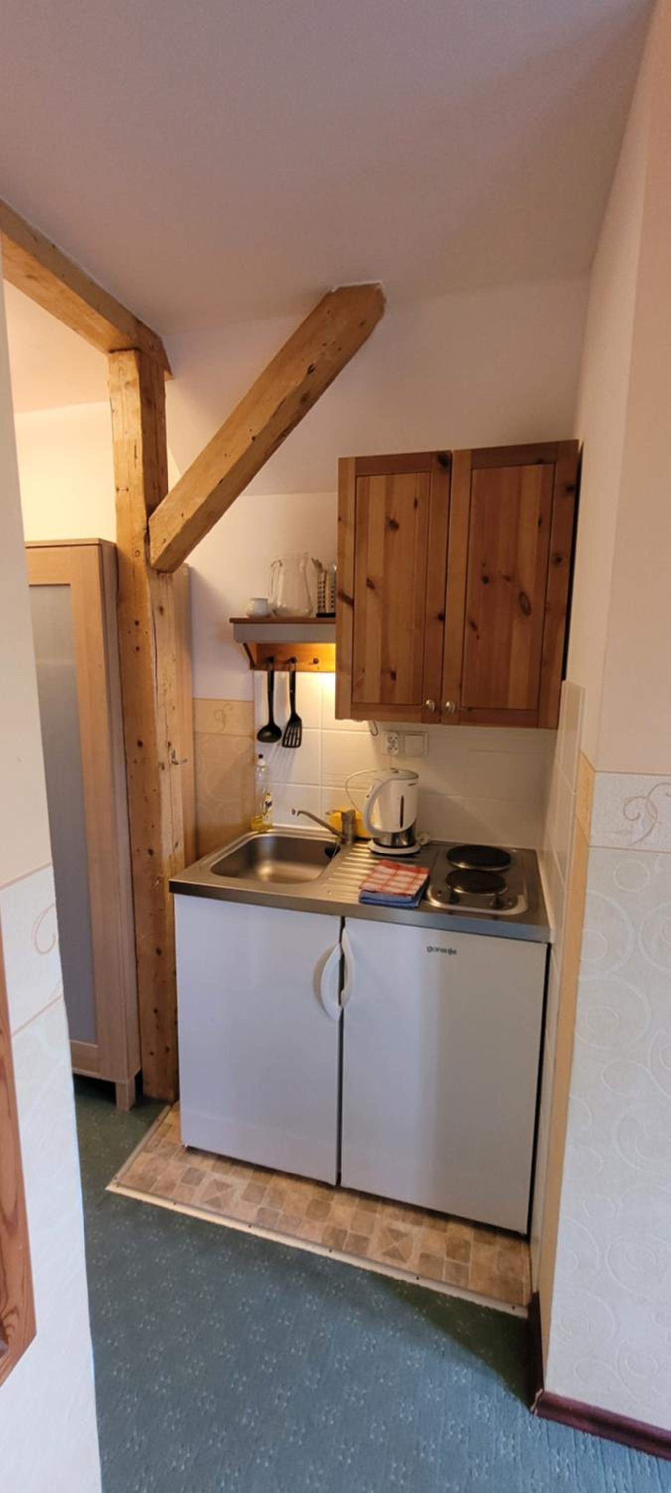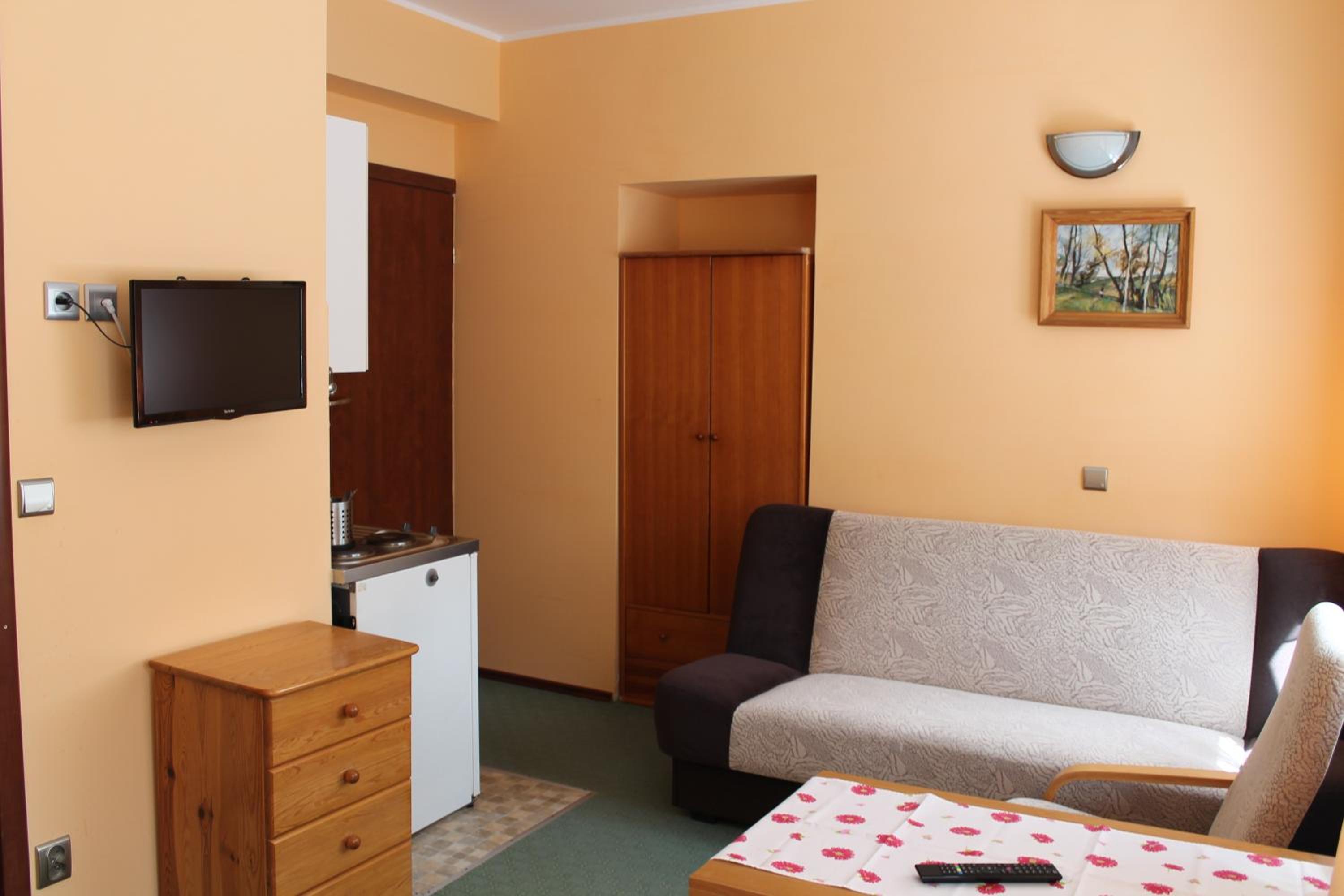 Bardzo ciepło i przytulnie. Kuchenka i lodówka w pokoju. Bardzo czysta łazienka.