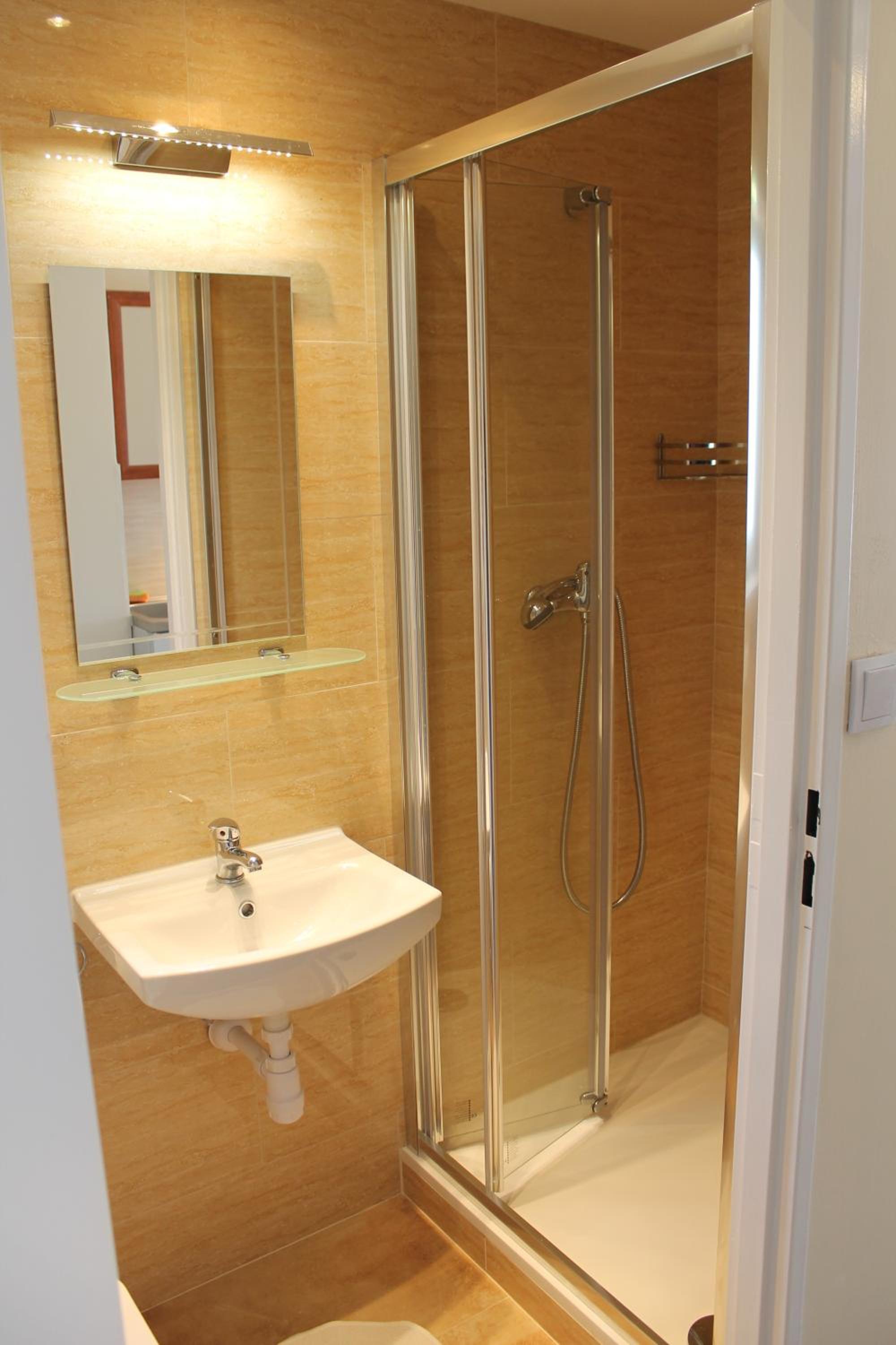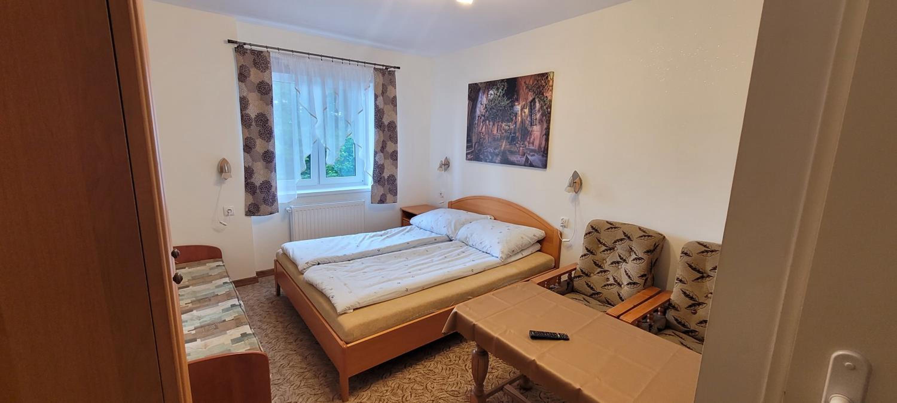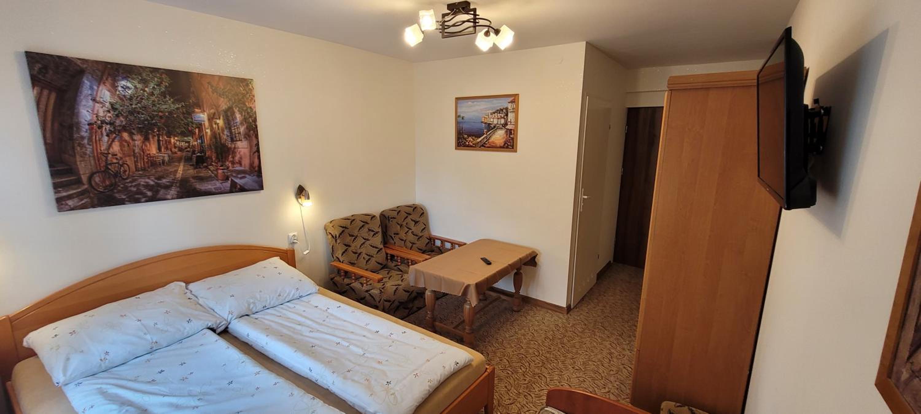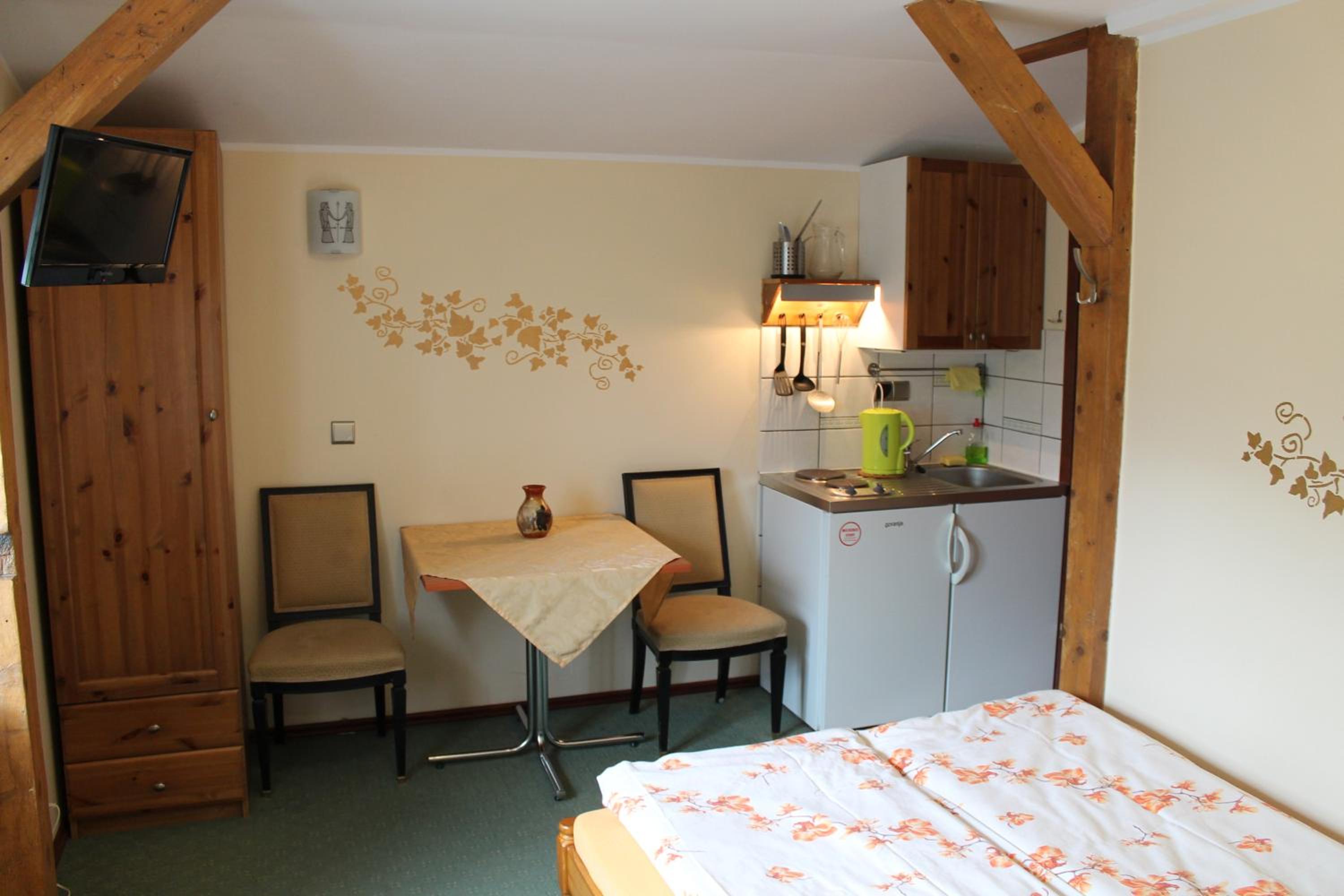 Bardzo ciepło i przytulnie. Kuchenka i lodówka w pokoju. Bardzo czysta łazienka.