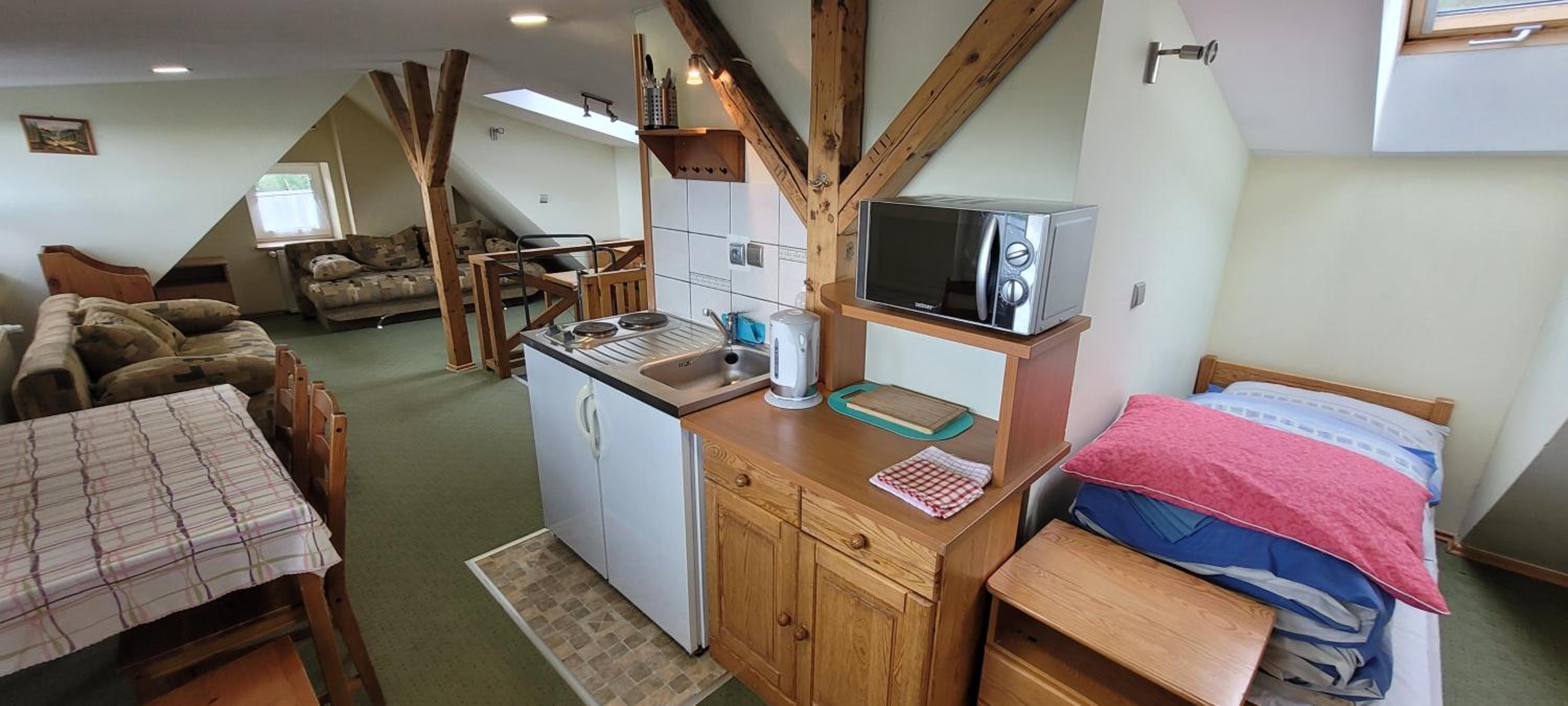 Bardzo przytulny pokój na poddaszu, przestrzenny, klimatyczny. Dużo miejsca mimo zakwaterowania 4 osób. Kuchnia zaopatrzona wystarczająco w naczynia. Woda ciepła wręcz gorąca do kąpieli. Z okien bardzo przyjemny widok na góry, blisko do szlaku i na wyciągi narciarskie. Okolica bardzo cicha. Polecam.