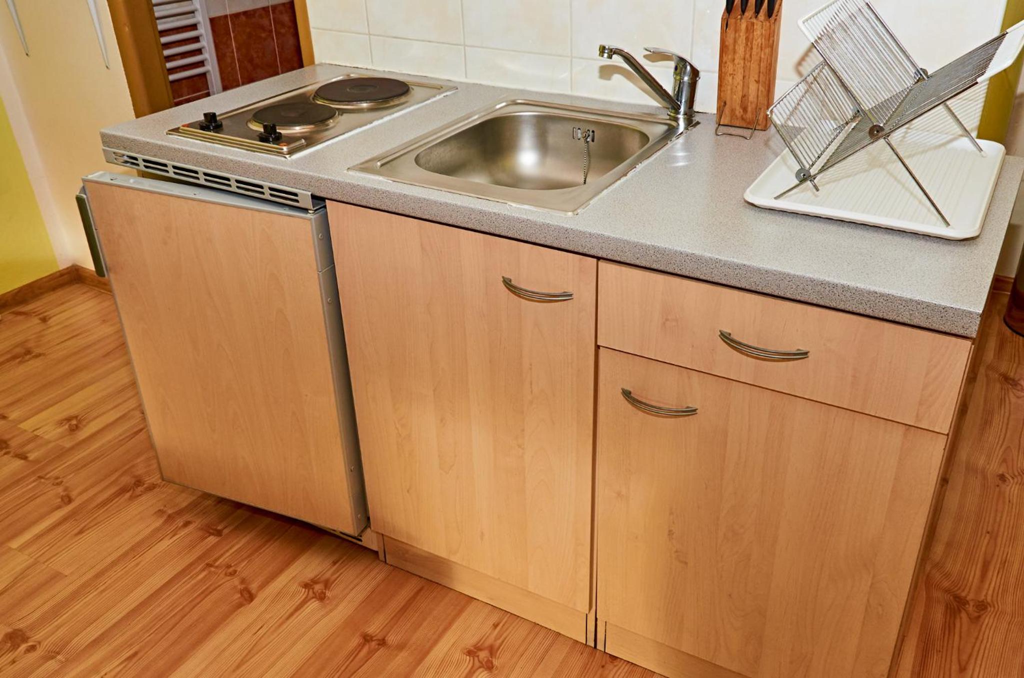 Quiet family owned villa with private parking. In the room there is a kitchen area with cooking stove, fridge, microwave, toaster, kettle, pots and pans. Also in the bathroom there is a washing machine.