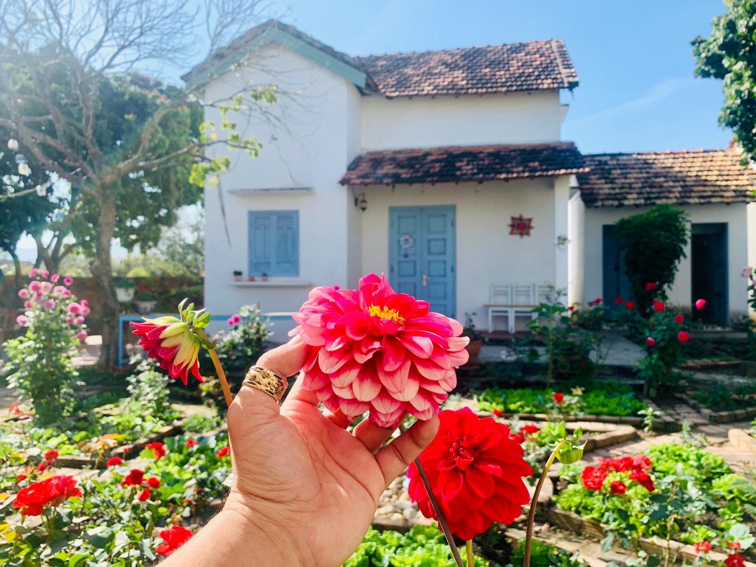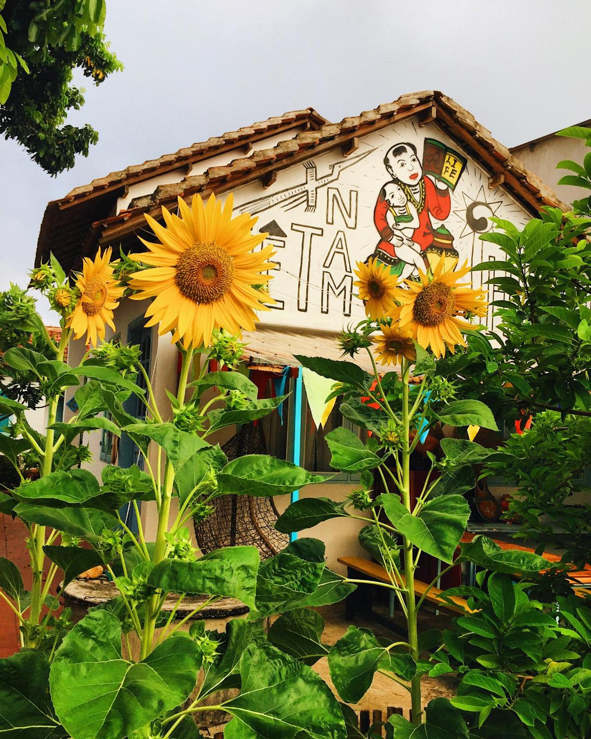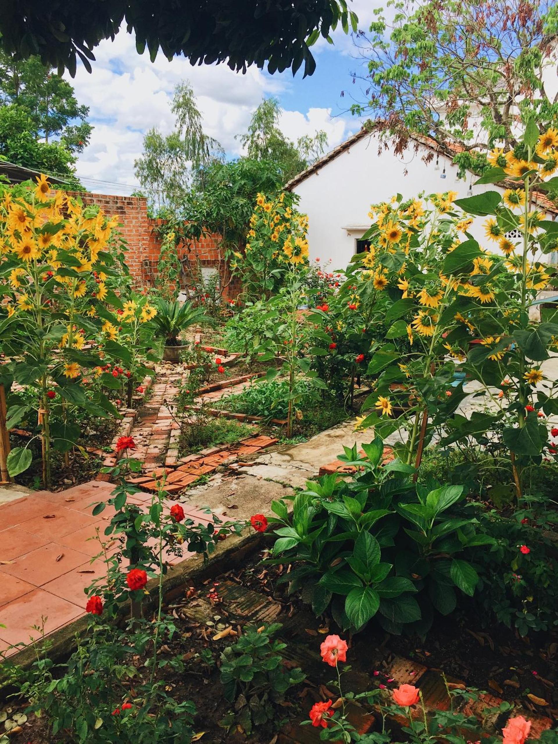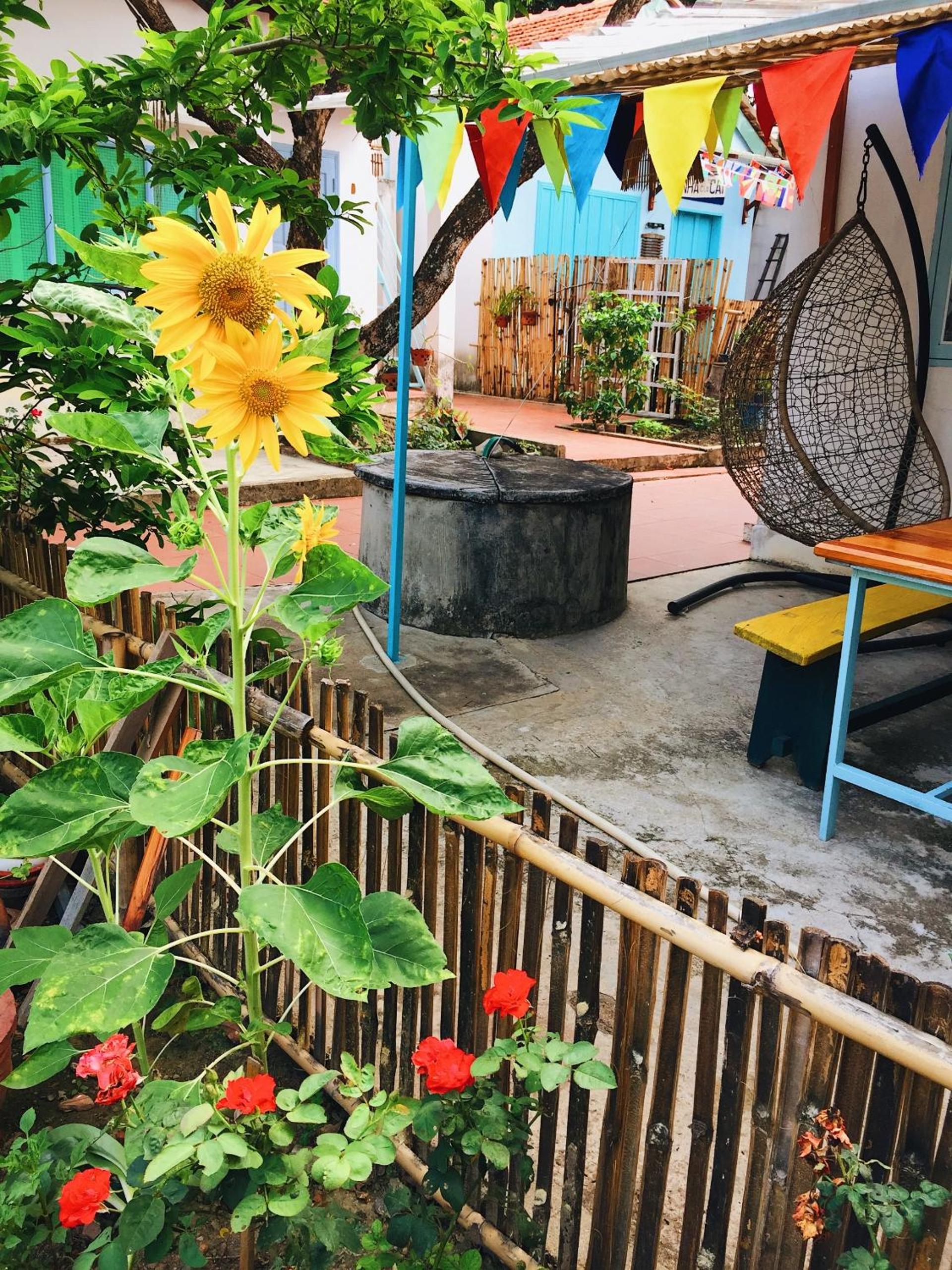 Rooms and dorms are in a walled family compound in the middle of a vegetable plot and with numerous flowers, sunflowers, dahlias,marigolds, roses...it is very picturesque.