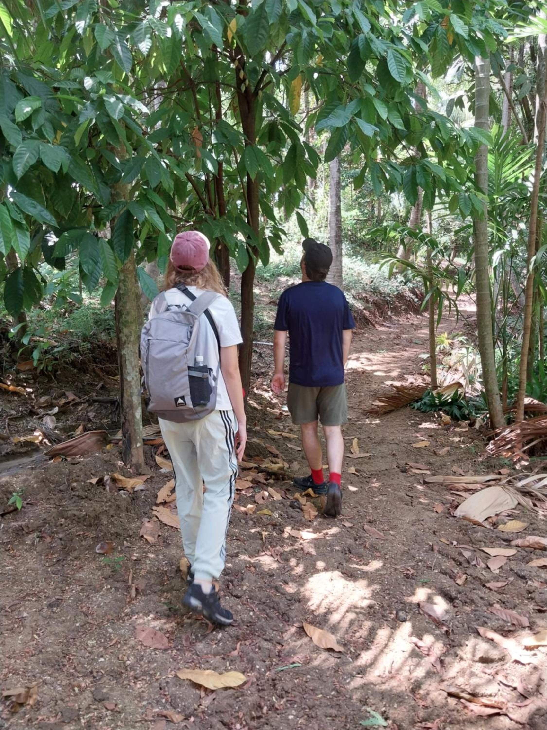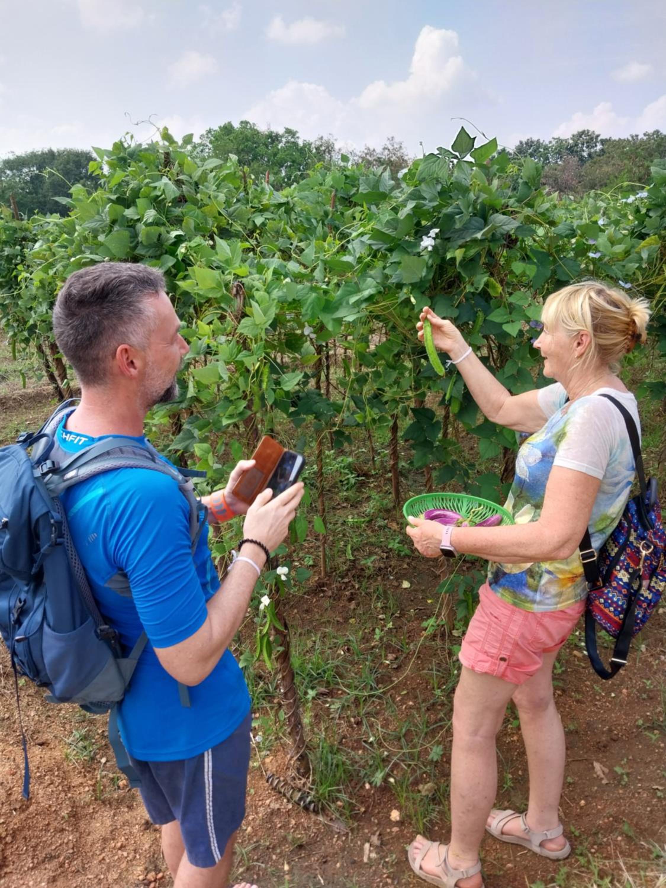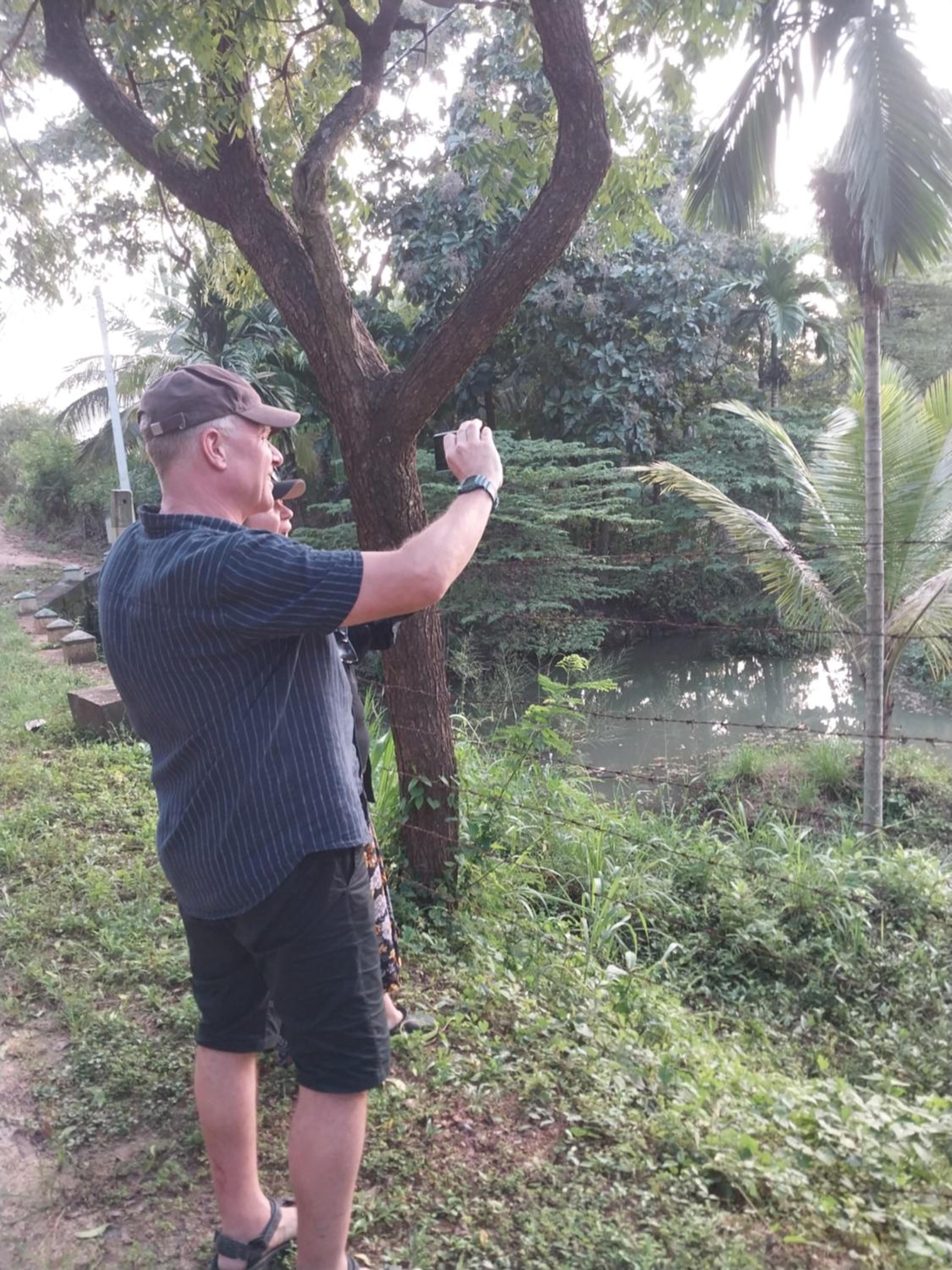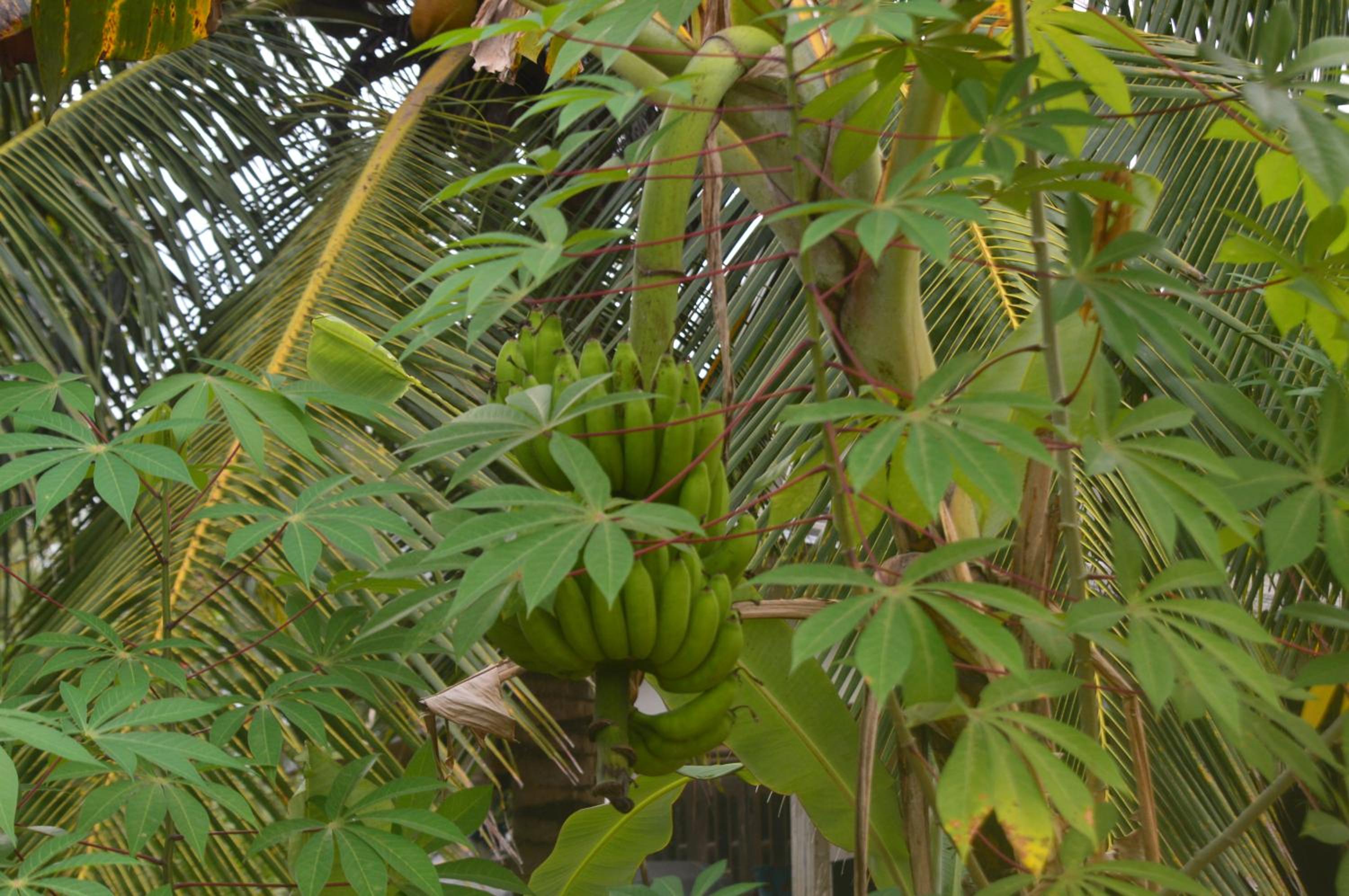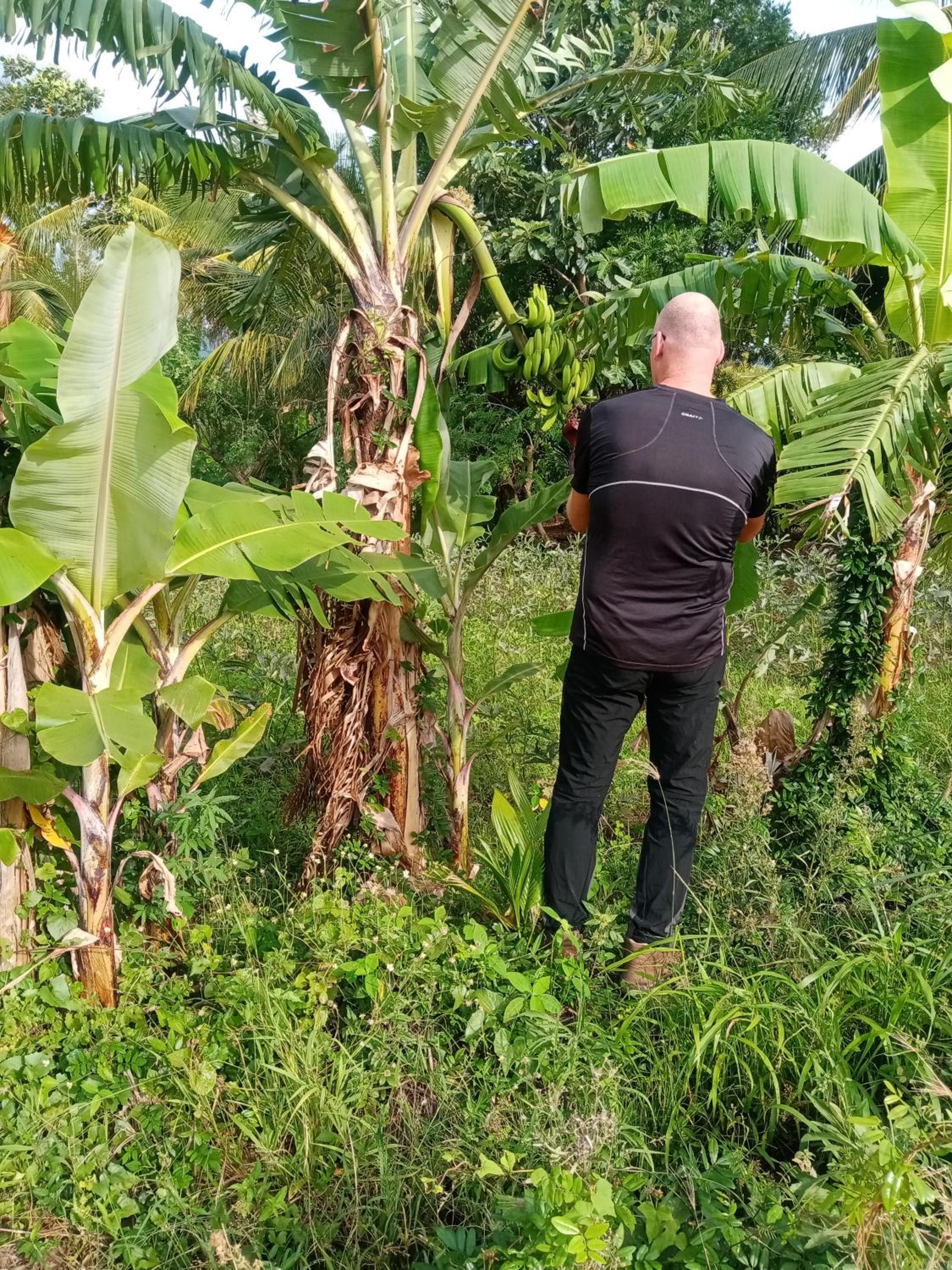 Hij vertelde heel enthousiast over allerlei bomen op zijn terrein, 3 soorten bananen, 3 soorten mango's, verschillende soorten tomaten, nog meer groenten etc. er schijnen ook heel veel bijzondere vogels te leven. Was heel erg interessant.