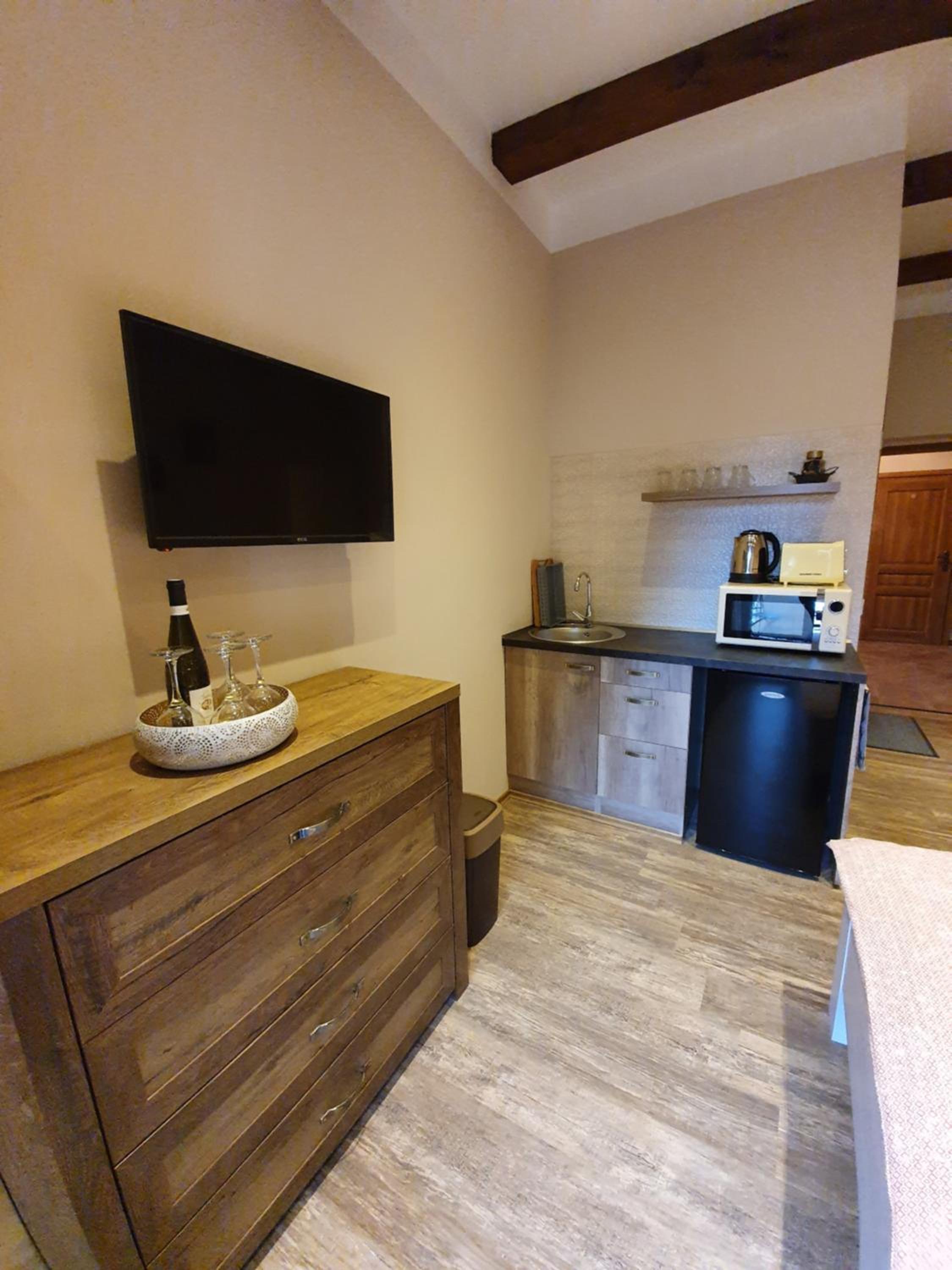 Absolute Ruhe, sehr schönes Haus, romantisch gelegen. Das Zimmer war sehr liebevoll eingerichtet. Die Betten 1A. Wir haben perfekt darin geschlafen. Die kleine Küche hatte alles was man benötigt, sogar ein Eierkocher für 3 Eier war vorhanden. Die Kaffemaschine funktioniert allerdings nur mit speziellen Taps für Bosch Tassimo, der Strichcode auf den Pads steuert das Brühprogramm der Machine. Leider war die für die Maschine gedachte Reinigungsdiscette nicht zu finden, da wir die Maschine vor der Benutzung gerne gereinigt hätten. Ablagen, Schränke und Tische gibt es ausreichend. Wir haben uns noch den kleinen Tisch vom Balkon mit in's Zimmer geholt.