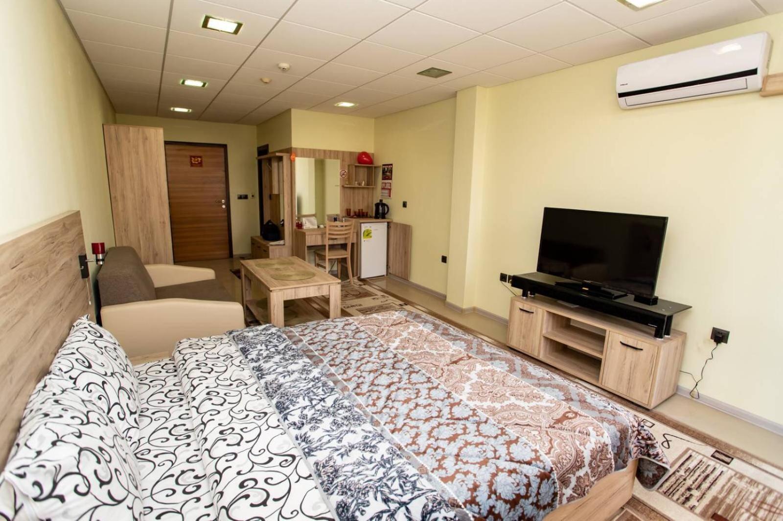 Everything in the room was very modern. It was clean and comfortable. The staff was very nice and helpful. The room was very big and had a balcony with nice view. The building is in a gated community and you can park your car inside the perimeter. Make sure you say that you will be with car in order to secure a parking spot. In general it was great value for the money comared to other places in the area I stayed in.