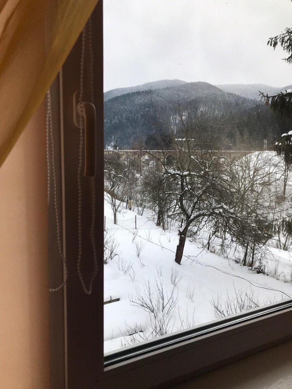 З вікна чудові краєвиди, видно віадук, а зранку гори вкриті хмарами, дуже гарно