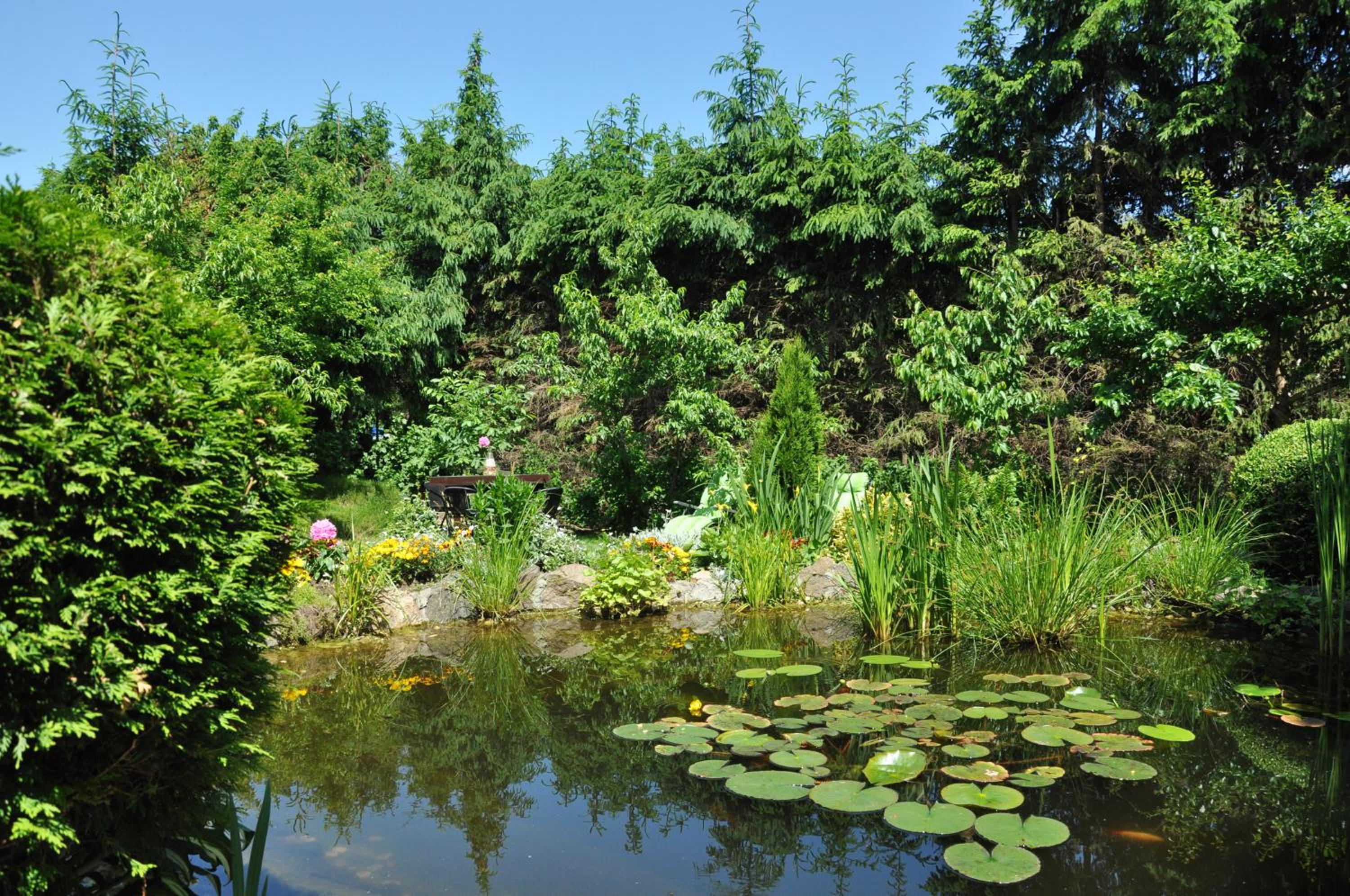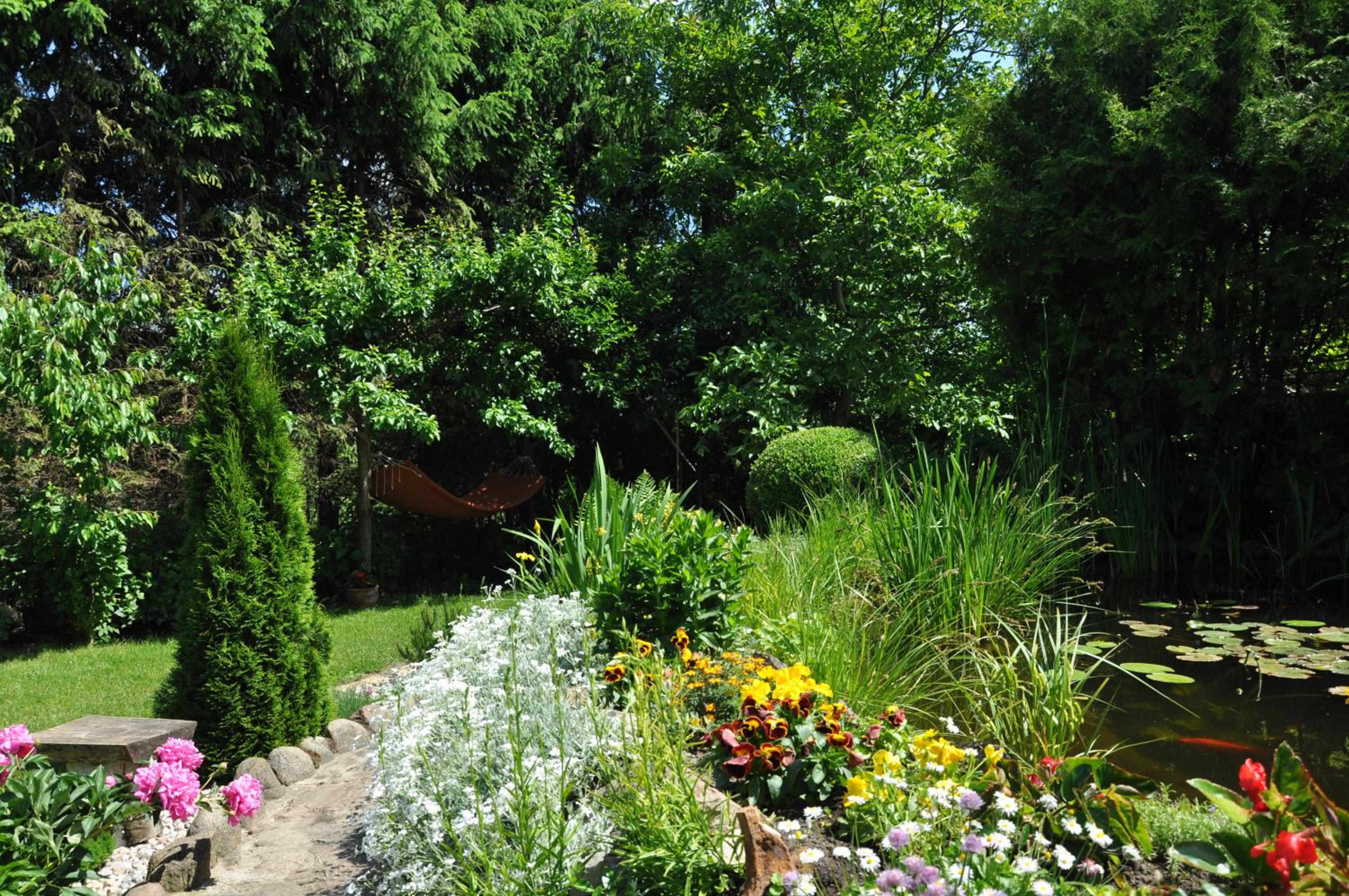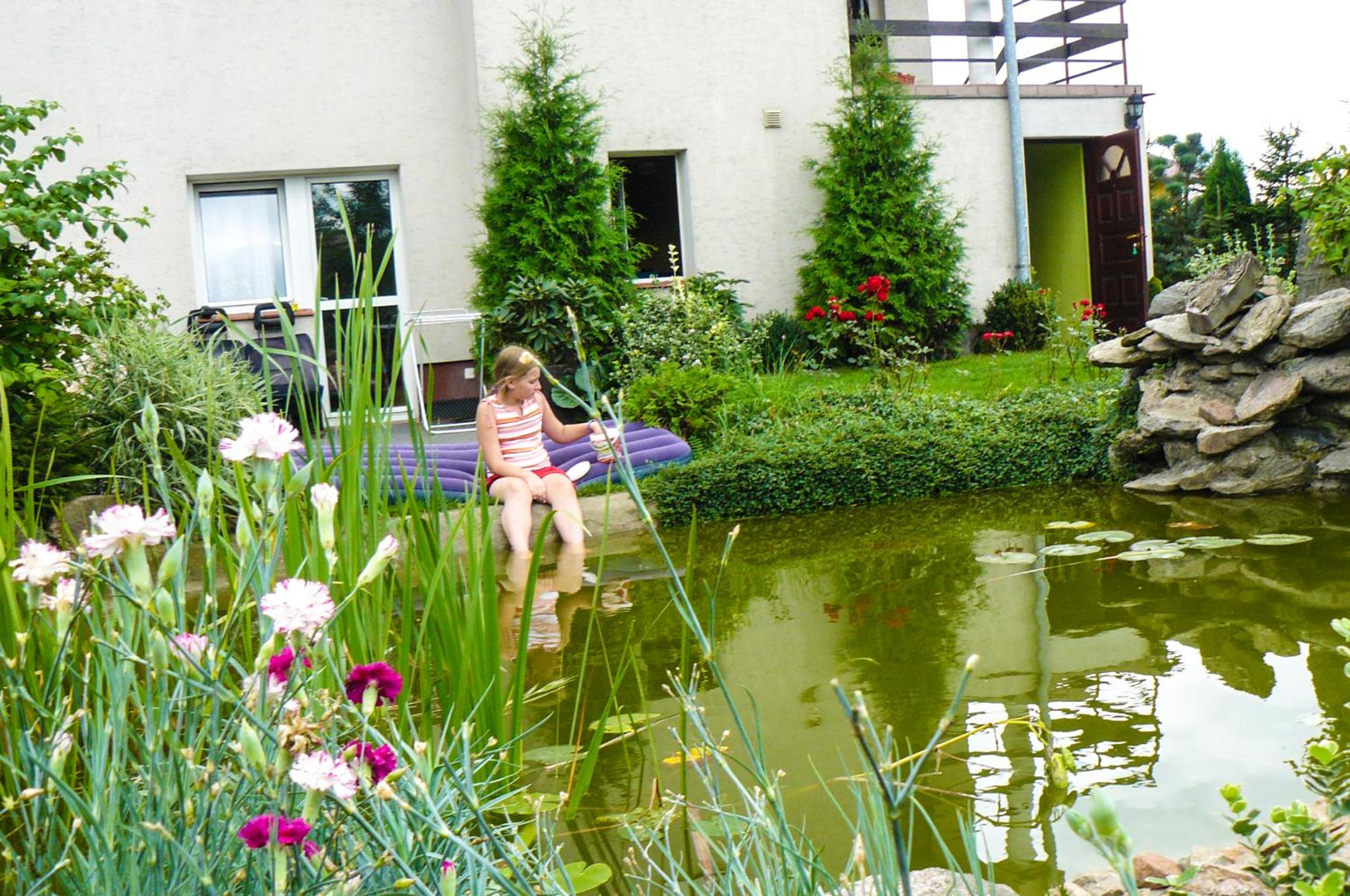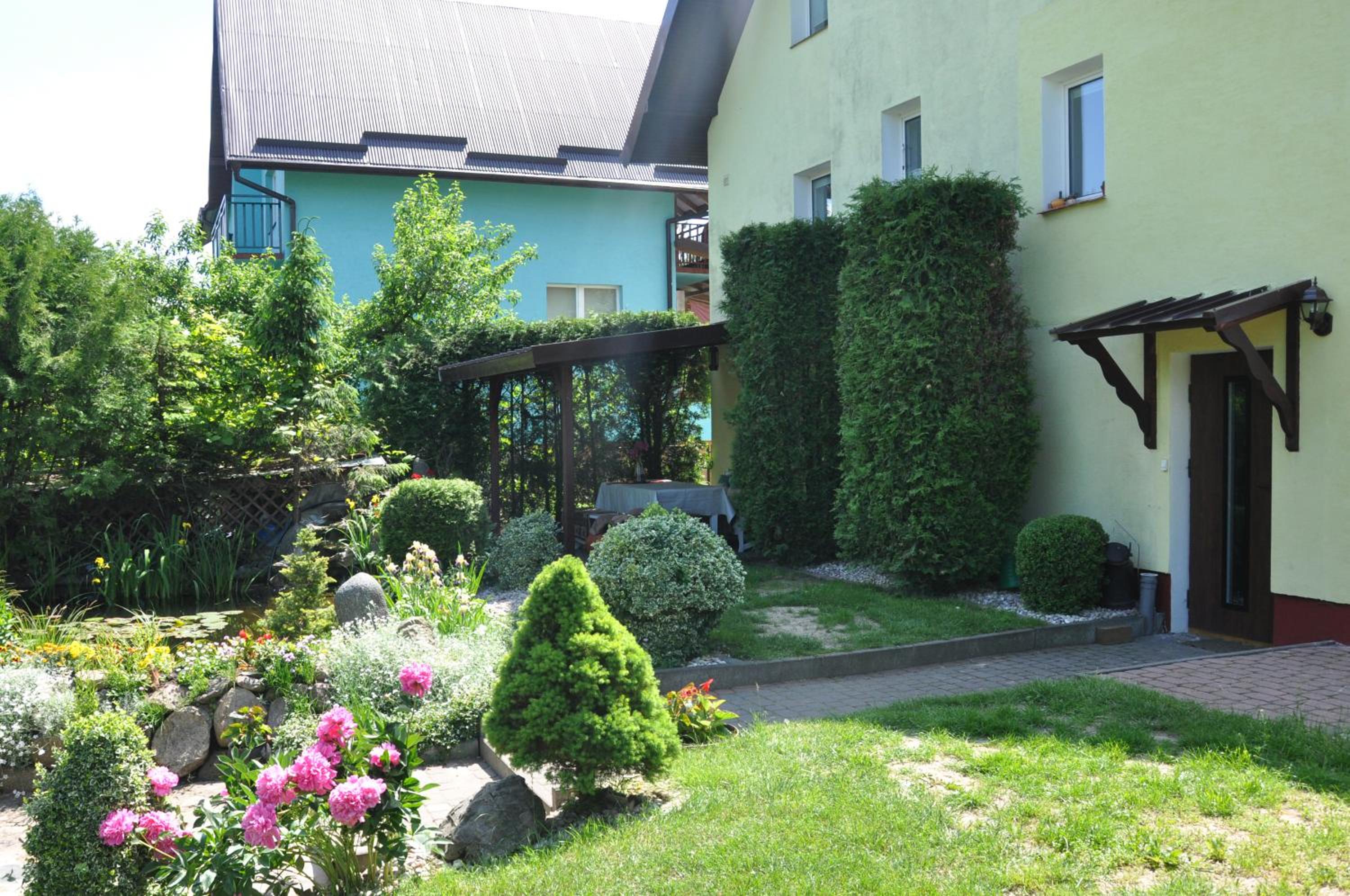 Garden Oasis: Step into a serene setting at Oaza U Tadeusza, where a lush garden and a tranquil pond await to greet you upon arrival.