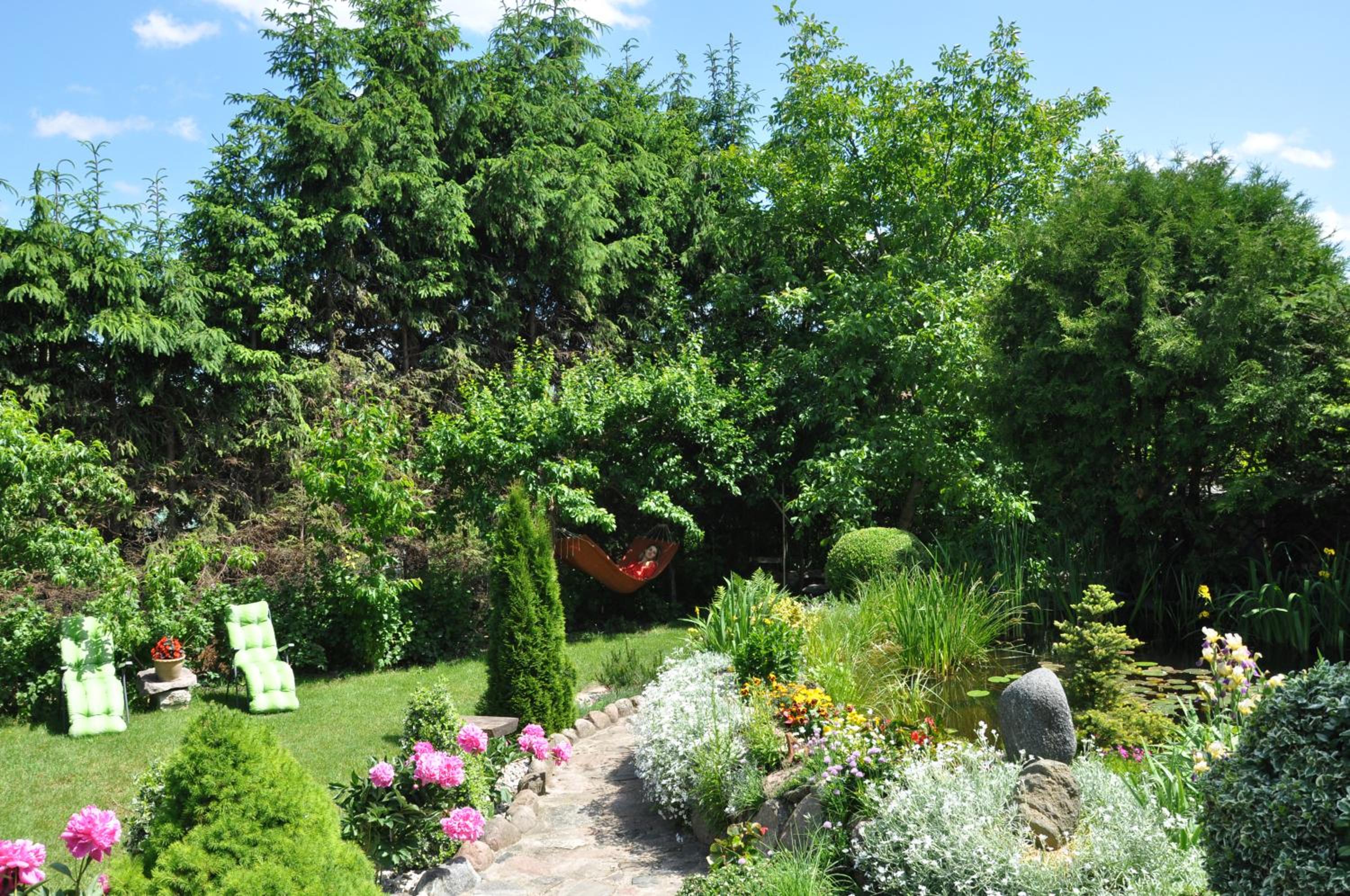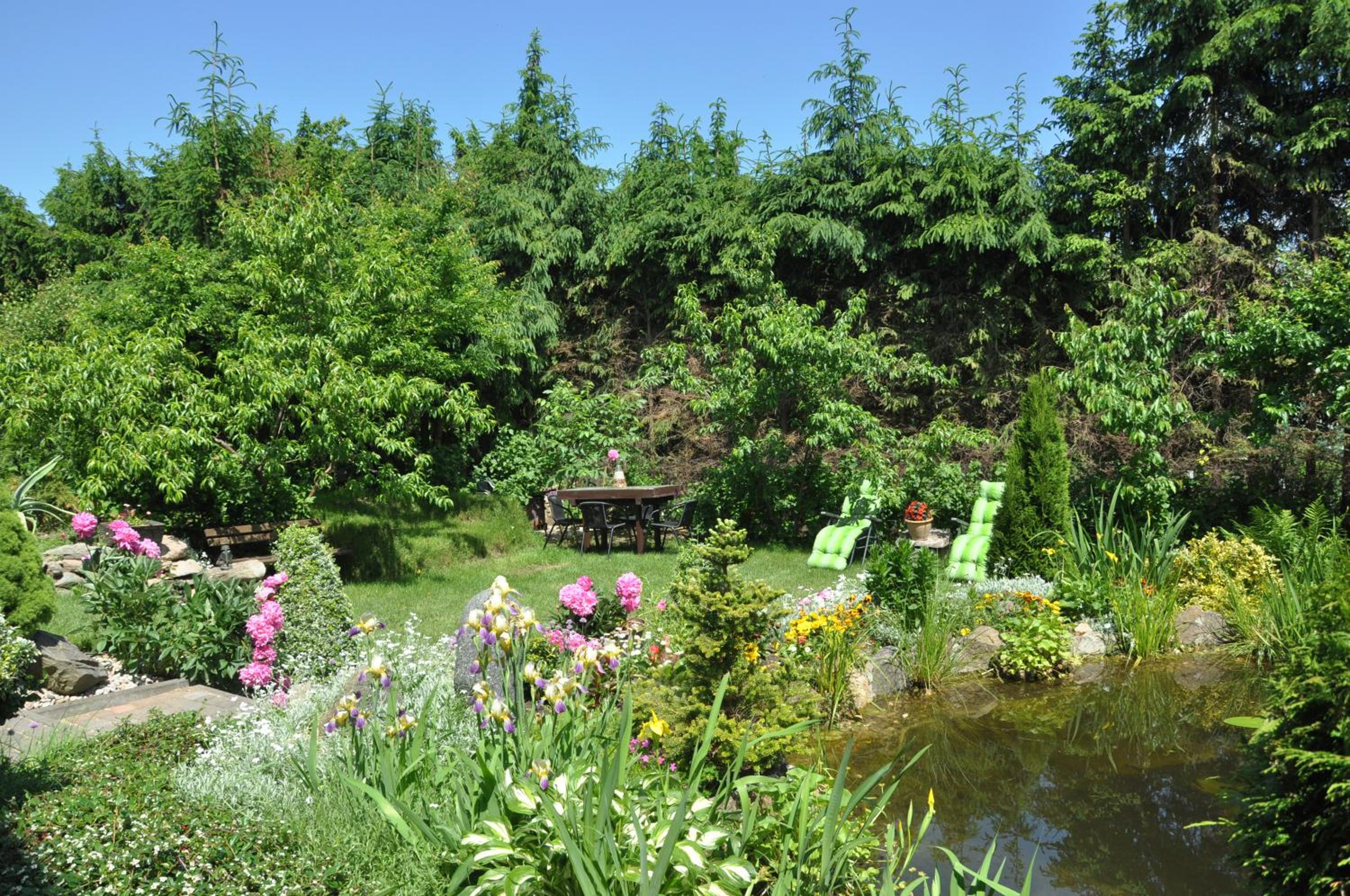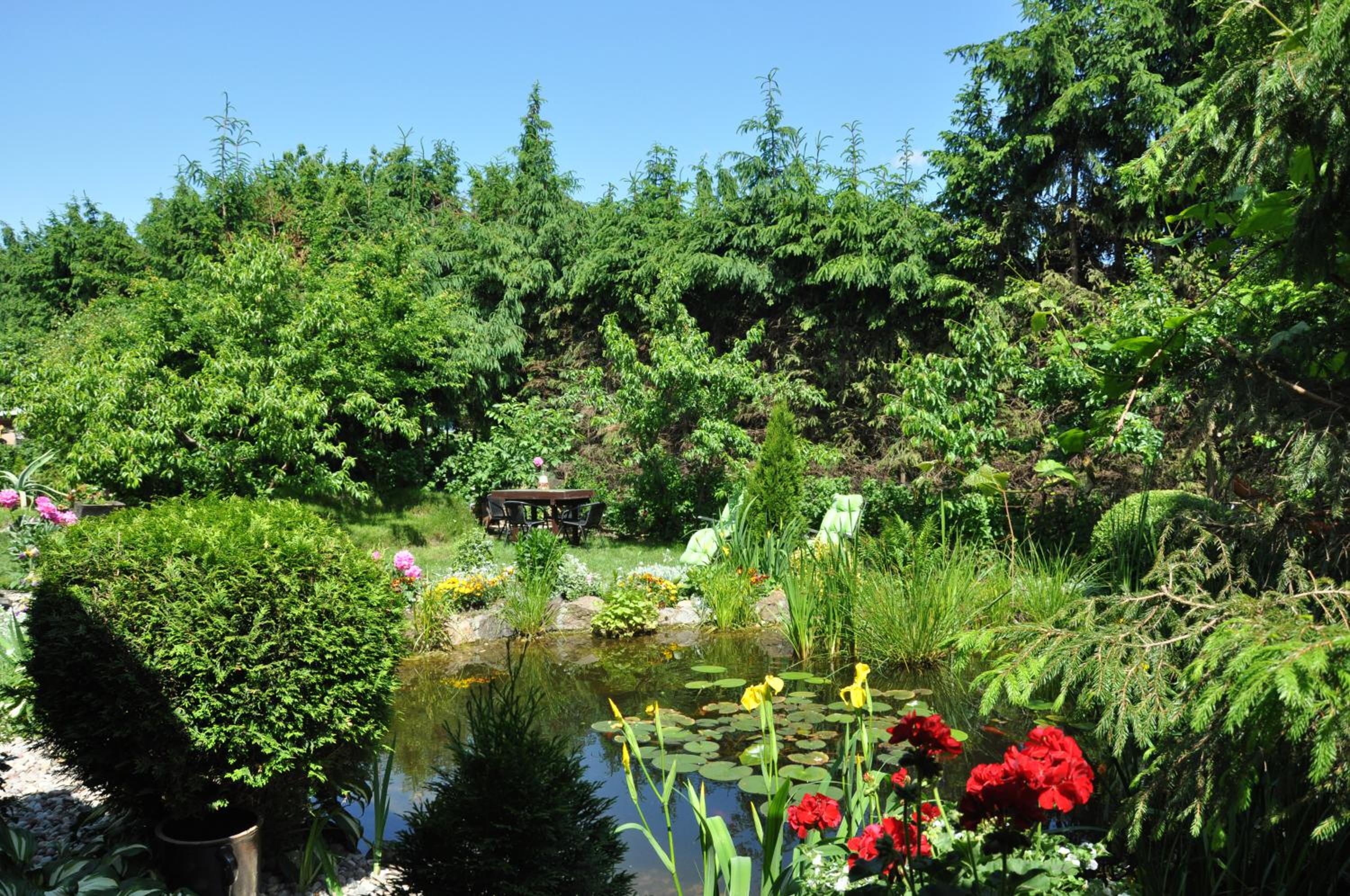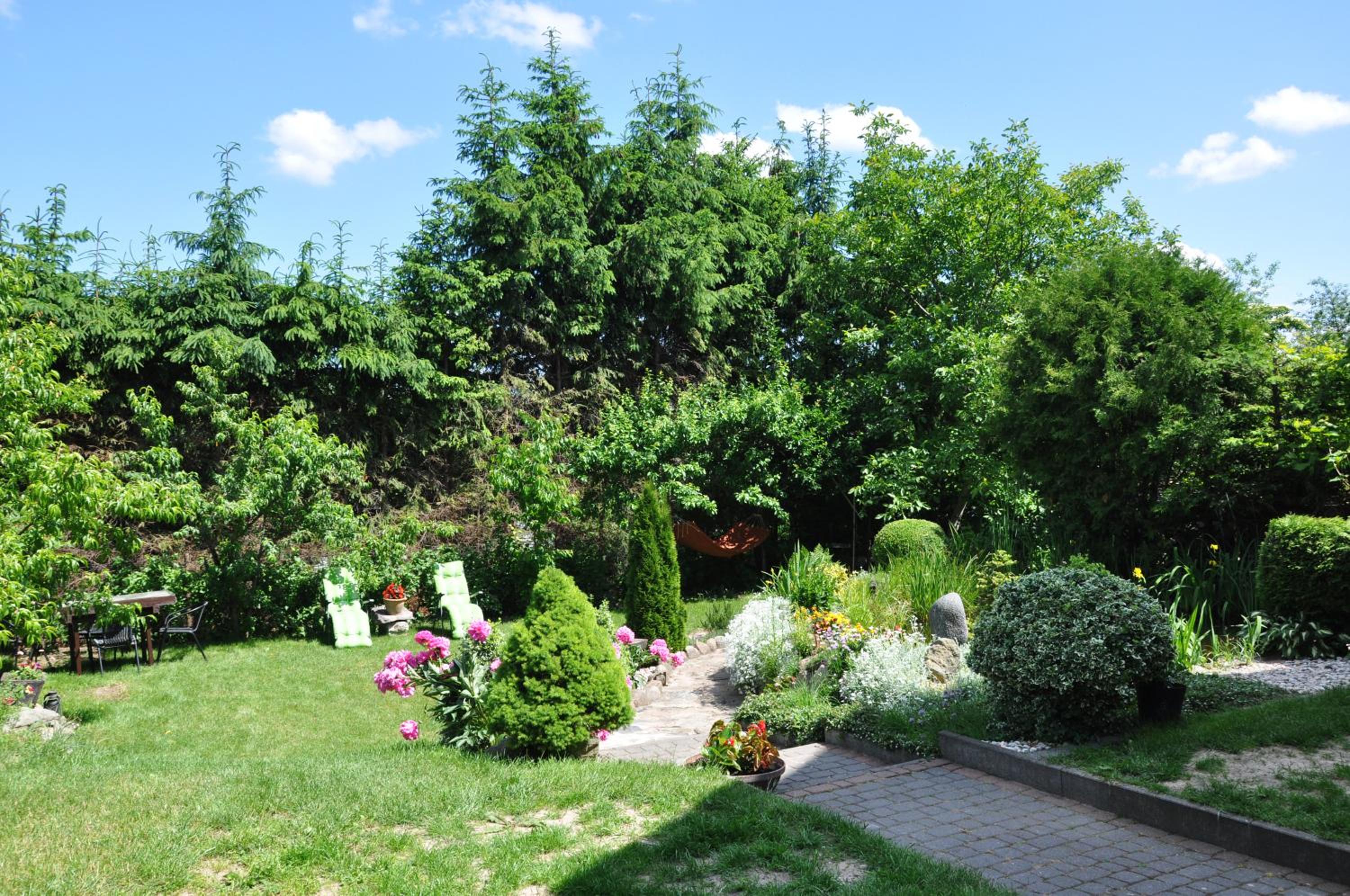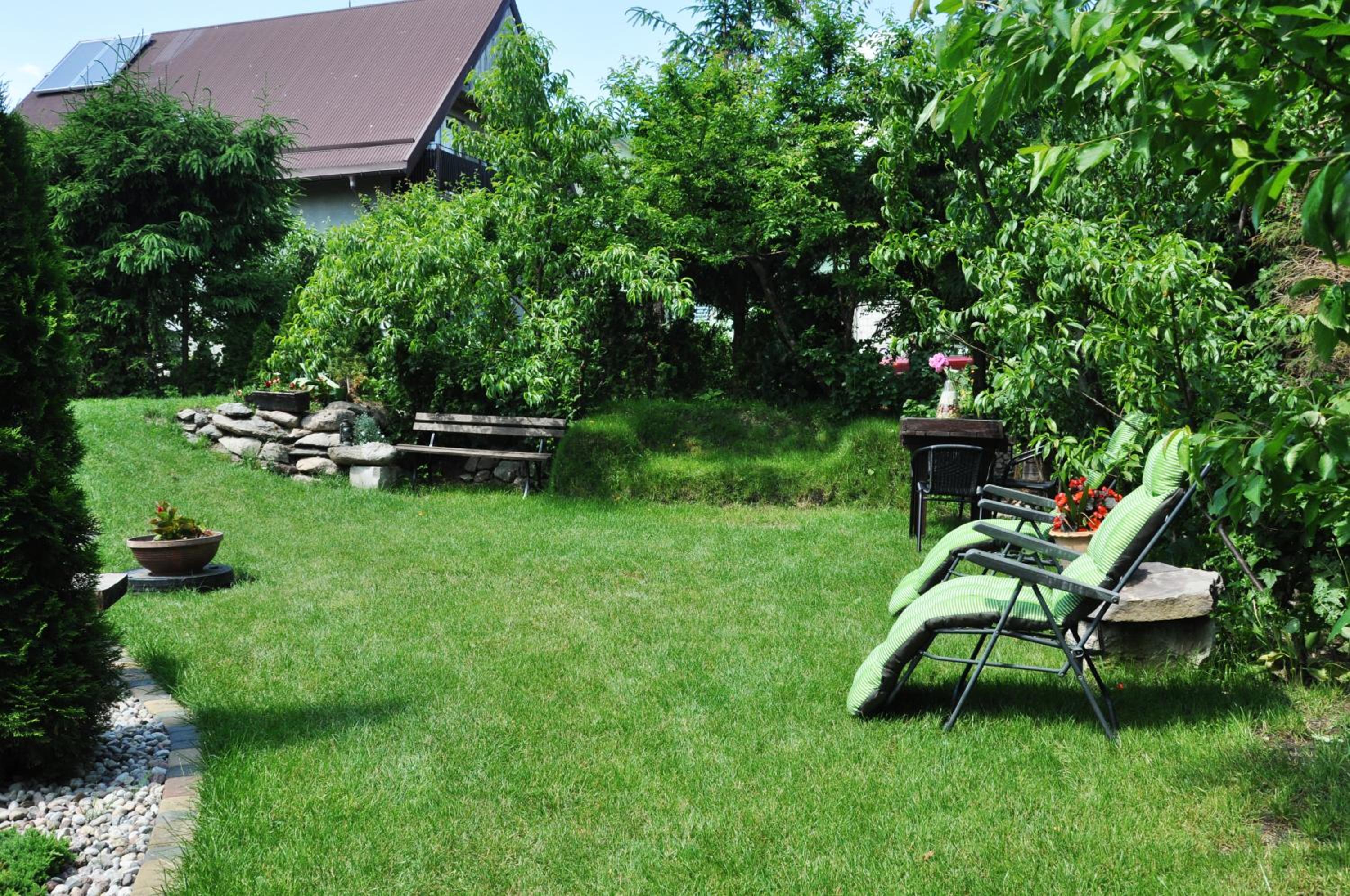 Garden Oasis: Step into a serene setting at Oaza U Tadeusza, where a lush garden and a tranquil pond await to greet you upon arrival.