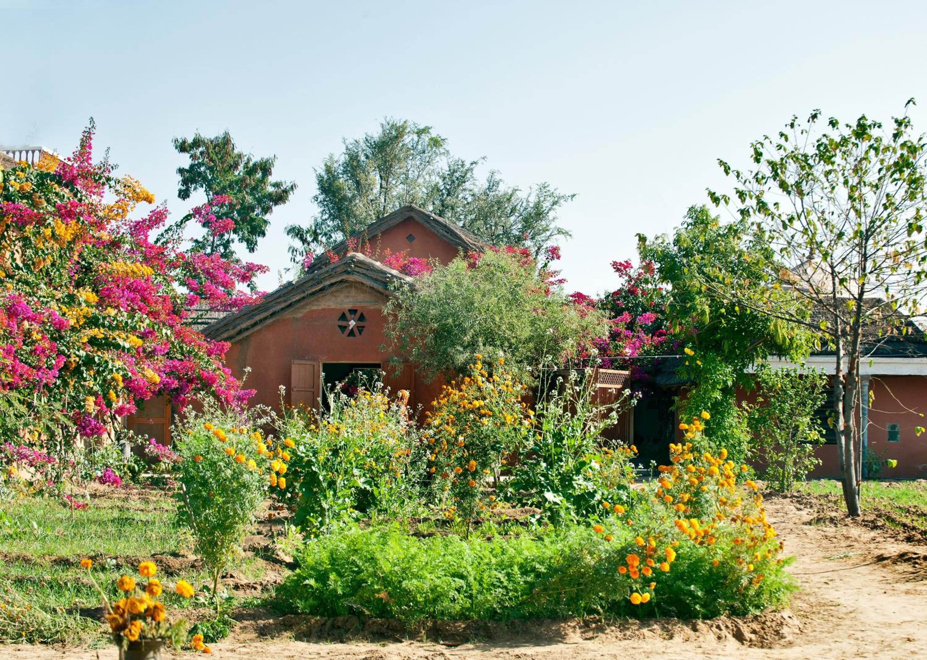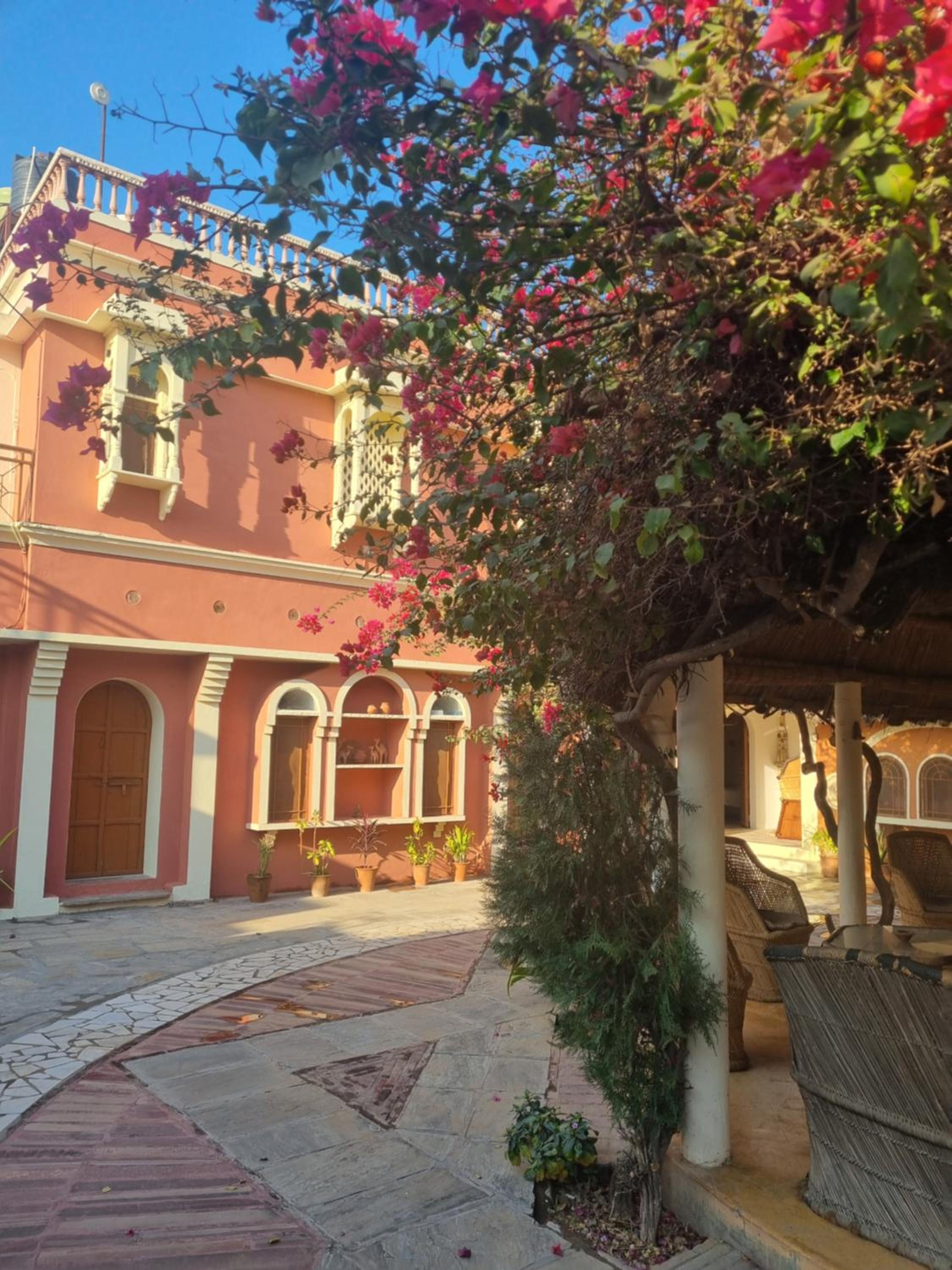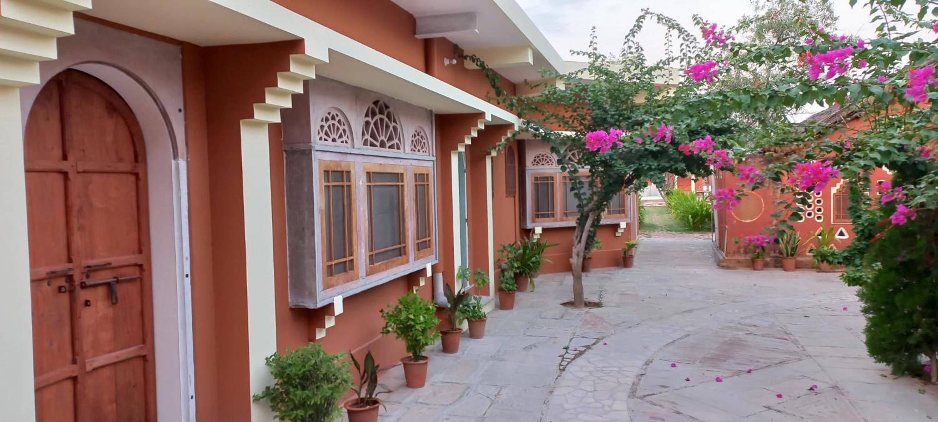 Jeg bookede med kort varsel, fordi jeg var i Mandawa og ikke rigtig følte mig godt tilpas der (for turistet og forfaldent), og da der ikke var nogen værelser at få inde i selve Nawalgarh, reserverede jeg i stedet her. Det viste sig imidlertid at være meget bedre end at bo inde i byen - kun en kort rickshawtur eller en halv times gang fra det livlige marked og havelierne, men det føles næsten som at bo på landet med fuglefløjt, grøntsagshave og en gårdsplads fuld af blomster.