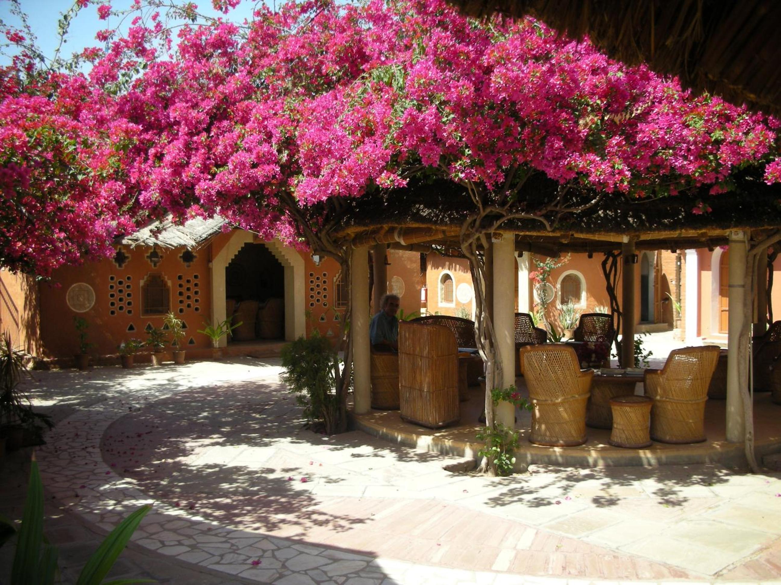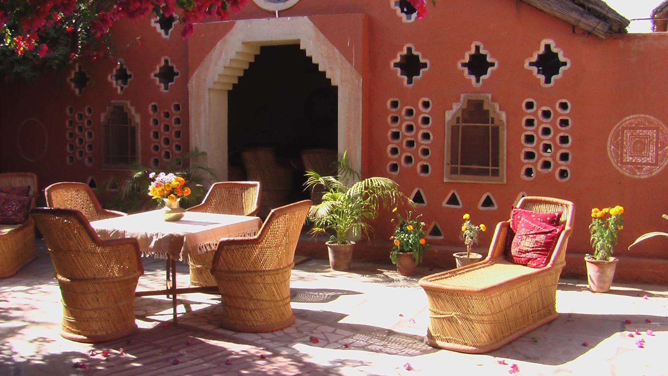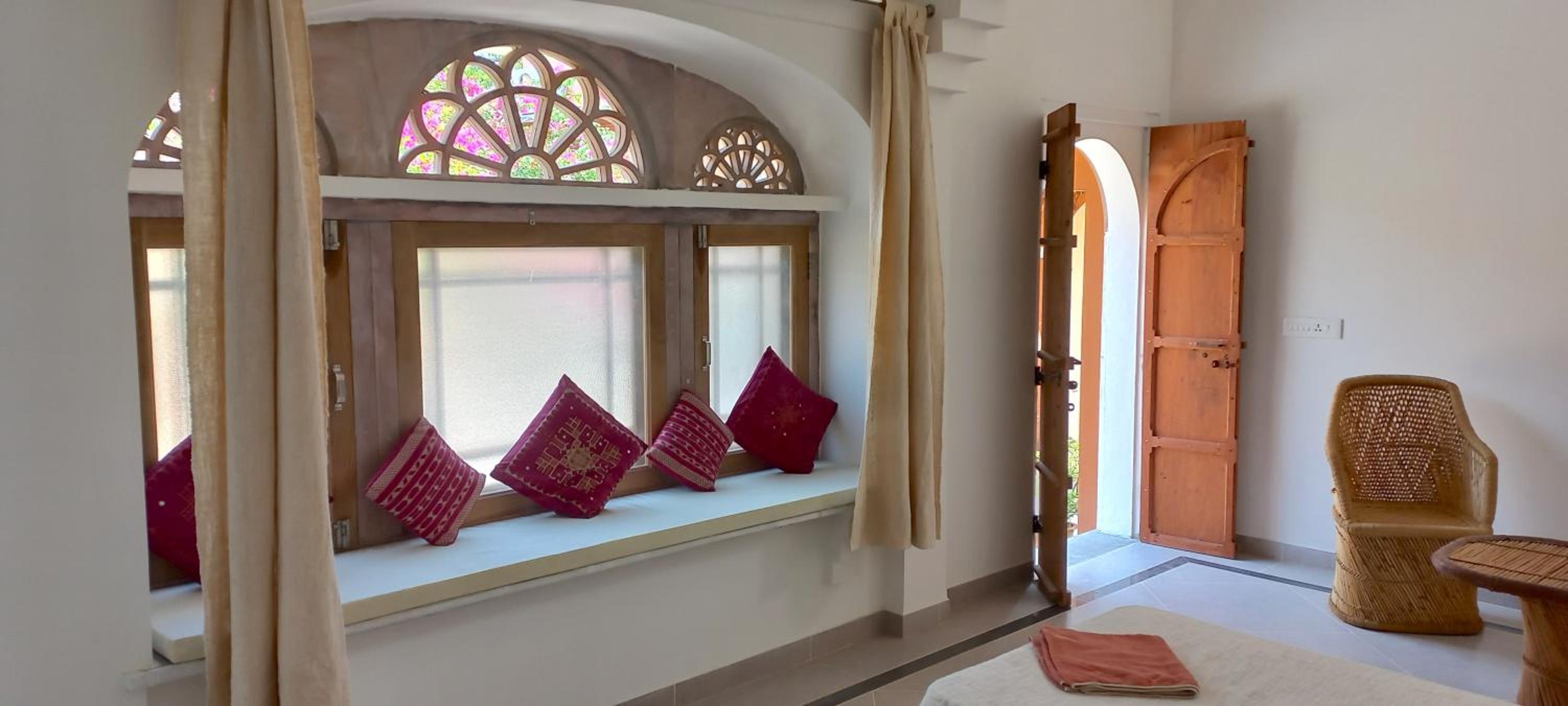 Jeg bookede med kort varsel, fordi jeg var i Mandawa og ikke rigtig følte mig godt tilpas der (for turistet og forfaldent), og da der ikke var nogen værelser at få inde i selve Nawalgarh, reserverede jeg i stedet her. Det viste sig imidlertid at være meget bedre end at bo inde i byen - kun en kort rickshawtur eller en halv times gang fra det livlige marked og havelierne, men det føles næsten som at bo på landet med fuglefløjt, grøntsagshave og en gårdsplads fuld af blomster.