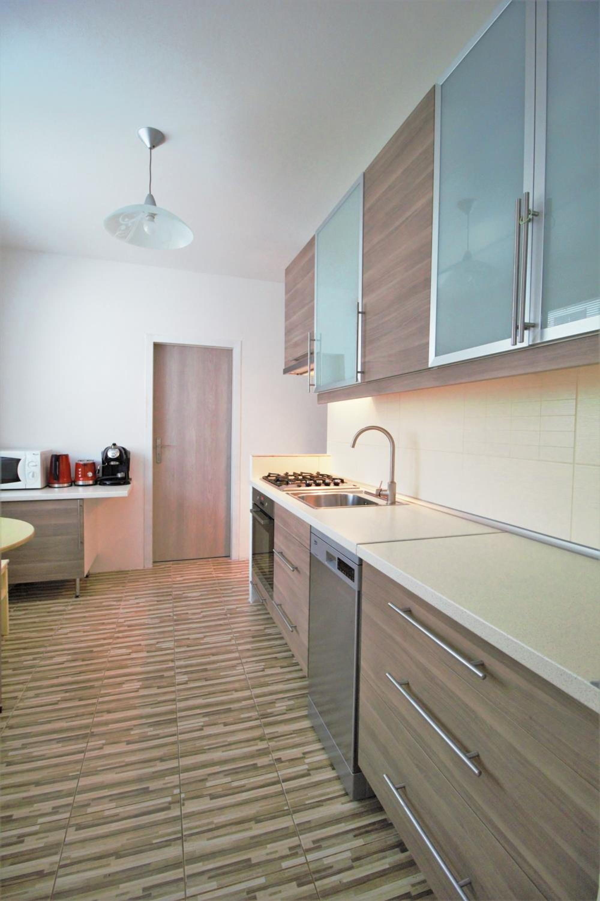 Kuchyně a obývák se sdílí s dvěma dalšími pokoji. Pokud zaplníte celý byt jako jedna parta, nebude to mít chybu, jinak nemusí být příjemné. Klasická hostelová atmosféra tu chybí.