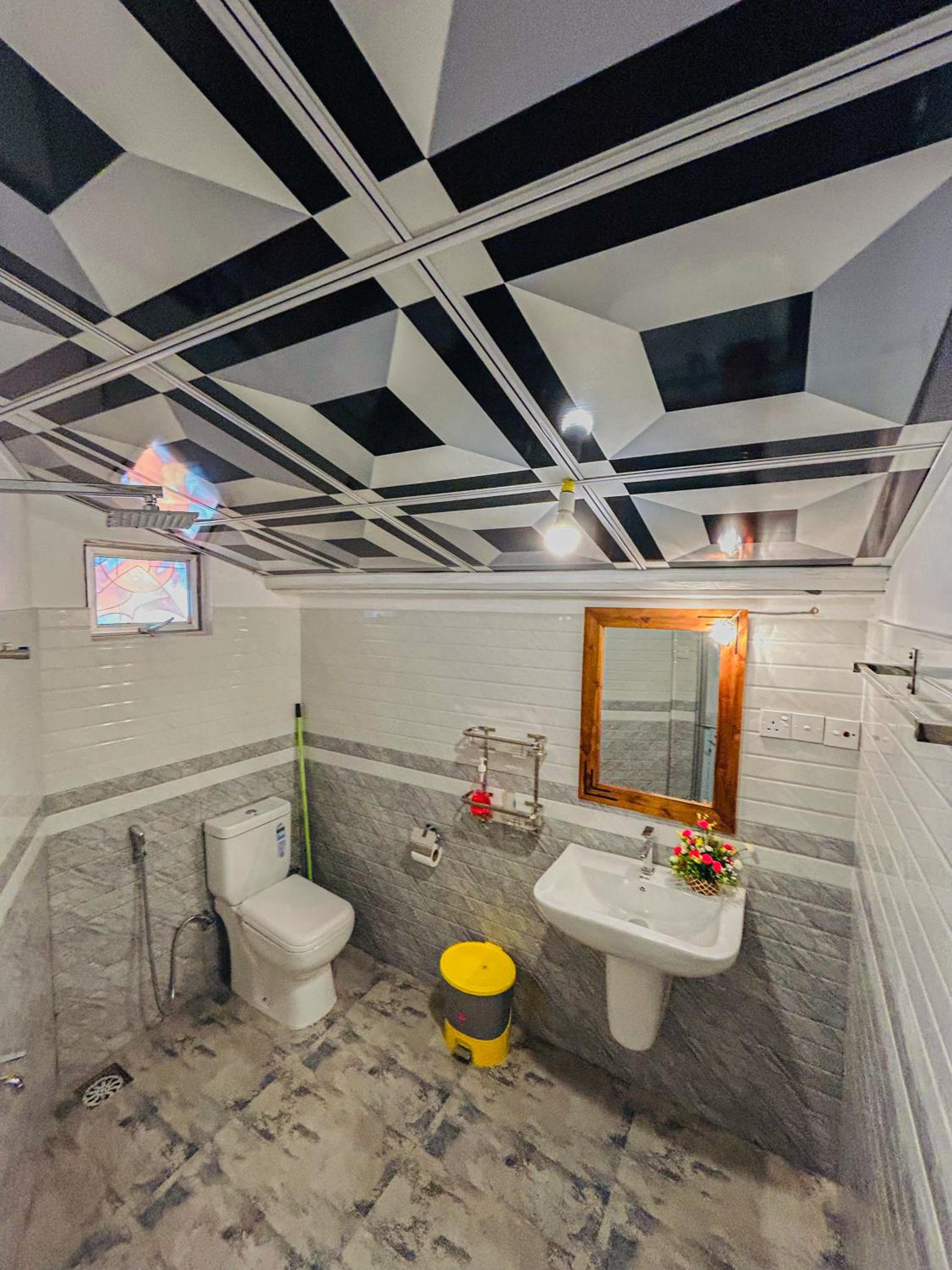 The room was tiny, with one side of the bed literally pushed against the wall. The windows were completely blocked by a concrete wall outside, offering no light or air. The bathroom was cramped, the ceiling was very low, one of the light bulbs didn't work, and there was a leak from the sink. To make matters worse, there was only one power outlet in the entire room, and it wasn't even near the bed.