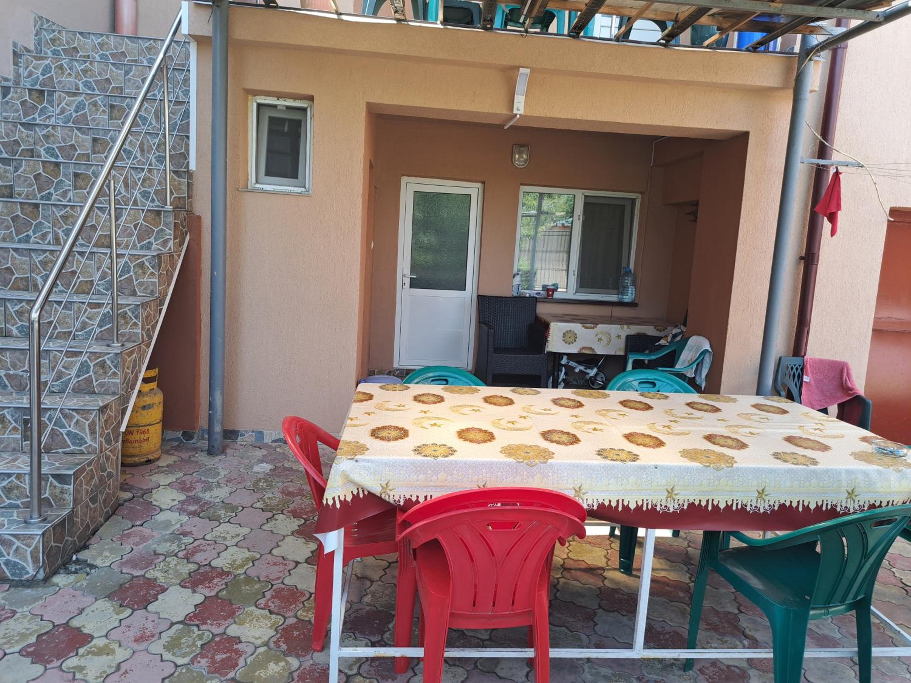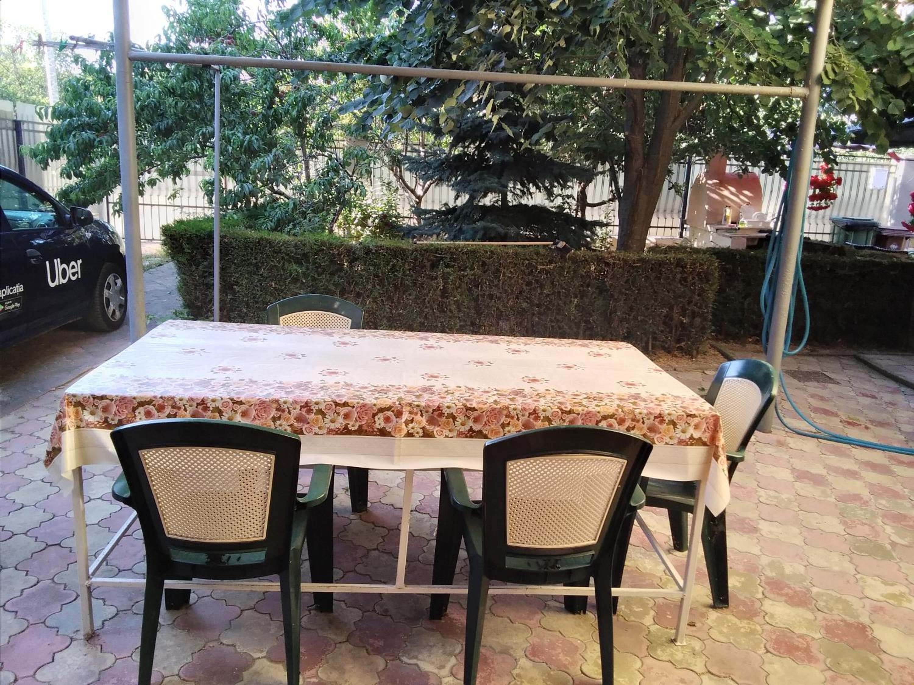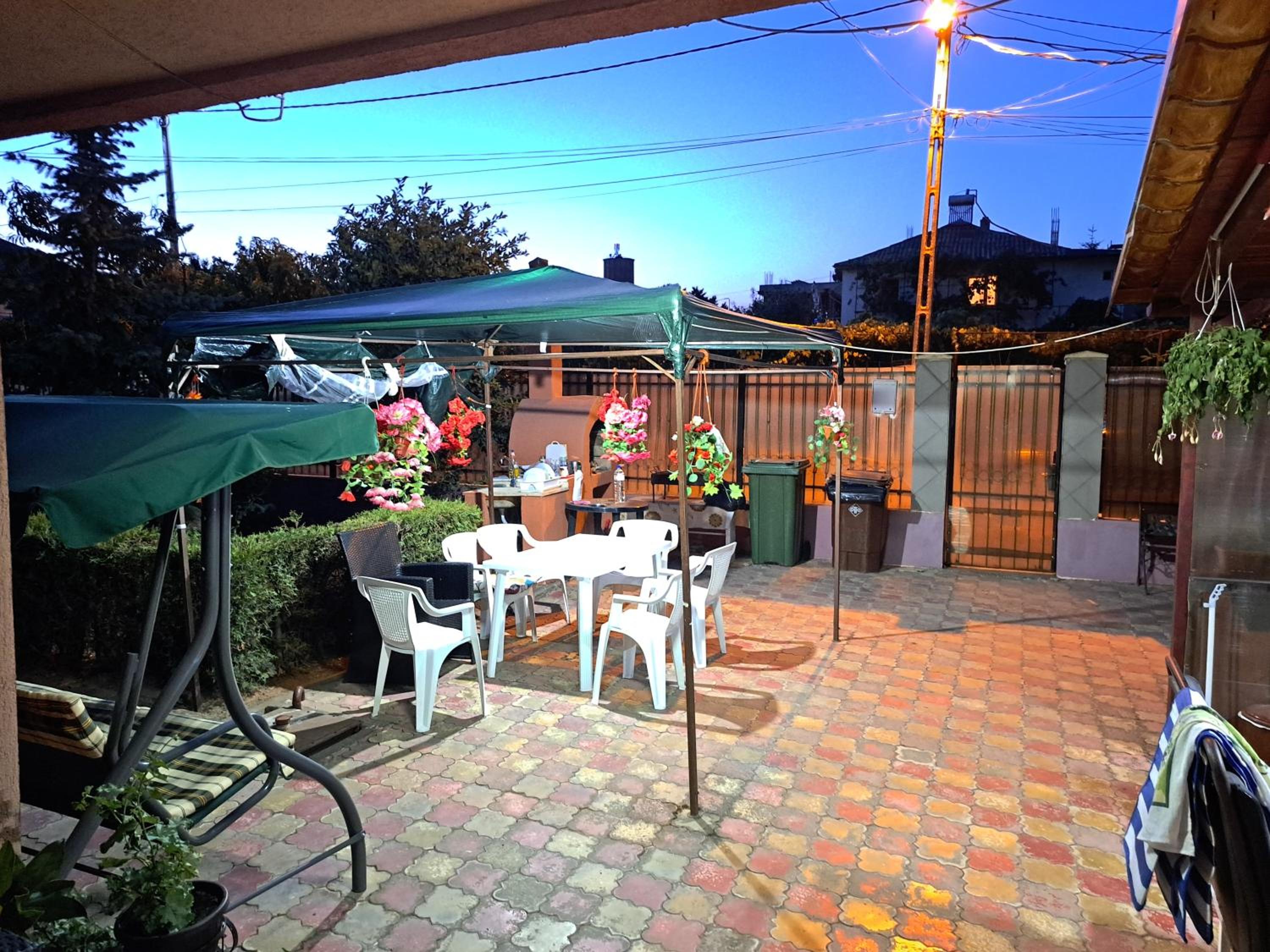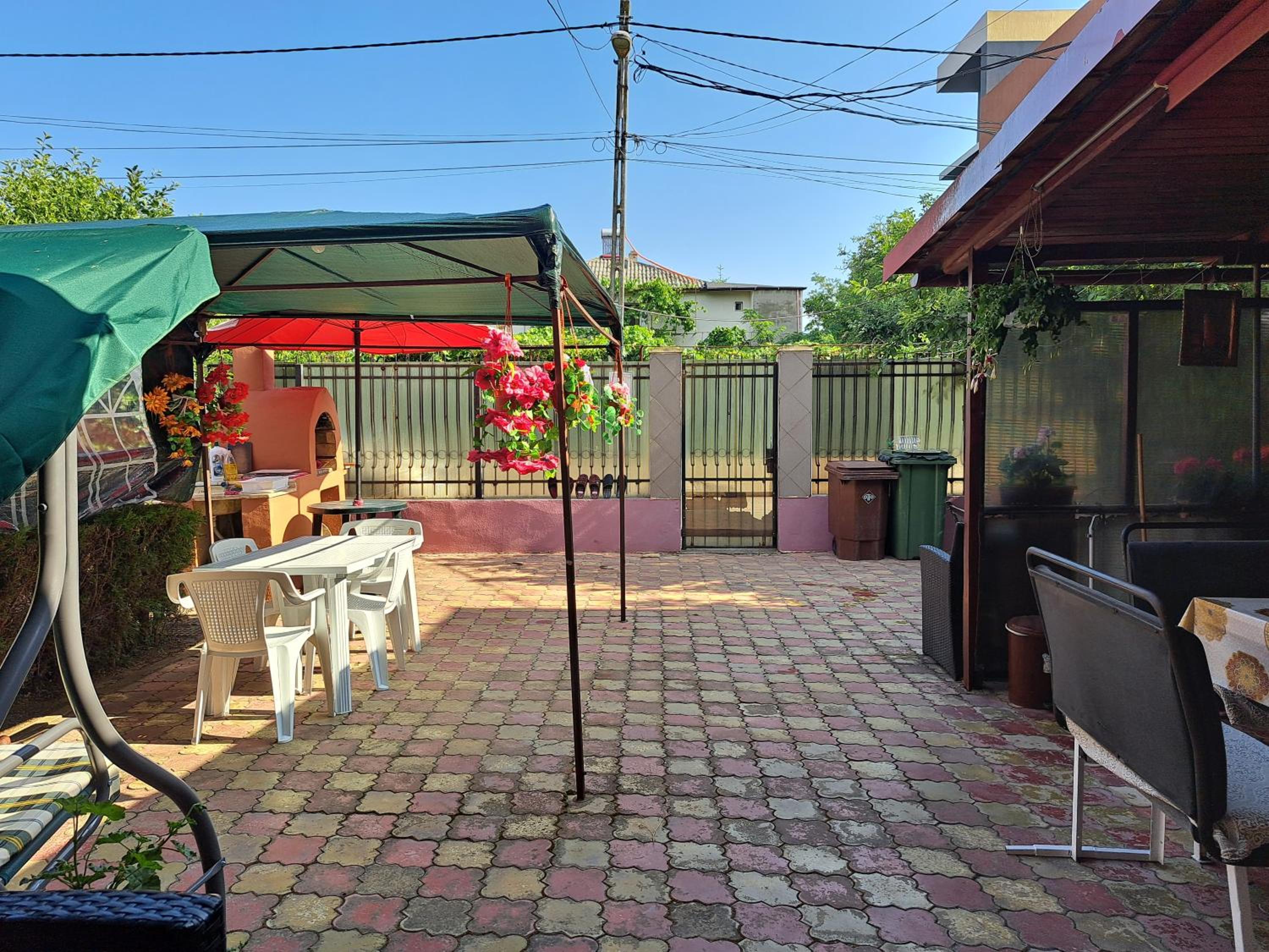 Curte mare cu leagăn pentru relaxare, scaune, mese, trambulină pentru copii.