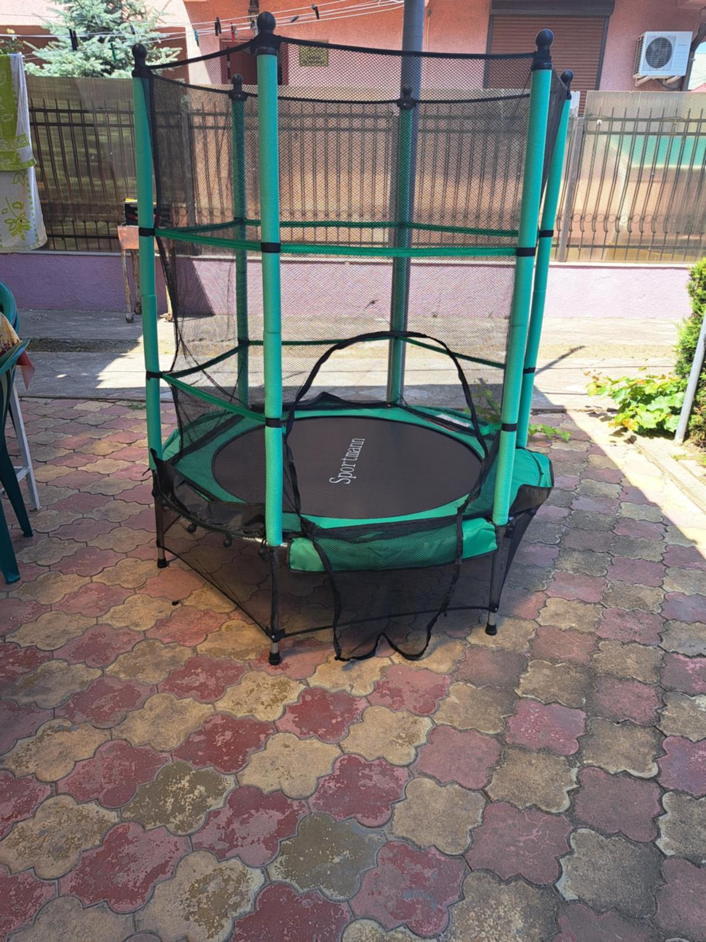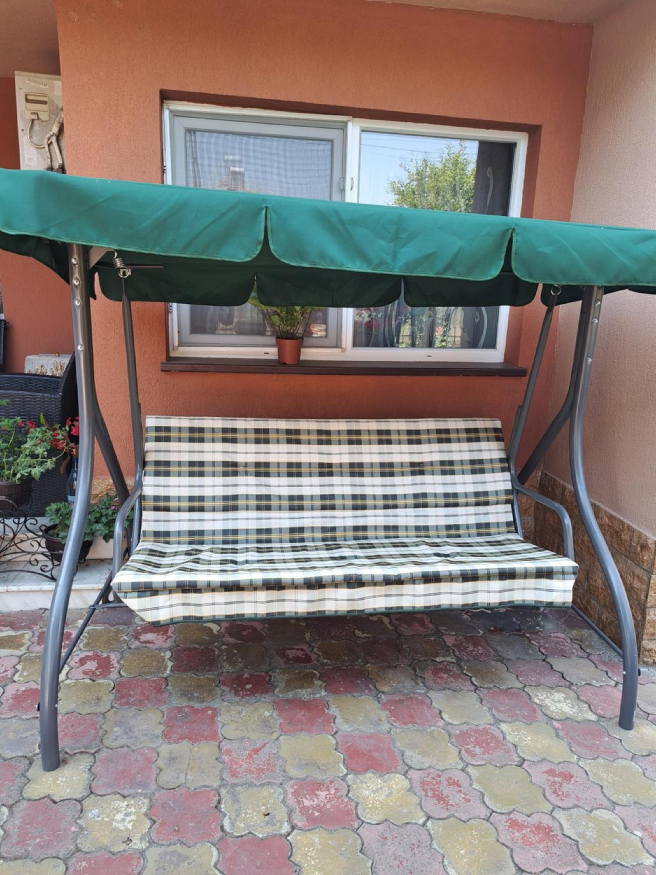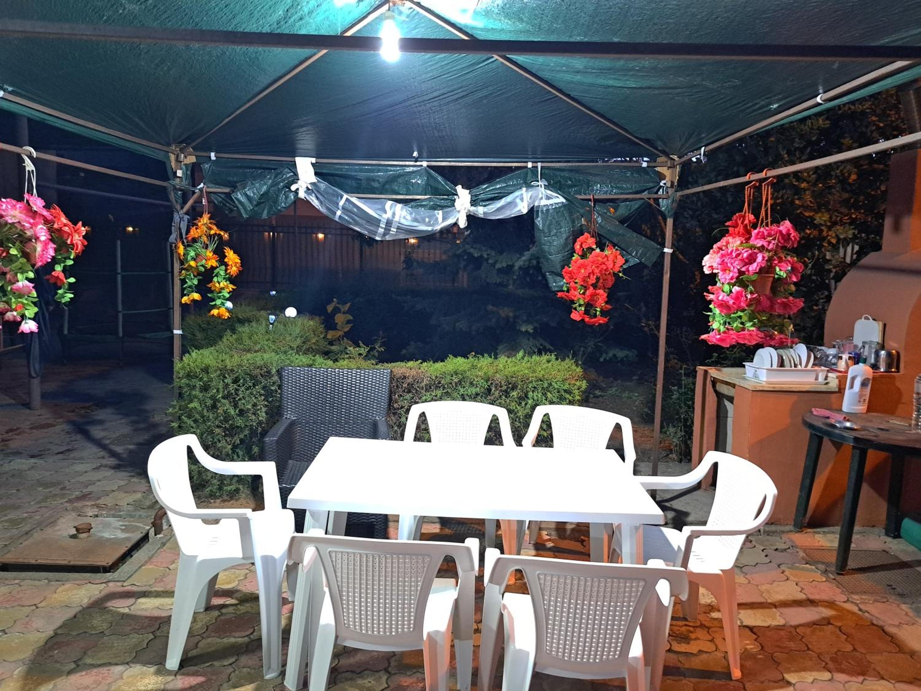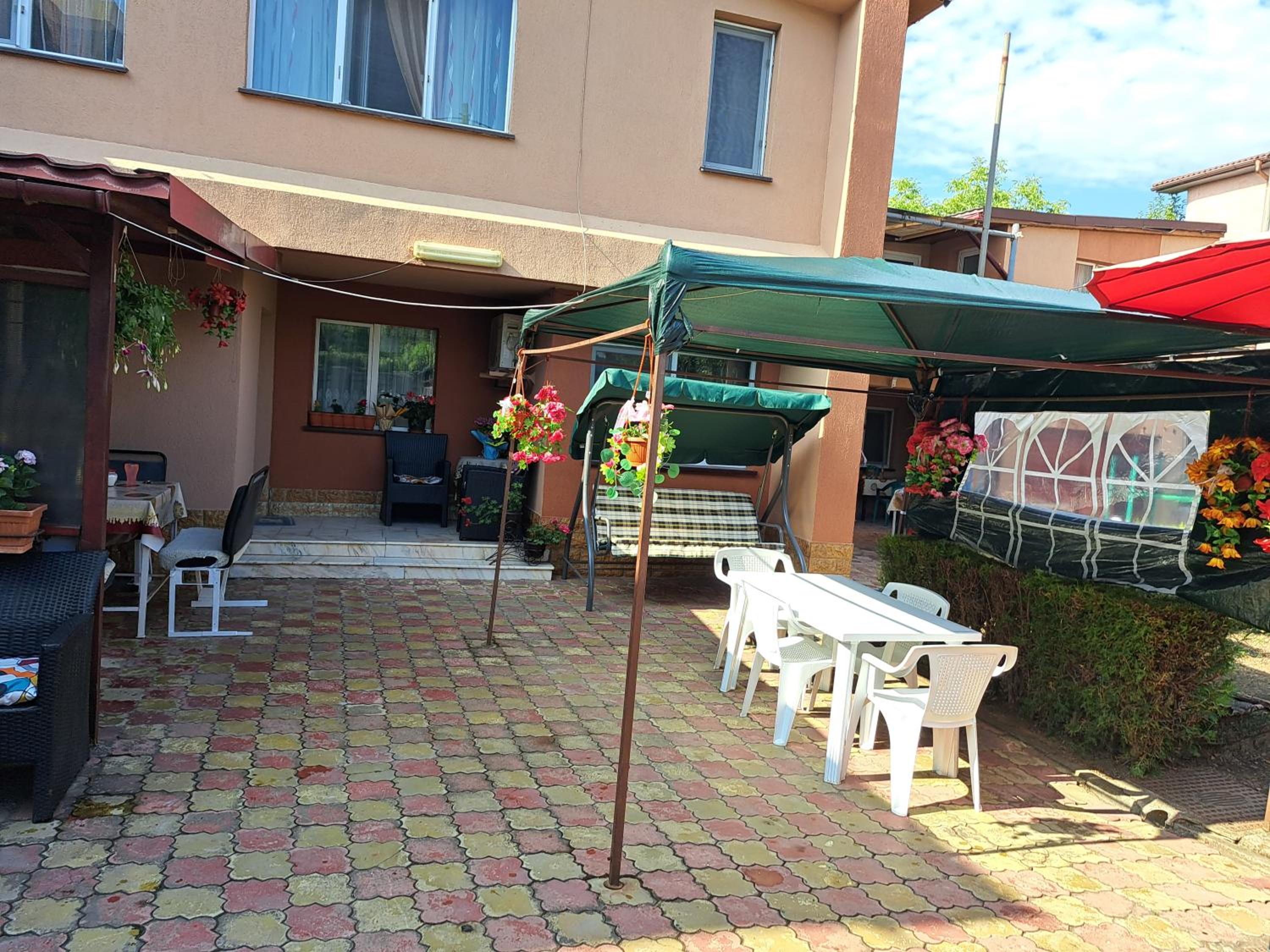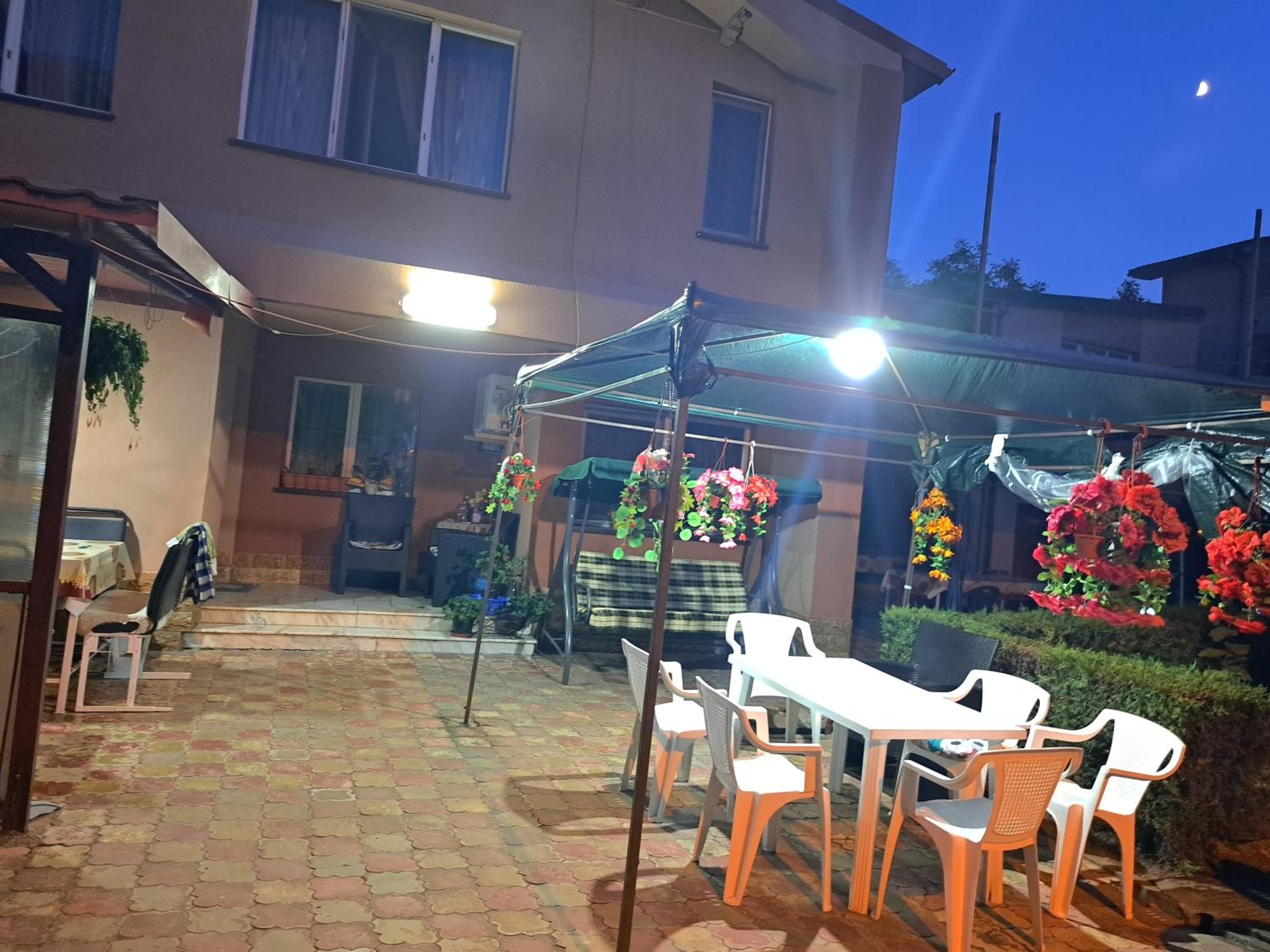 Curte mare cu leagăn pentru relaxare, scaune, mese, trambulină pentru copii.
