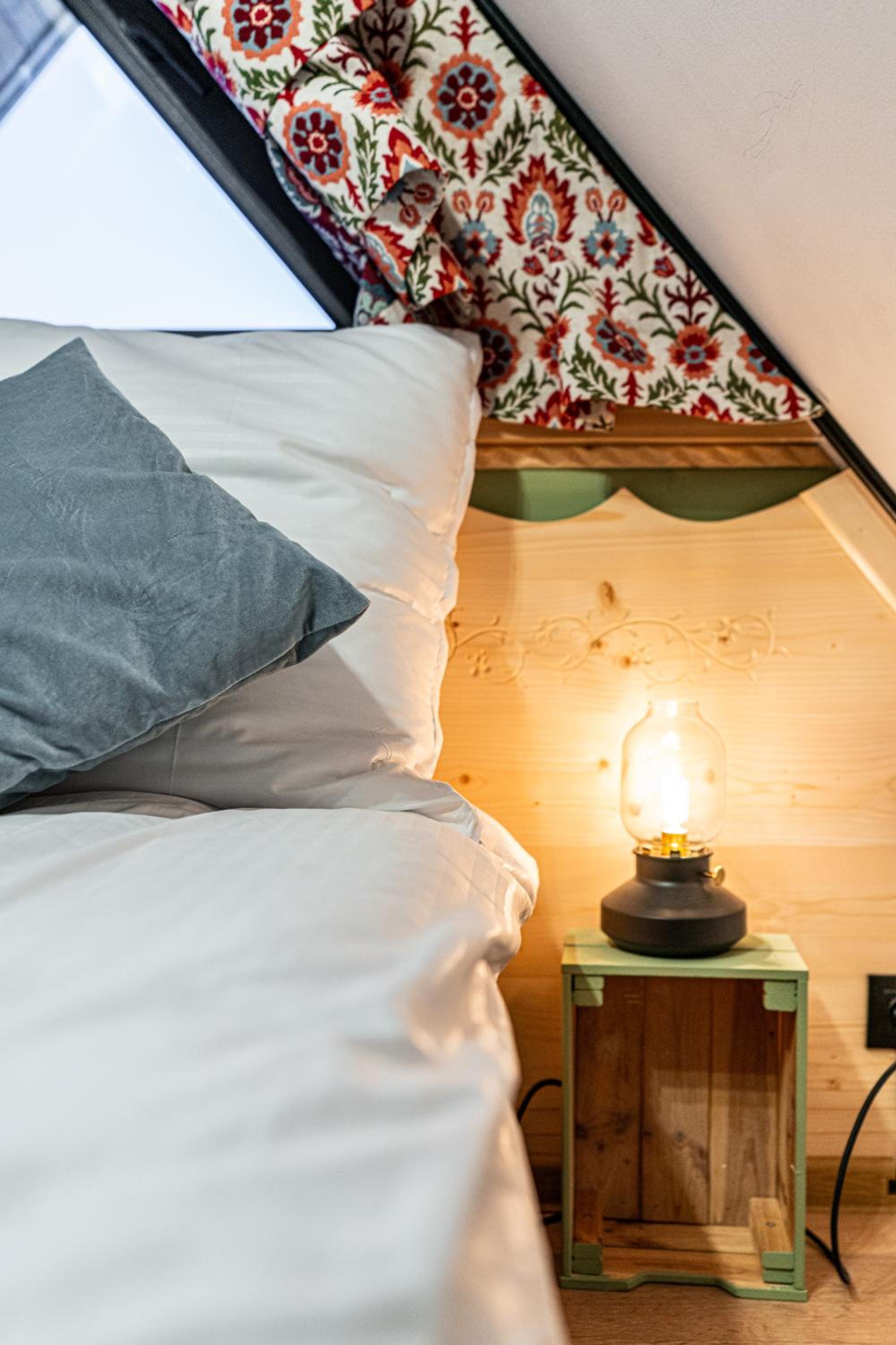 The bed was a bit small for 2 people especially because it was under the roof and the ceiling was low in one part.