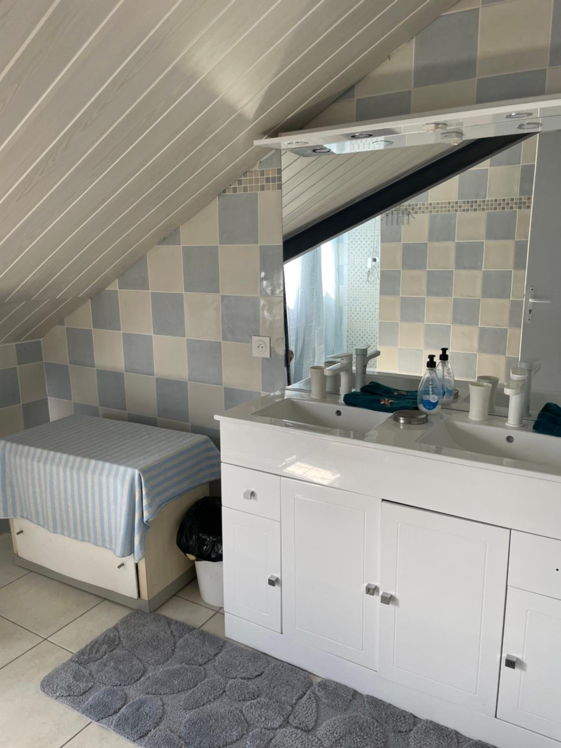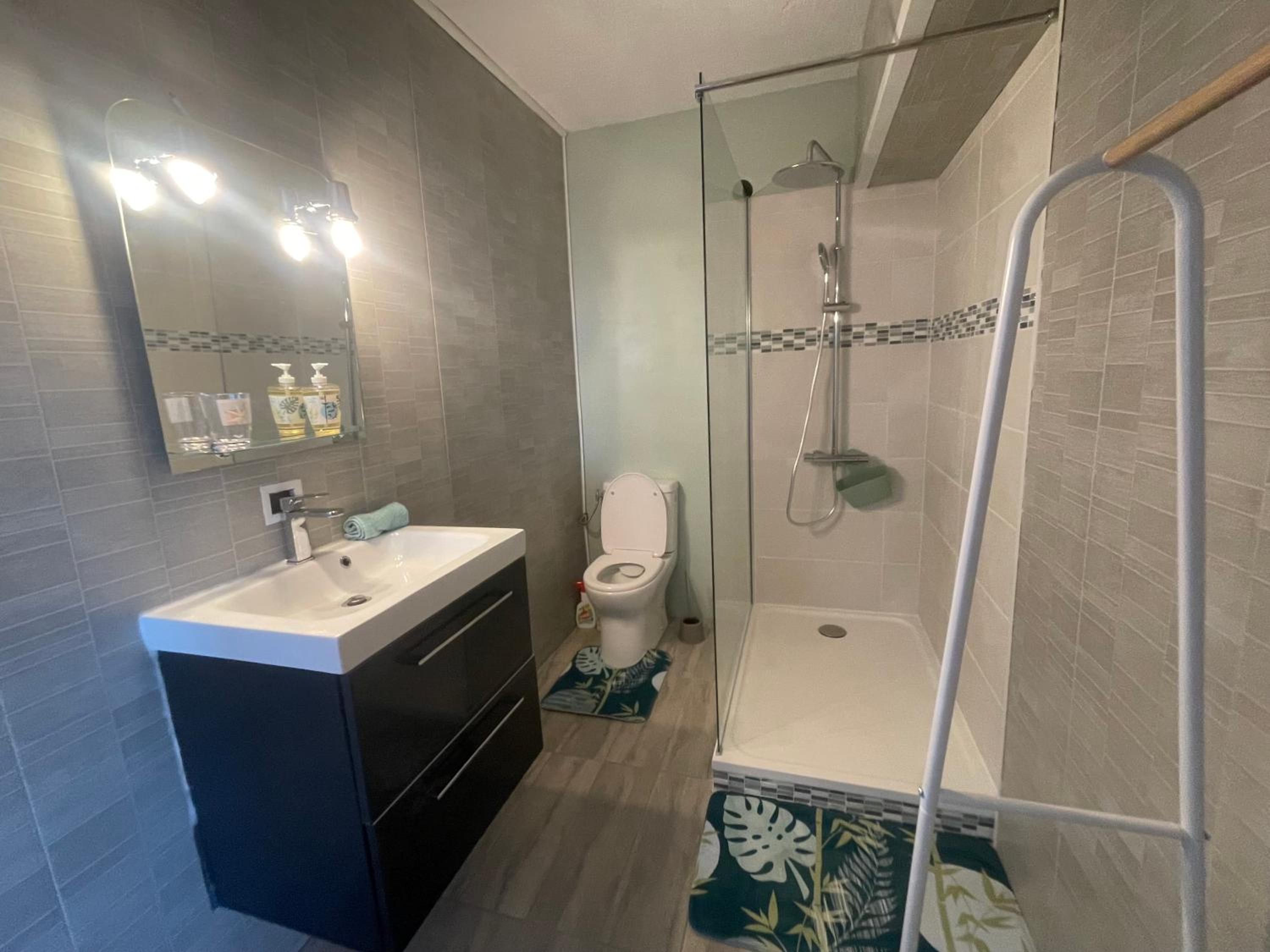 La salle de bain. Pas de lumière au niveau de la douche et pas de pression d’eau