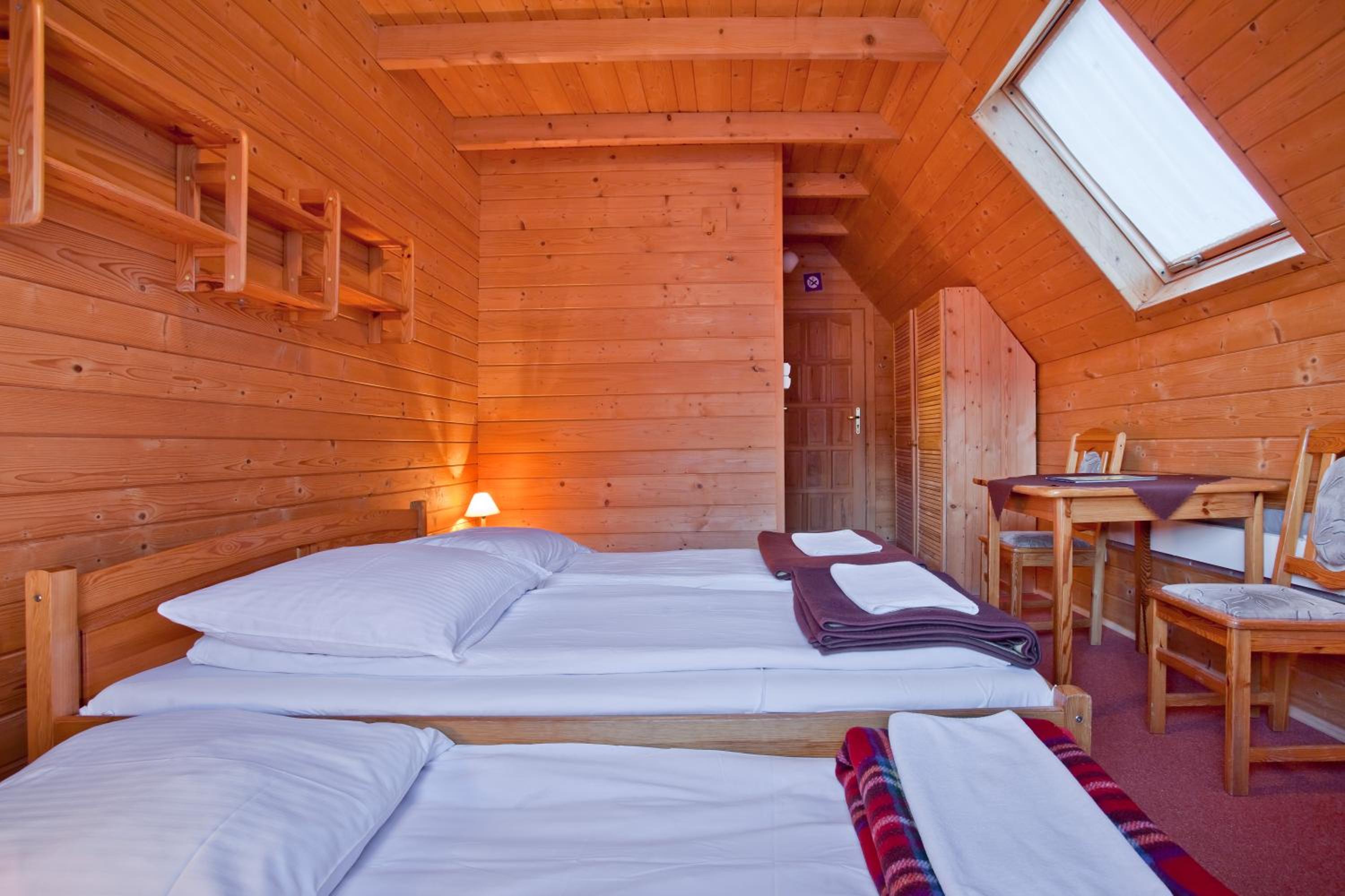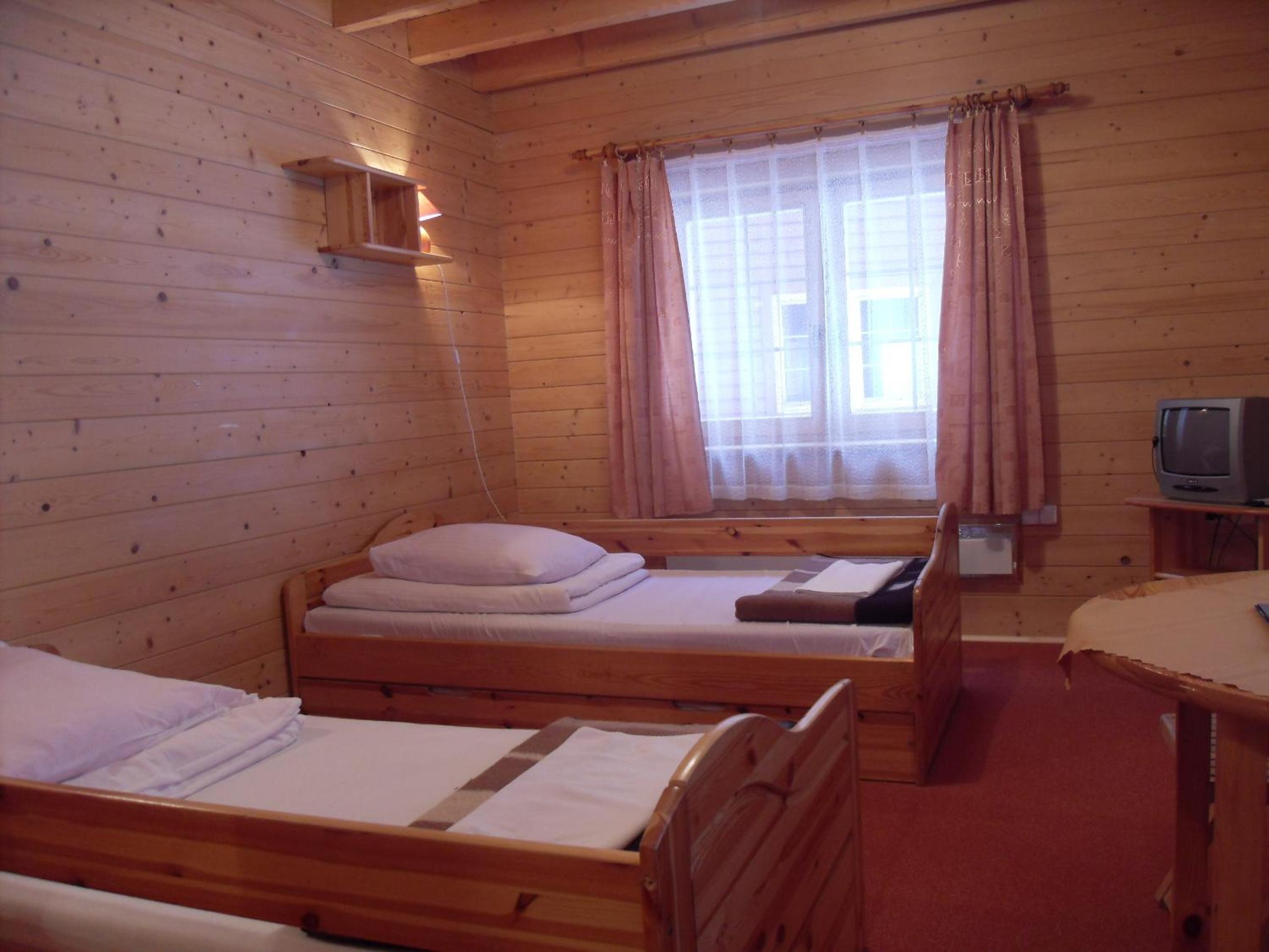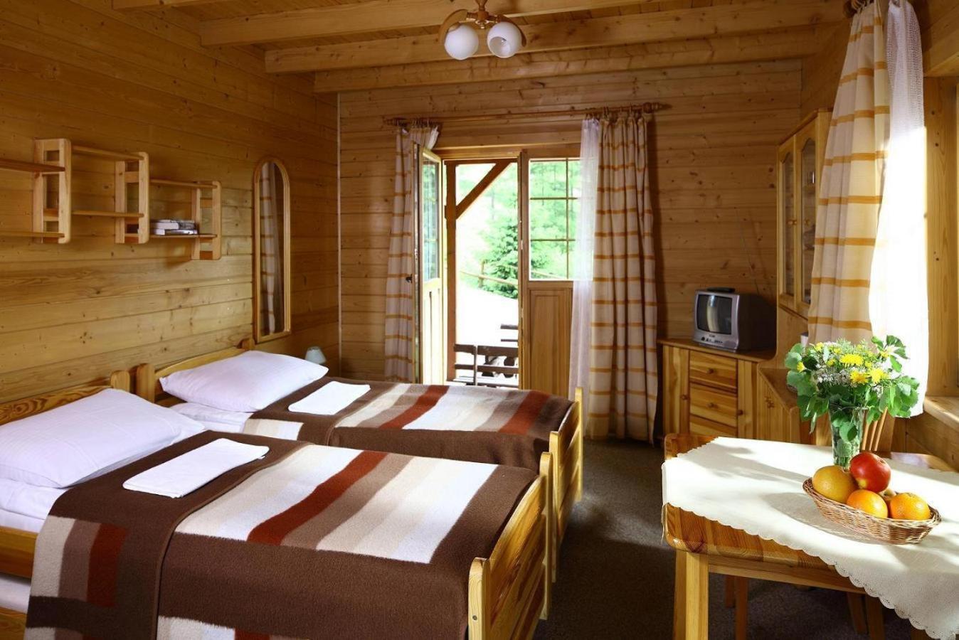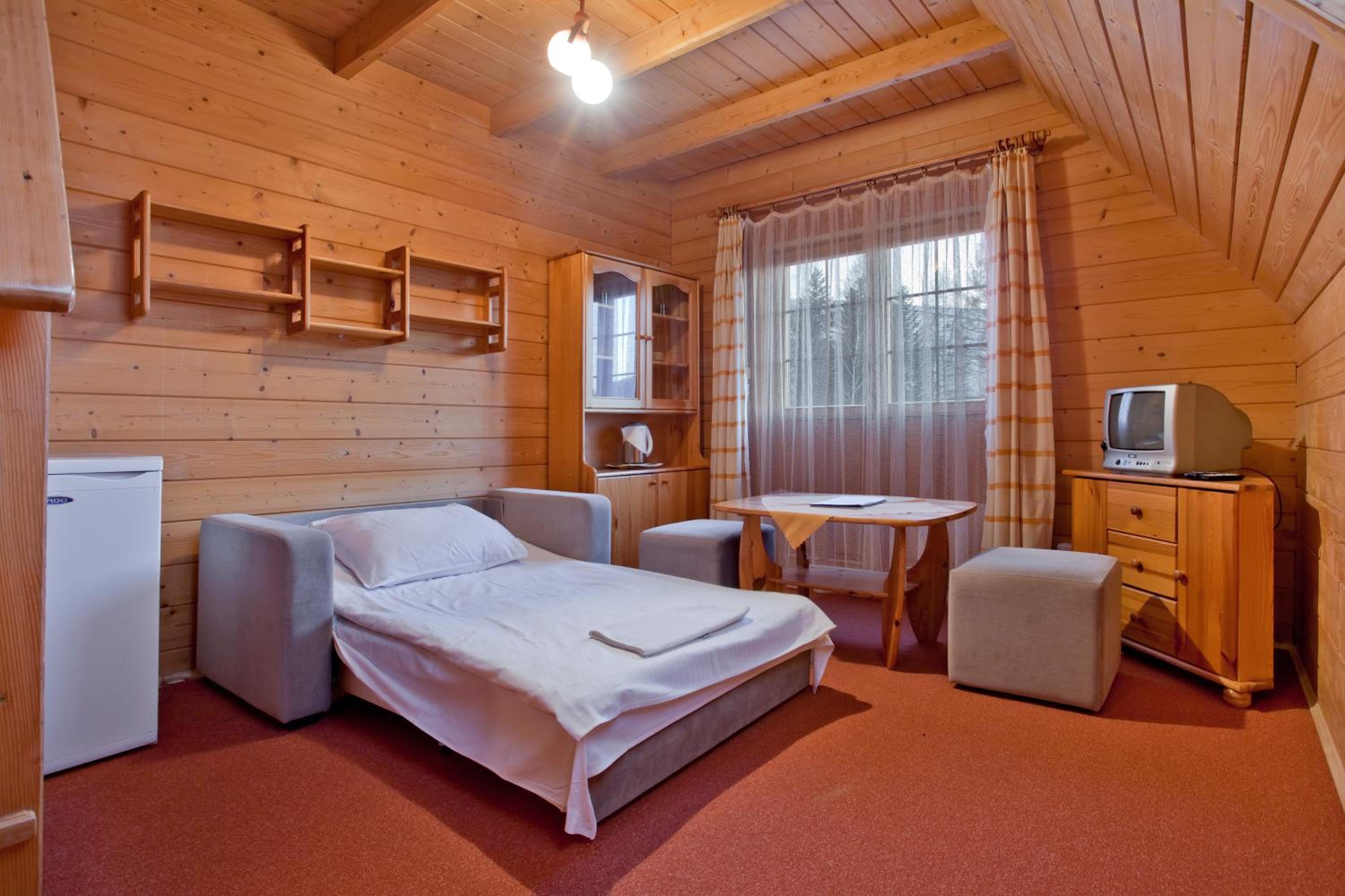 Rustic Charm: Each wood set room at Domki na Górce offers a cozy retreat with modern amenities like a TV and electric kettle. Wake up to picturesque mountain and river views right from your window.
