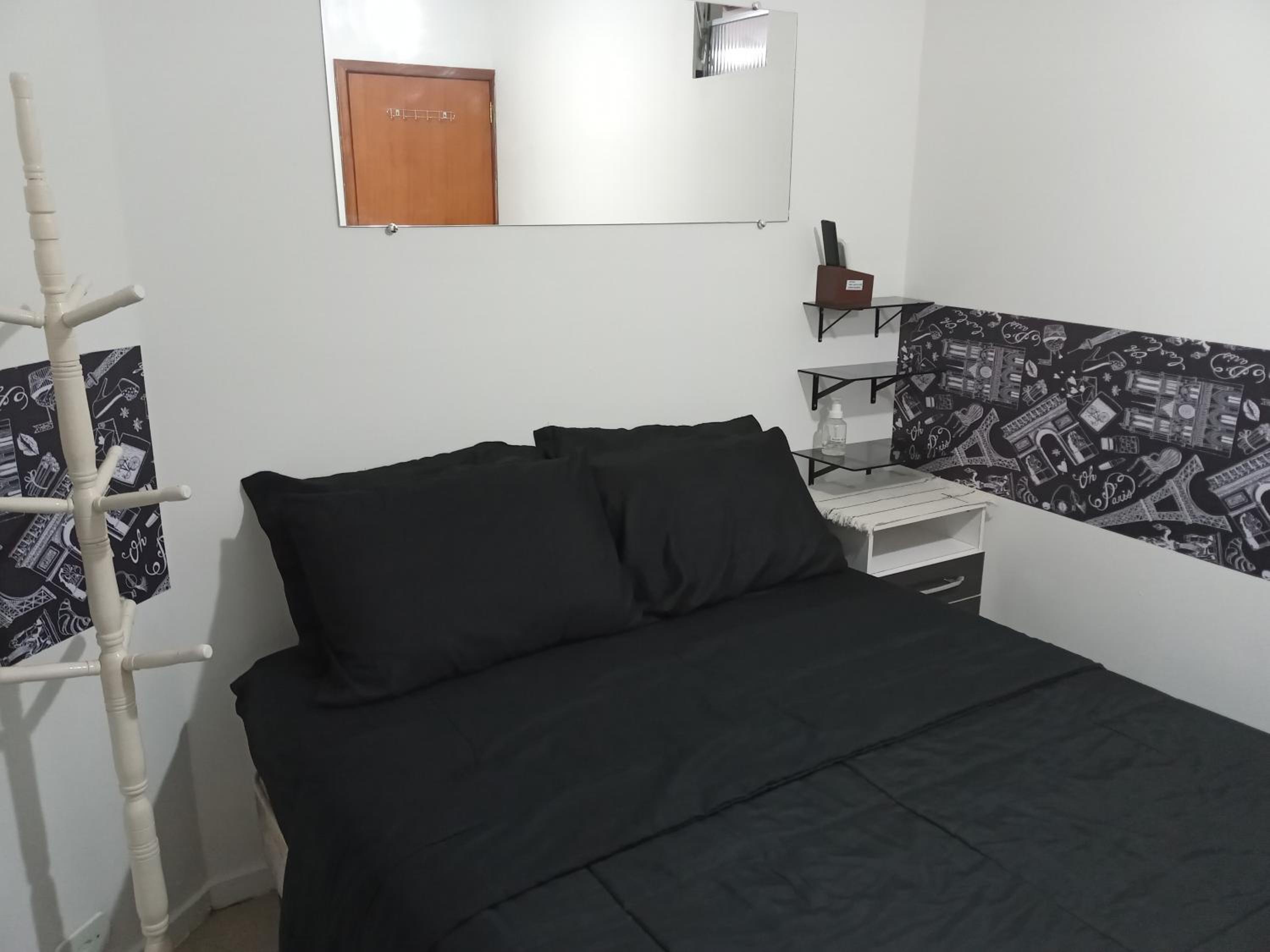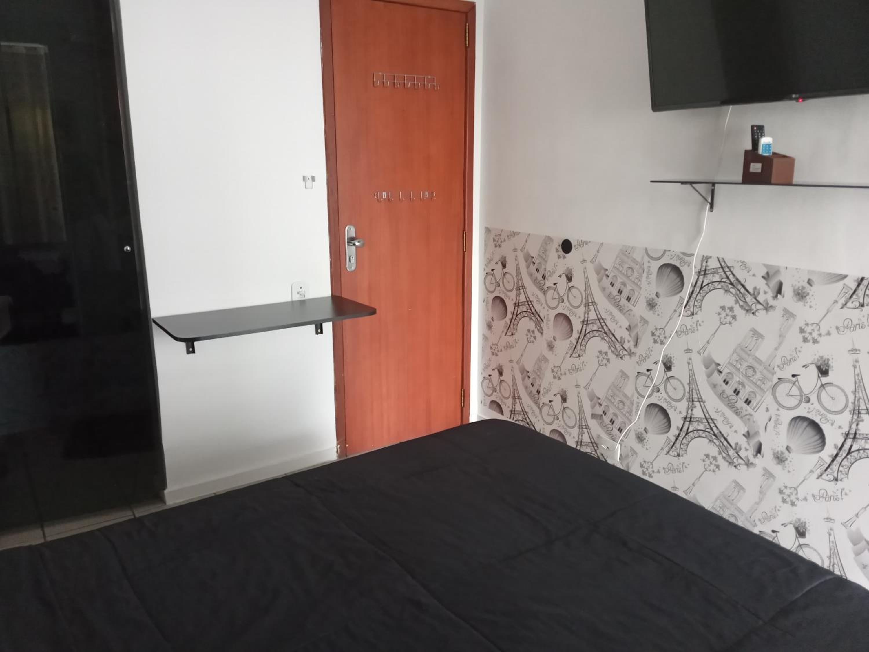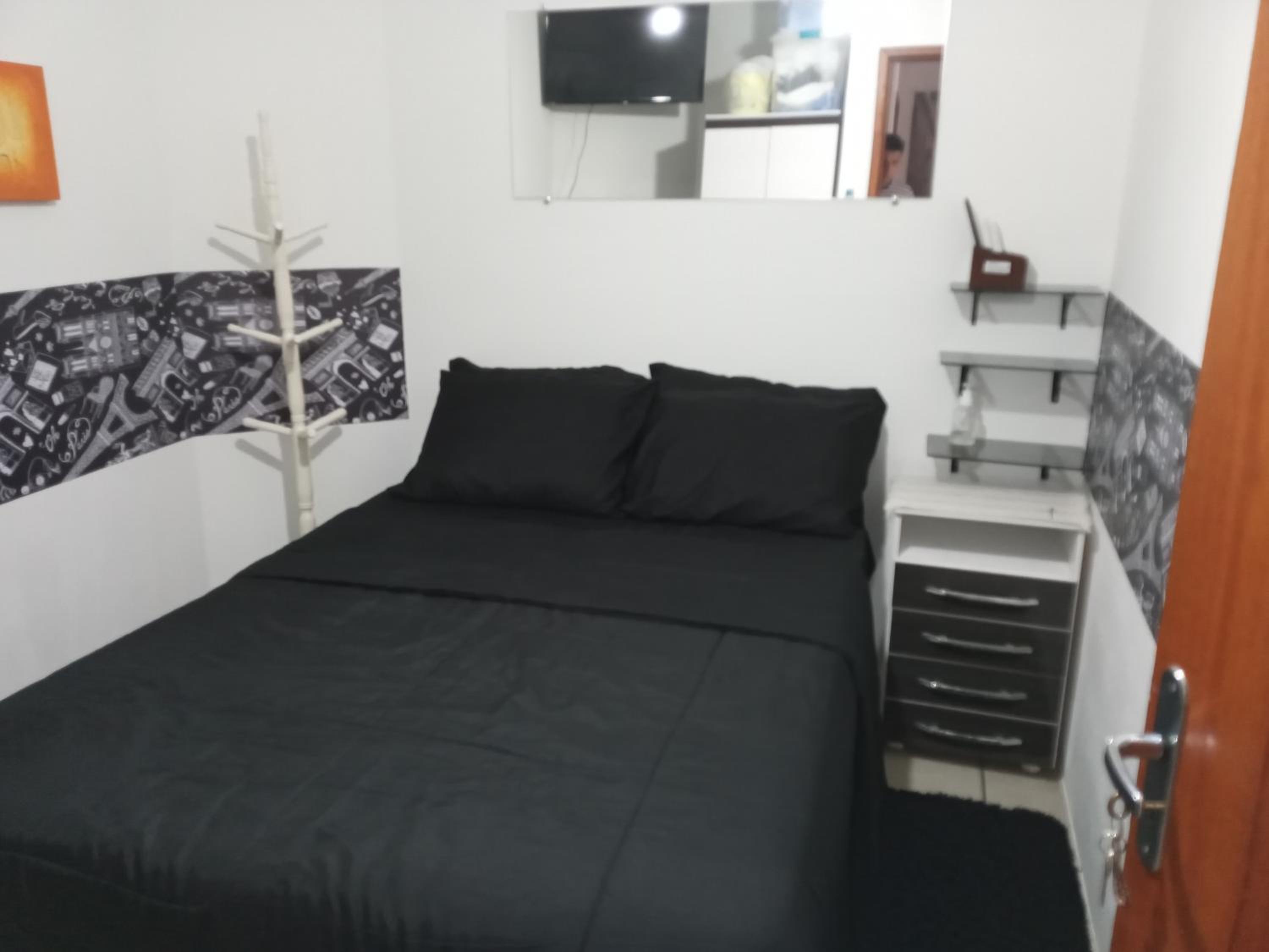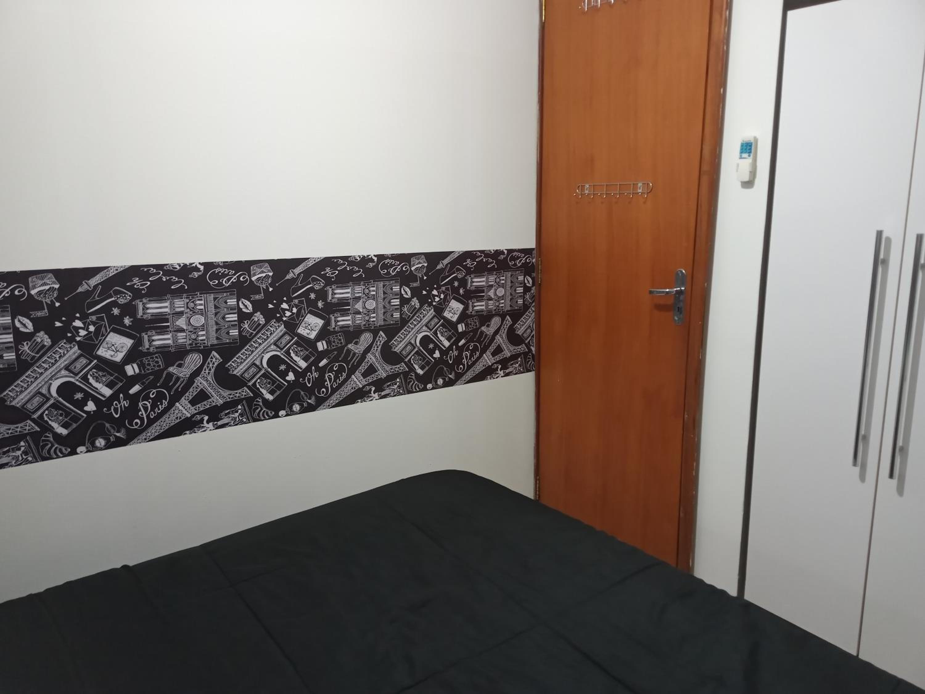 Quarto sem janela, pequeno. Não é suite, precisa passar por area de circulação para ir ao banheiro. Considerar que o apto é compartilhado com o casal anfitrião.
