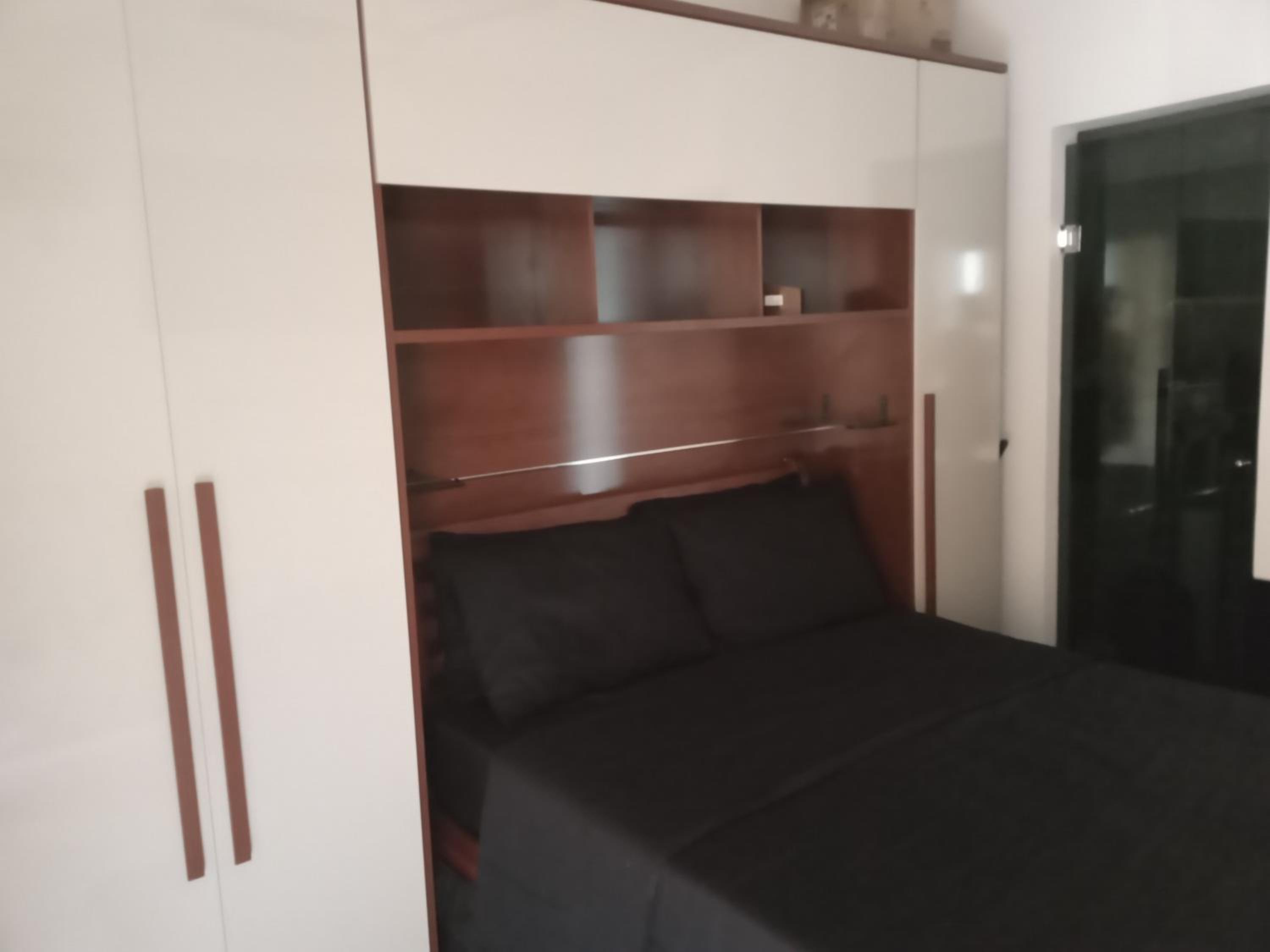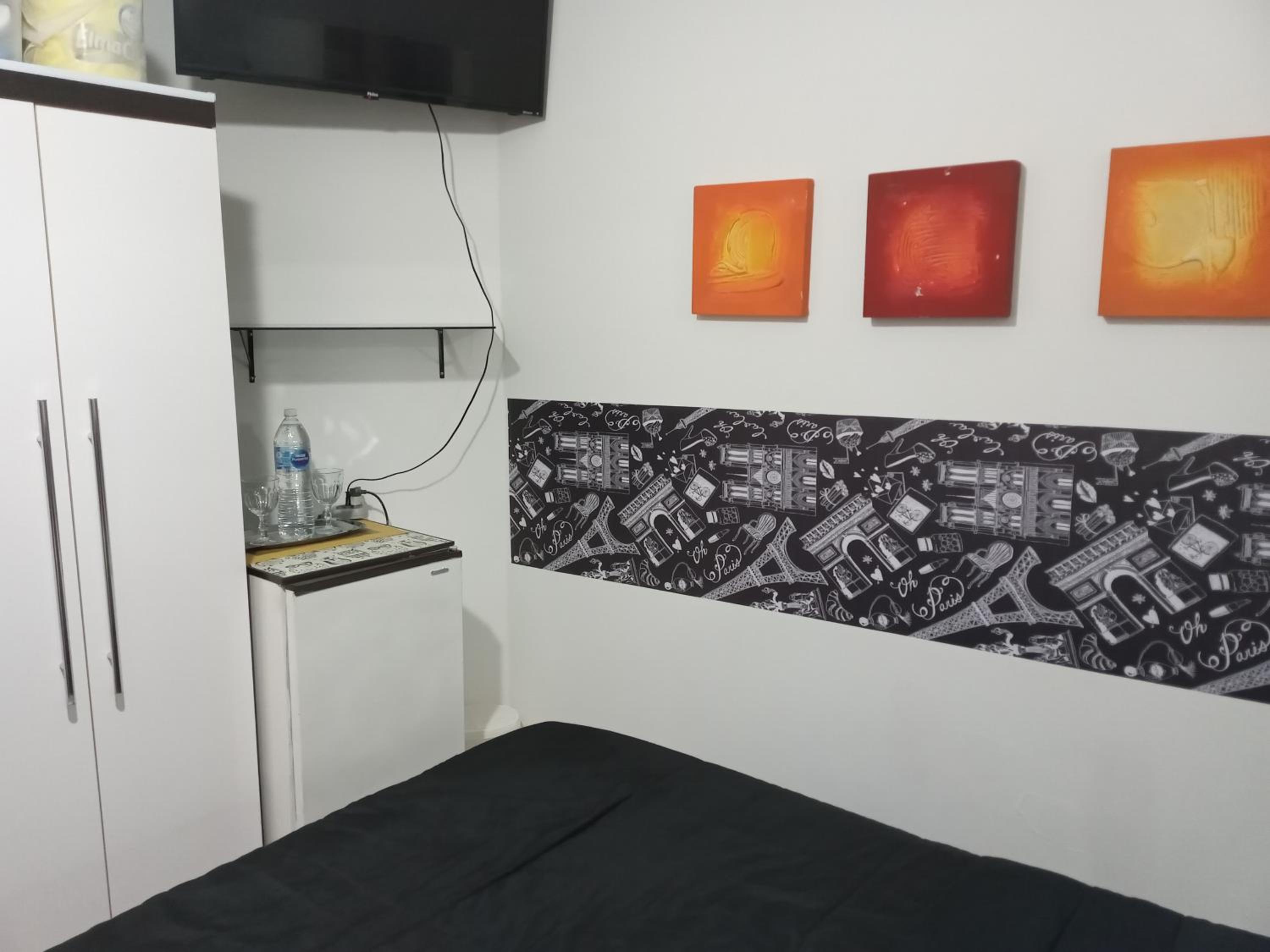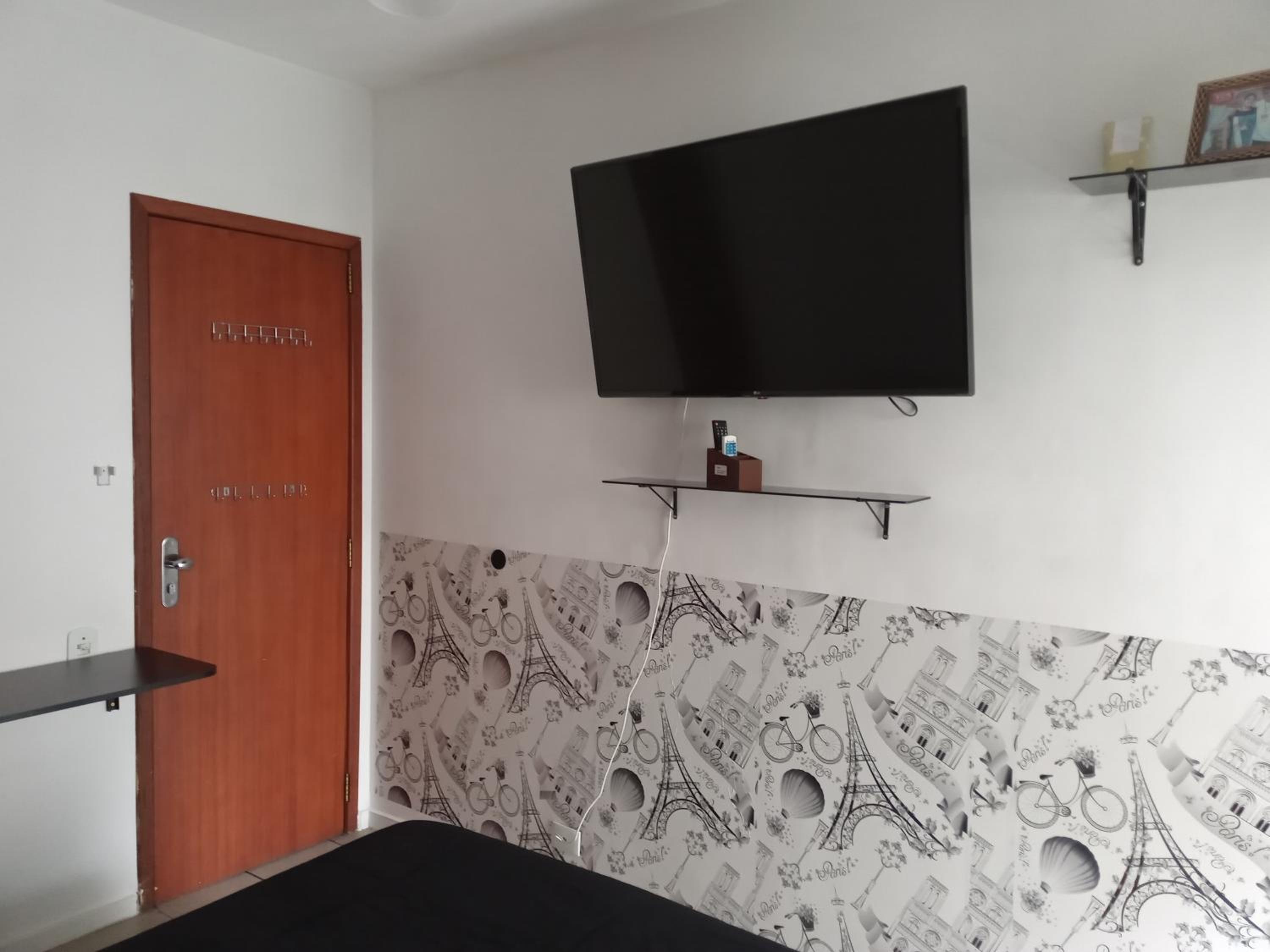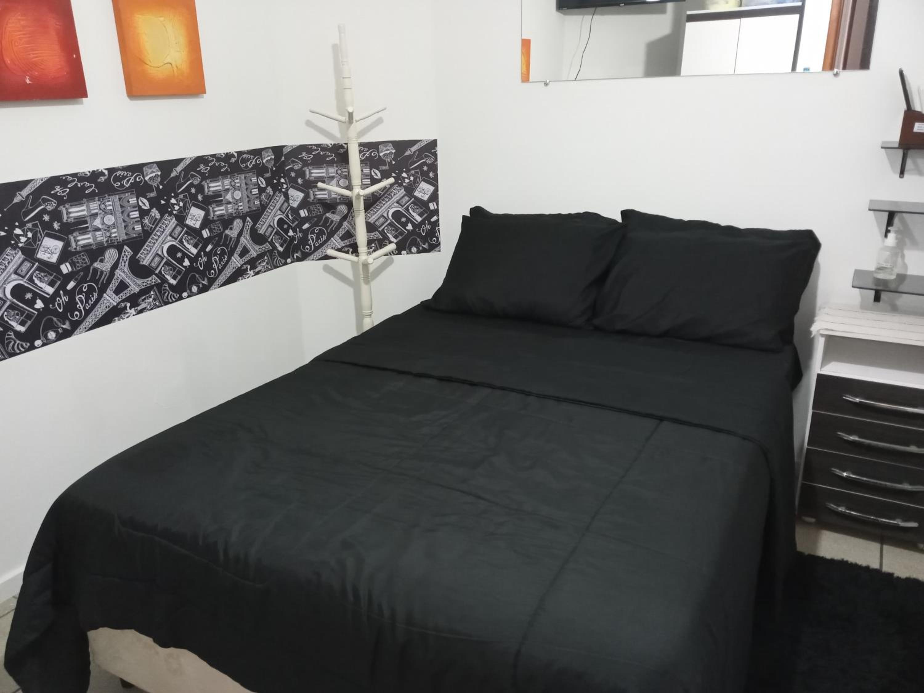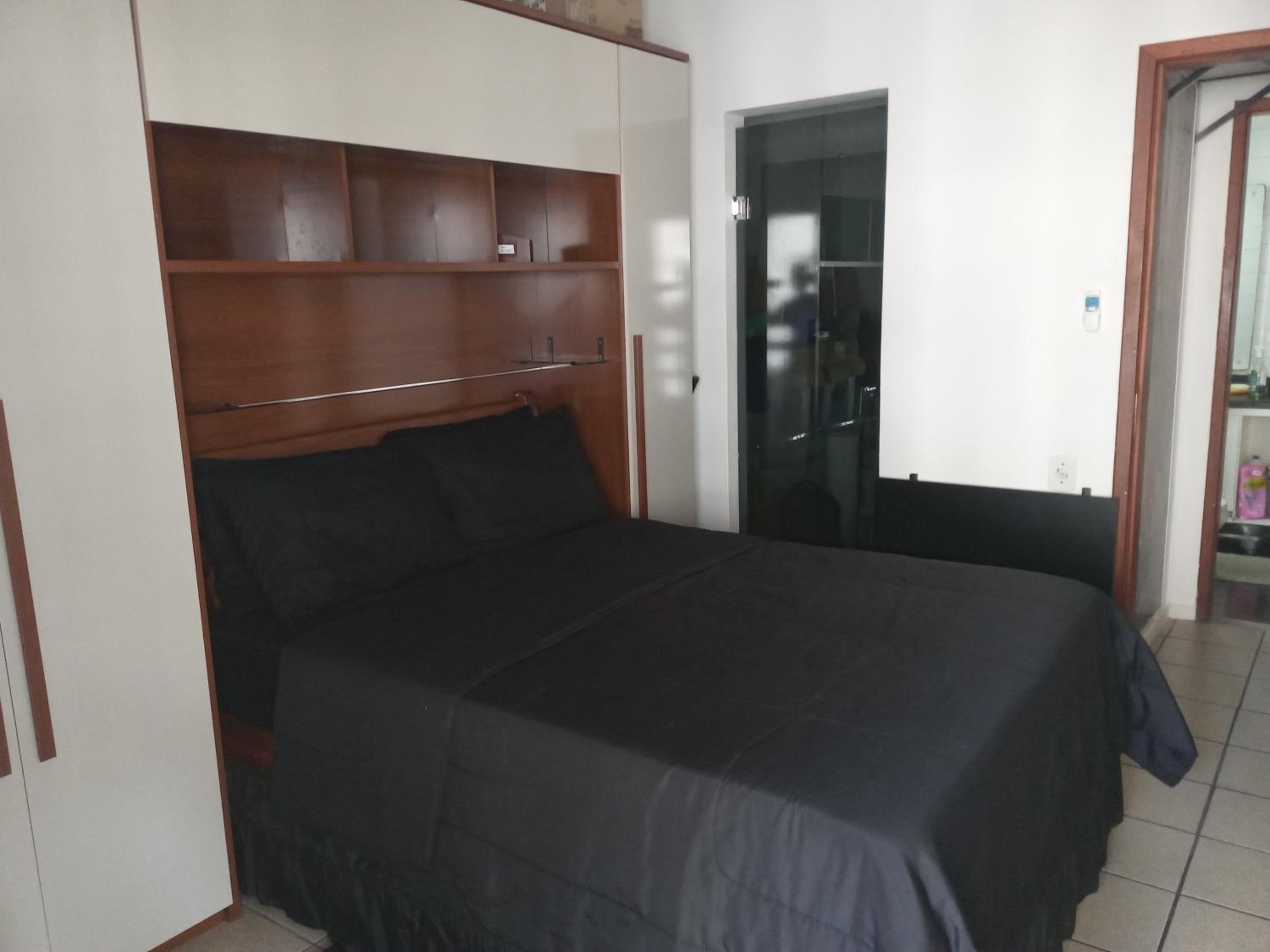 Quarto sem janela, pequeno. Não é suite, precisa passar por area de circulação para ir ao banheiro. Considerar que o apto é compartilhado com o casal anfitrião.