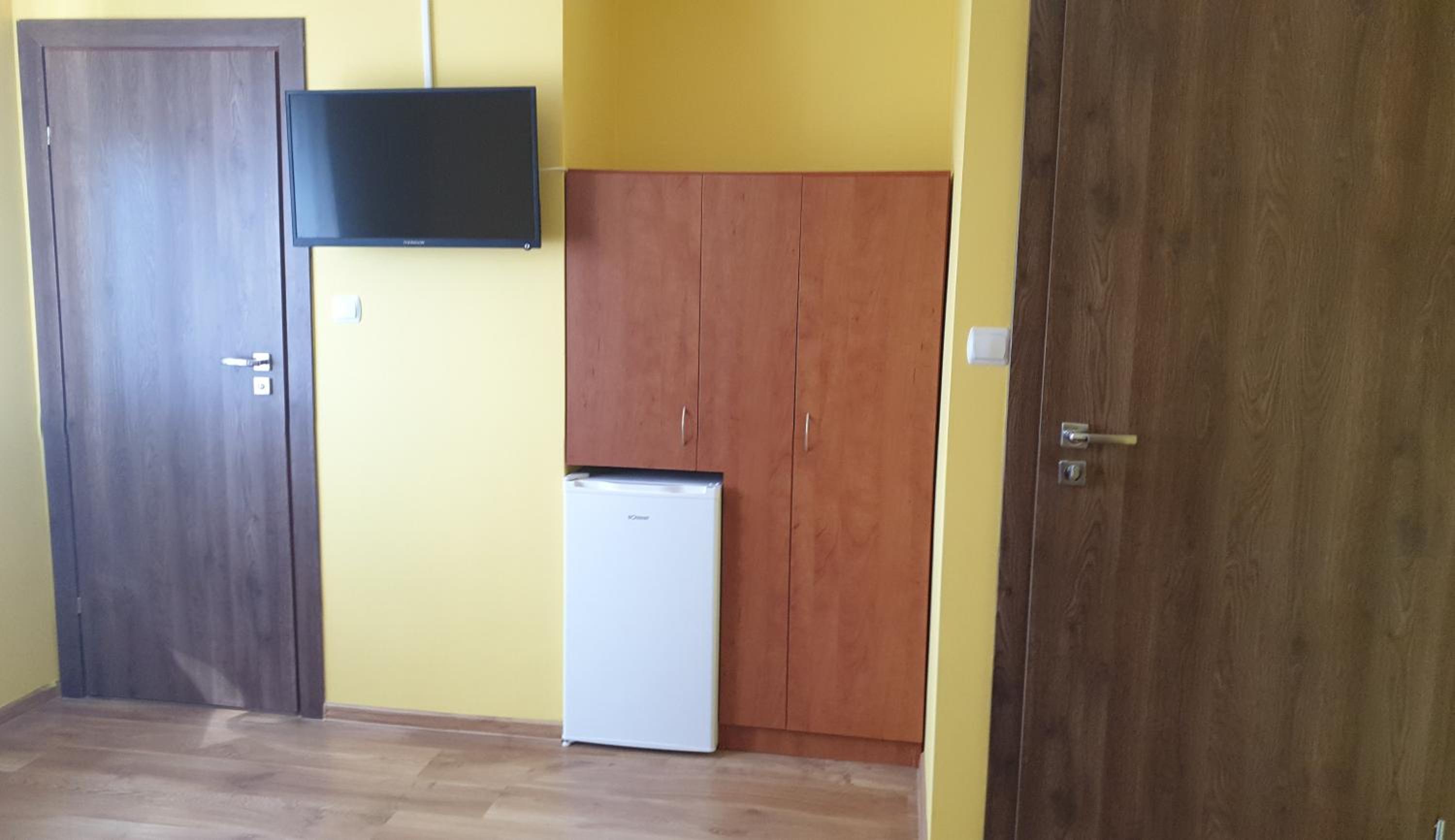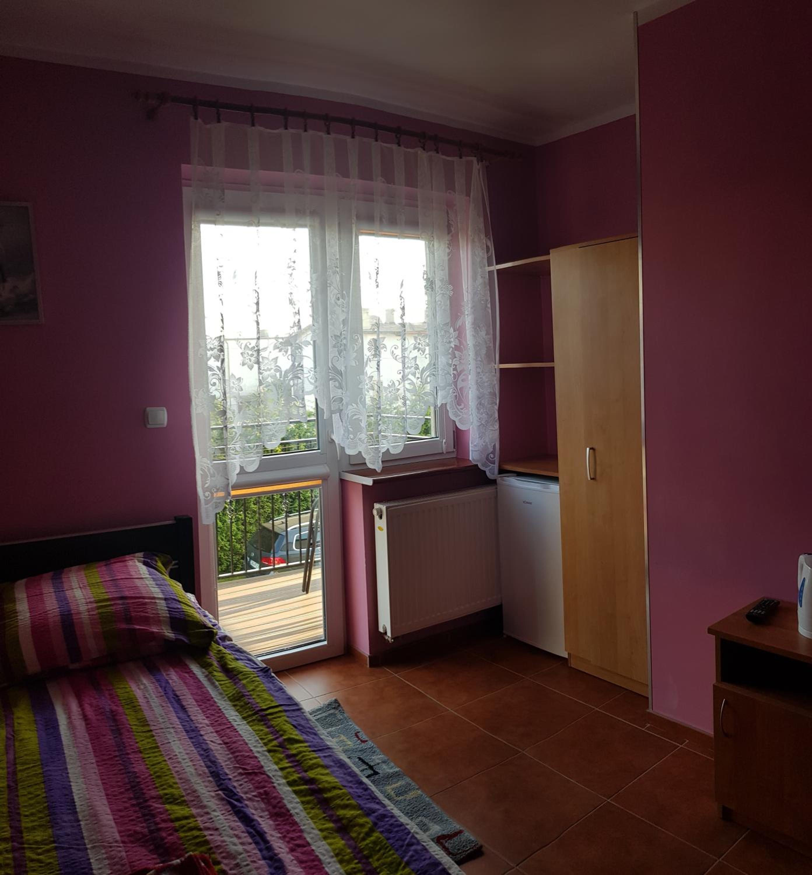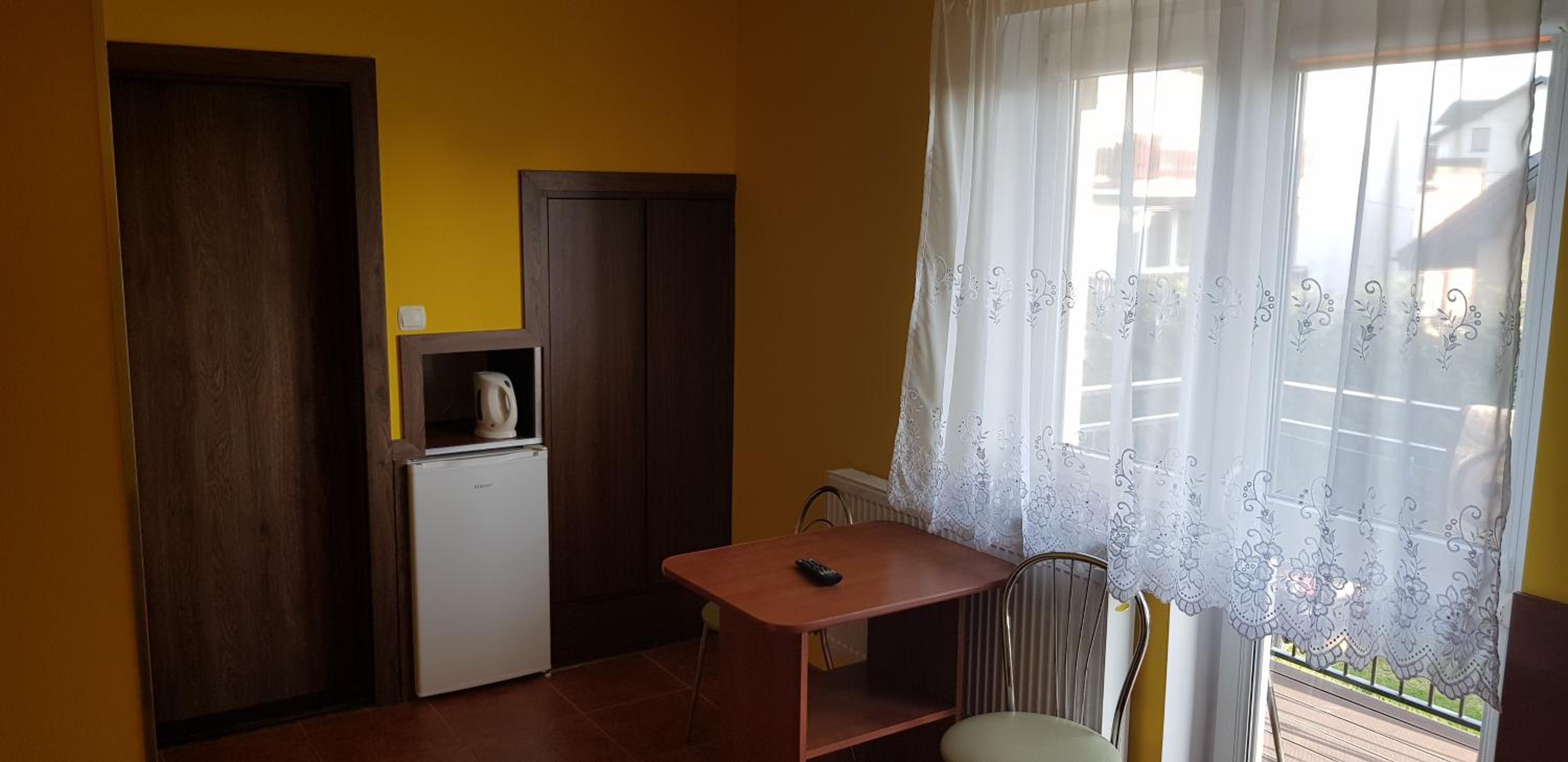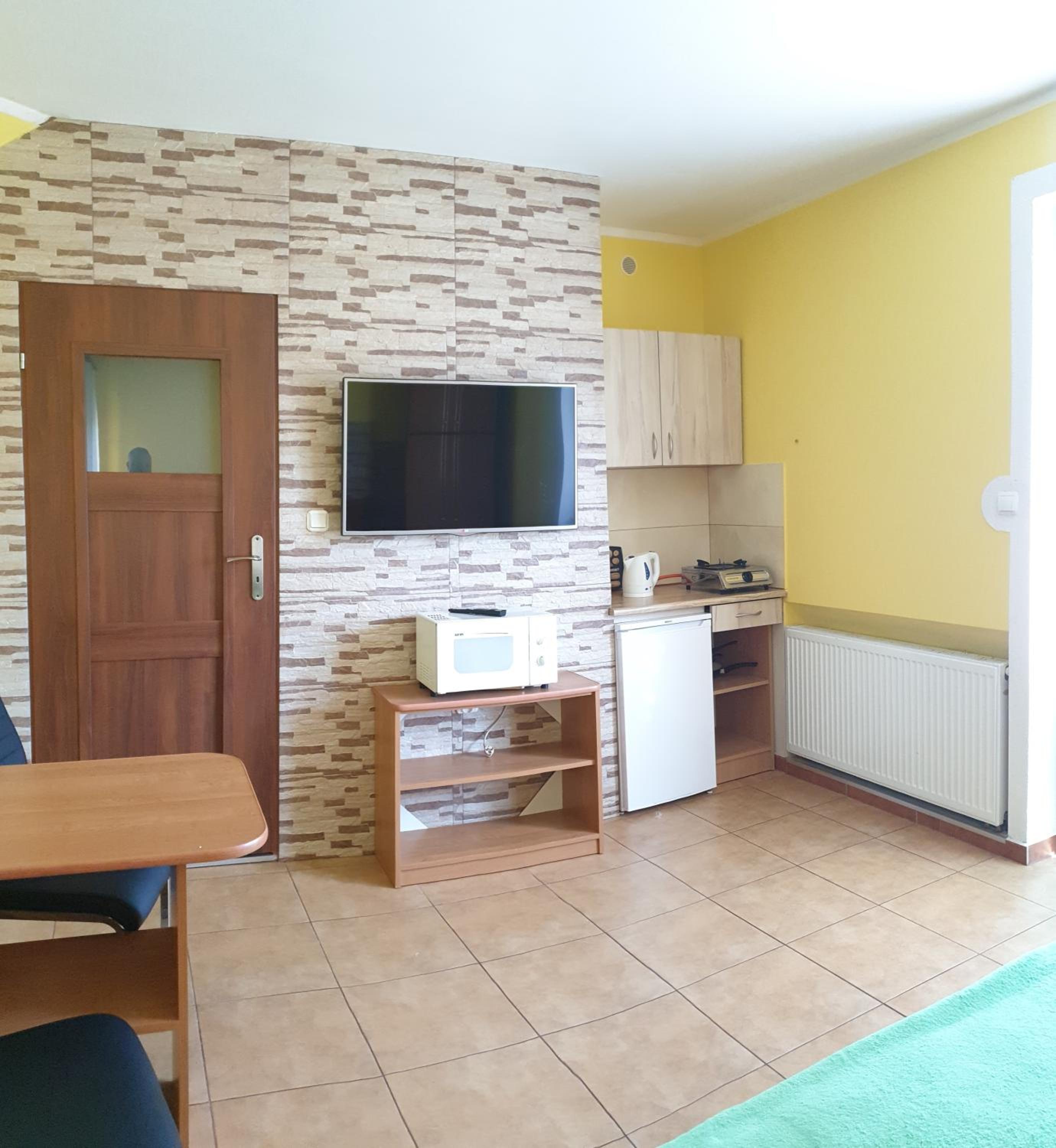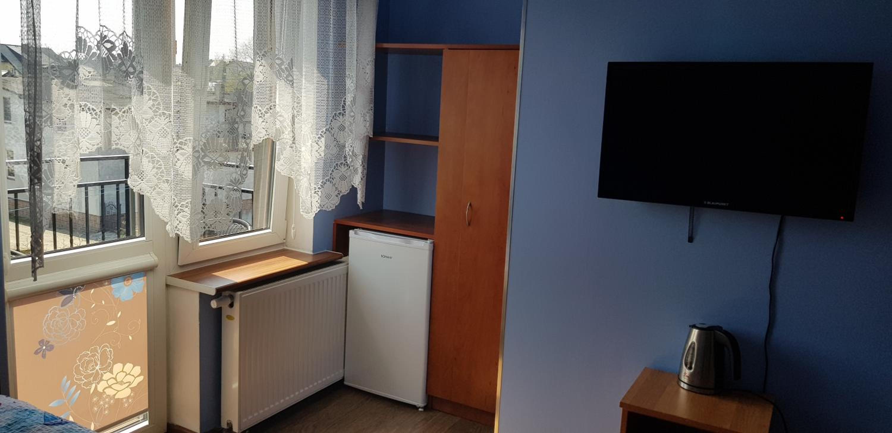 Pokój czysty, duży, łazienka też. W pokoju lodówka i czajnik elektryczny. Na korytarzu dobrze zaopatrzony aneks kuchenny. Obok taras ogólnodostępny .
