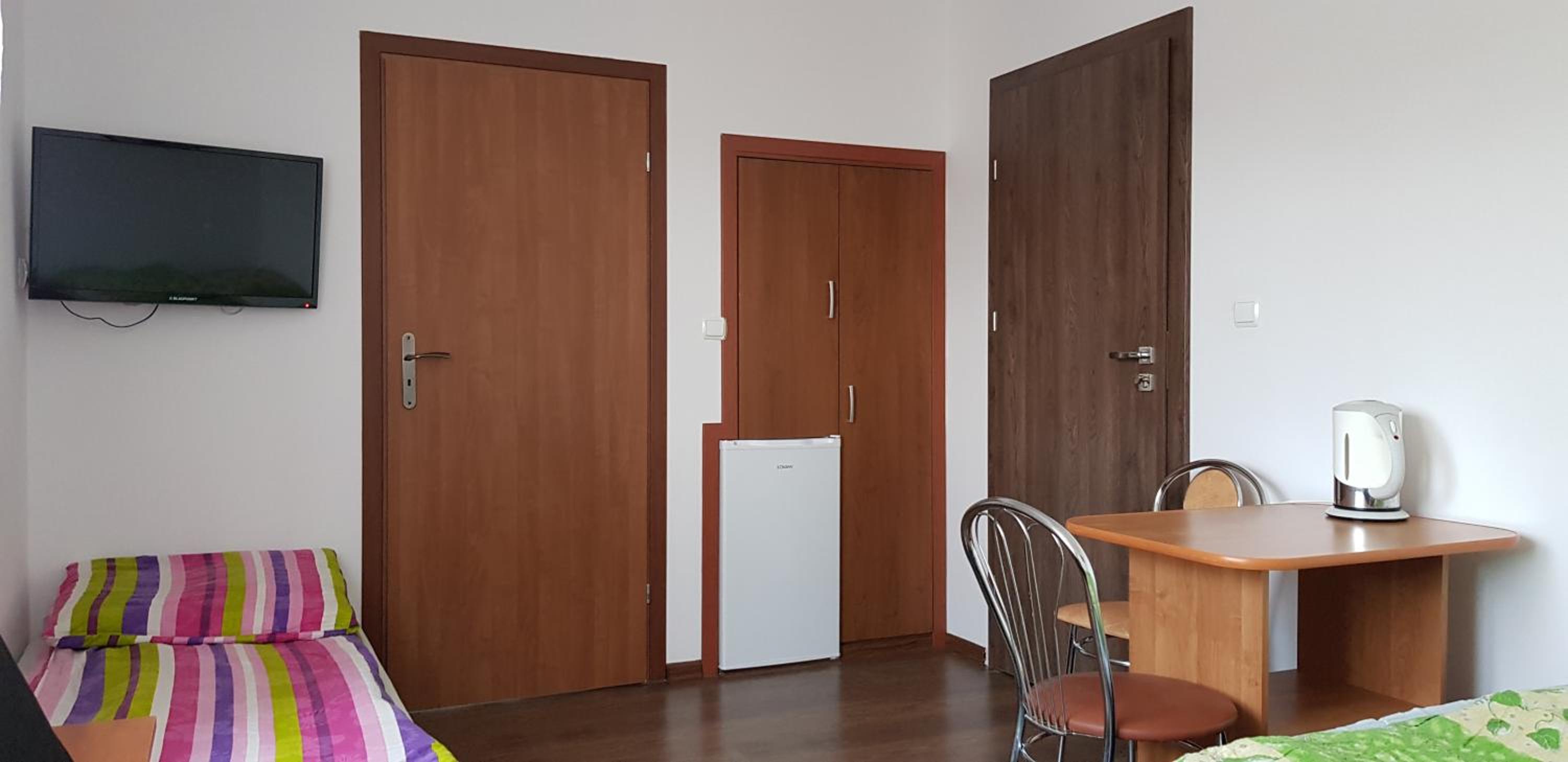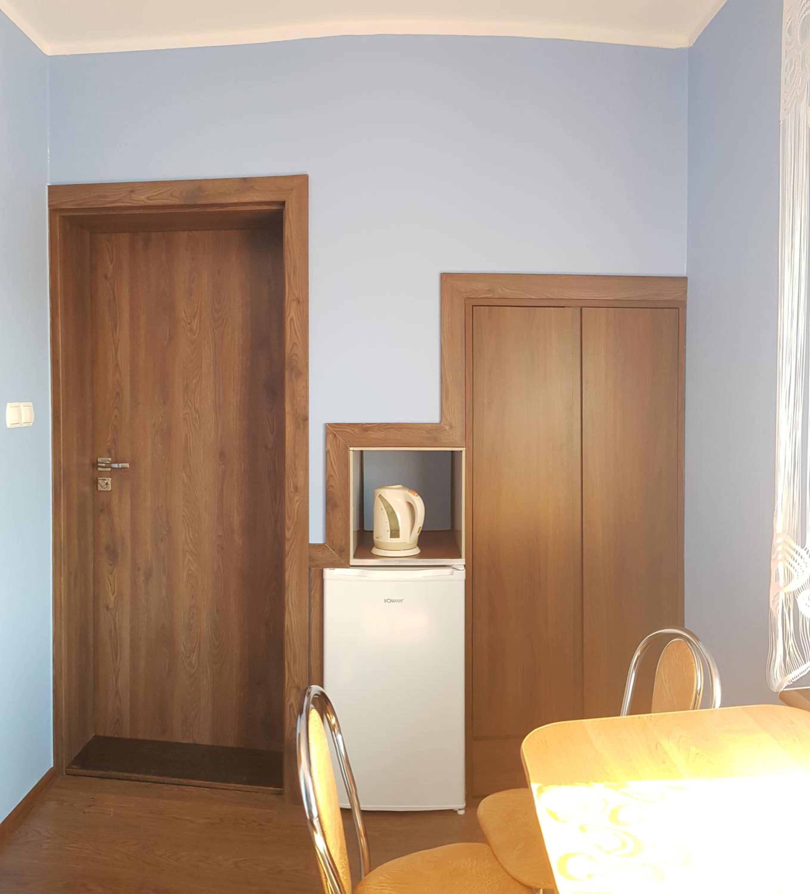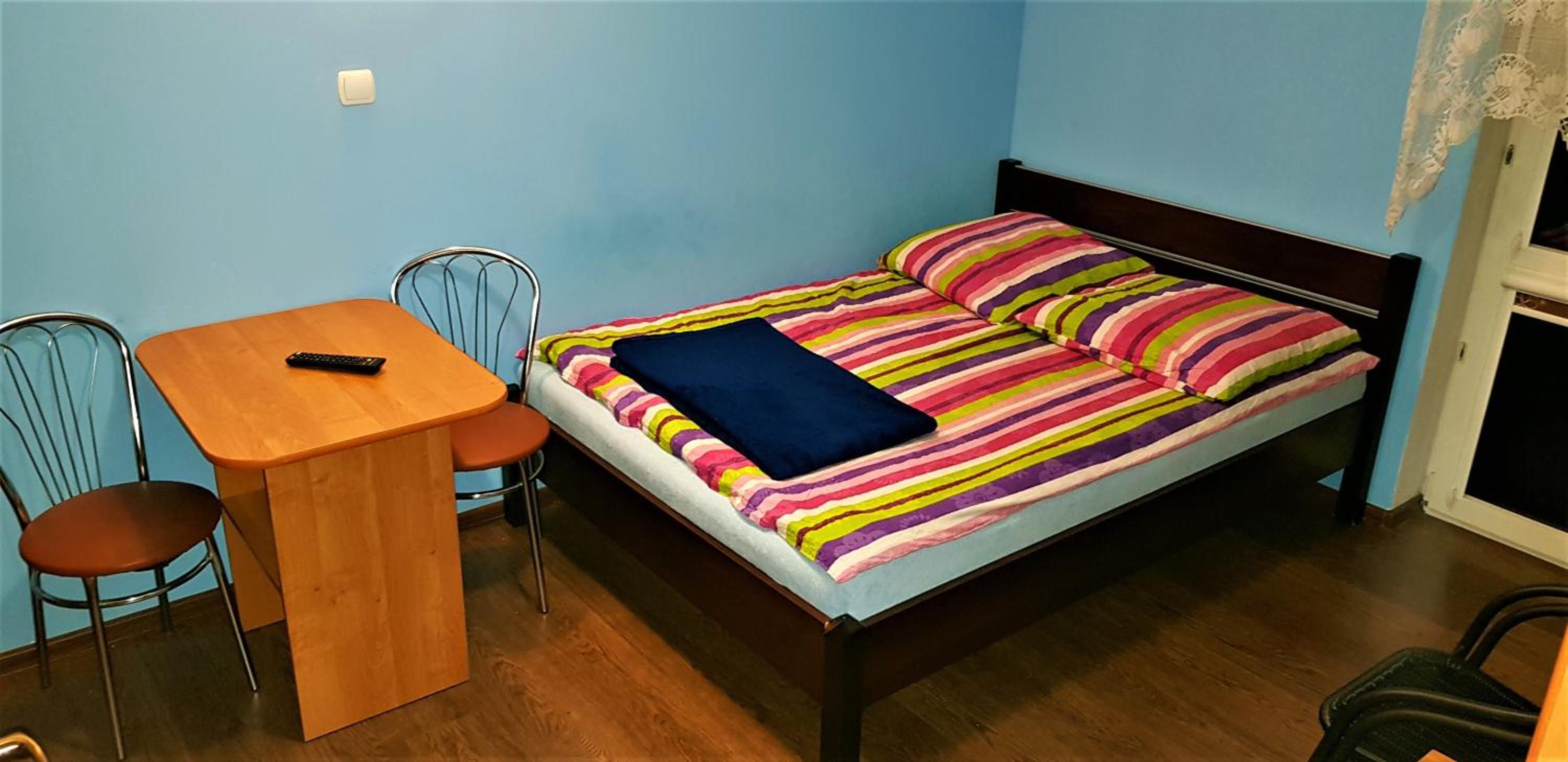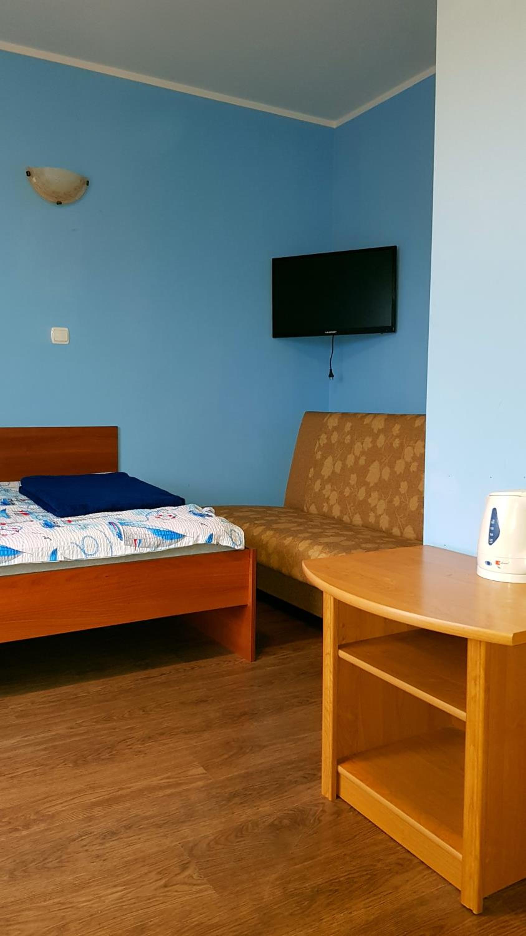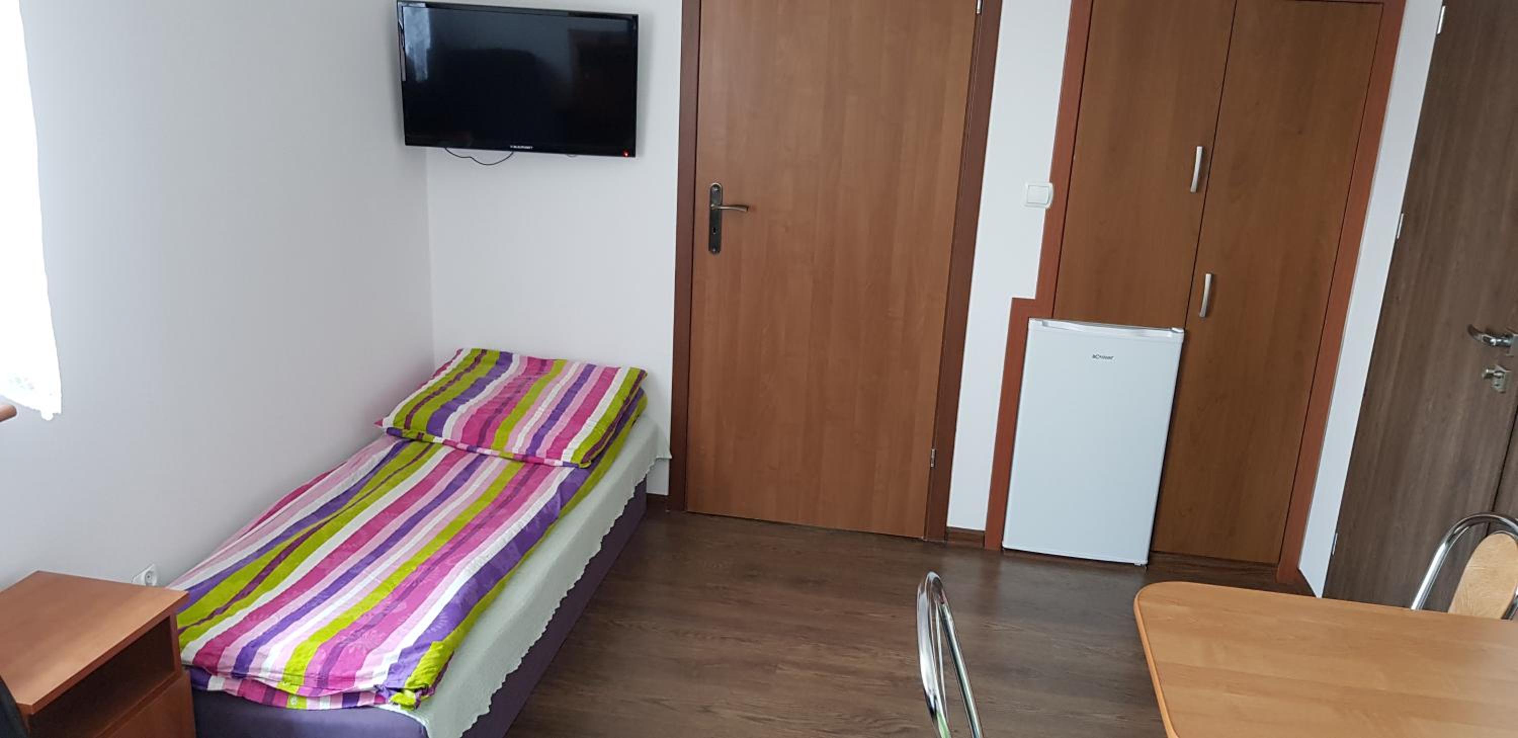 Pokój czysty, duży, łazienka też. W pokoju lodówka i czajnik elektryczny. Na korytarzu dobrze zaopatrzony aneks kuchenny. Obok taras ogólnodostępny .