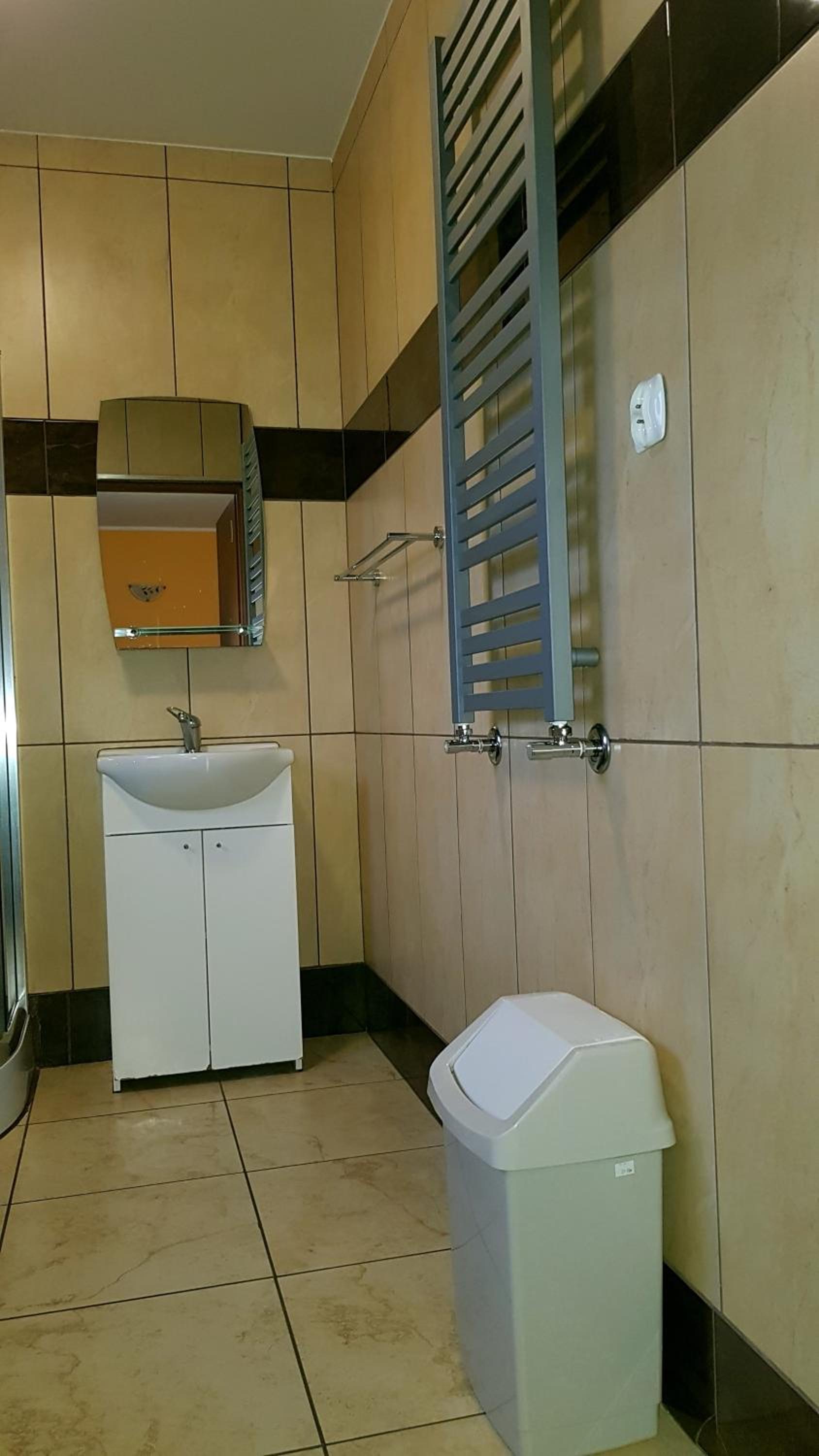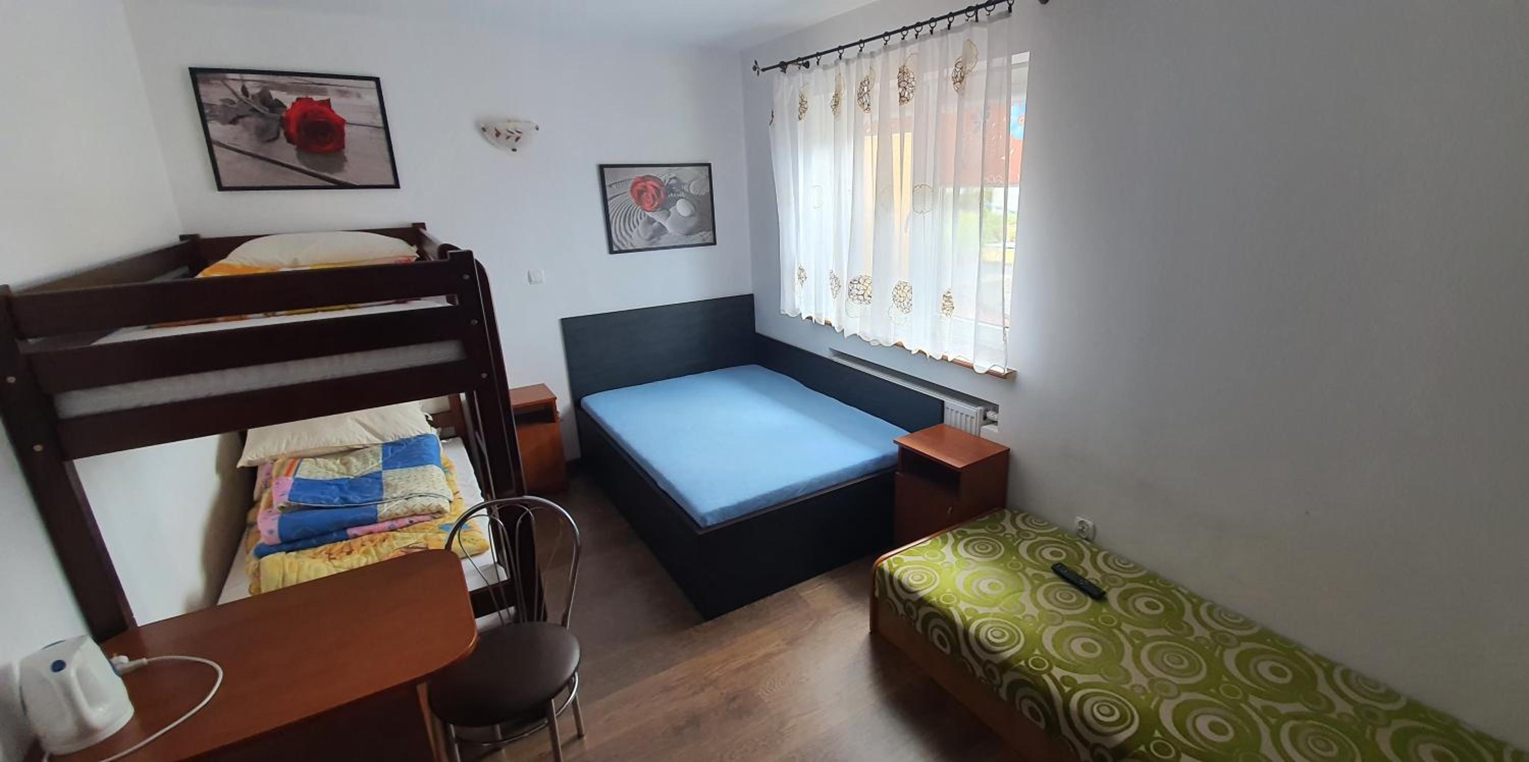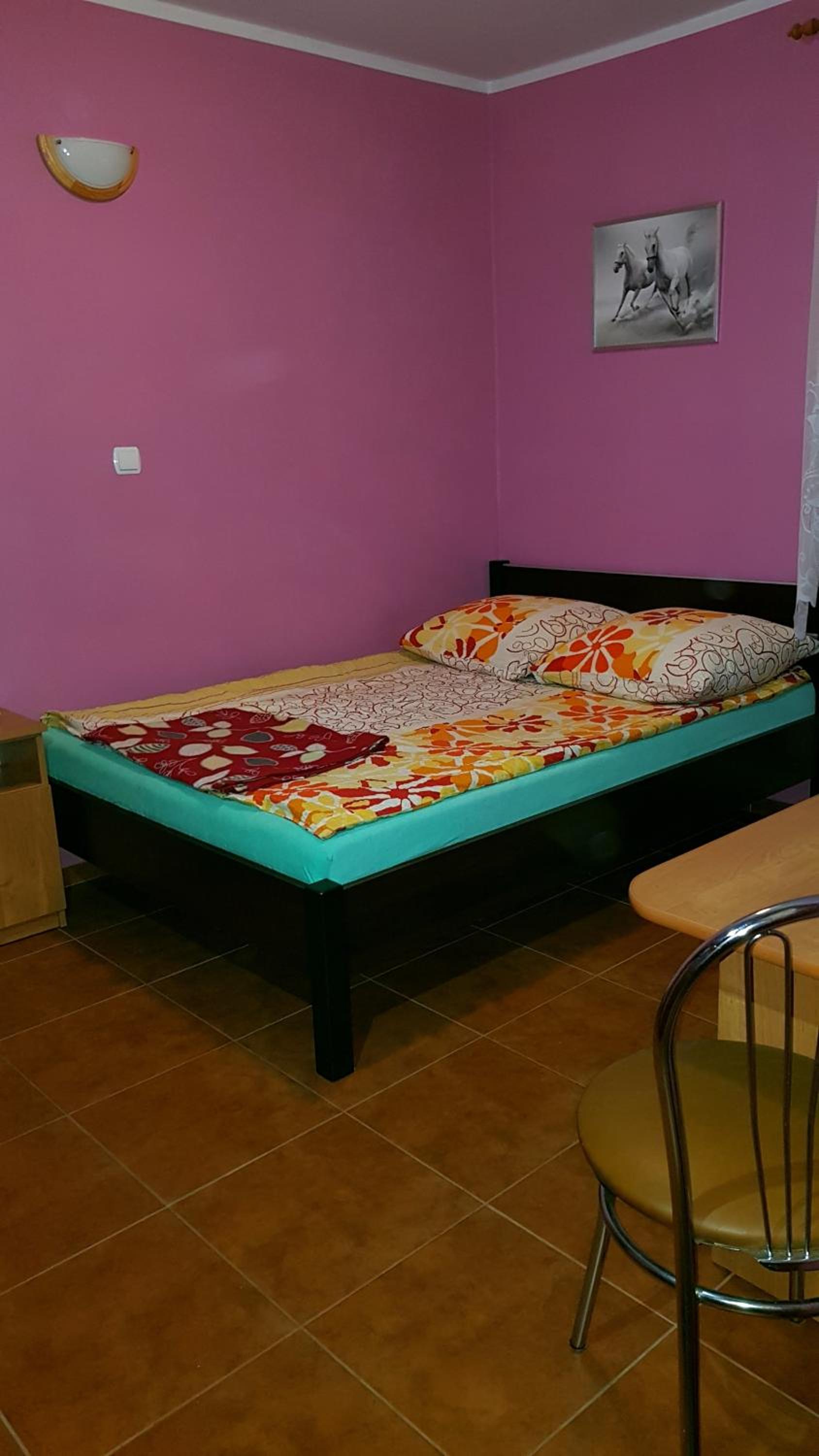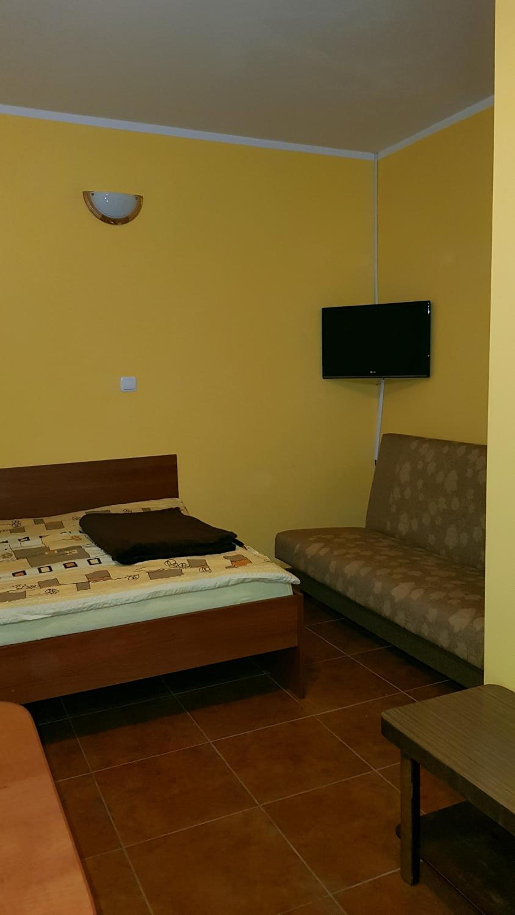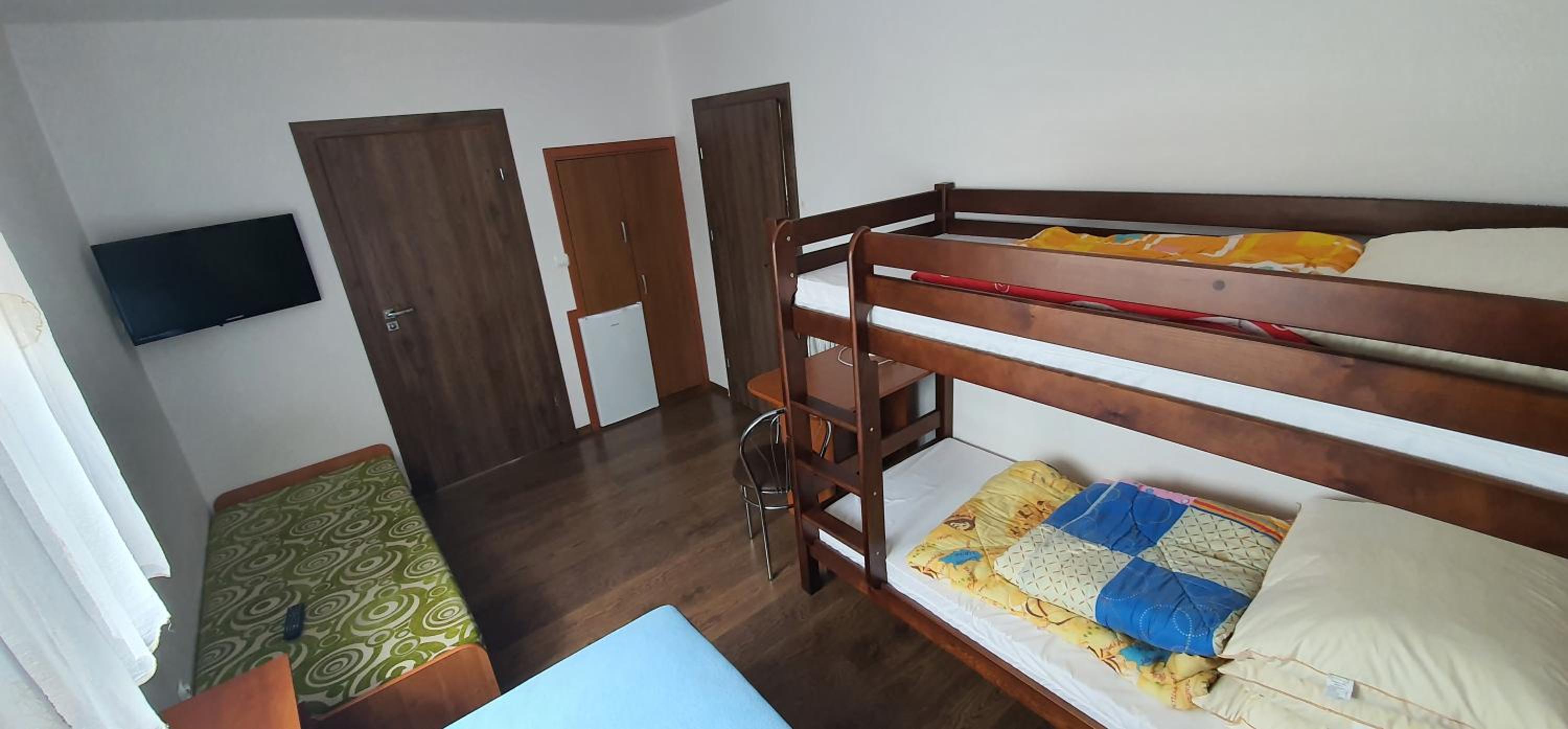 Pokój czysty, duży, łazienka też. W pokoju lodówka i czajnik elektryczny. Na korytarzu dobrze zaopatrzony aneks kuchenny. Obok taras ogólnodostępny .