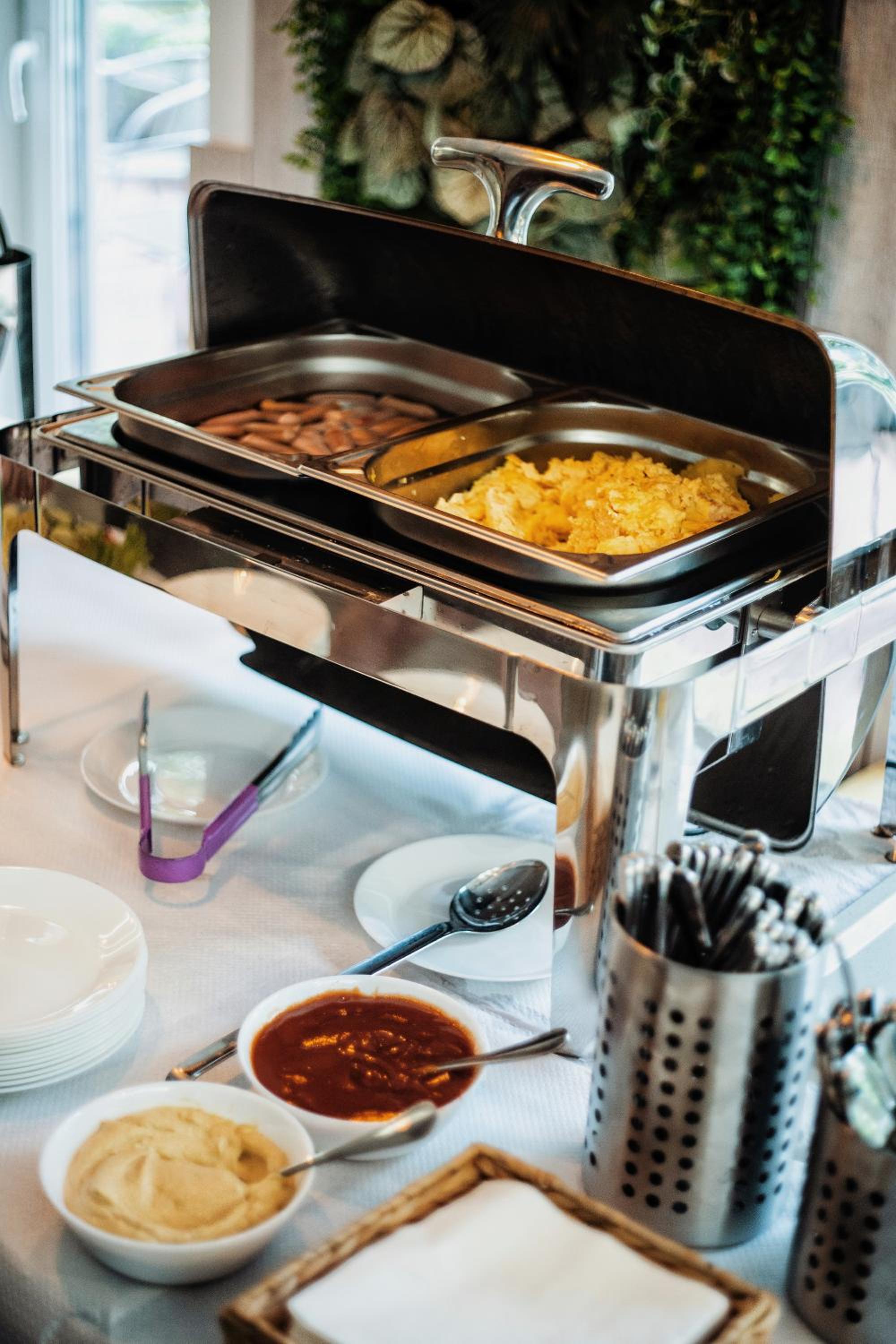 A tram had been rattling under the window since early morning. The hangers in the closet were impossible to use—they were hung too high and difficult to insert into the holes. Only a very tall person could use them. The towels were placed on a colorful bedspread that didn't look particularly clean. There was also a stained pillow in the closet. The shower room only had two small hooks on the wall, next to each other, so there was no way to hang towels for two people. The breakfast was very modest, and the omelette was very bad.