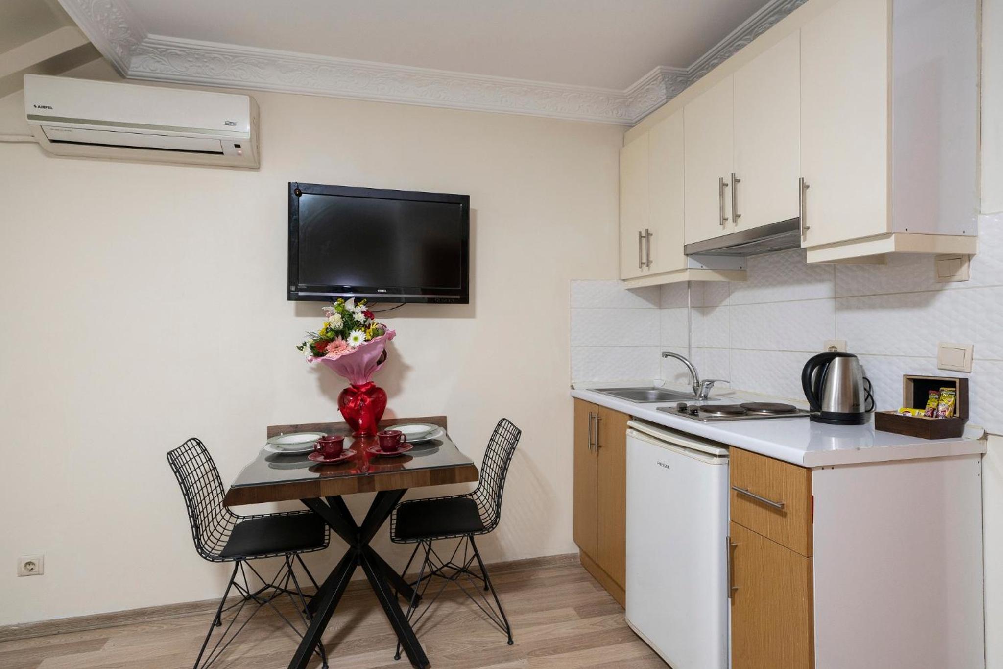 Taksim Fidan Aparts offers air-conditioned units with modern facilities including a desk, kettle, fridge, and flat-screen TV. Enjoy the convenience of a safety deposit box, stovetop, and a private bathroom with a shower. Some units even boast a cozy seating area and a terrace for outdoor dining. Bed linen and towels are provided for a hassle-free experience.