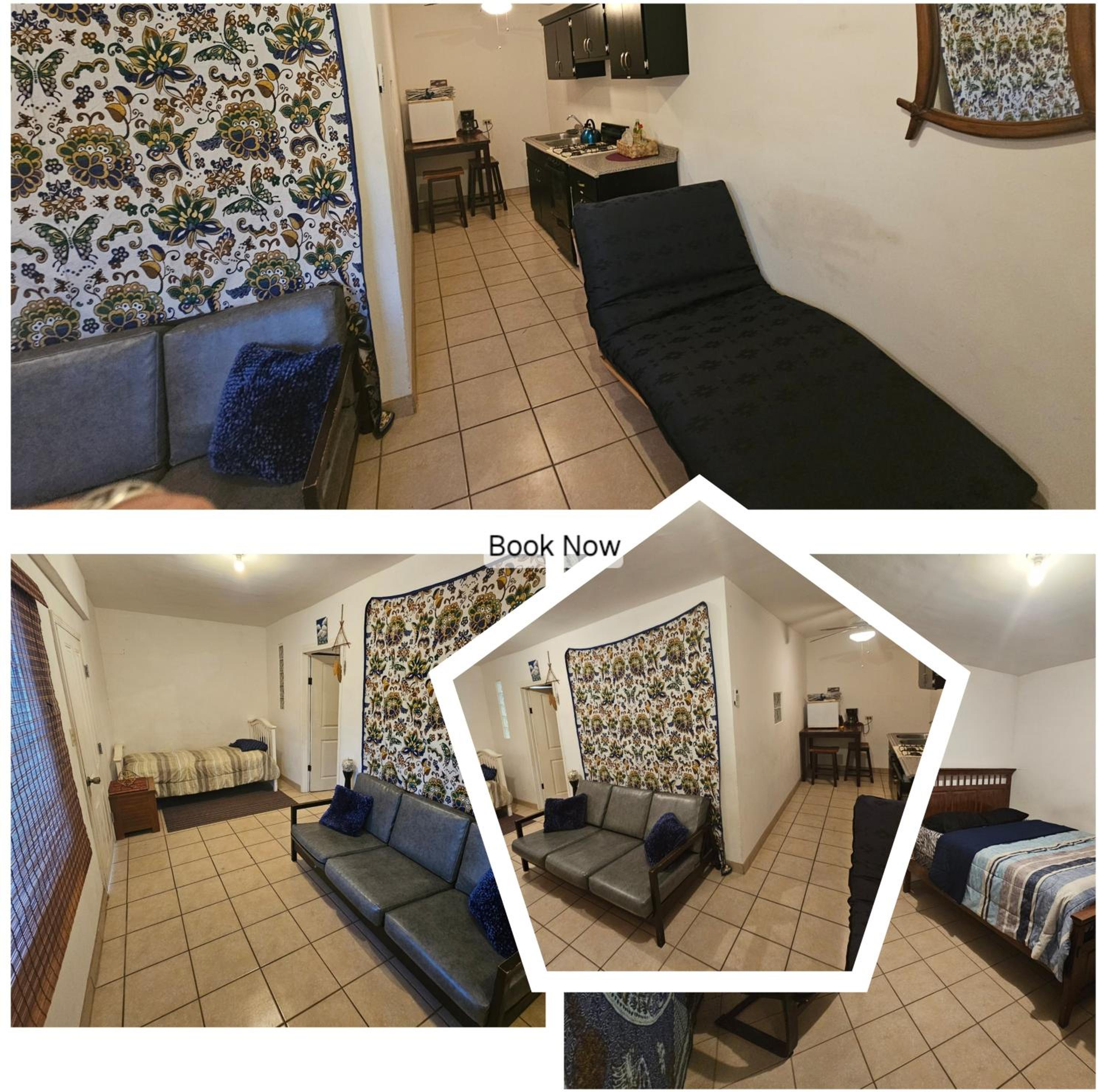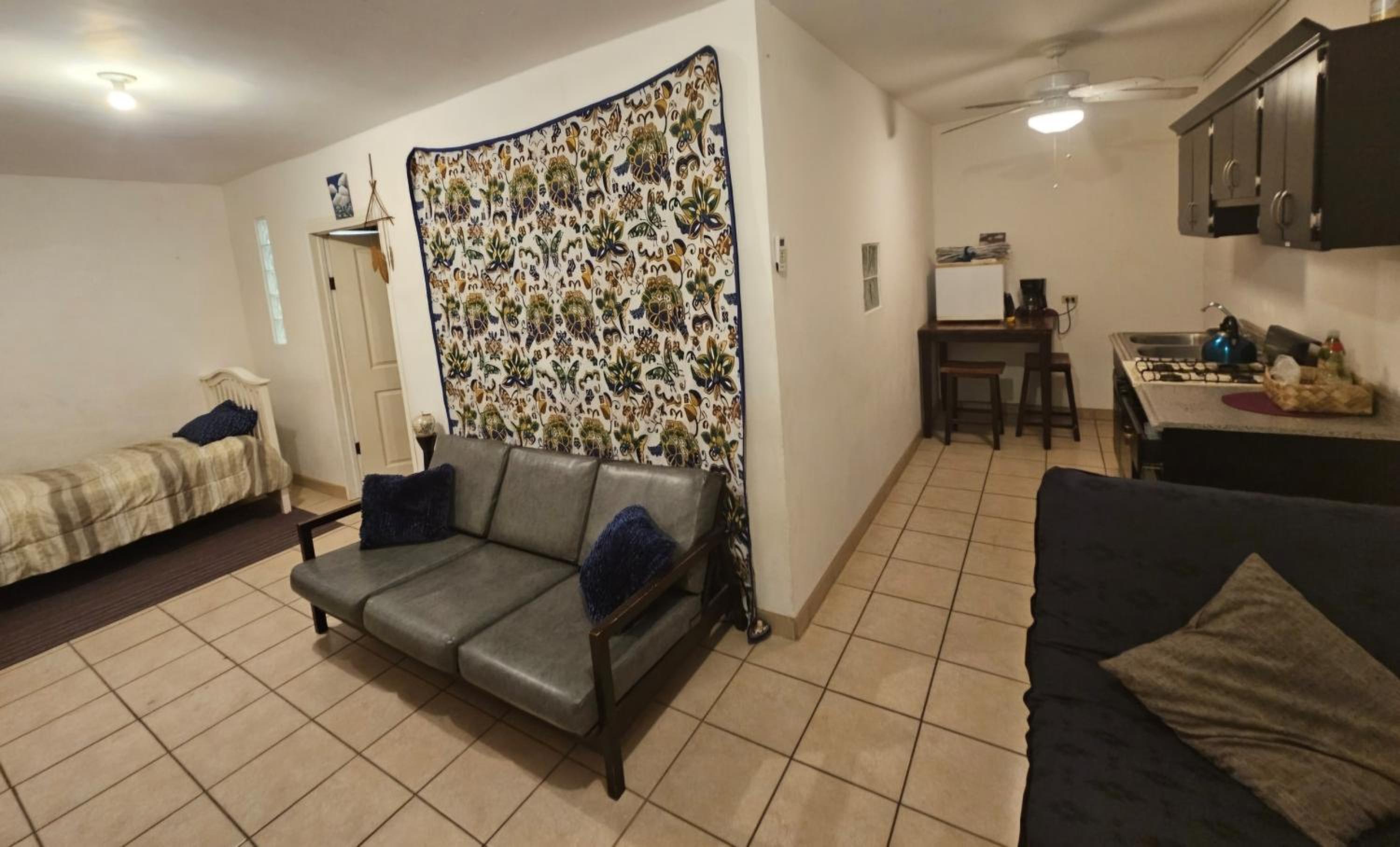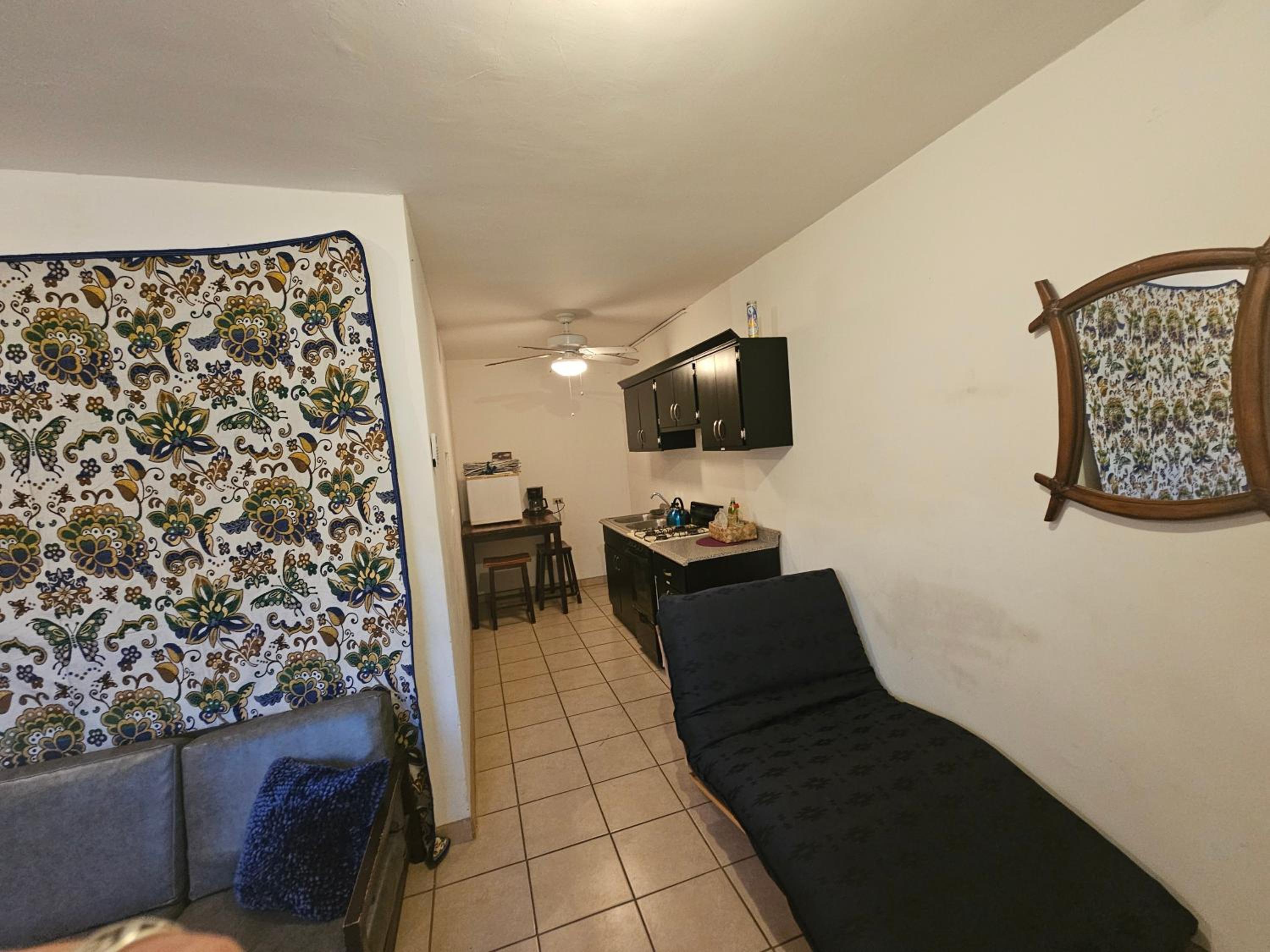 Awesome area and beautiful flowers/comfy sofa to hang out and eat and cook outside too- and chairs to lay out! We loved it and we’ll return soon to rent out all 3 casitas when my family comes into town because it’s perfect for that too