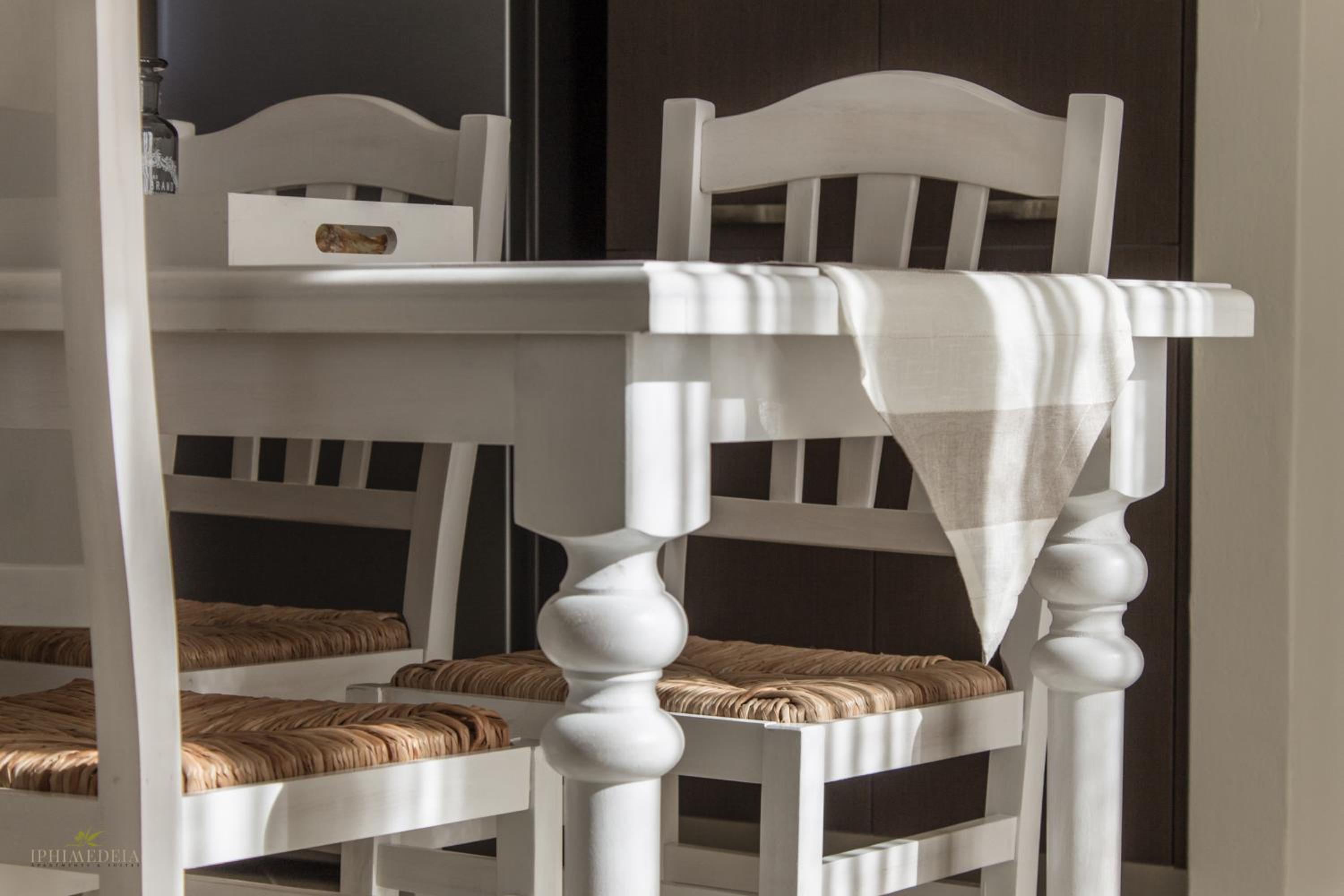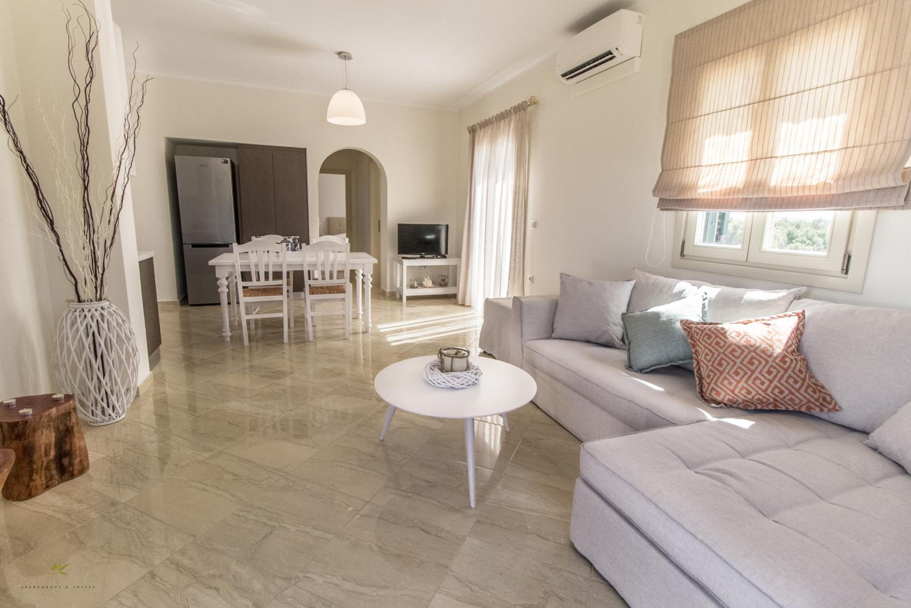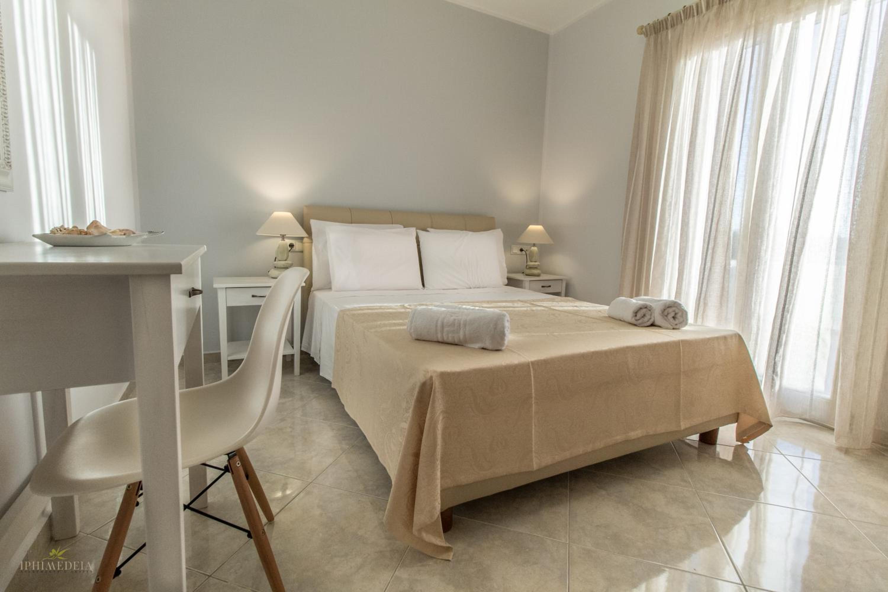 Iphimedeia Apartments & Suites offer elegantly decorated rooms with modern amenities including air conditioning, flat-screen TVs, and private bathrooms with plush bath robes. Some units even feature charming terraces or balconies for a relaxing stay.