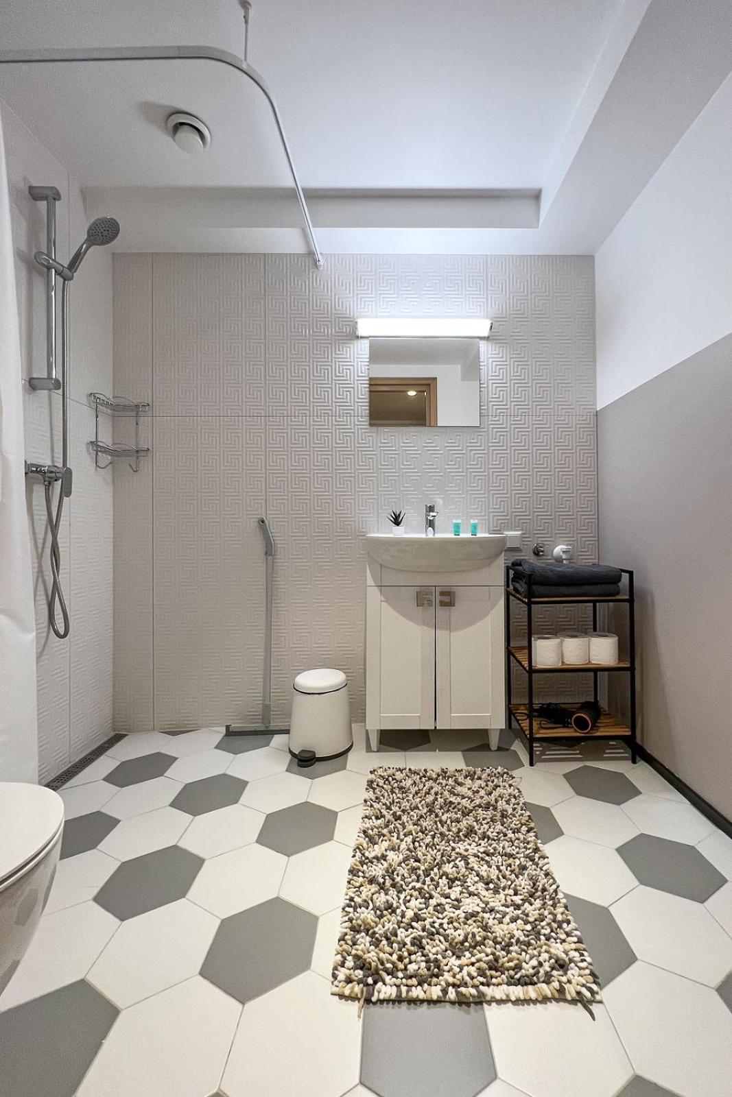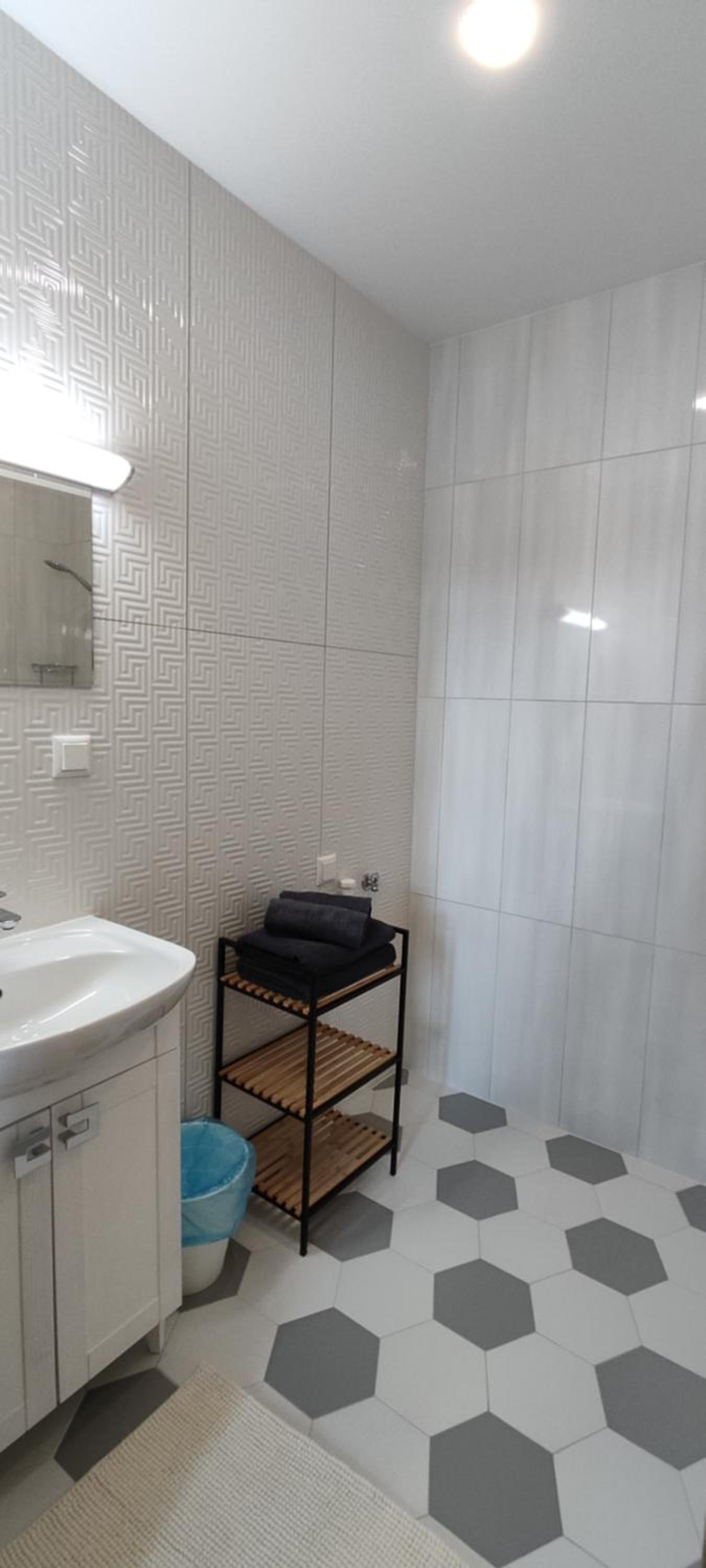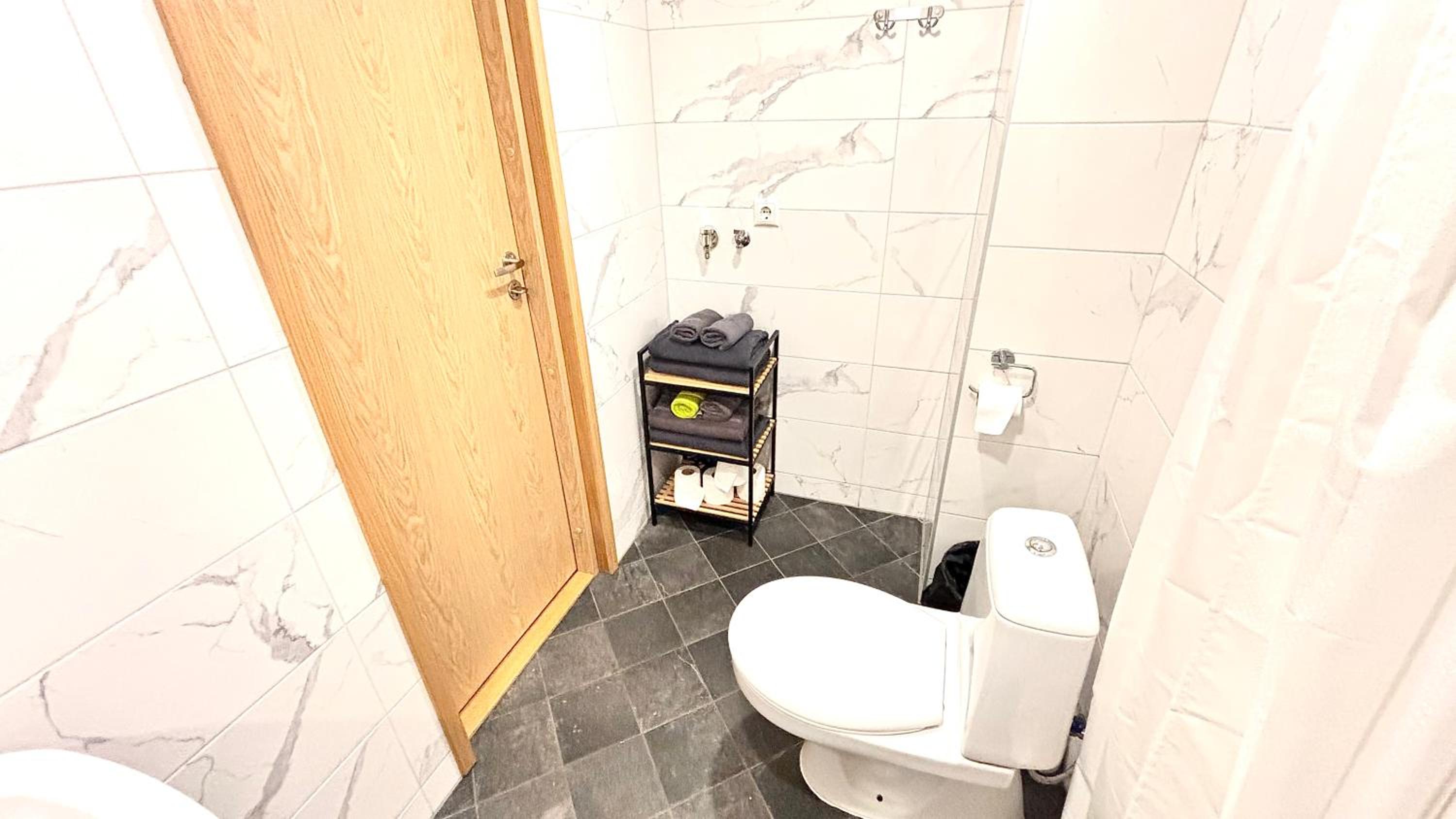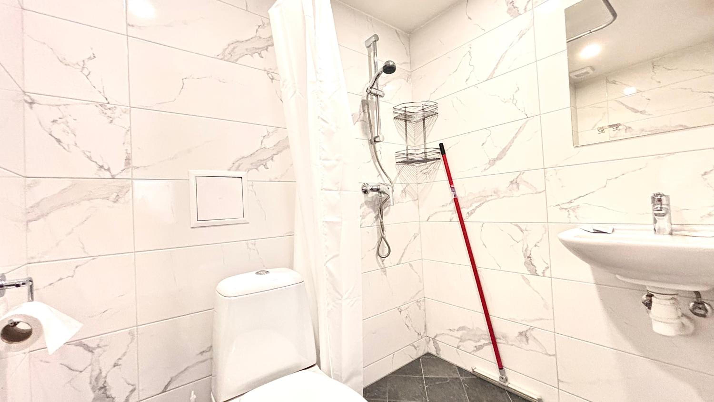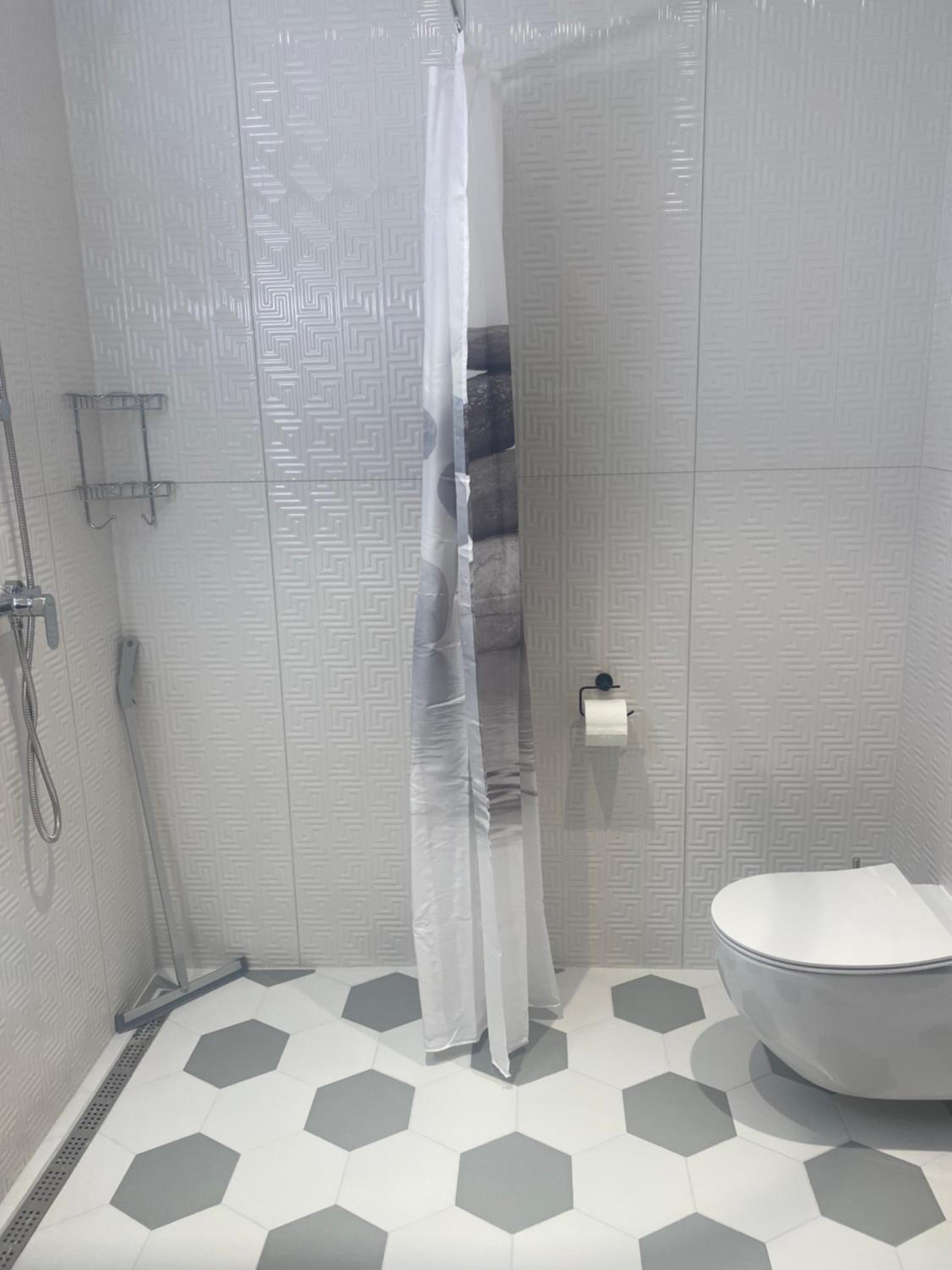 Также не хватило полочки в душе, куда можно поставить элементарно шампунь и гель для душа, также в ванной комнате нет помойки.
