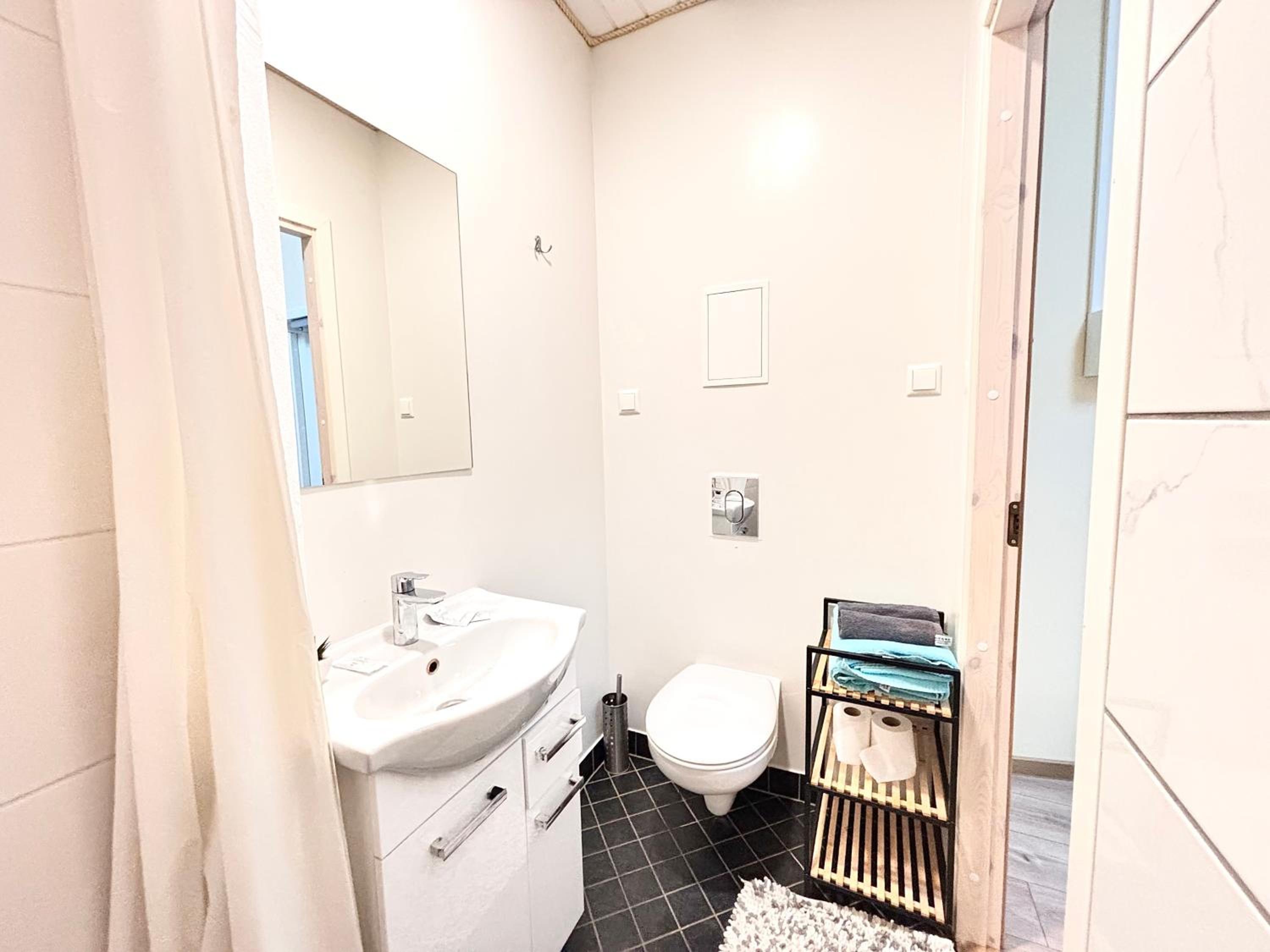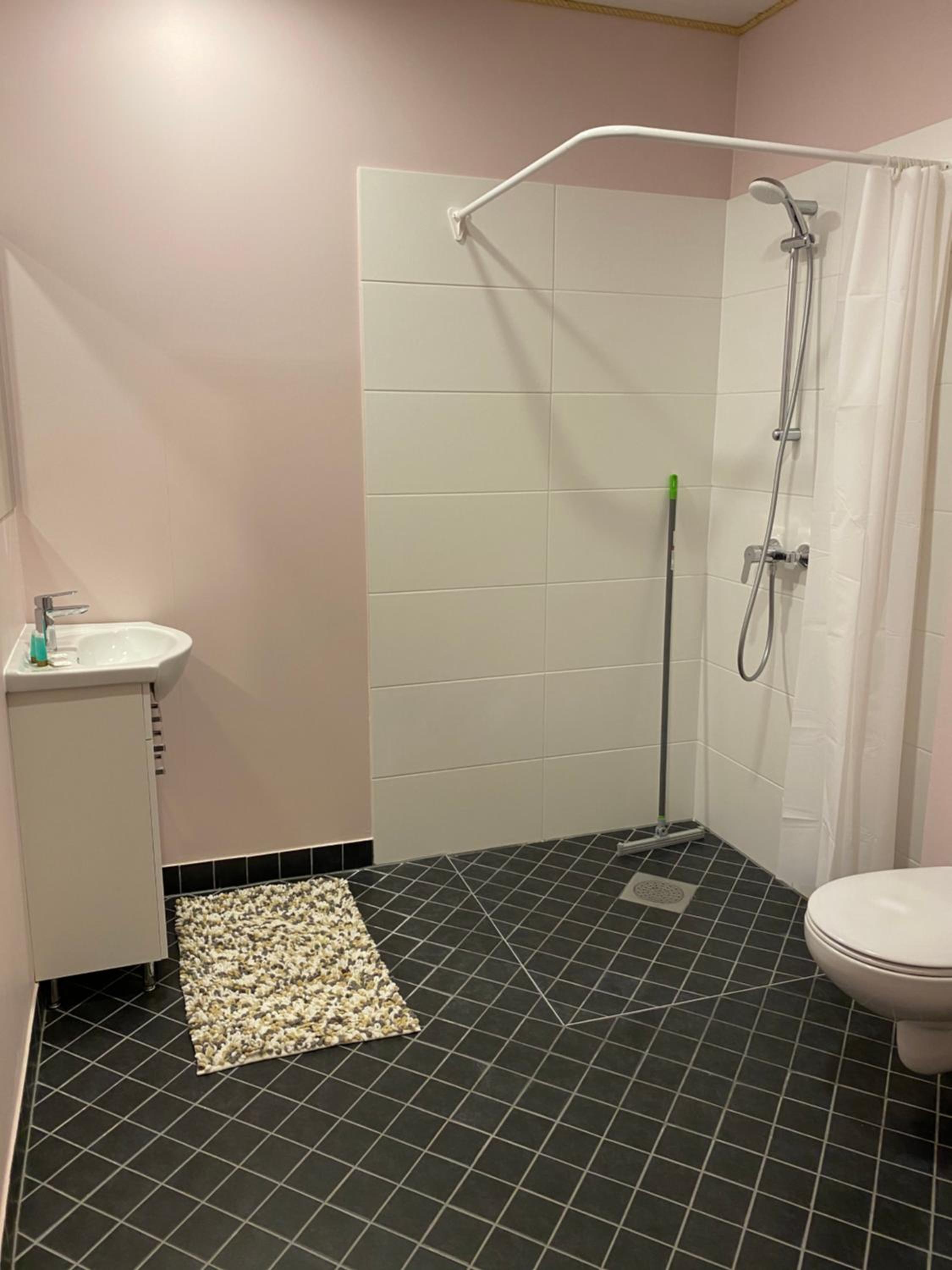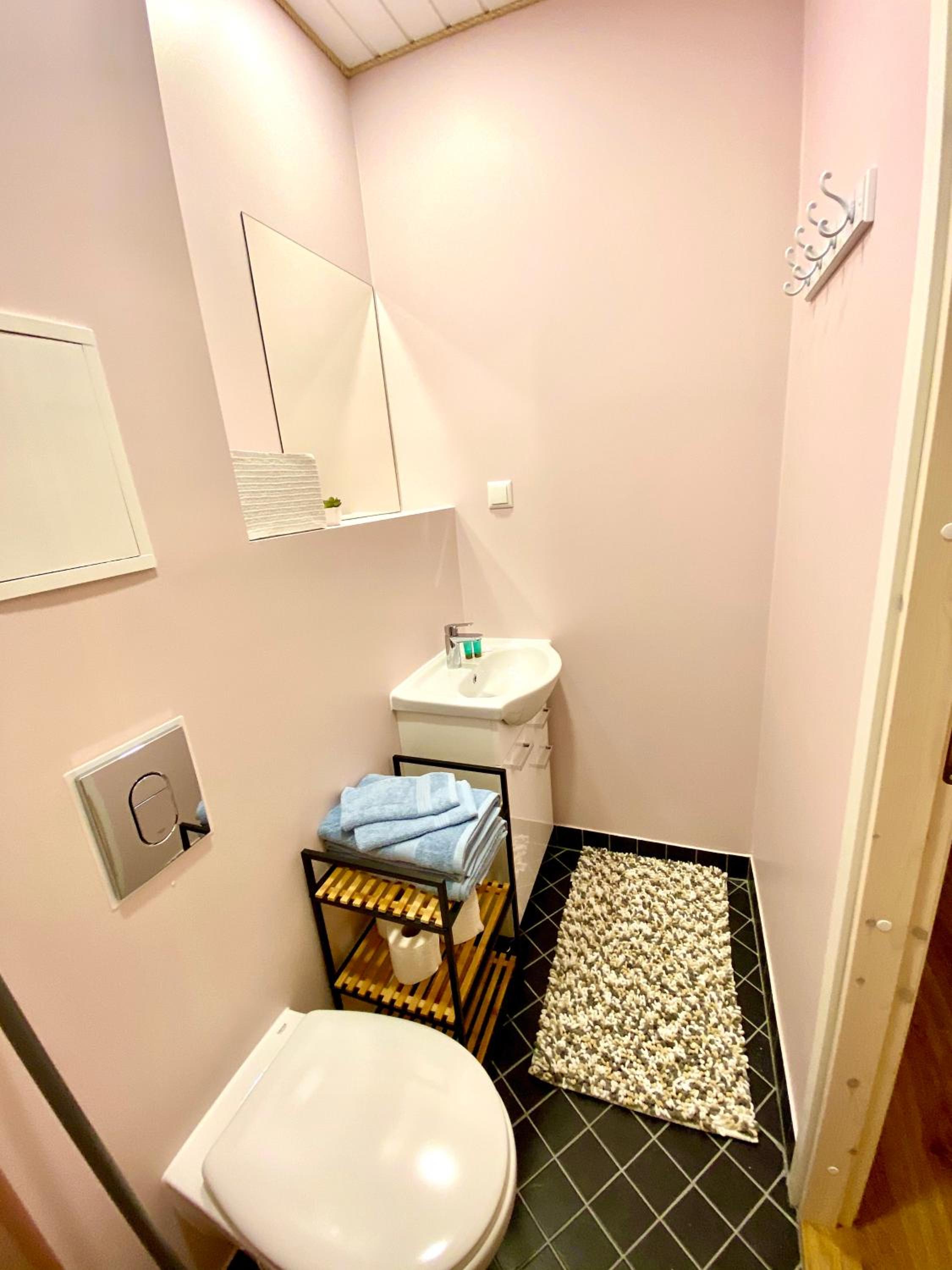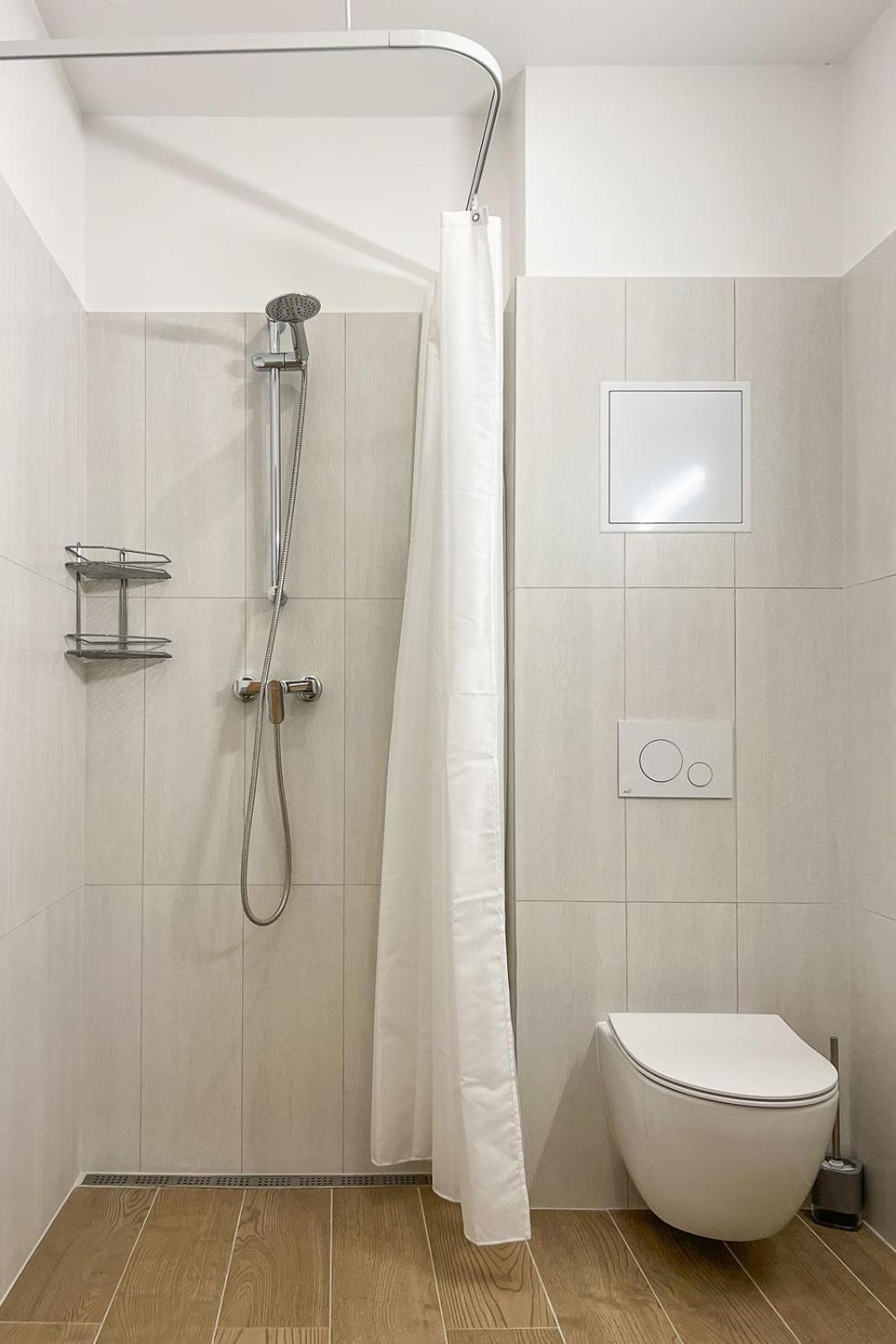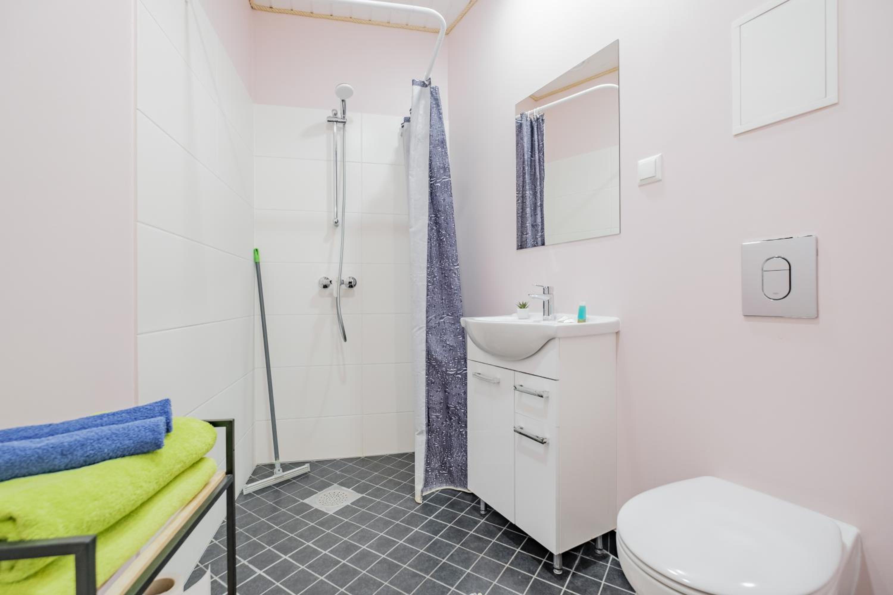 Также не хватило полочки в душе, куда можно поставить элементарно шампунь и гель для душа, также в ванной комнате нет помойки.