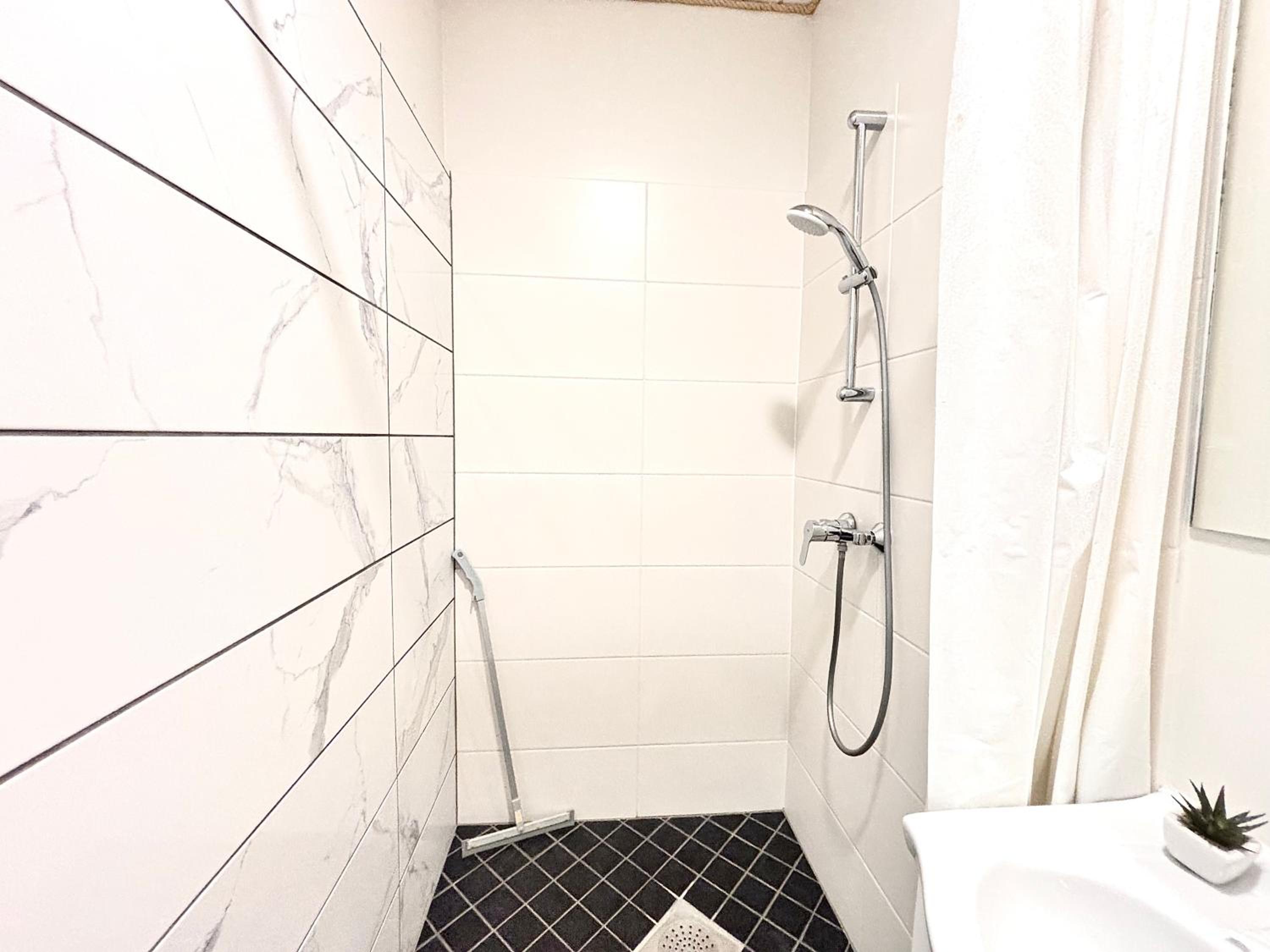 В душе не хватает на полу ограничителя для воды, когда принимаешь душ, вода растекается на половину ванной комнаты, что предоставляет дискомфорт, так как надо сначала весь пол вытереть, а потом продолжать свои процедуры.