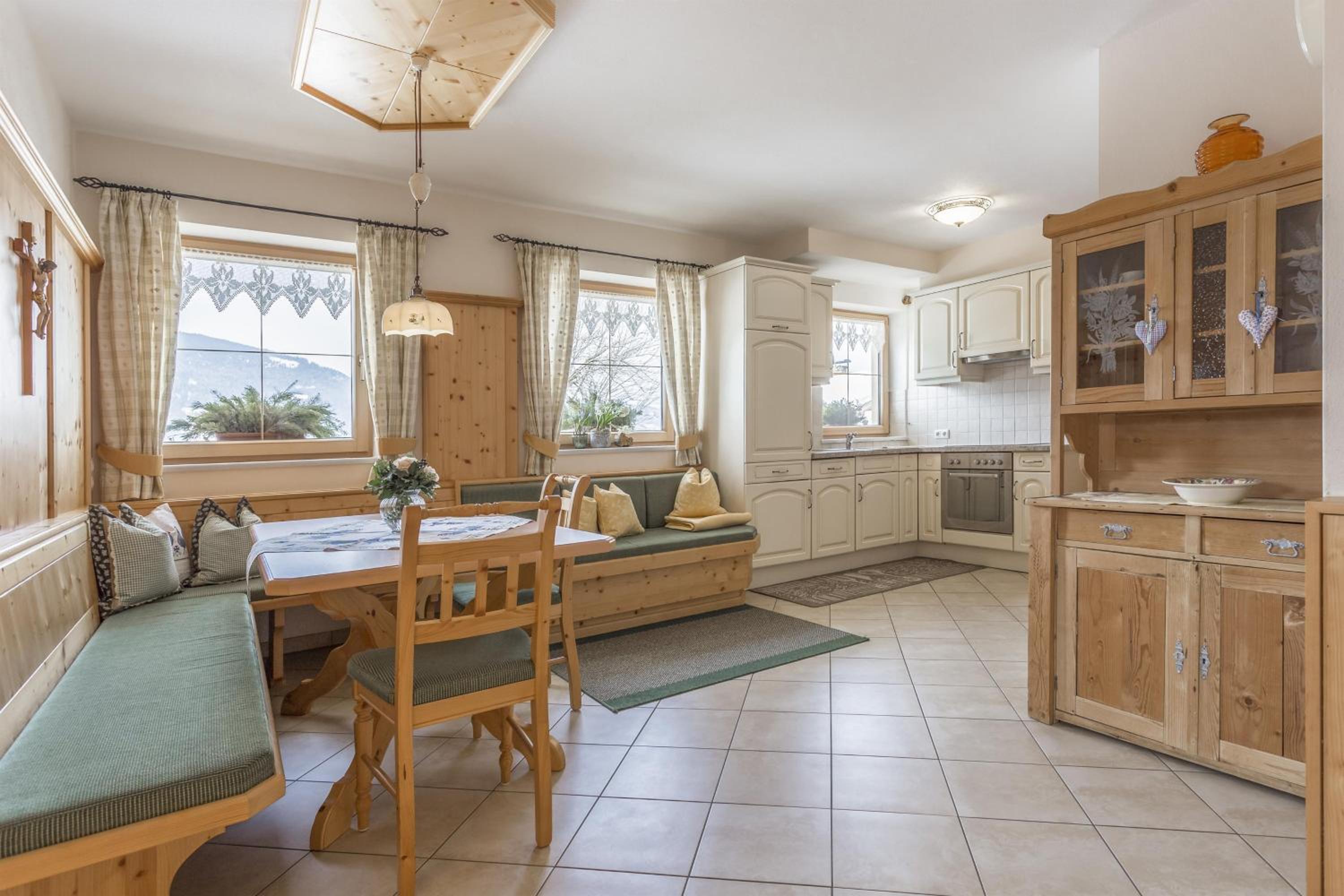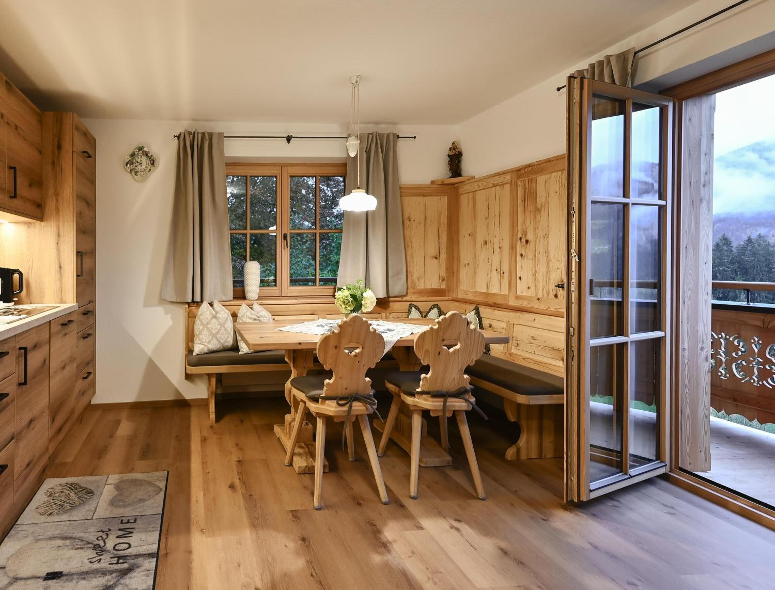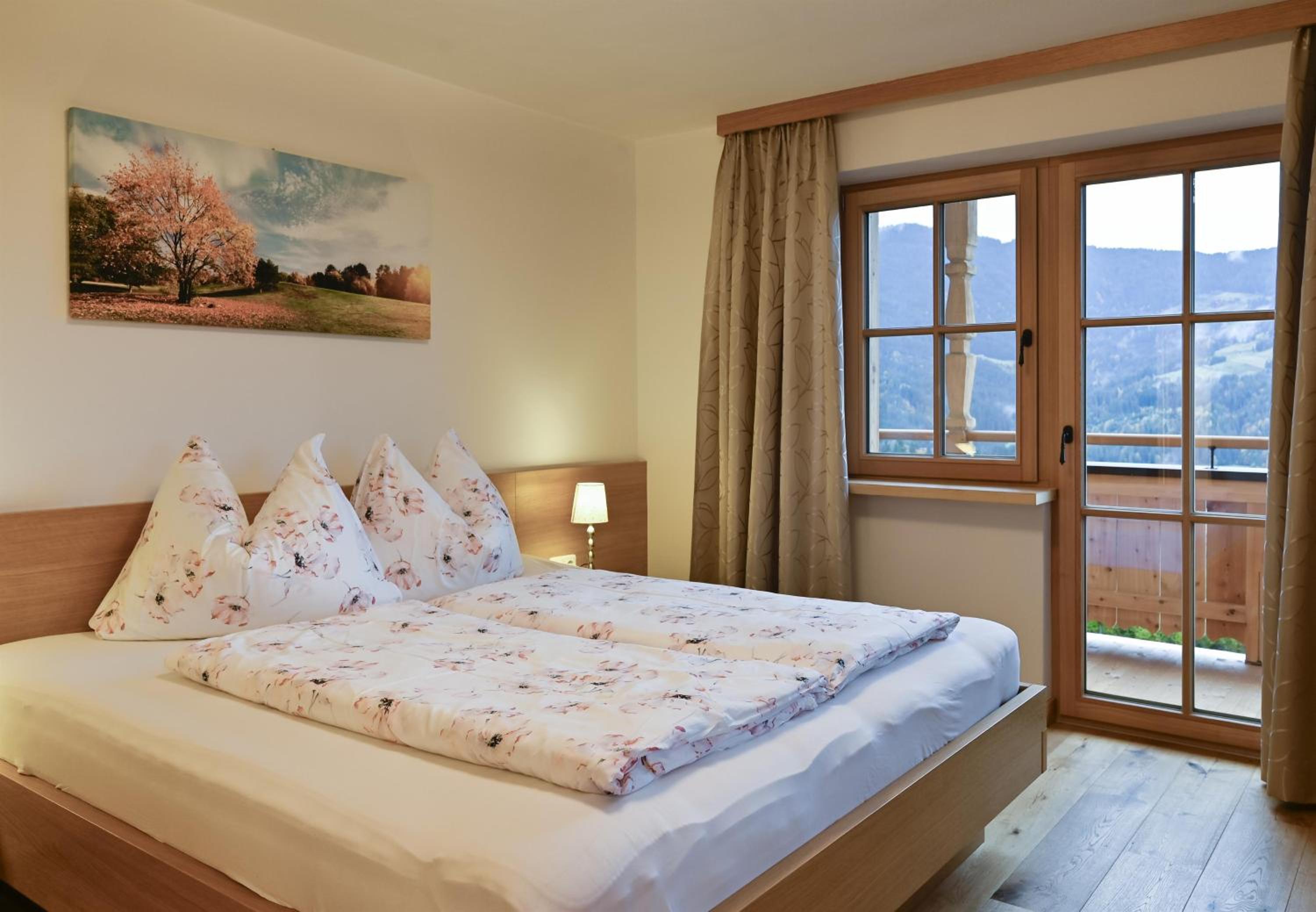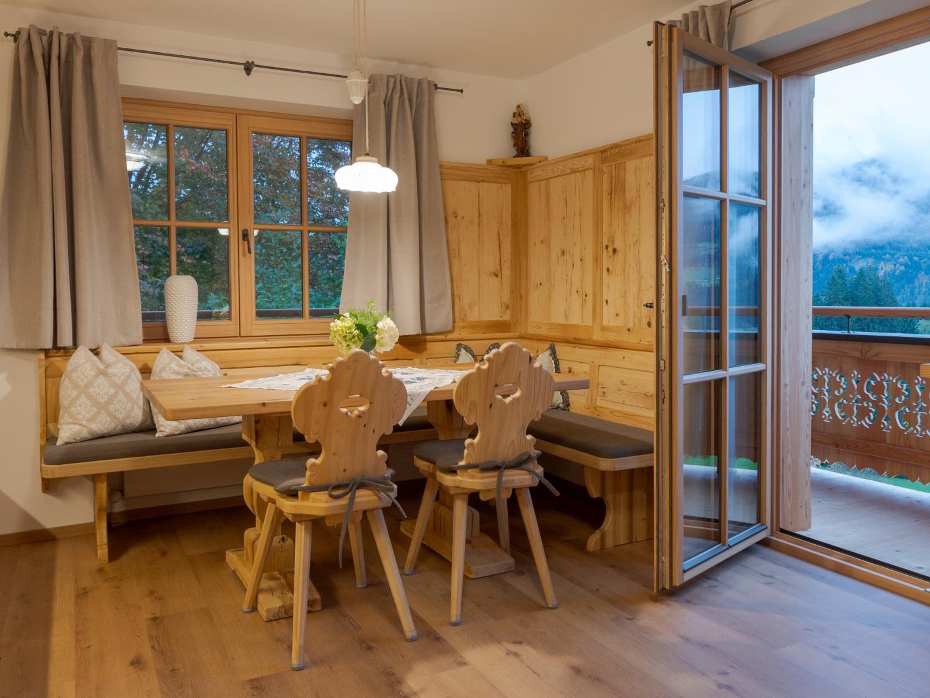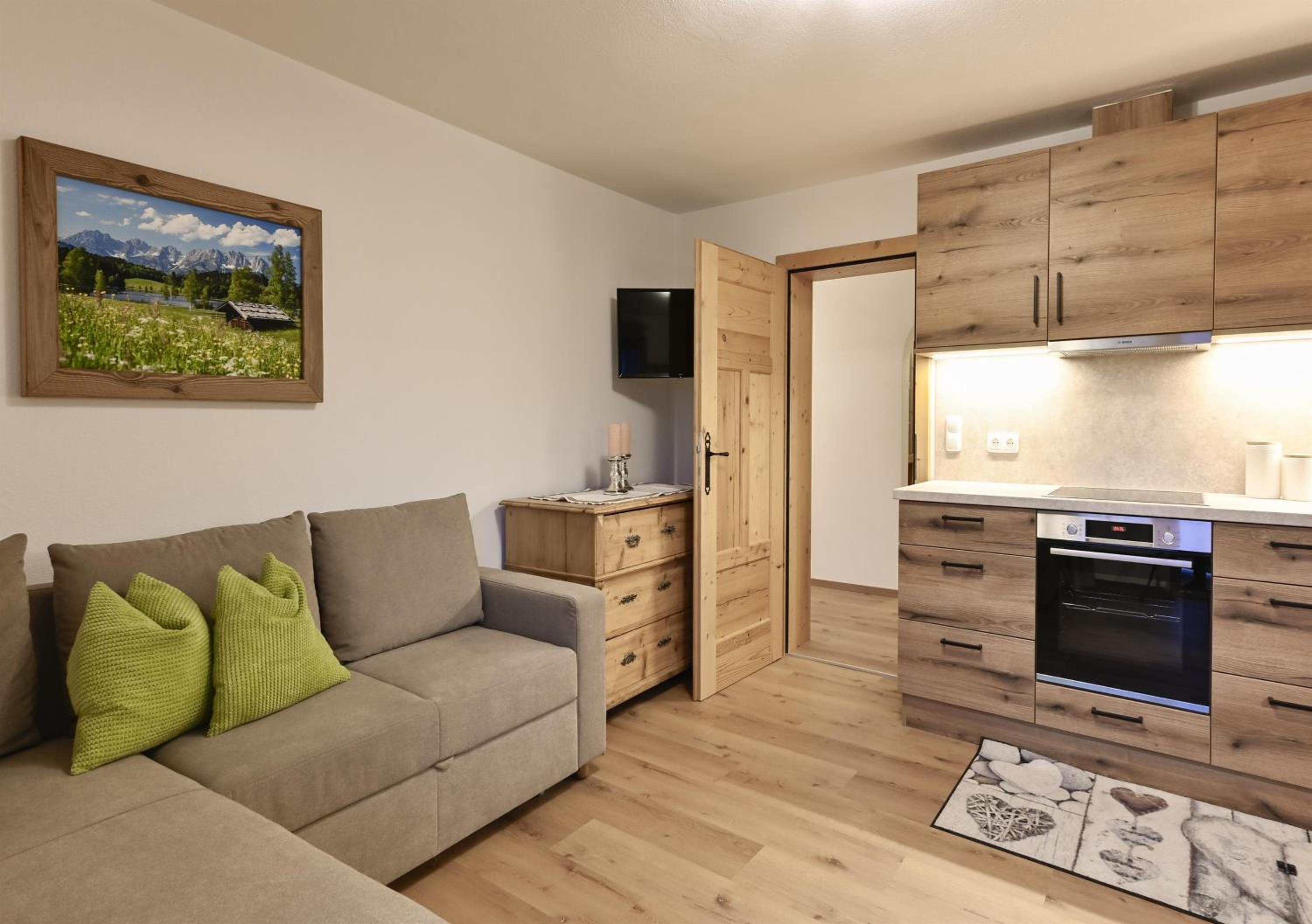 Experience breathtaking mountain views from the furnished balconies or terraces of our modern Alpine-style apartments at Bauernhof Glanzern. Each apartment offers a cozy living room, a fully equipped kitchen, and free Wi-Fi for your comfort.