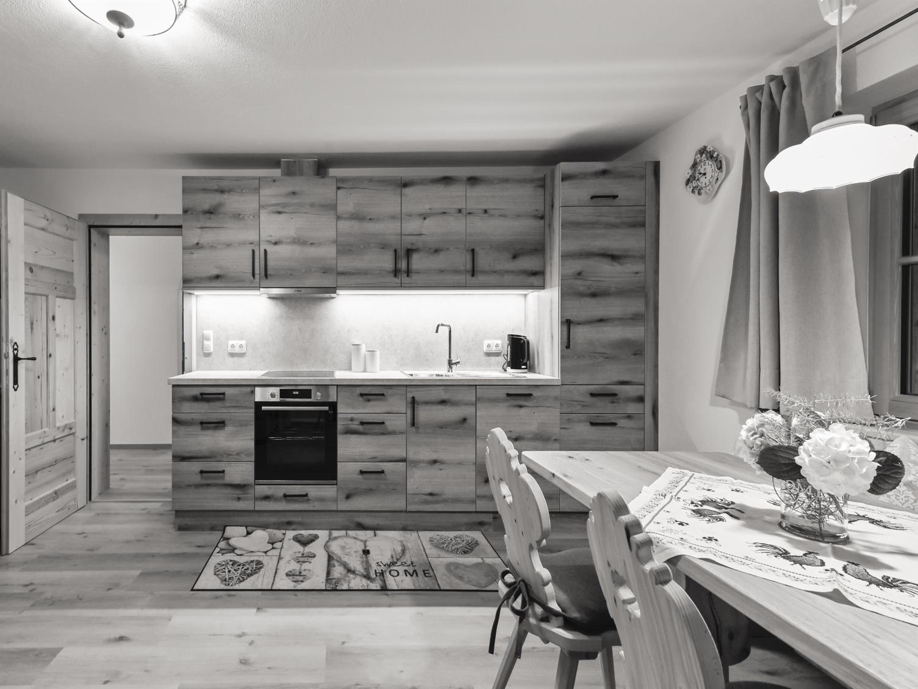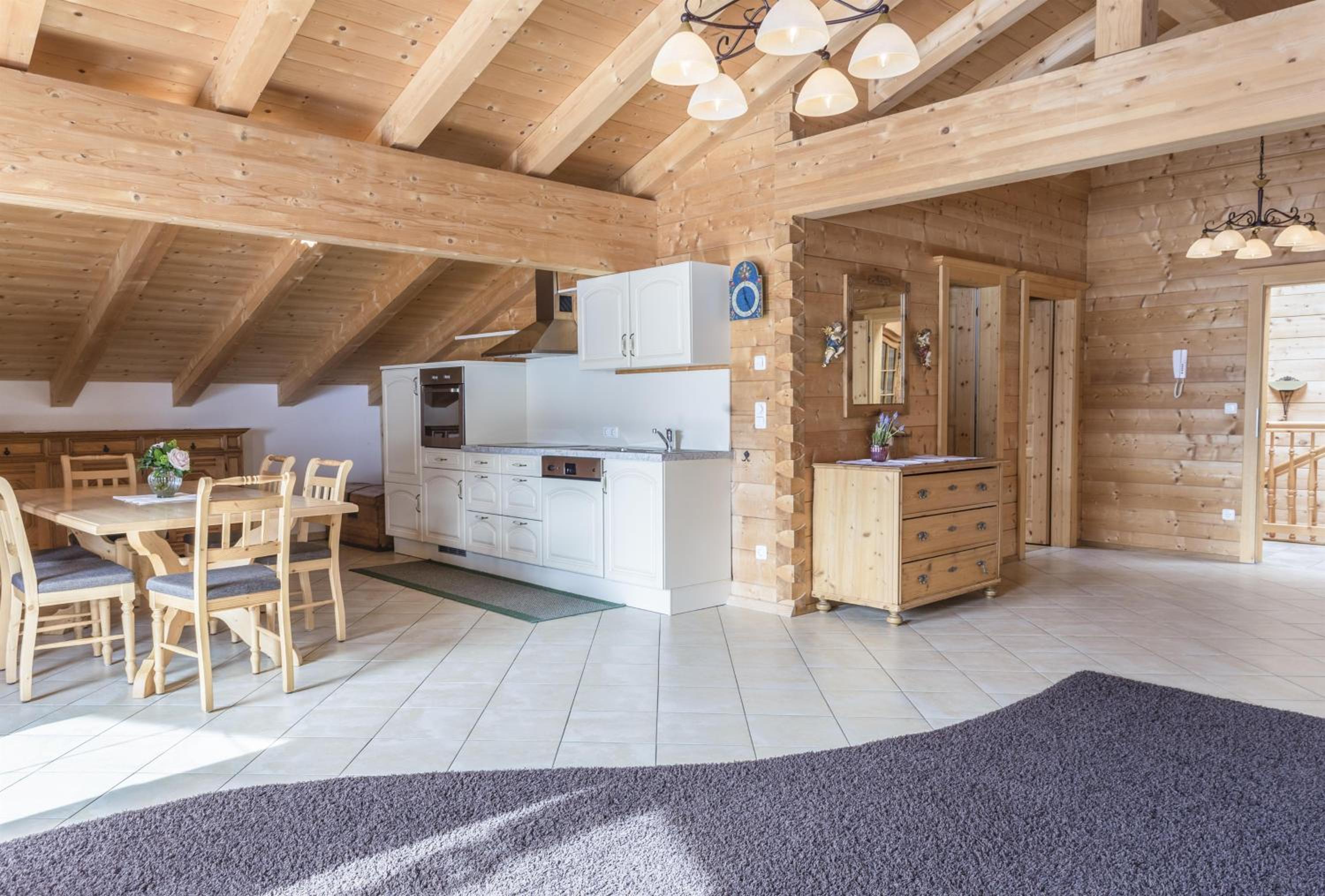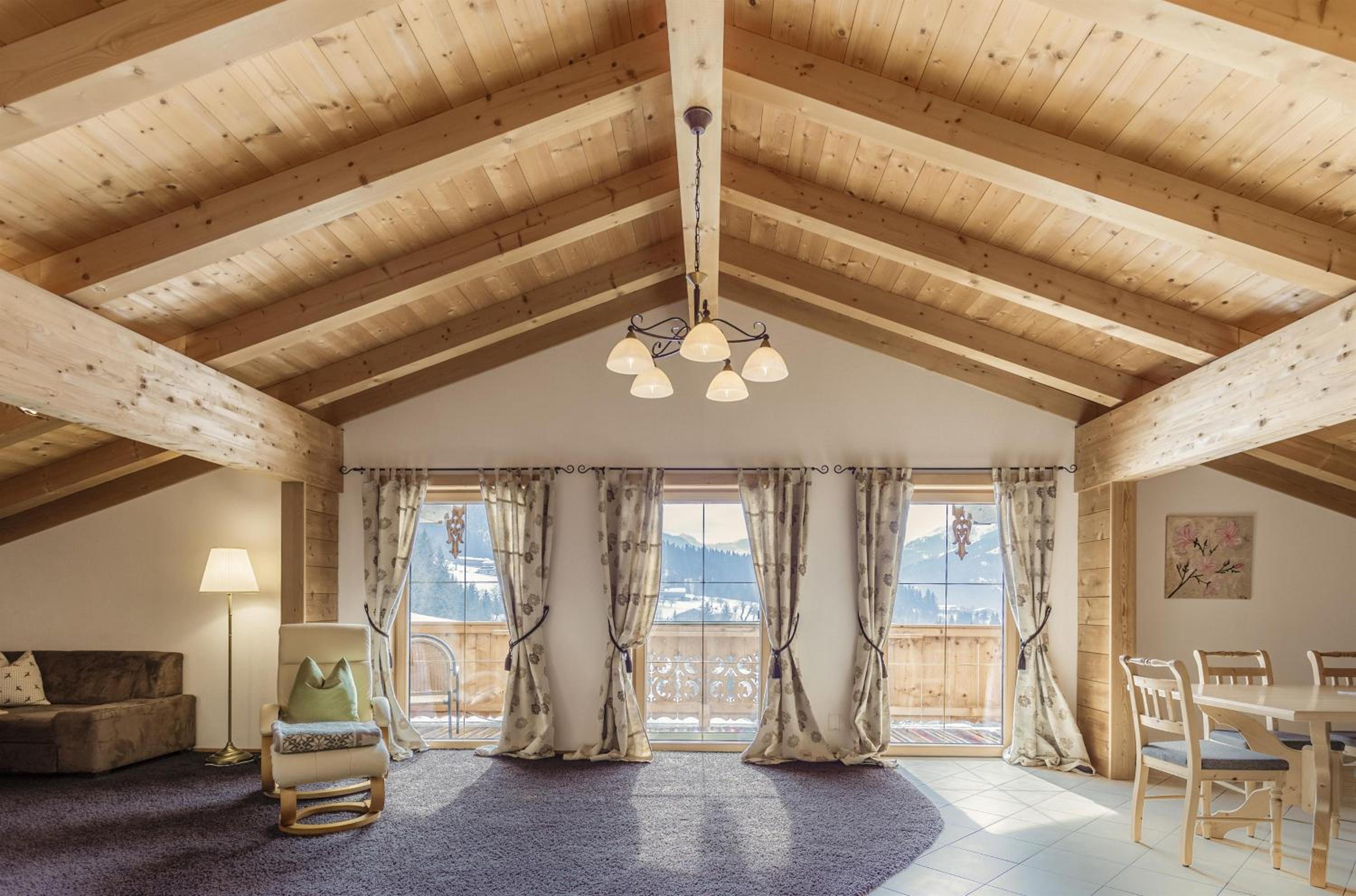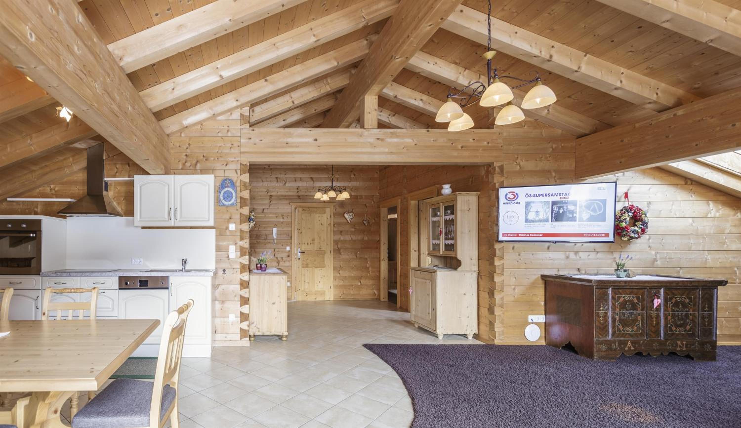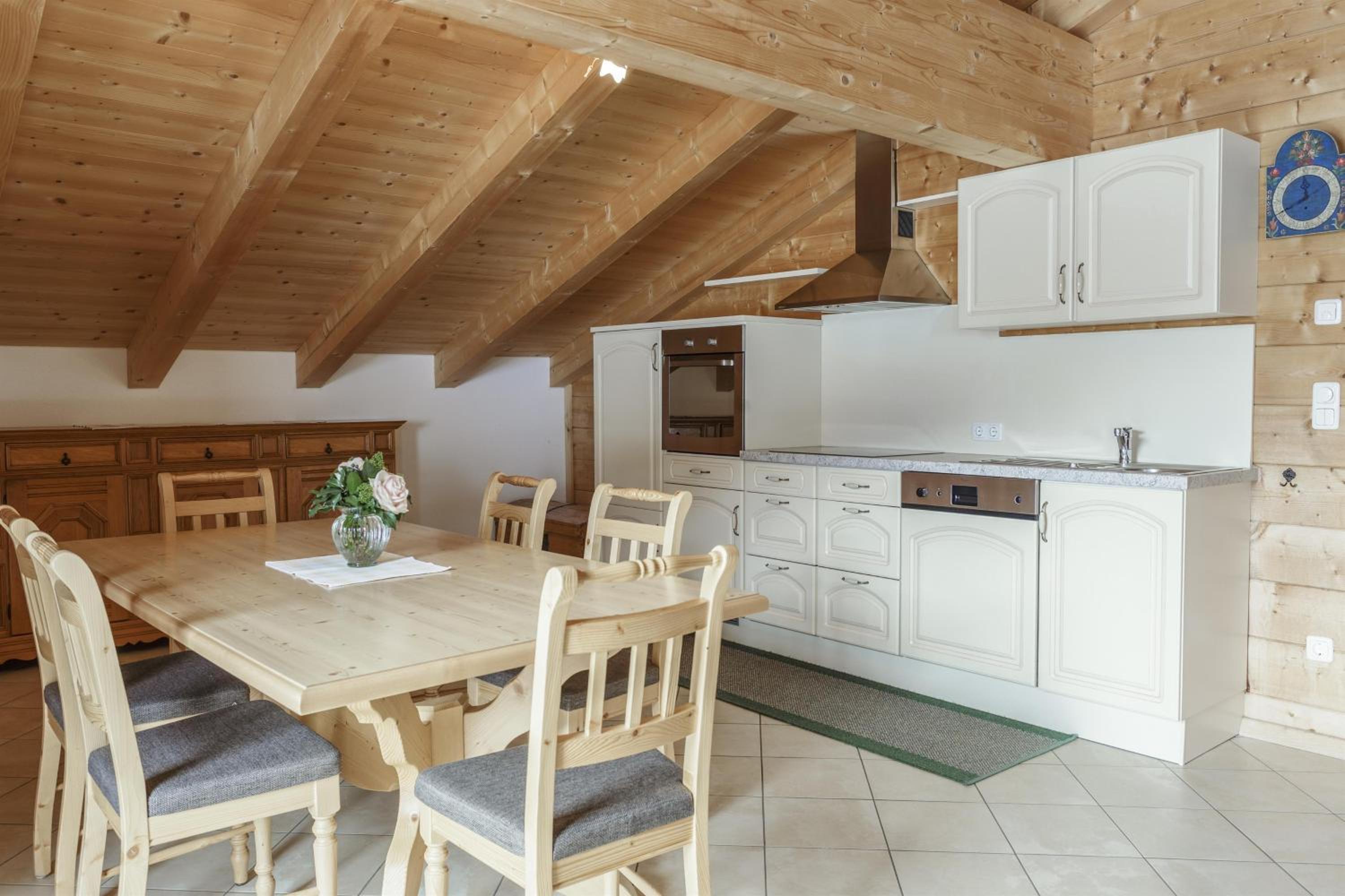 Experience breathtaking mountain views from the furnished balconies or terraces of our modern Alpine-style apartments at Bauernhof Glanzern. Each apartment offers a cozy living room, a fully equipped kitchen, and free Wi-Fi for your comfort.