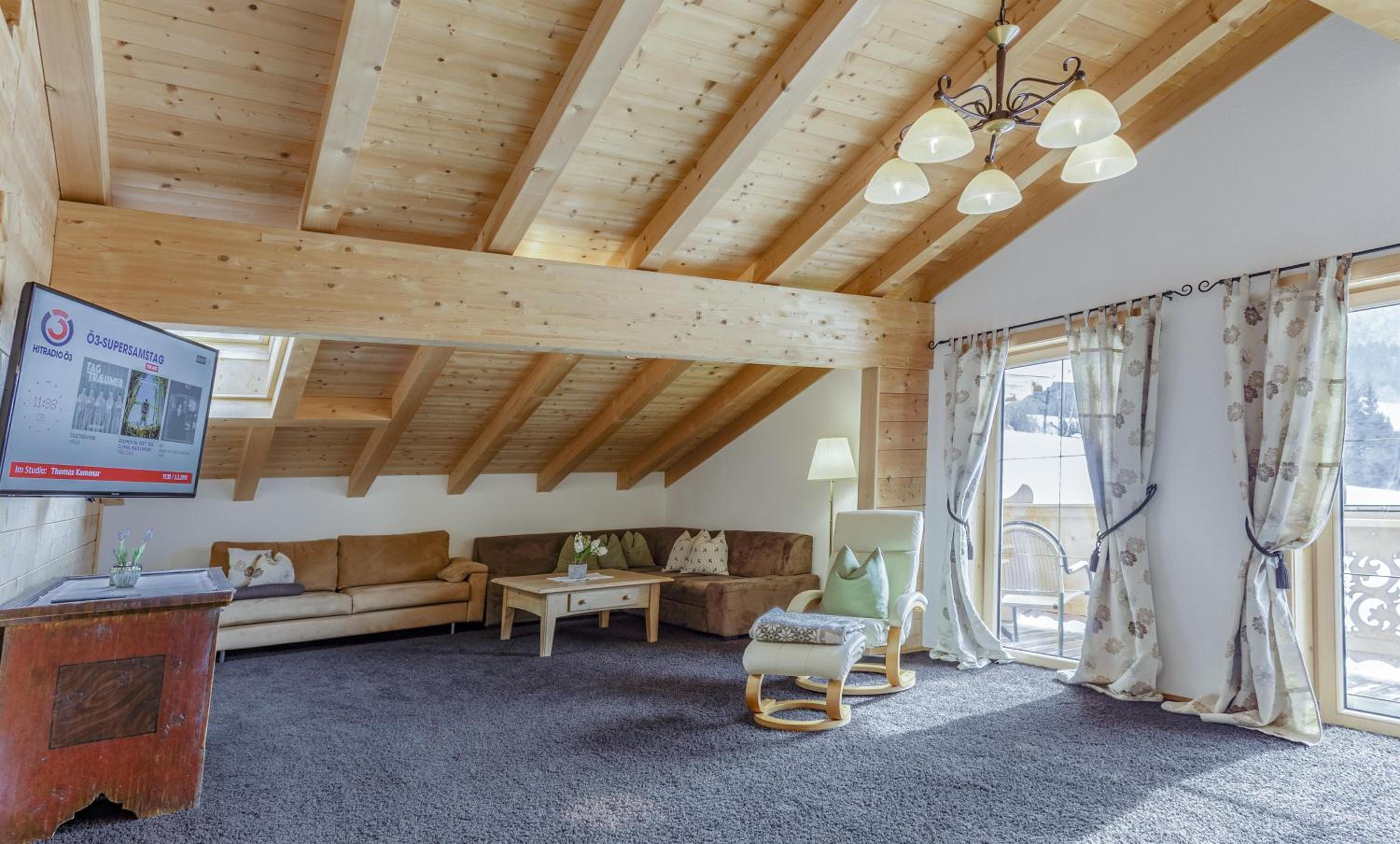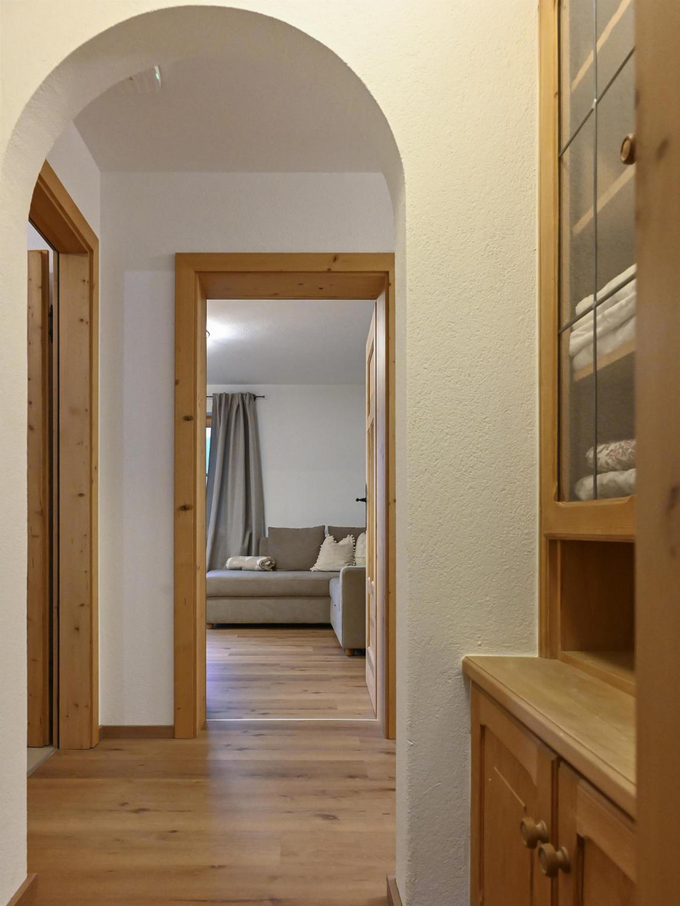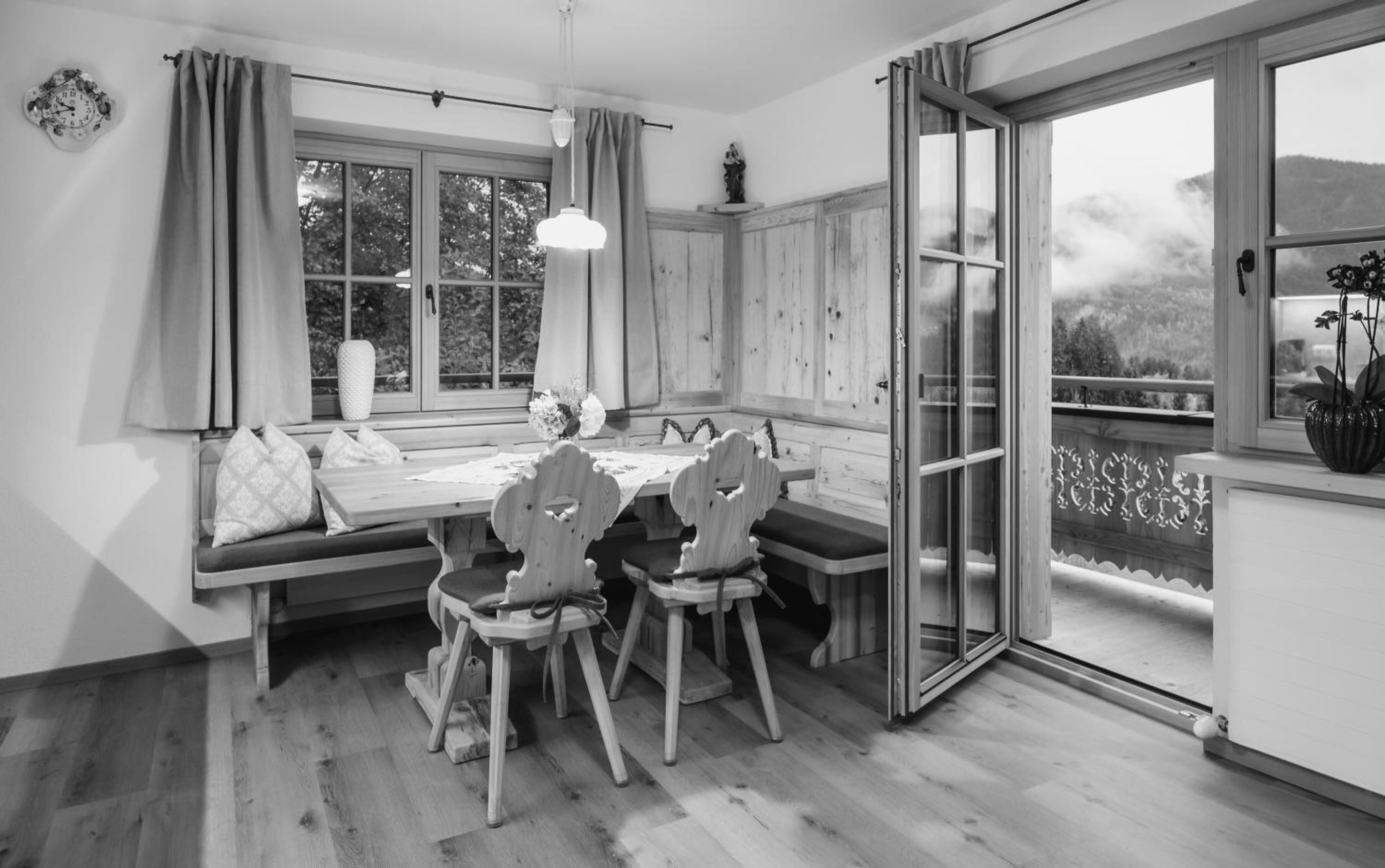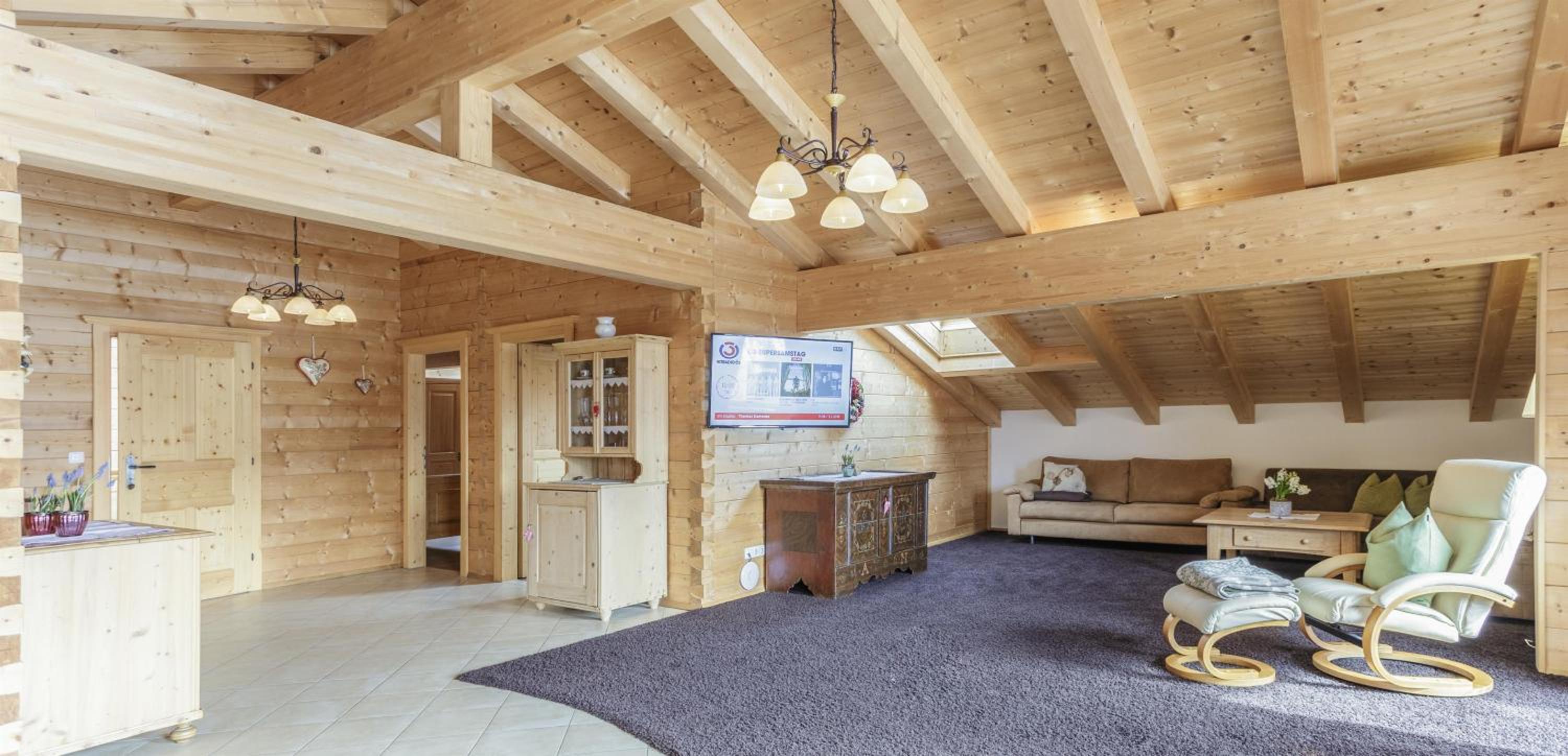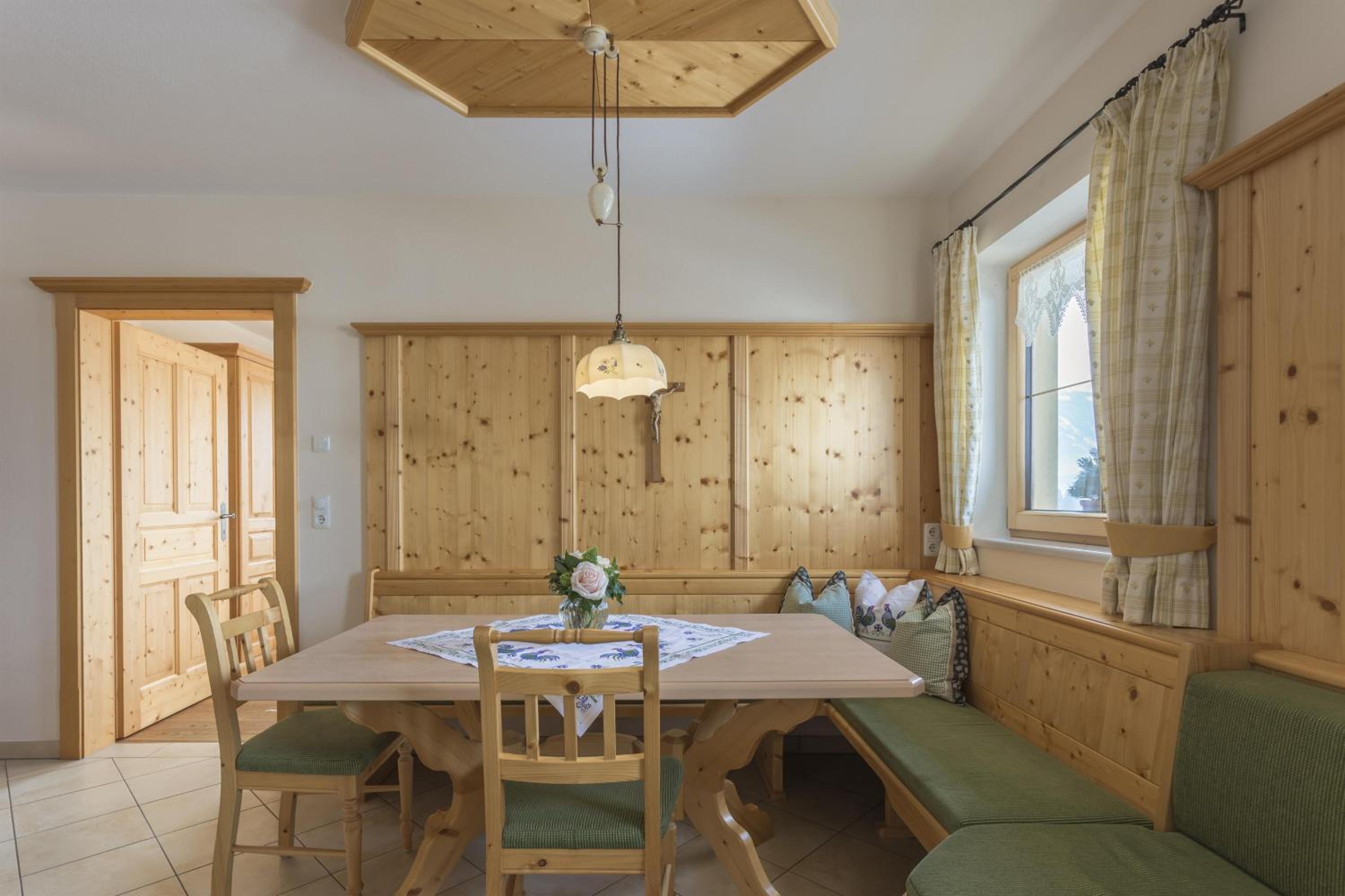 Experience breathtaking mountain views from the furnished balconies or terraces of our modern Alpine-style apartments at Bauernhof Glanzern. Each apartment offers a cozy living room, a fully equipped kitchen, and free Wi-Fi for your comfort.
