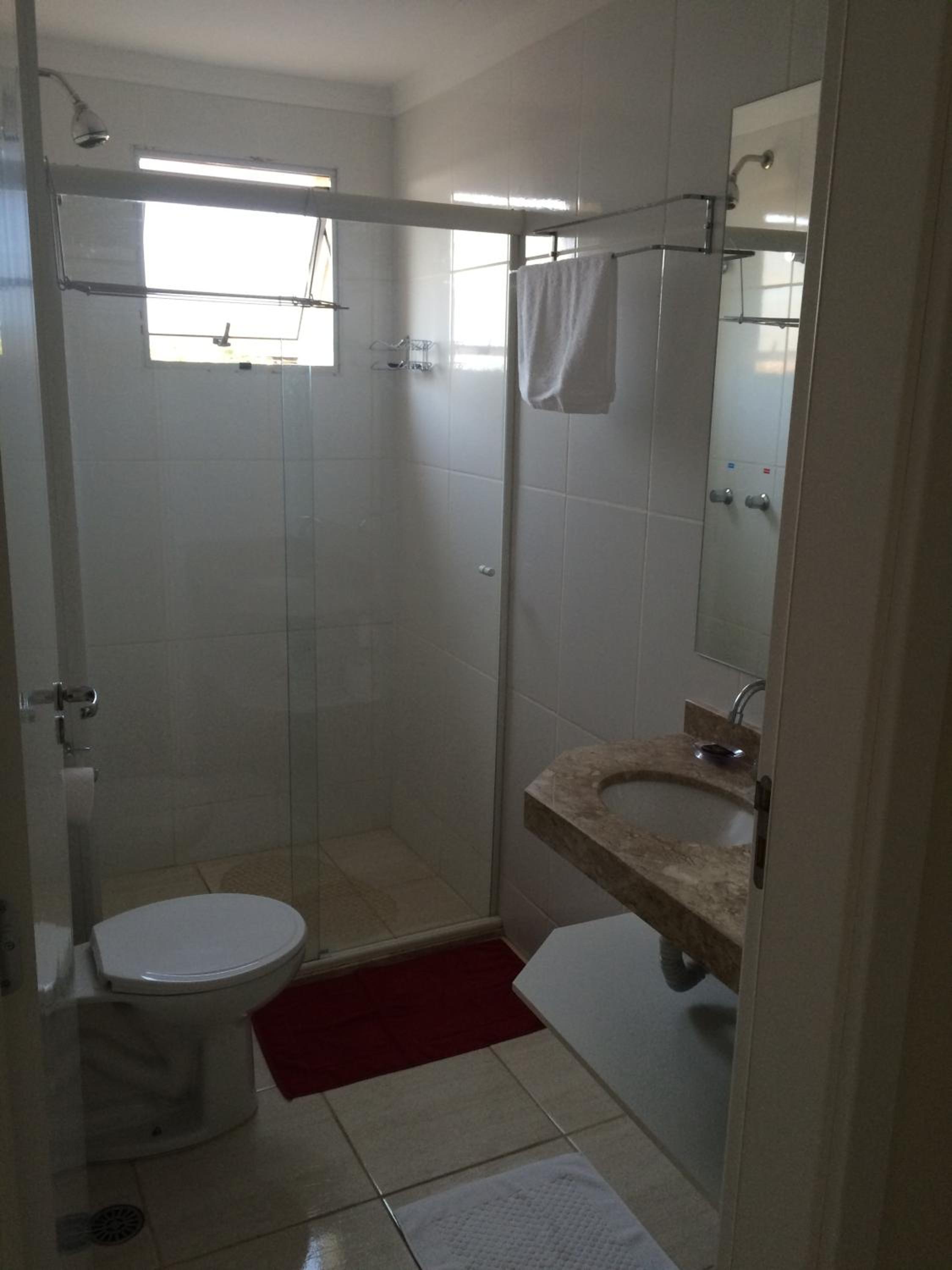 Falta de ducha higiênica instalada no banheiro que faz toda diferença no conforto. Poderia haver uma mesa com 4 cadeiras, mesmo que pequena ao invés do balcão com 3 banquetas altas.