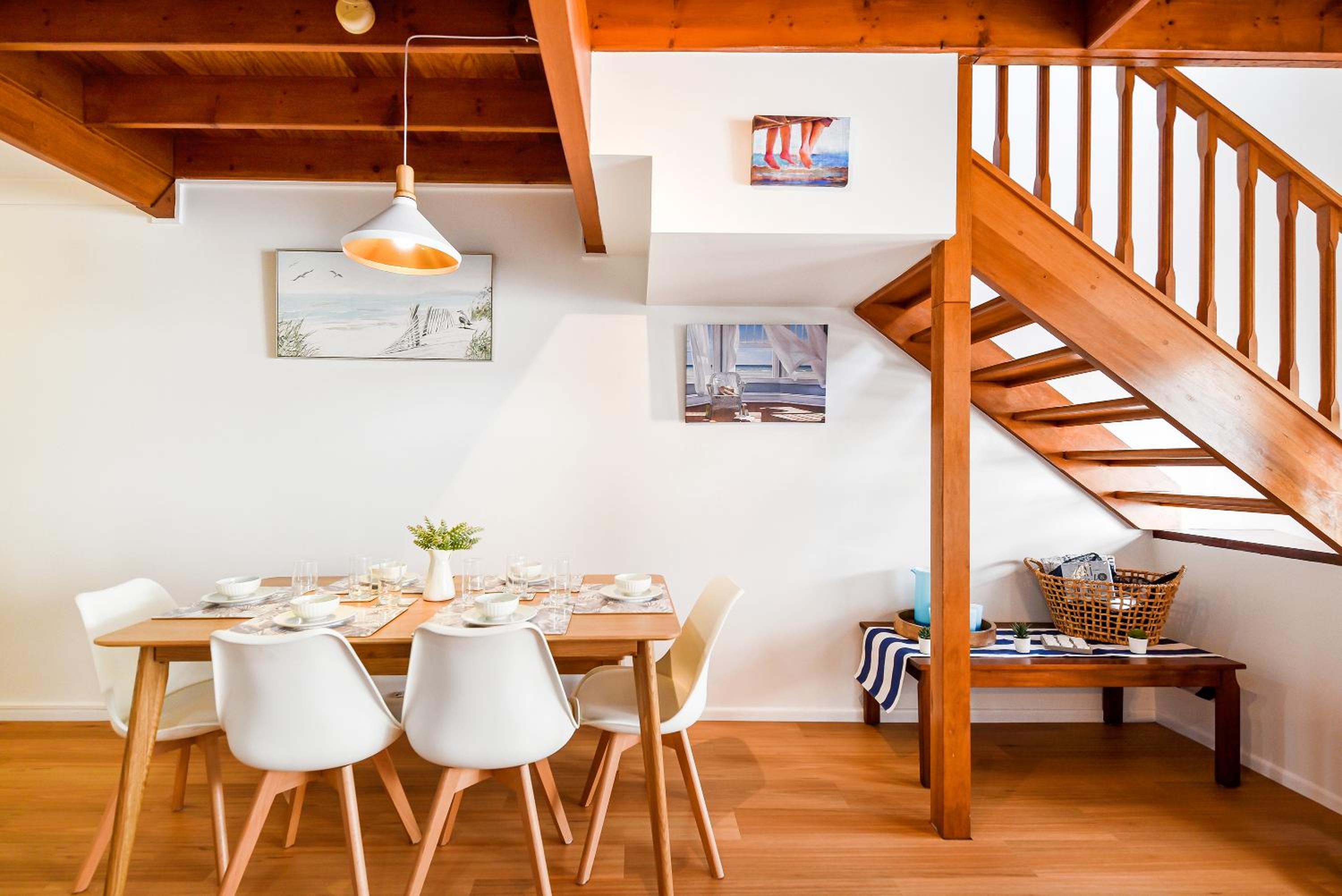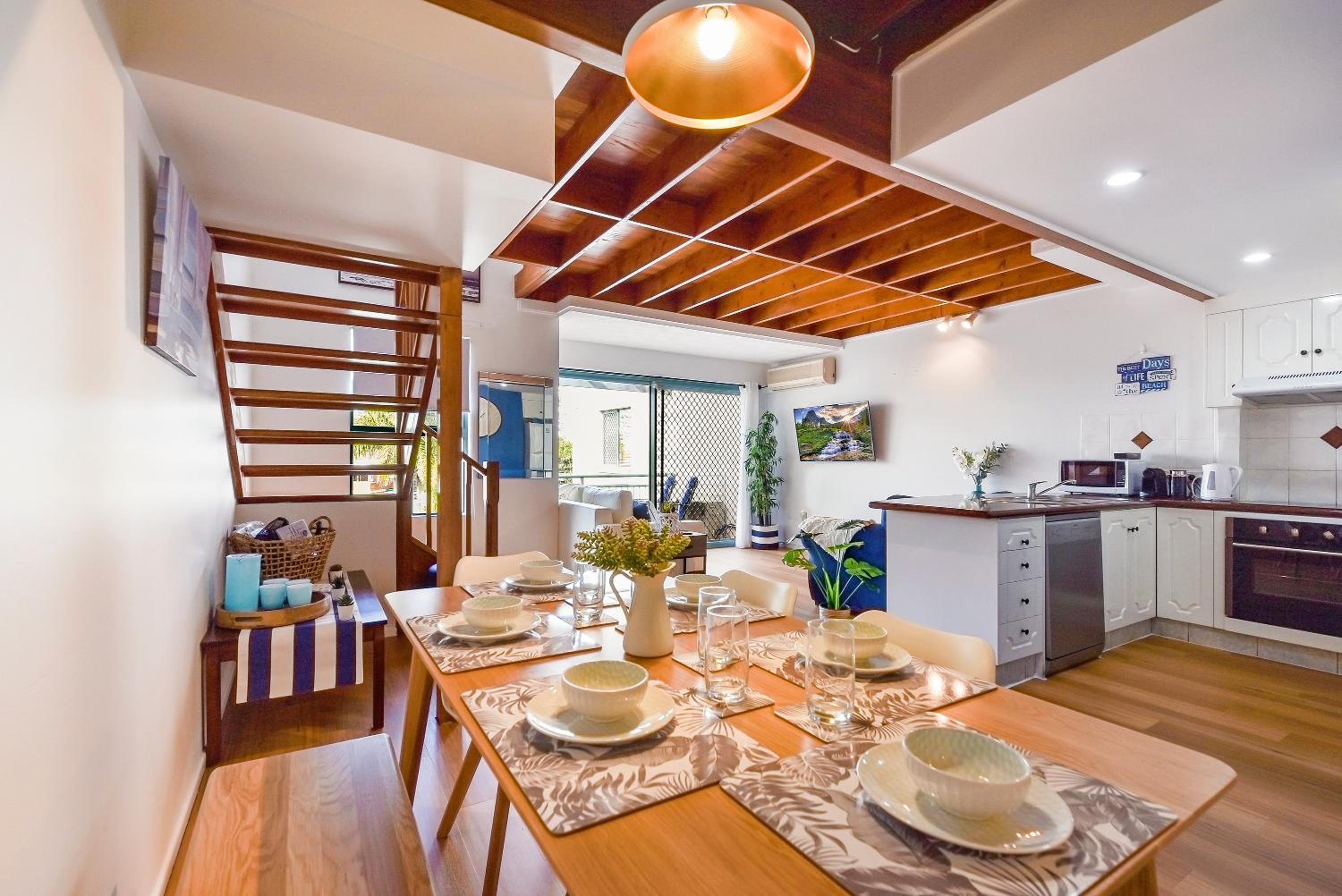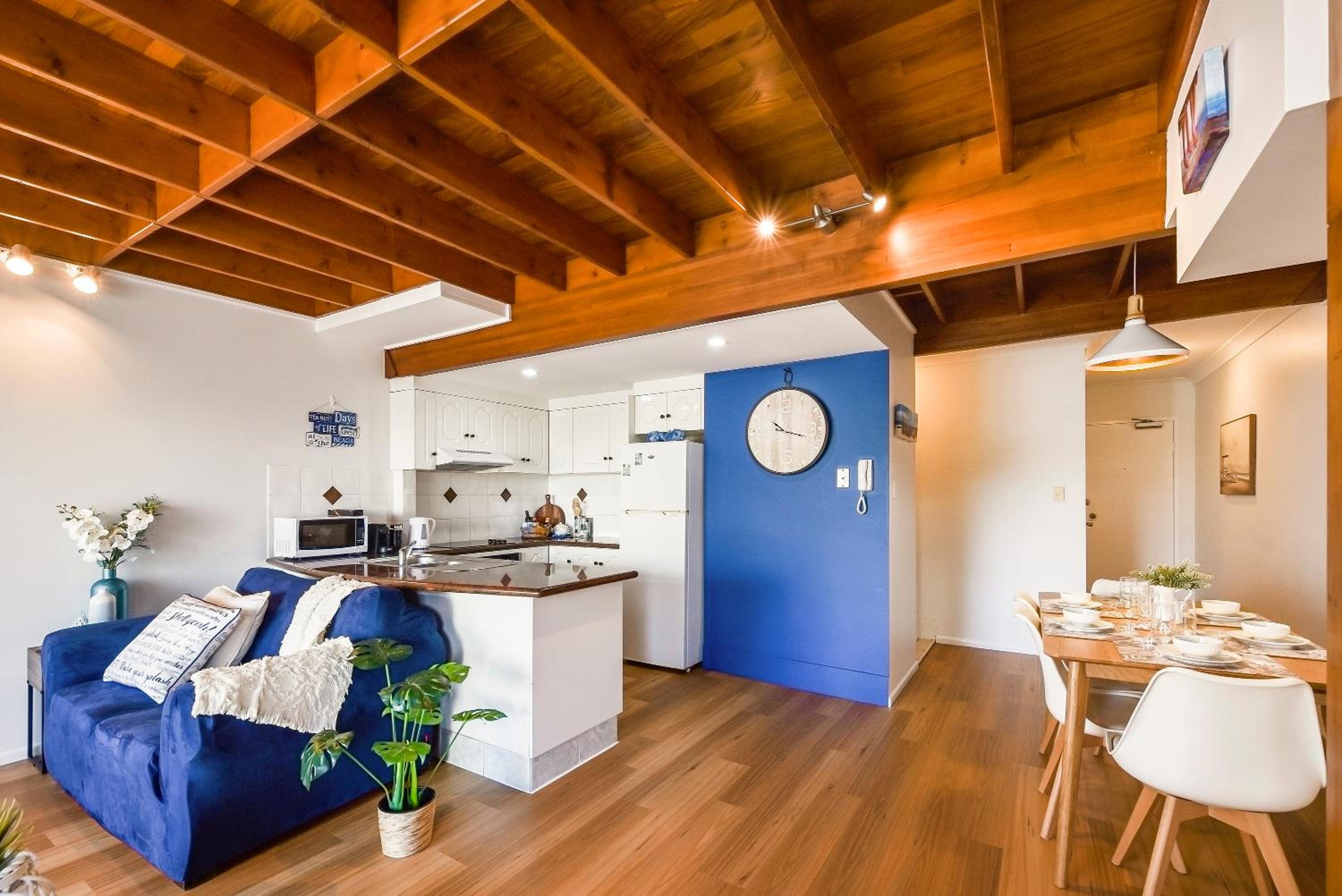 The location was perfect for us and the purpose of travel. There is a servo and coffee shop directly across the road and a short stroll to the water. Apartment 17 was lovely and spacious, air con was fantastic. Kitchen was a good size with cooking facilities if needed and laundry area was also great to be able to wash clothes. both levels had a balcony which was also a big plus, the top balcony doesn't have a roof so don't go to sit there when its raining like we did but it was great! Any issues we had ( 1 small issue with a cleaning oversight) was corrected immediately and the owner was extremely accommodating to our needs and rectifying this.