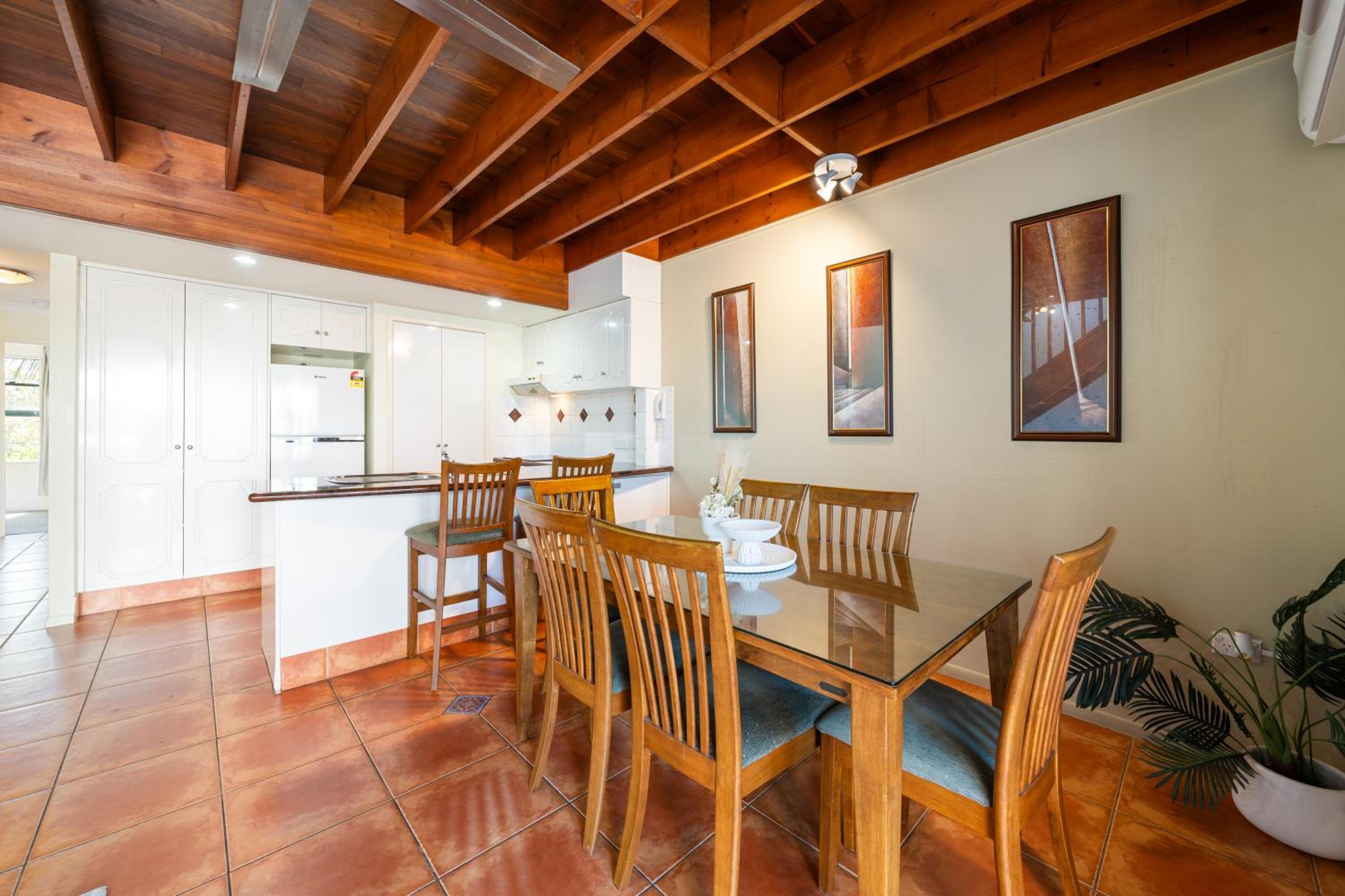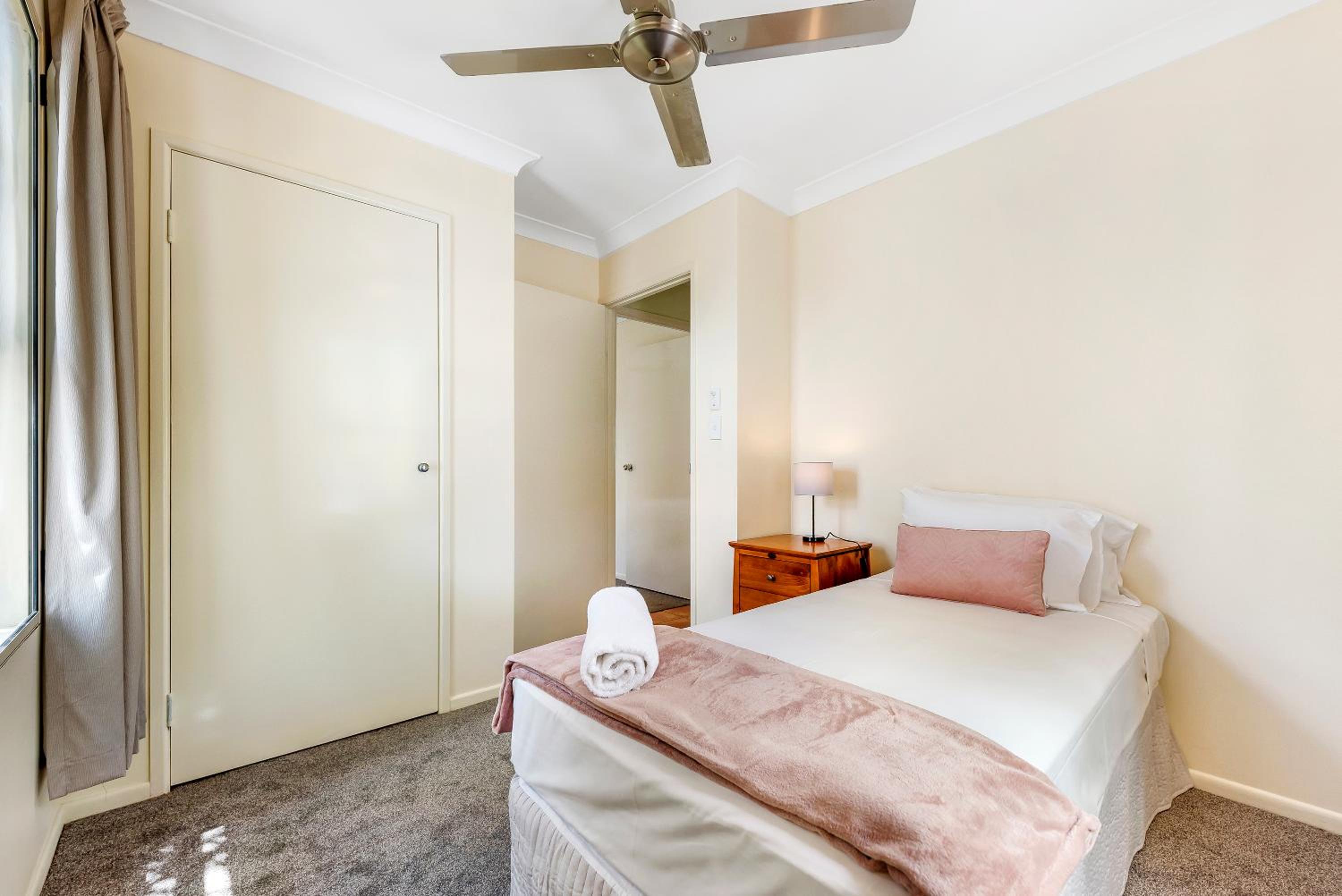 No aircon in the bedrooms downstairs however the lounge room aircon did push cool air in there, there are ceiling fans but. The car spaces can be a little tricky to get into we have a larger car (Isuzu DMax) and it did take some skillful maneuvering to get into our allocated parking space, not an issue but definitely something to be mindful of - again though we were offered an alternative space for 1 of the nights when an alternative was available.