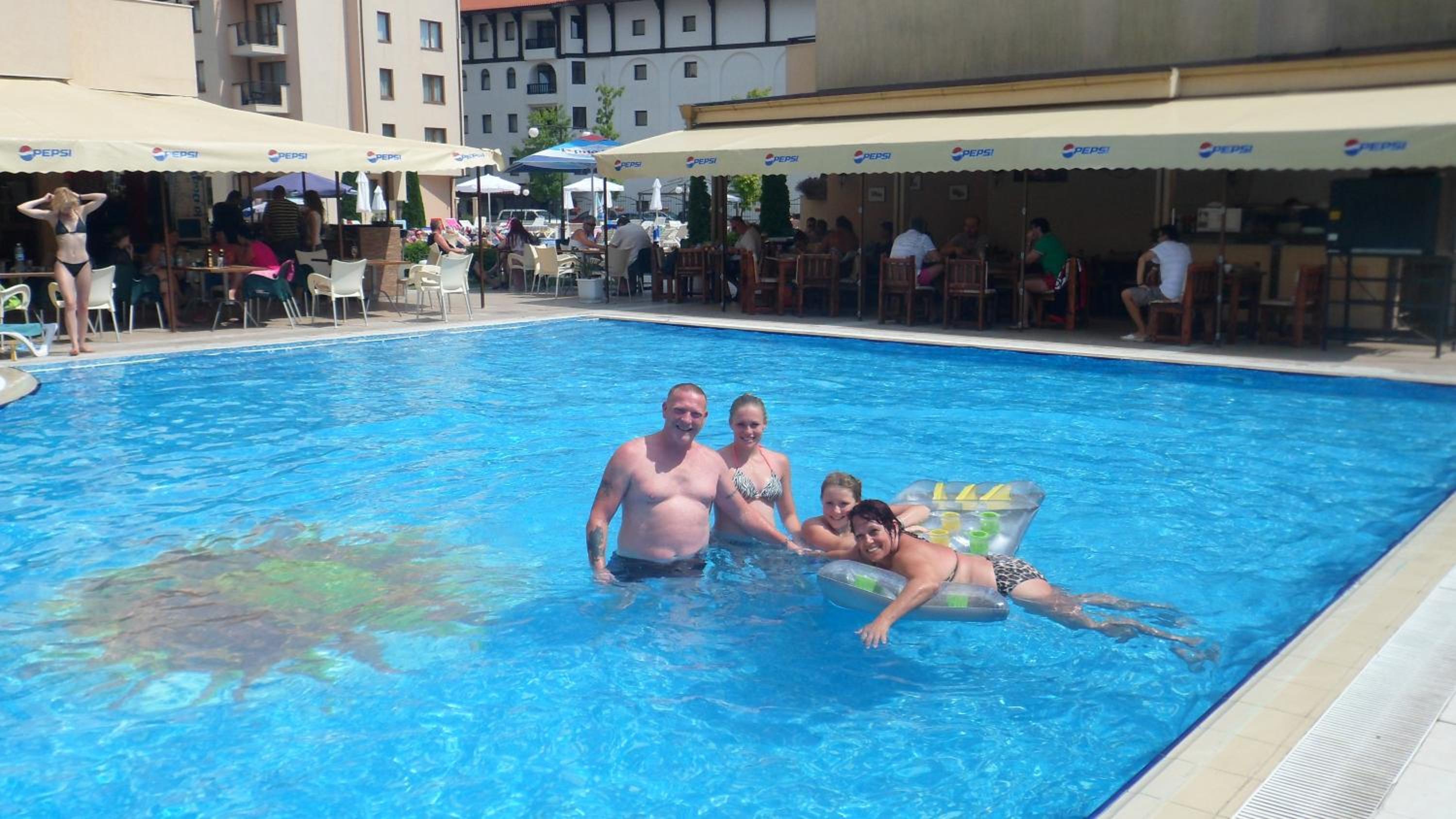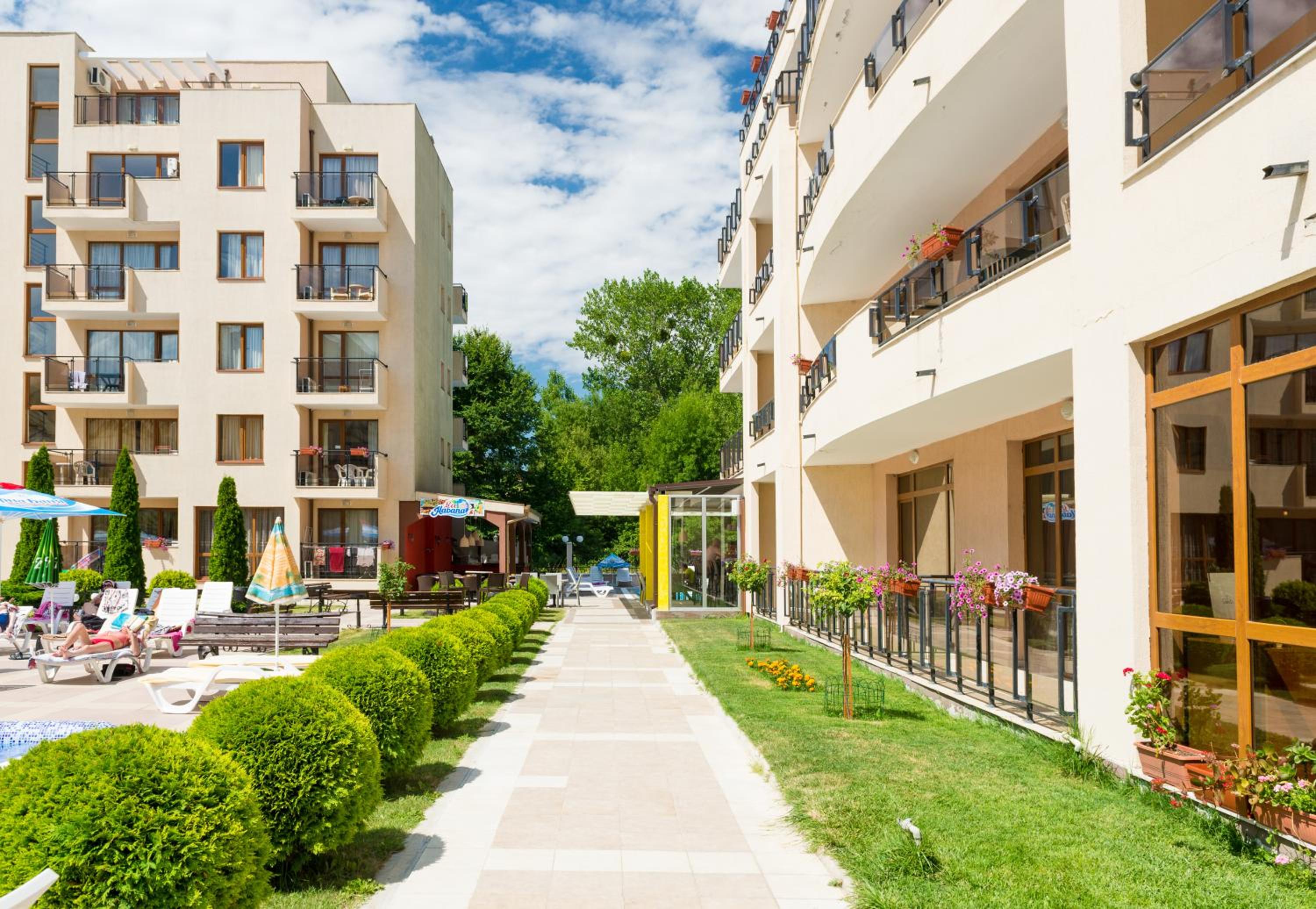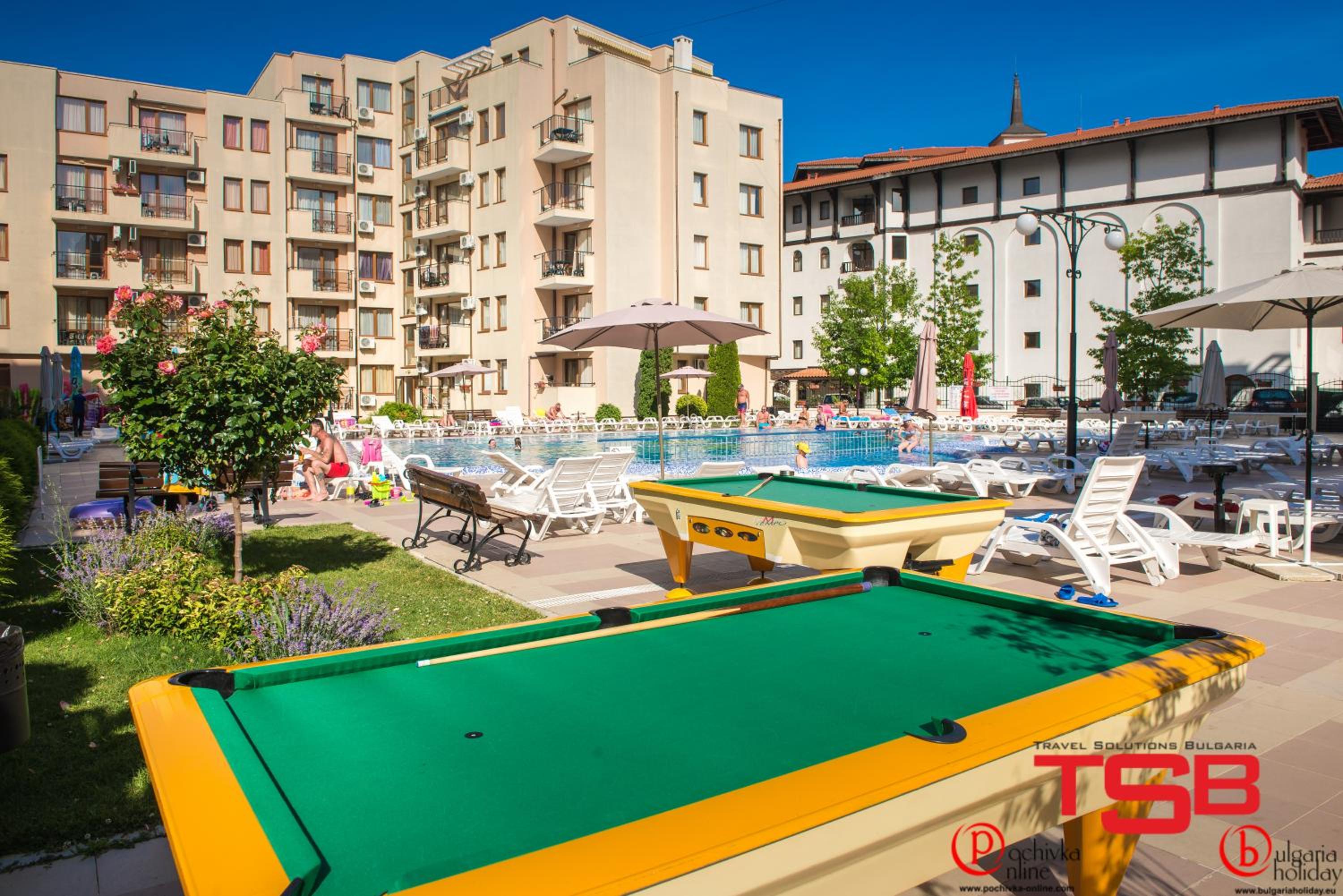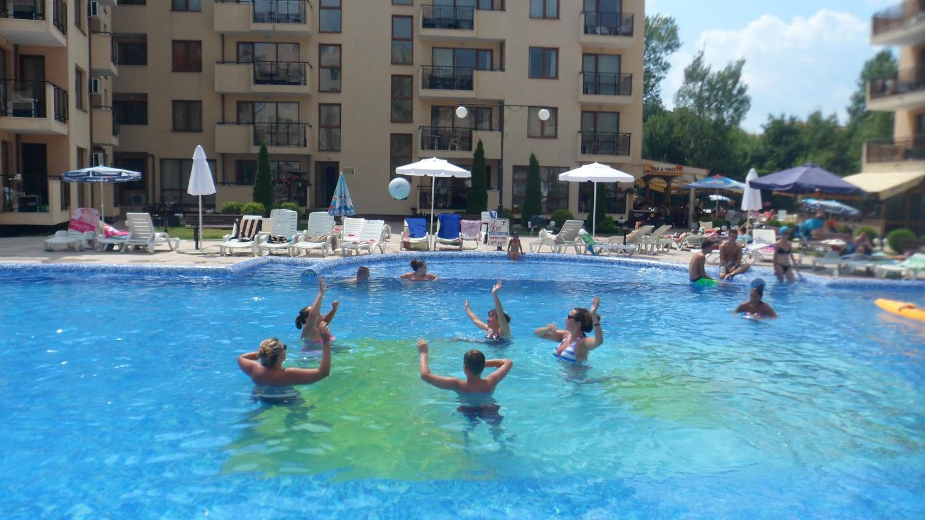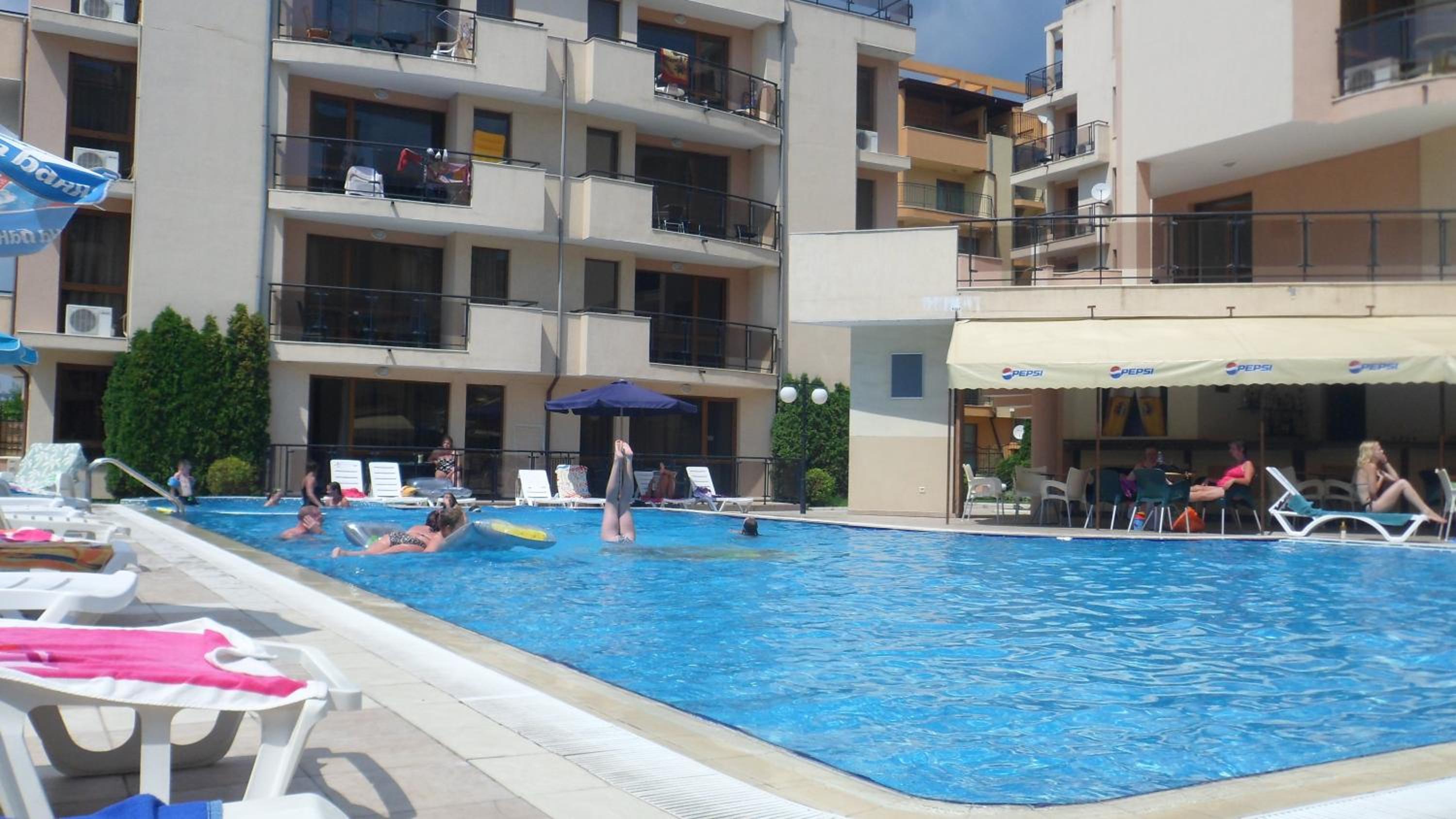 Personal amabil, locația foarte aproape de plajă cât si de magazine ex.Lidl, Carrefour, locatia dispune de parcare pentru mașini iar accesul în parcare se face printr-o barieră care este deschisă de portar. Apa de la piscină a fost curată iar locația in sine a fost liniștită.