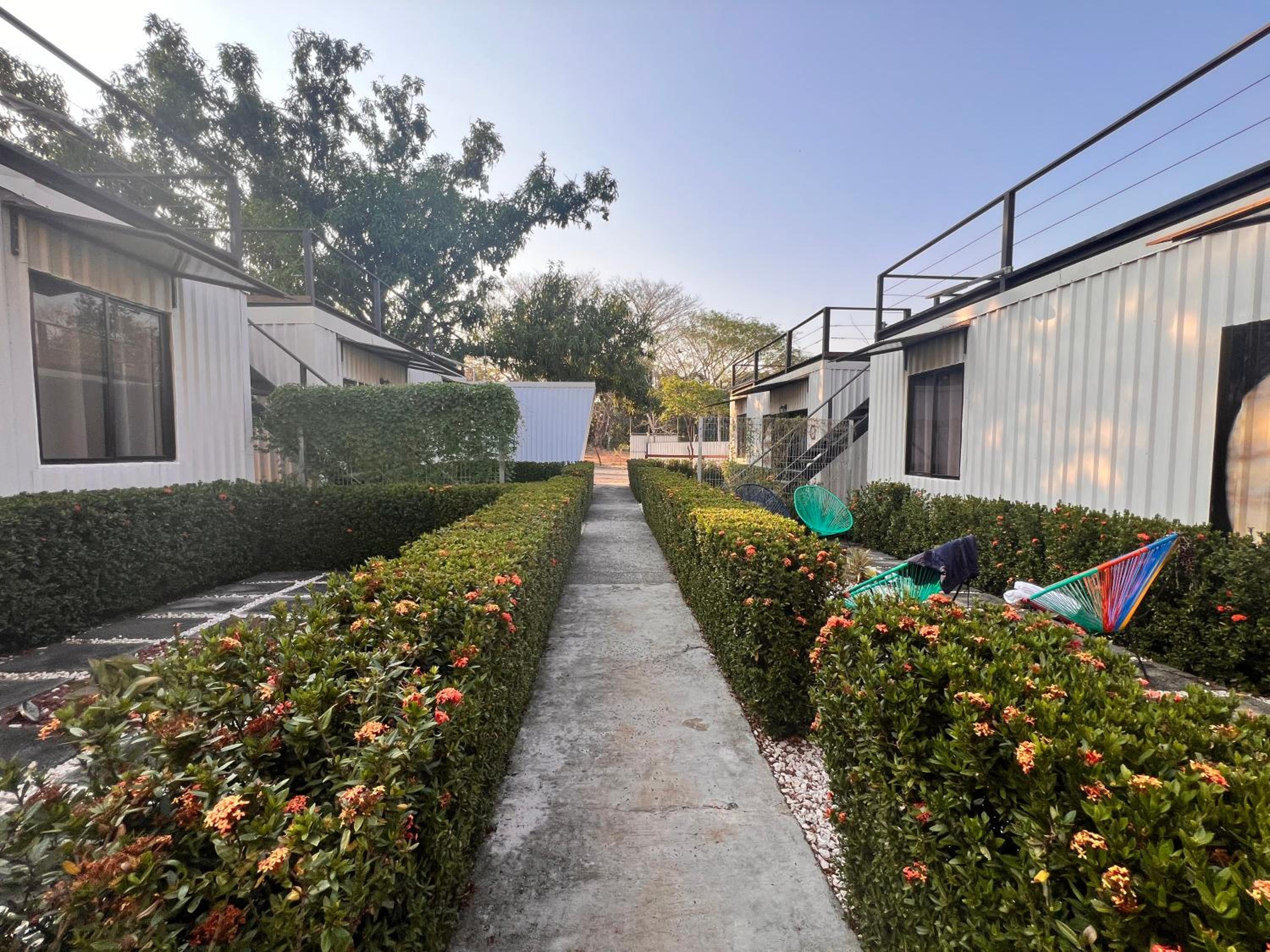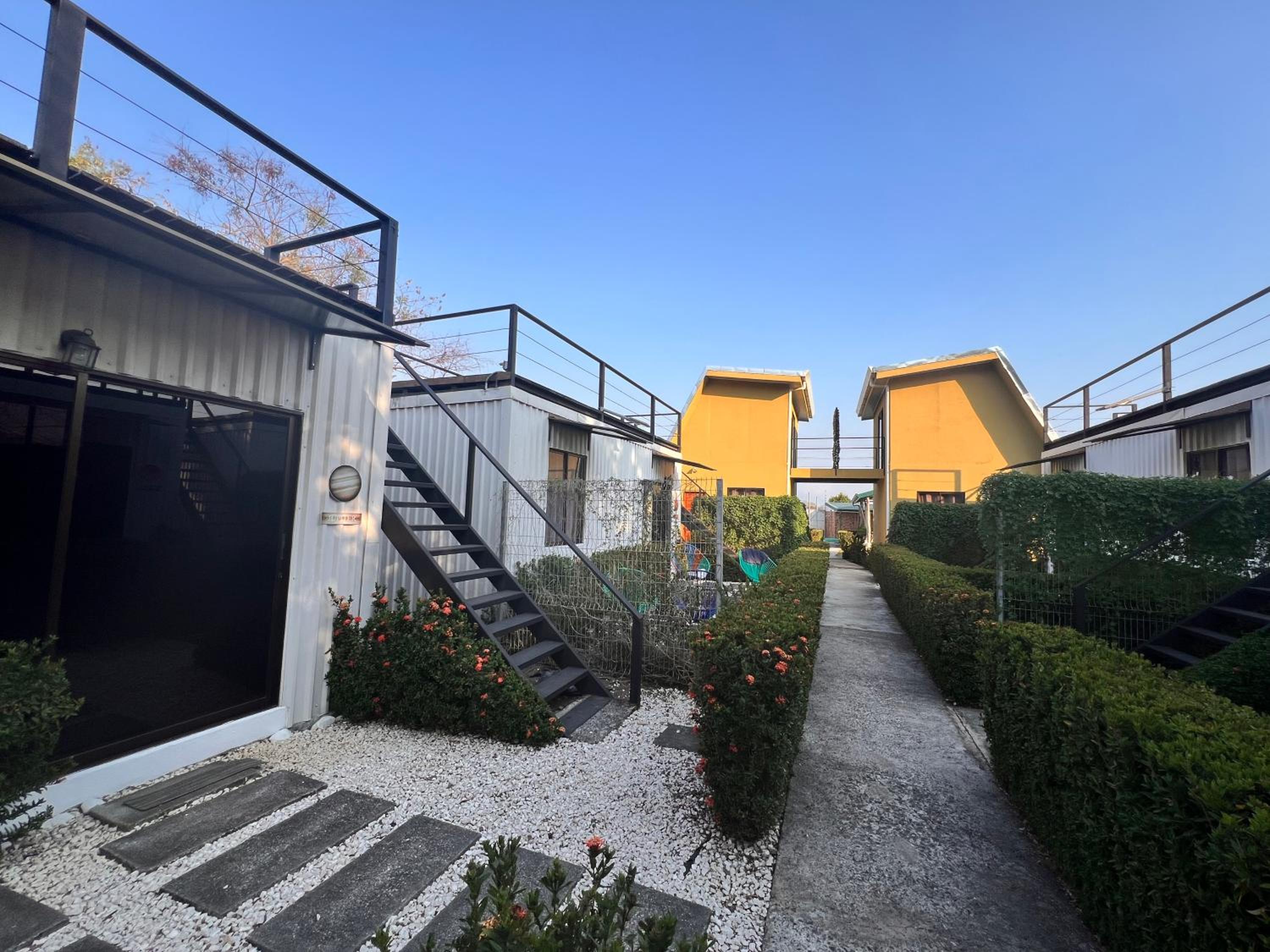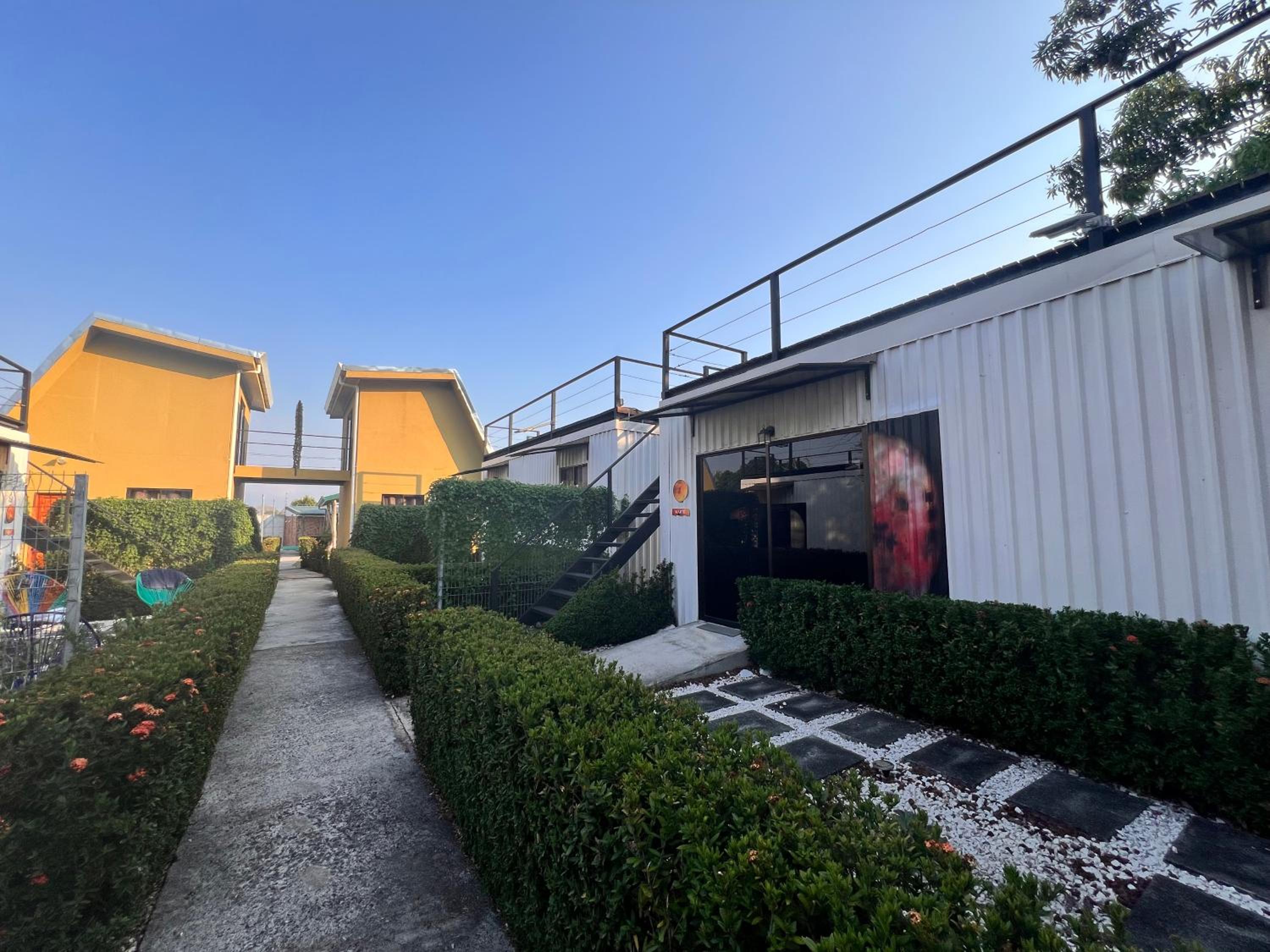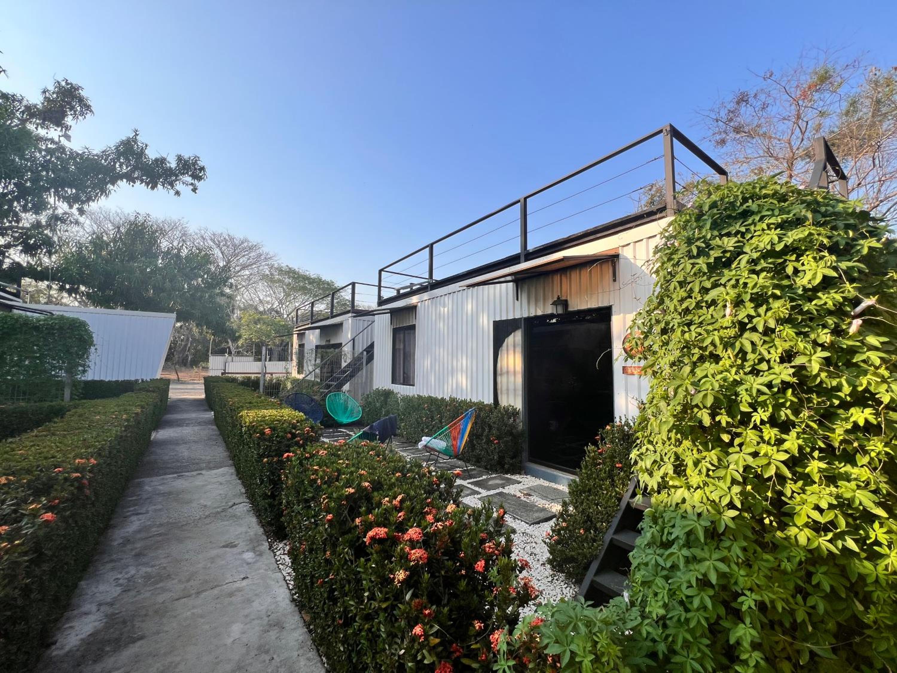 It feels like a prison. Giant metal walls enclose the small lot where the hotel is located There is electrified fencing and with barbed wire on top. Metal containers are stacked next to each other and on top of one another. There is no fresh air or views. The pool is prefabricated and cheap. The rooms are cramped with cheap furniture and modest installations. The model could be successful as a hostel, but for the price it is absurd. I would not recommend it unless they re evaluate their prices. Costa Rica offers incredible properties throughout the country, spending $235 for one night with no breakfast, coffee or other service is simply not worth it.